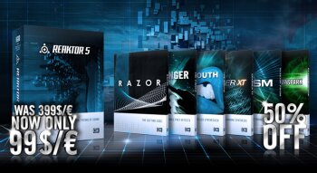 Pendant une semaine, Reaktor 5 vendu au prix de 99€ et les instruments pour le synthé, Razor, The Mouth, Skanner XT, Prism, Spark et The Finger, sont à moitié prix.