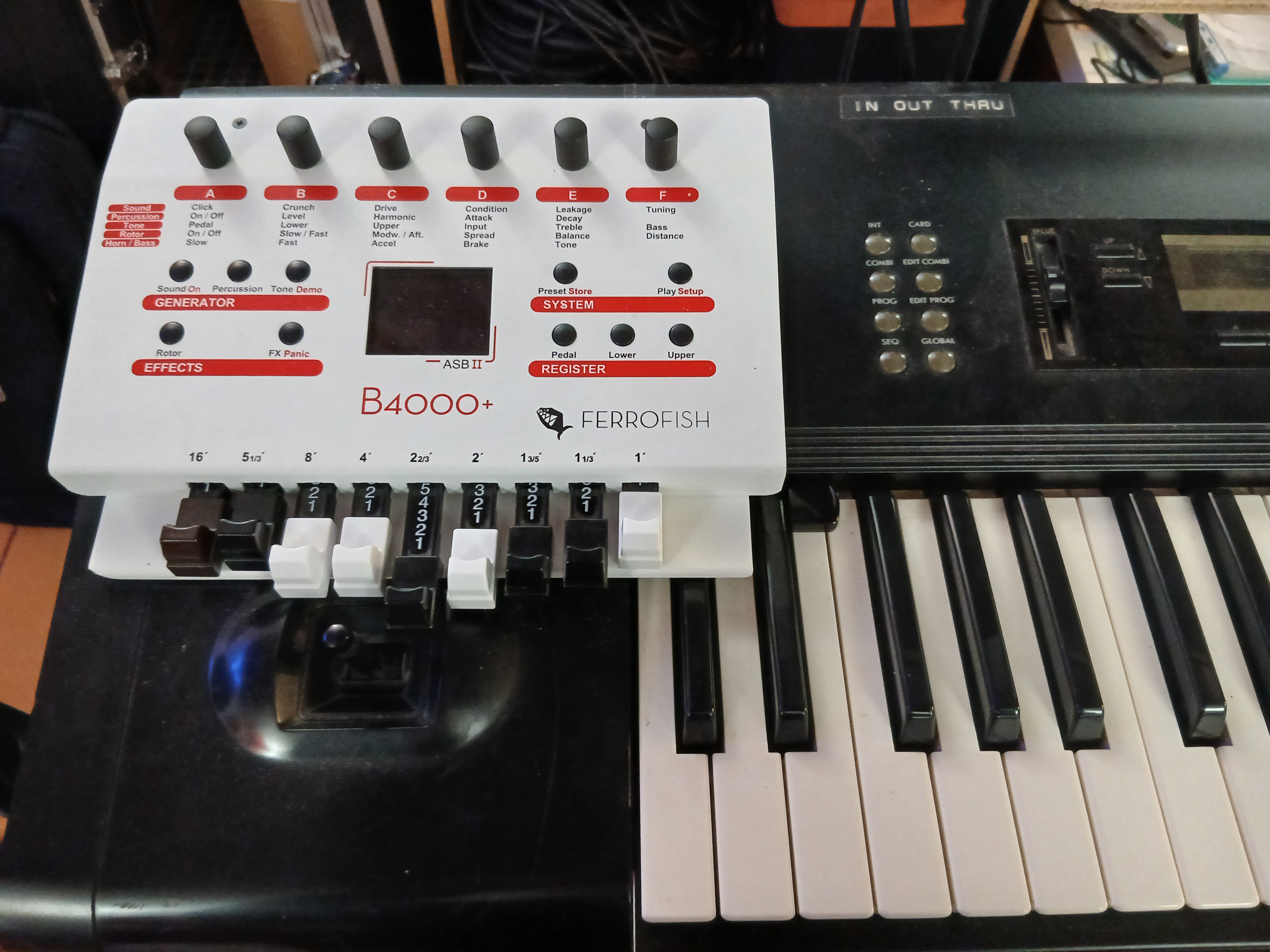 Je l’utilisais à partir d’un Korg M1avec une connexion midi (din 5 broches), et une pédale genre FC5 pour la rapidité de la simulation Leslie