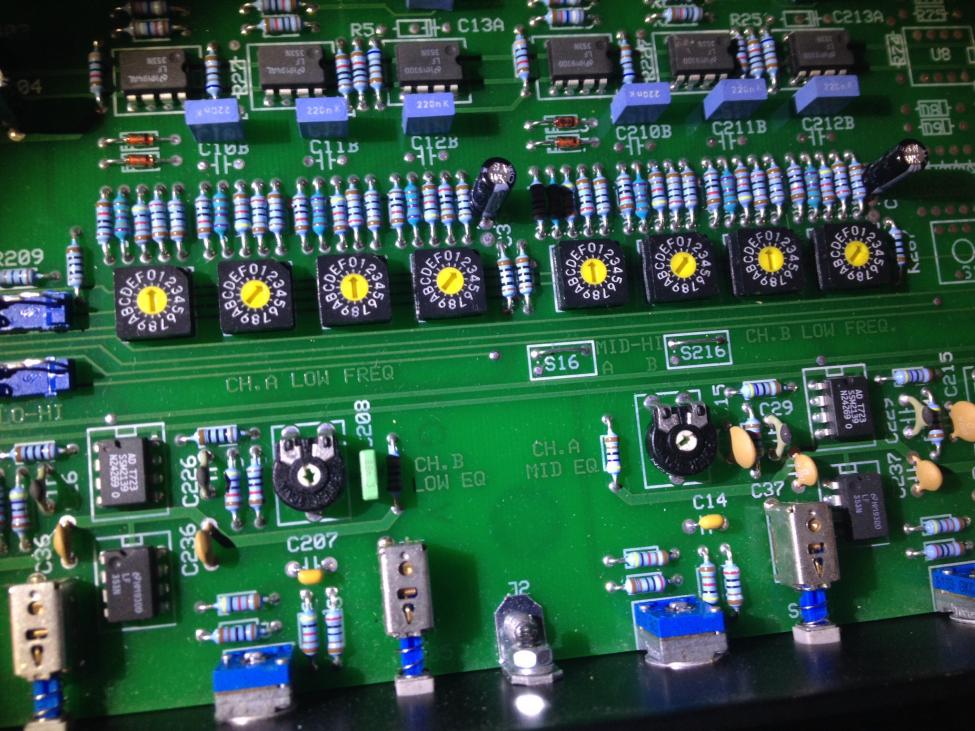 EQ: Low, Mid, High Shelving Equalisation with boost at +12 dB max; adjustable on PC-board.