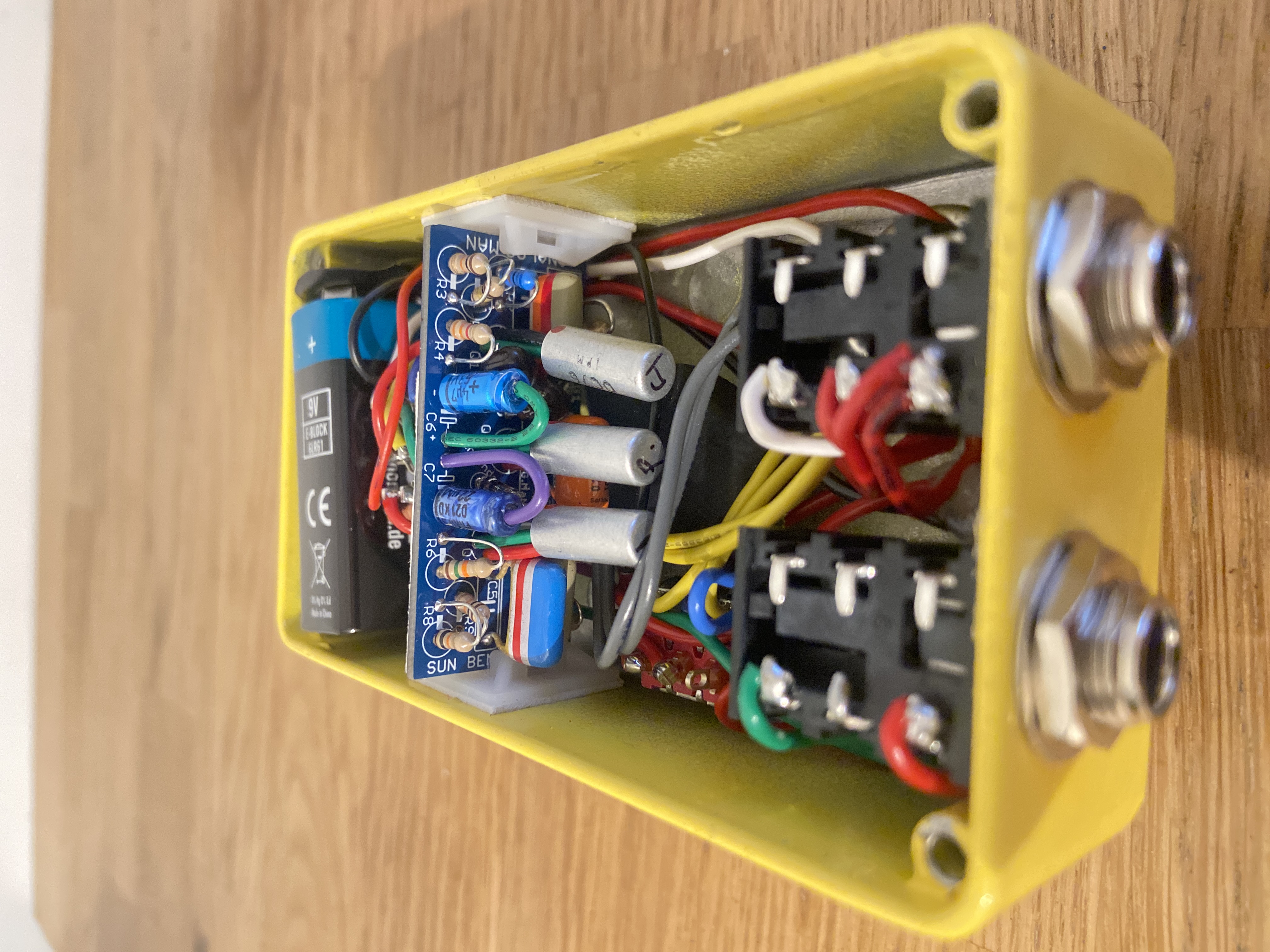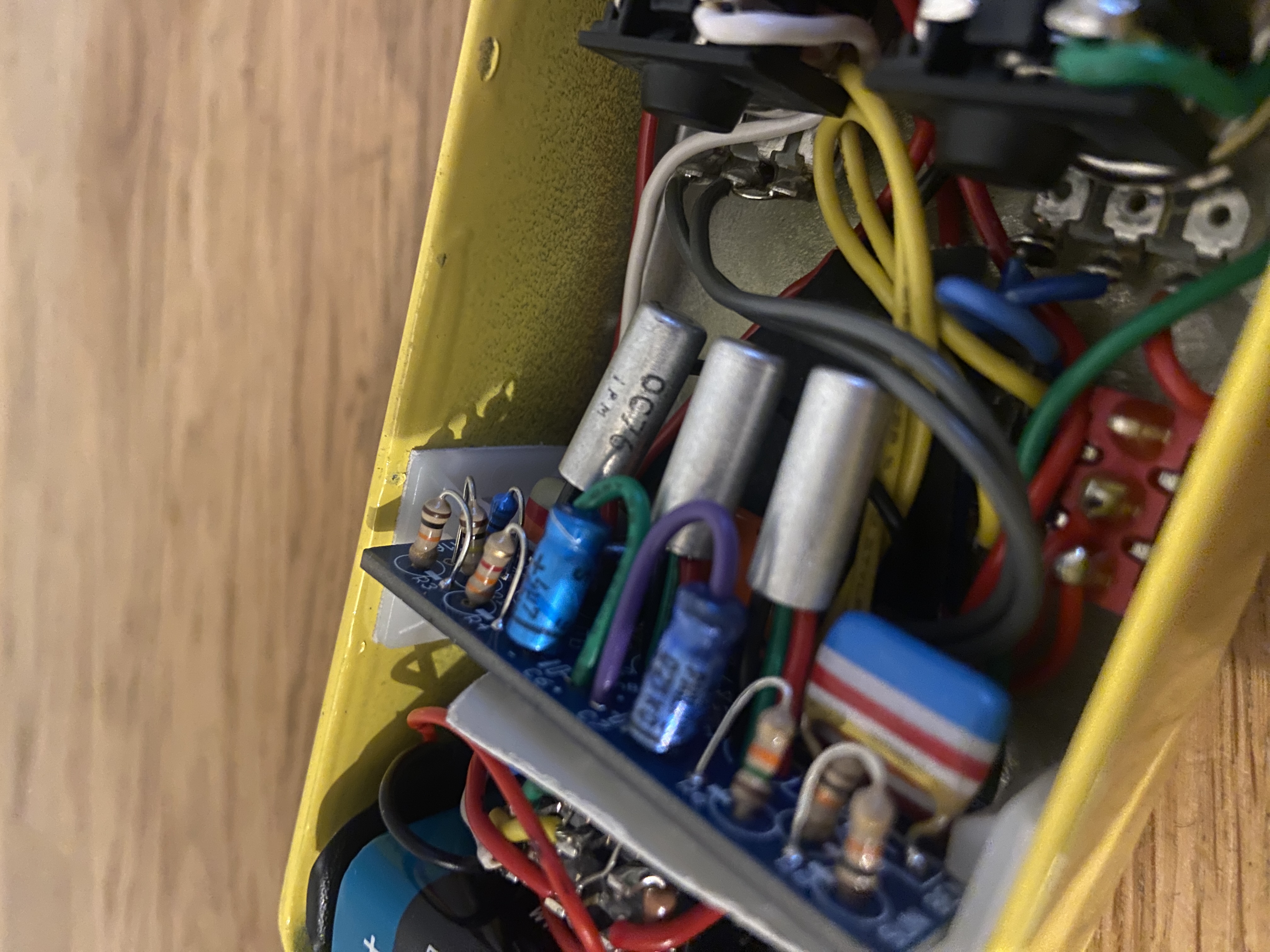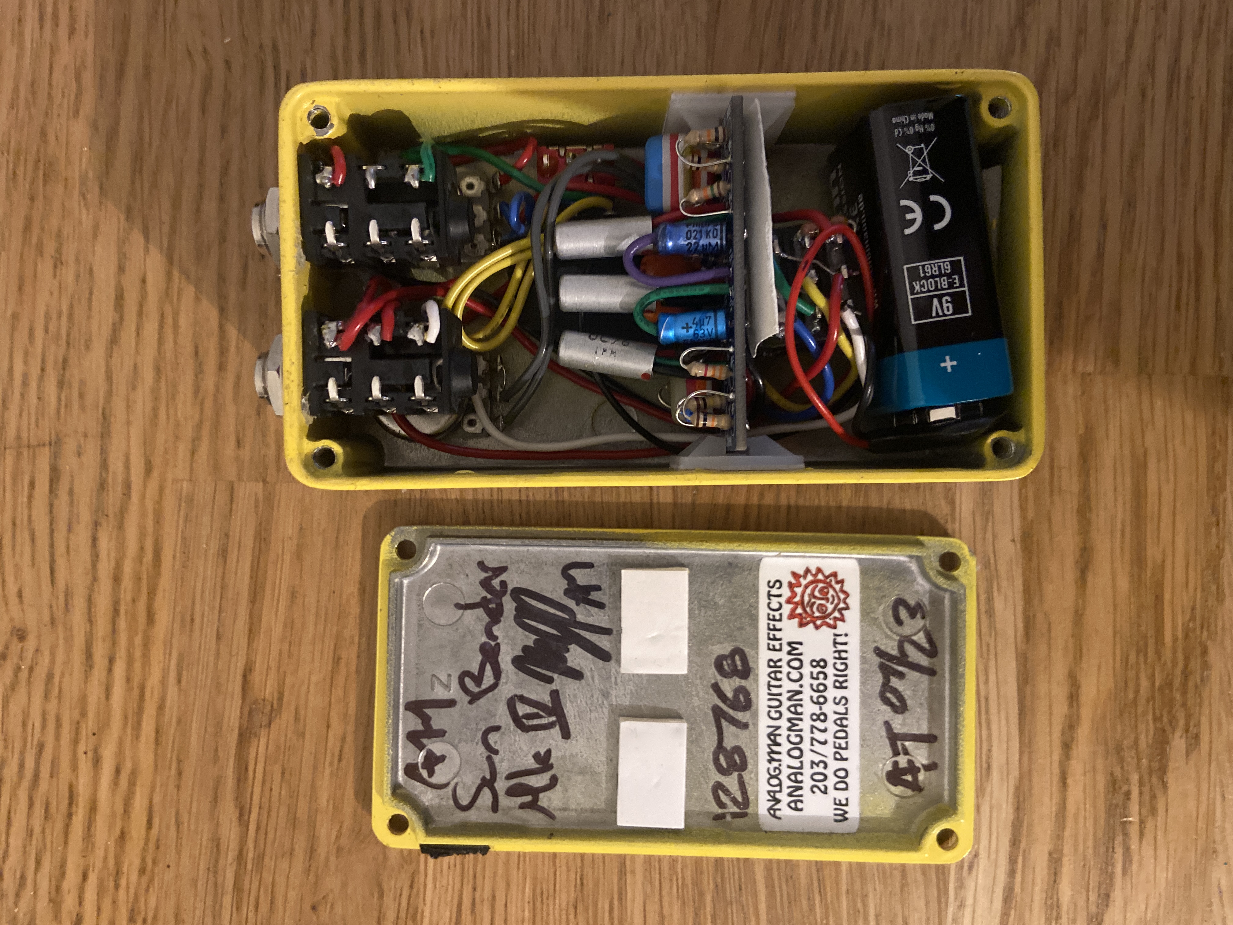 "The transistors used in the old ones are unmarked so we pulled them out and tested them to find the specifications. Then we checked our stash and found some NOS Mullard germanium transistors which we had been saving for many years that were similar. We made about 100 of these pedals with these NOS transistors before we started to get low on the transistors. After that, we made a version with two NOS Russian transistors, which I found closest to the originals in sound and even looks, and one of the old Mullards. The Russians sound about the same in the MKIV, as they are not critical in that part of the circuit. These first two transistors are in a "Darlington Pair" configuration which gives them very high gain. We can sometimes optionally use all three Mullard transistors for a higher cost if we have them in stock. These are often military grade Mullards, the CV version of OC72, made in mid 1969 at the Mullard Ltd., Mitcham factory. The sound with the three Mullards might be a little more nasally/vocal sounding, the Russians a slight bit clearer."