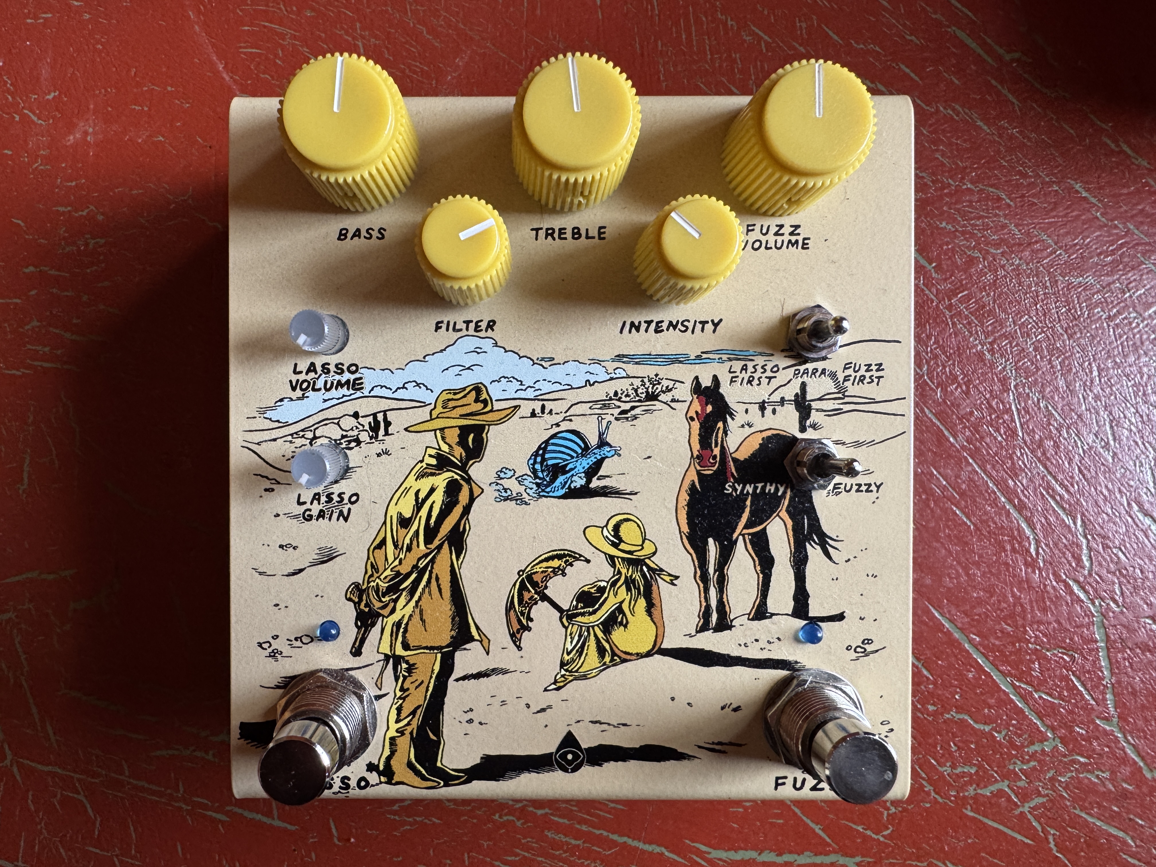 La pédale dispose également d’un deuxième footswitch qui active une section overdrive indépendante. Cette dernière permet d’ajouter du gain, de pousser la fuzz, ou d’obtenir une saturation plus serrée et précise selon les réglages. L’association des deux circuits offre beaucoup de flexibilité, que ce soit pour empiler les gains ou les utiliser séparément.