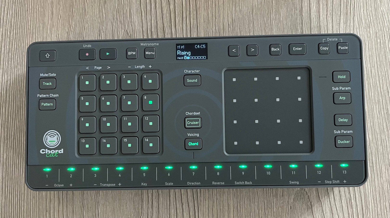 ChordCat est conçu pour s'adapter aux flux de travail en studio et portables. Il est doté d'un port USB Type-C pour l'alimentation et la connexion à l'ordinateur, ainsi que de ports MIDI IN, OUT et THRU. Cela vous permet de contrôler des synthés externes, de synchroniser du matériel ou d'intégrer ChordCat à votre DAW. Vous pouvez utiliser l'application ChordCat Manager pour importer et exporter des motifs entre la groovebox et votre ordinateur, ce qui facilite la construction d'idées dans un espace et leur finition dans un autre. Vous pouvez également sauvegarder des projets complets sur votre PC ou votre Mac pour une plus grande tranquillité d'esprit.