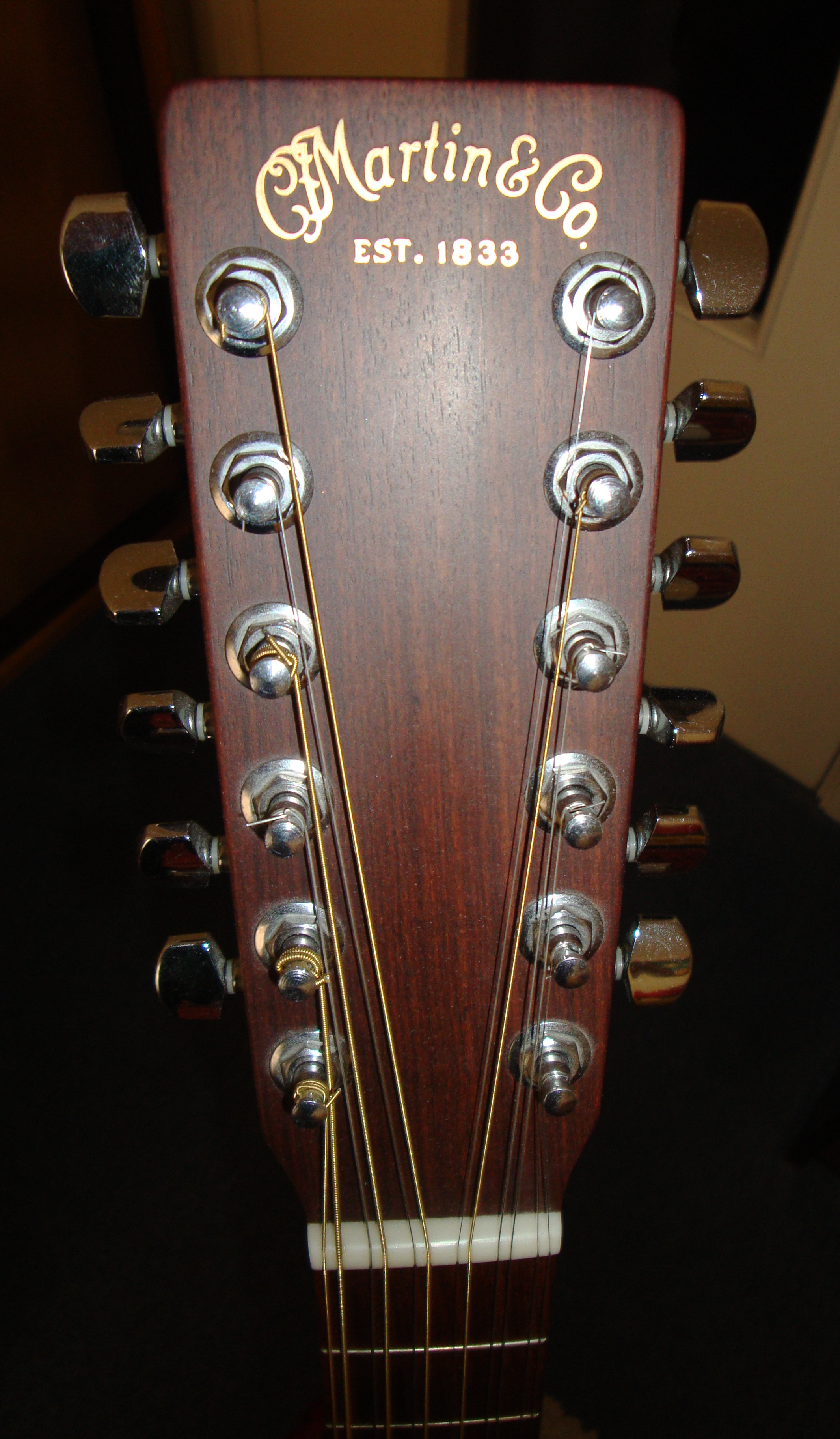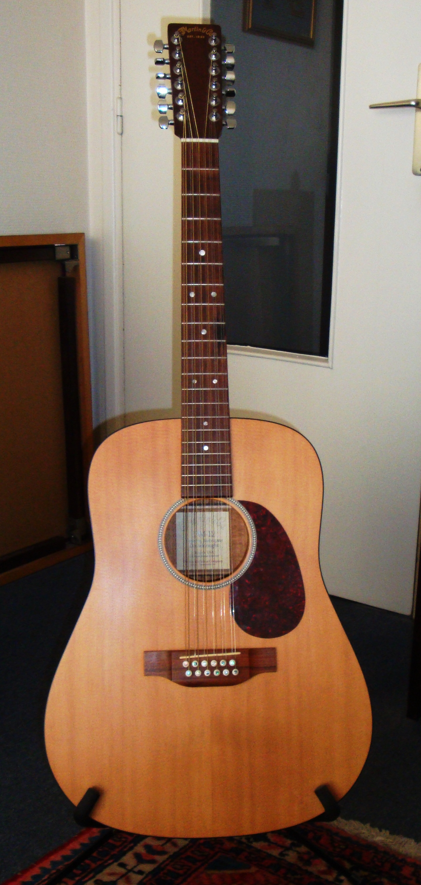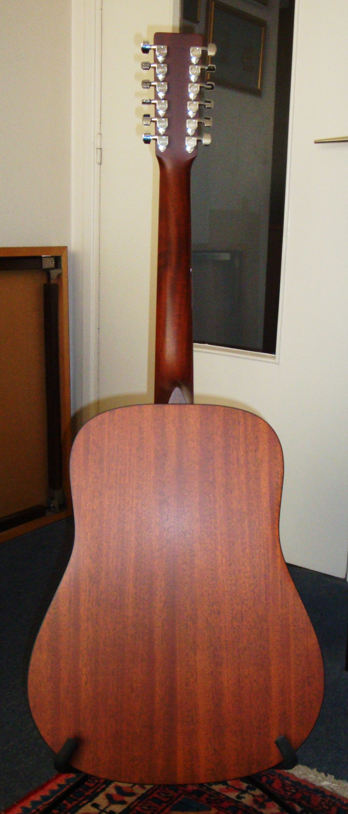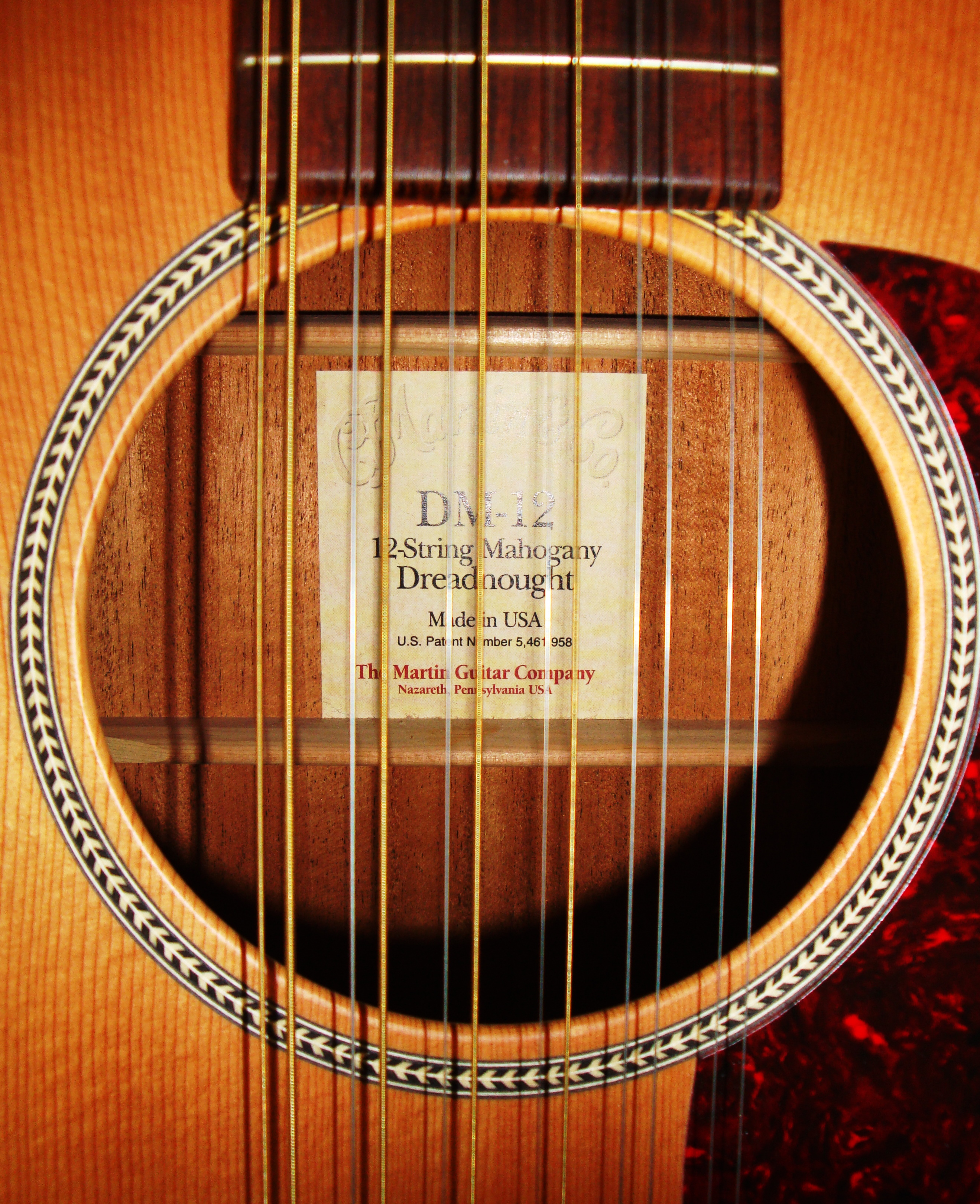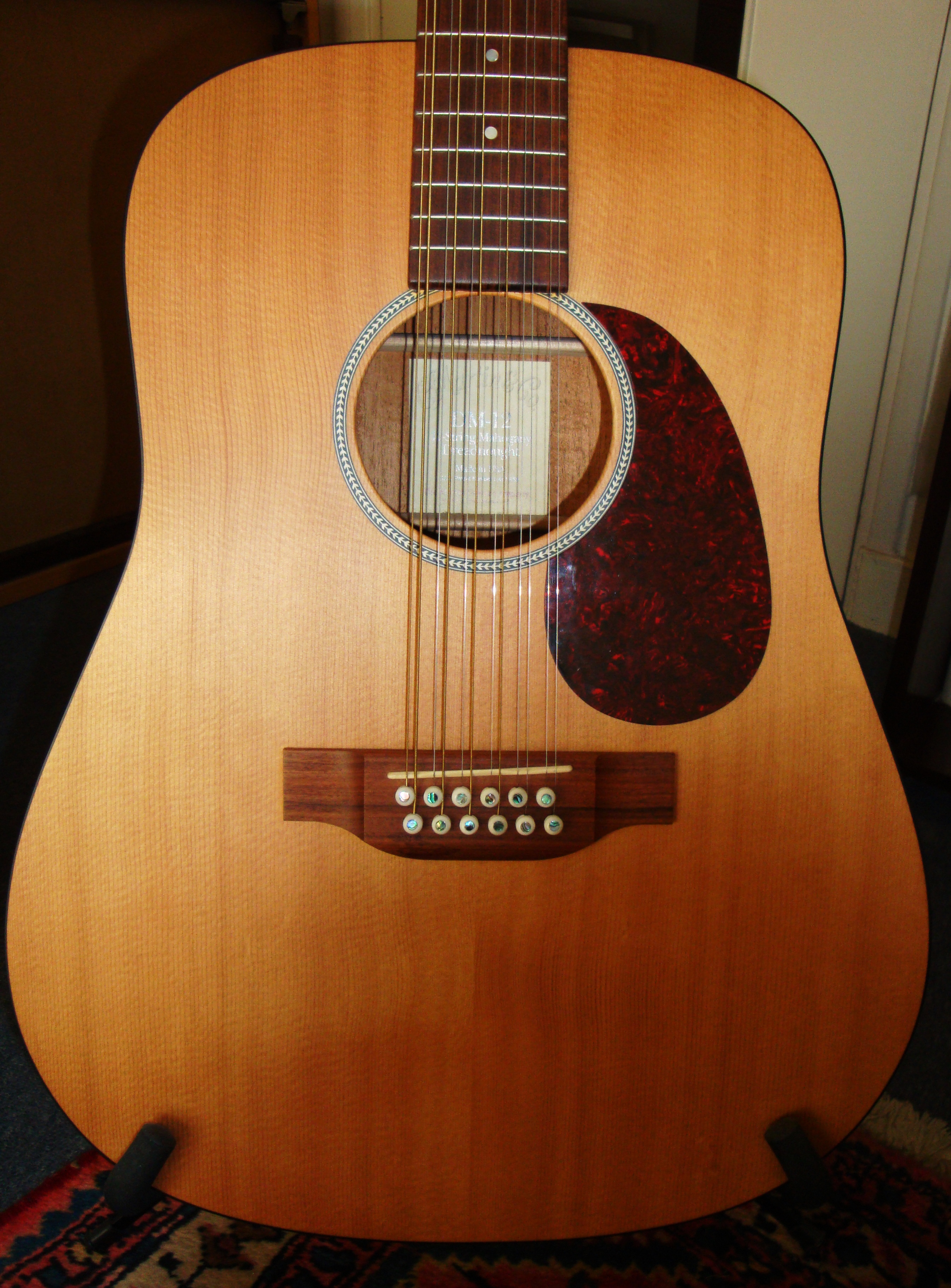 The Martin DM-12 is a 12-string guitar that was made in the USA and is not an acoustic/electric, so it doesn't have any pick ups or controls. The neck is made out of solid mahogany and is extremely easy to play as far as 12-string guitars go.