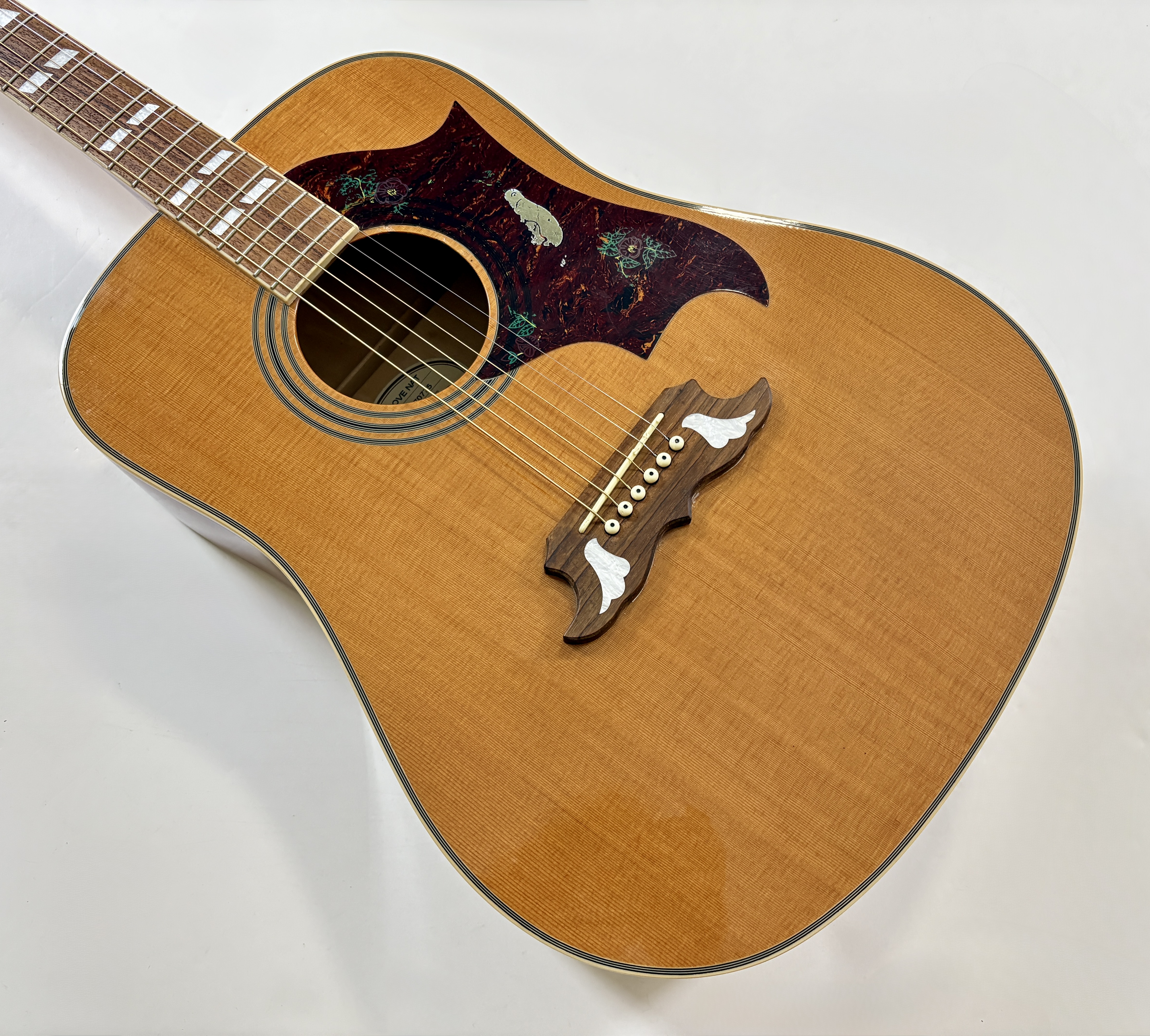 AApparue en 1962, la Dove, tout comme l'Hummingbird, est une guitare qui en jette ! Son diapason n’est pas de 24,75 pouces comme la majorité des Gibson mais de 25,5". Elle arbore fièrement sa colombe sur son pickguard et offre d'autres détails de finition comme ses bindings, son chevalet travaillé ou encore la couronne sur la tête. Celle-ci fut à un moment amplifiée.Location, achat, vente, reprise, dépôt-vente.