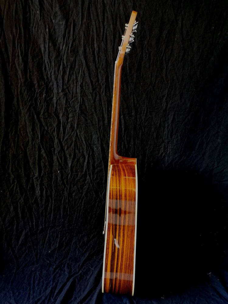 Elle est magnifique avec son palissandre (je pense de Rio), ses incrustations en abalone et son filet centrale sur le fond.