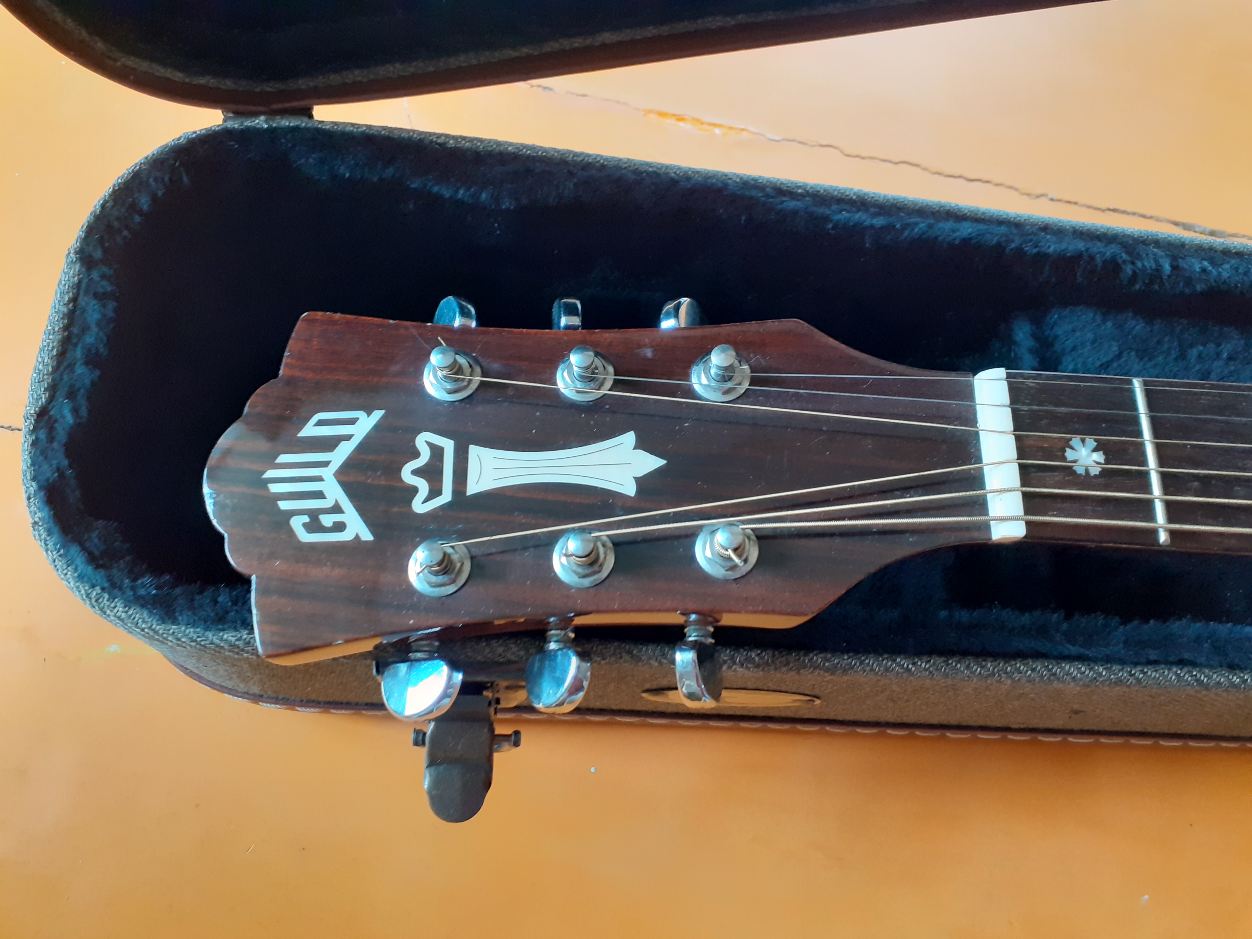 Livrée en étui Guild Deluxe, tweed et cuir.