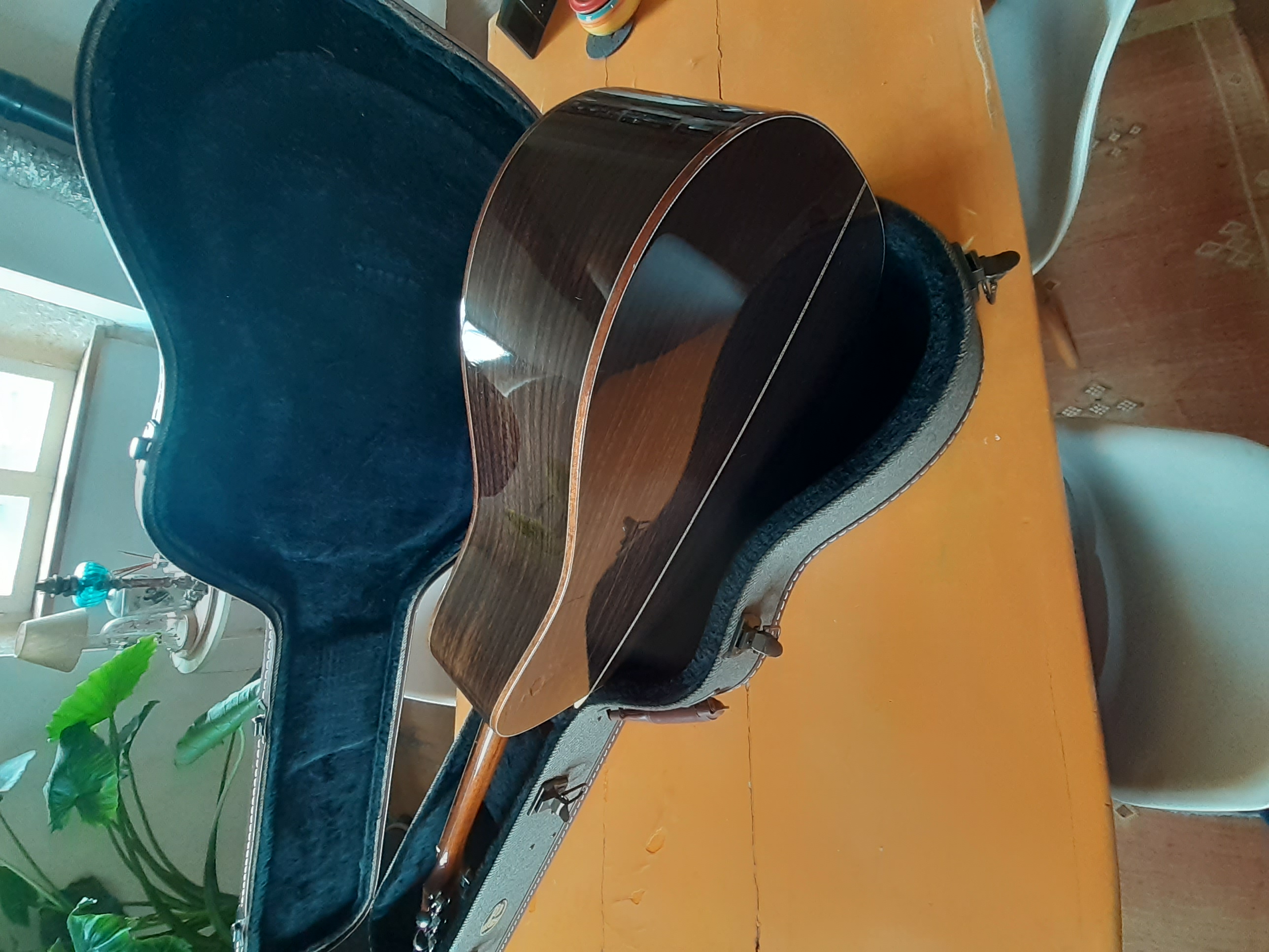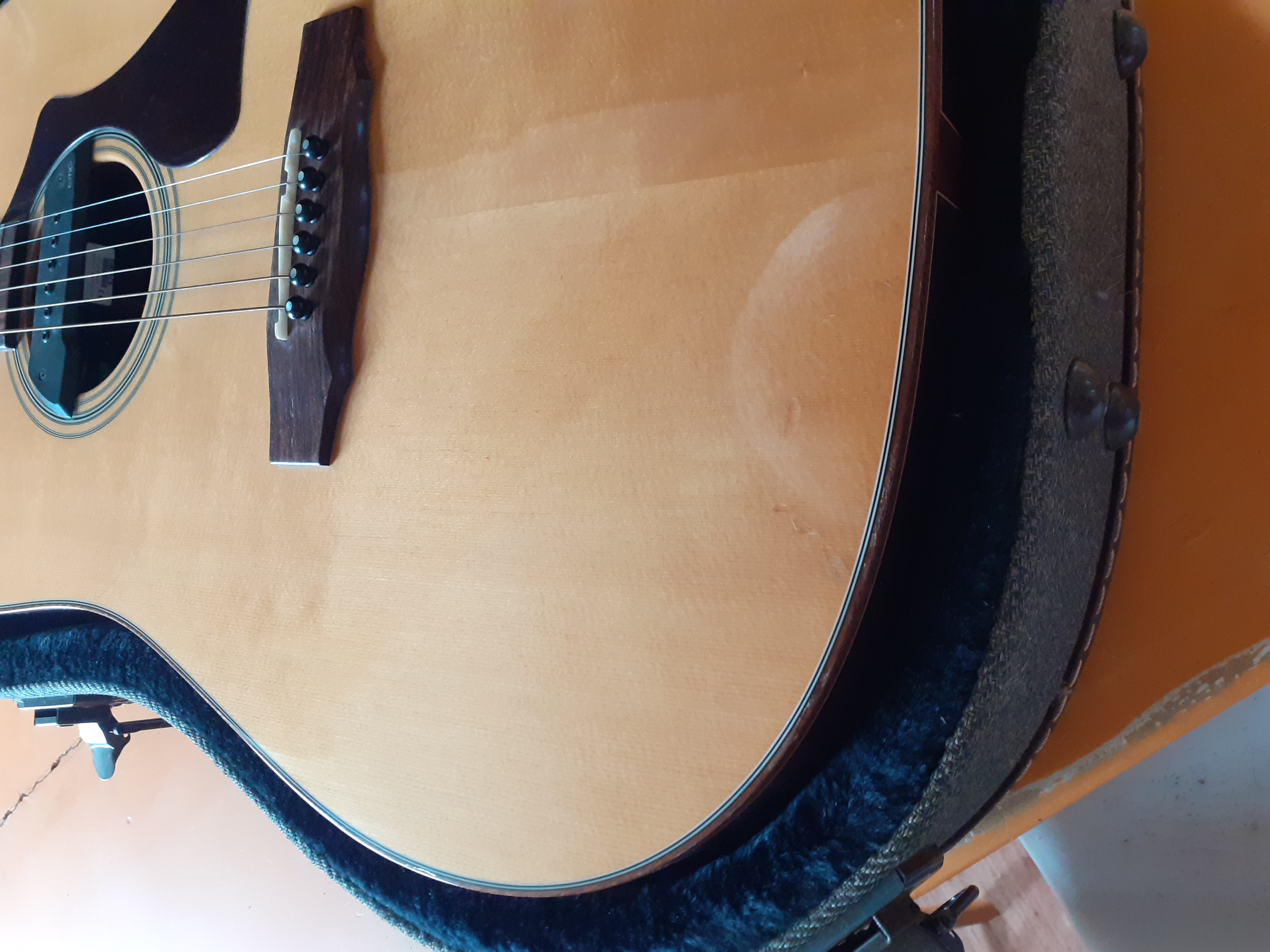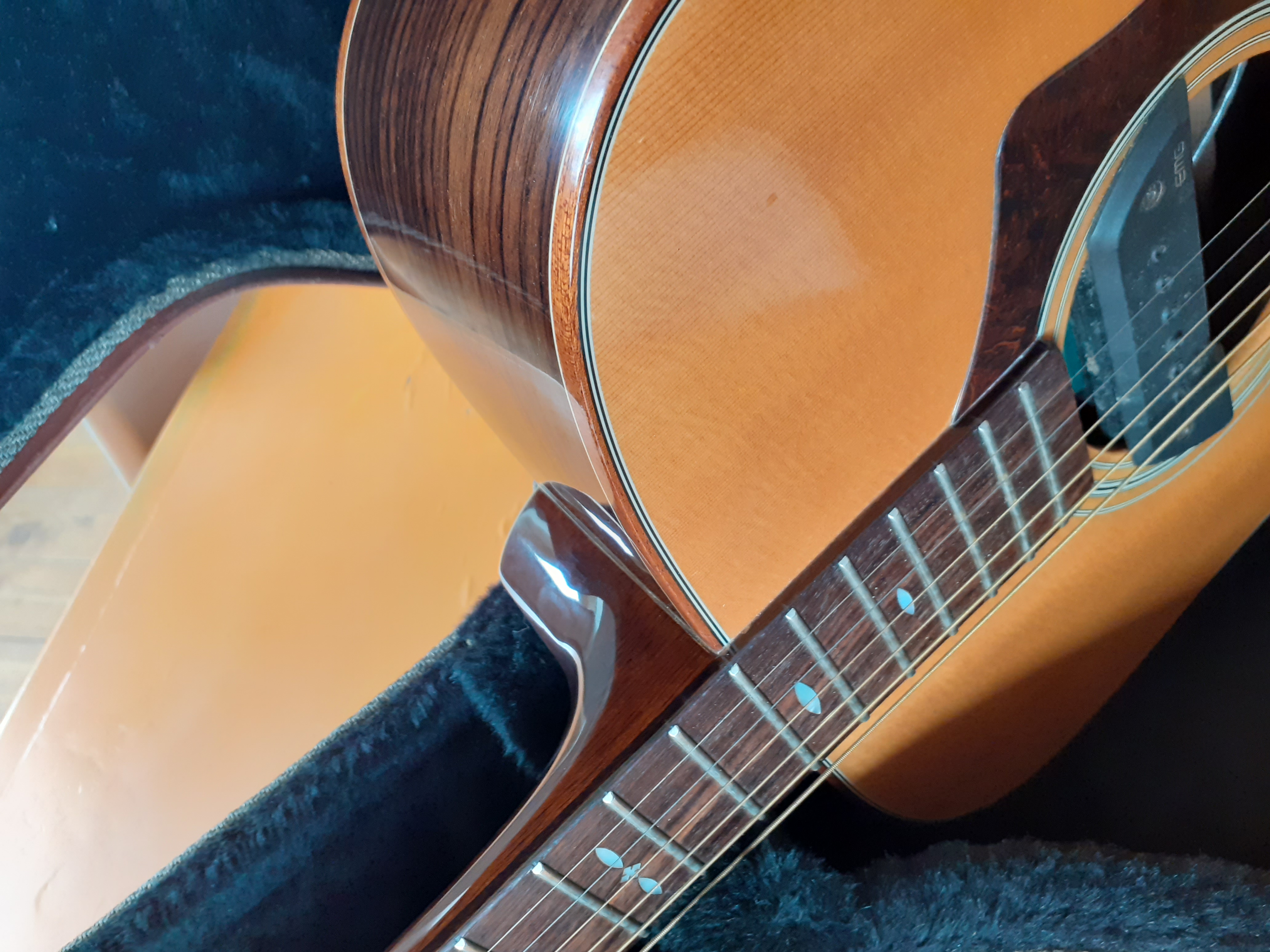 La guitare a été éraflée sous l'avant-bras droit (pas de choc) et revernie par mon luthier toulousain. Reflet légèrement visible selon l'angle d'éclairage.