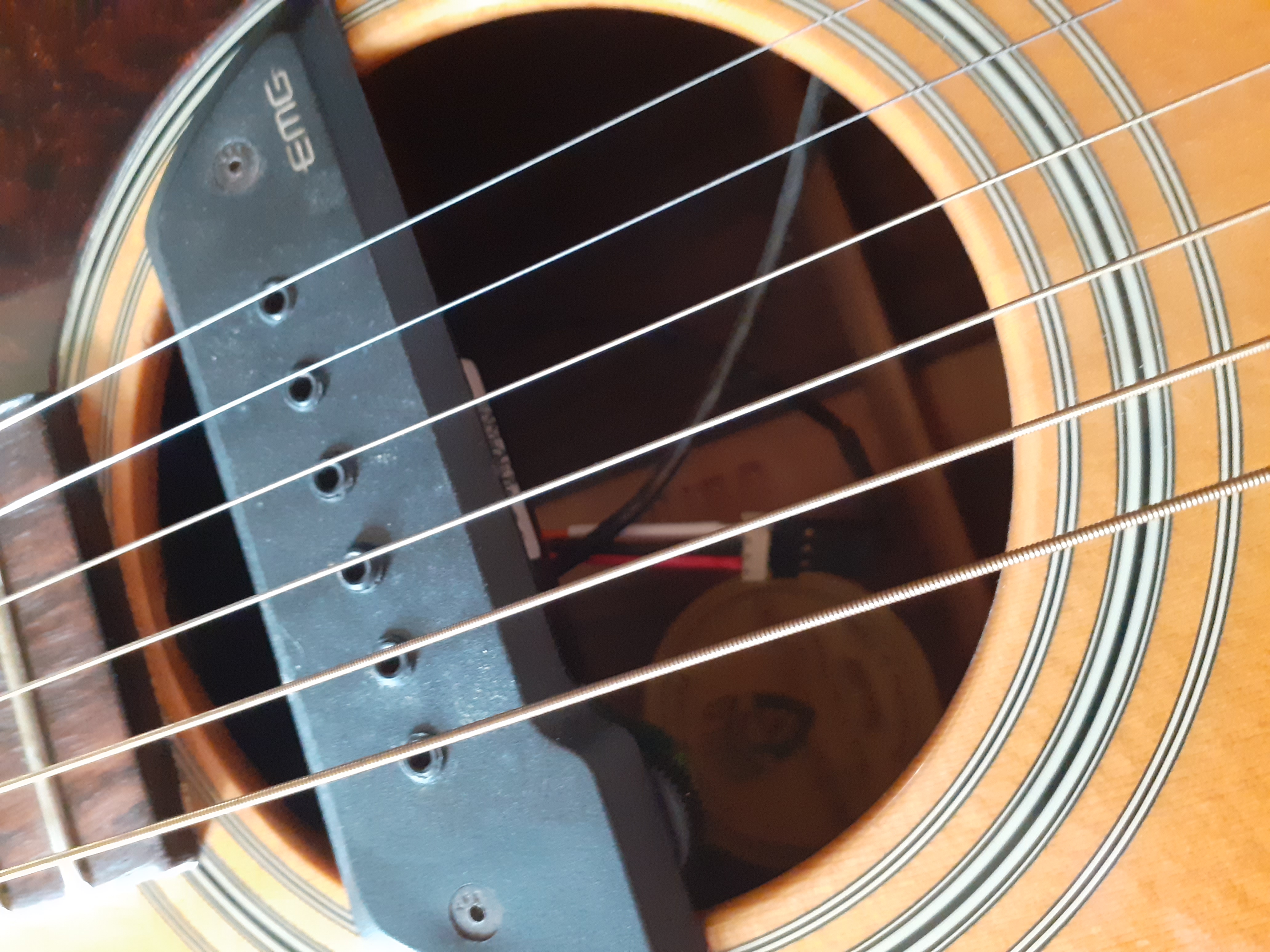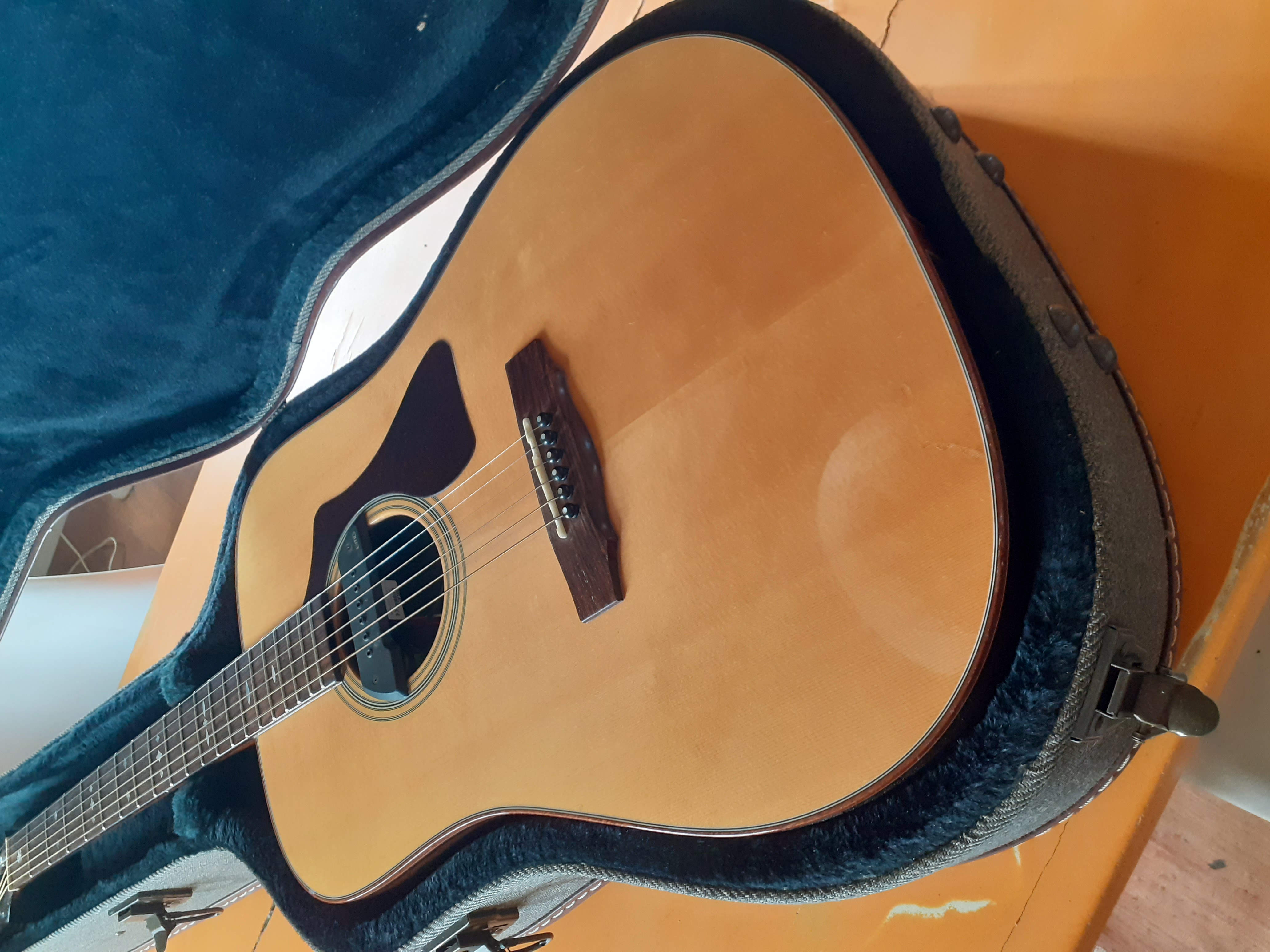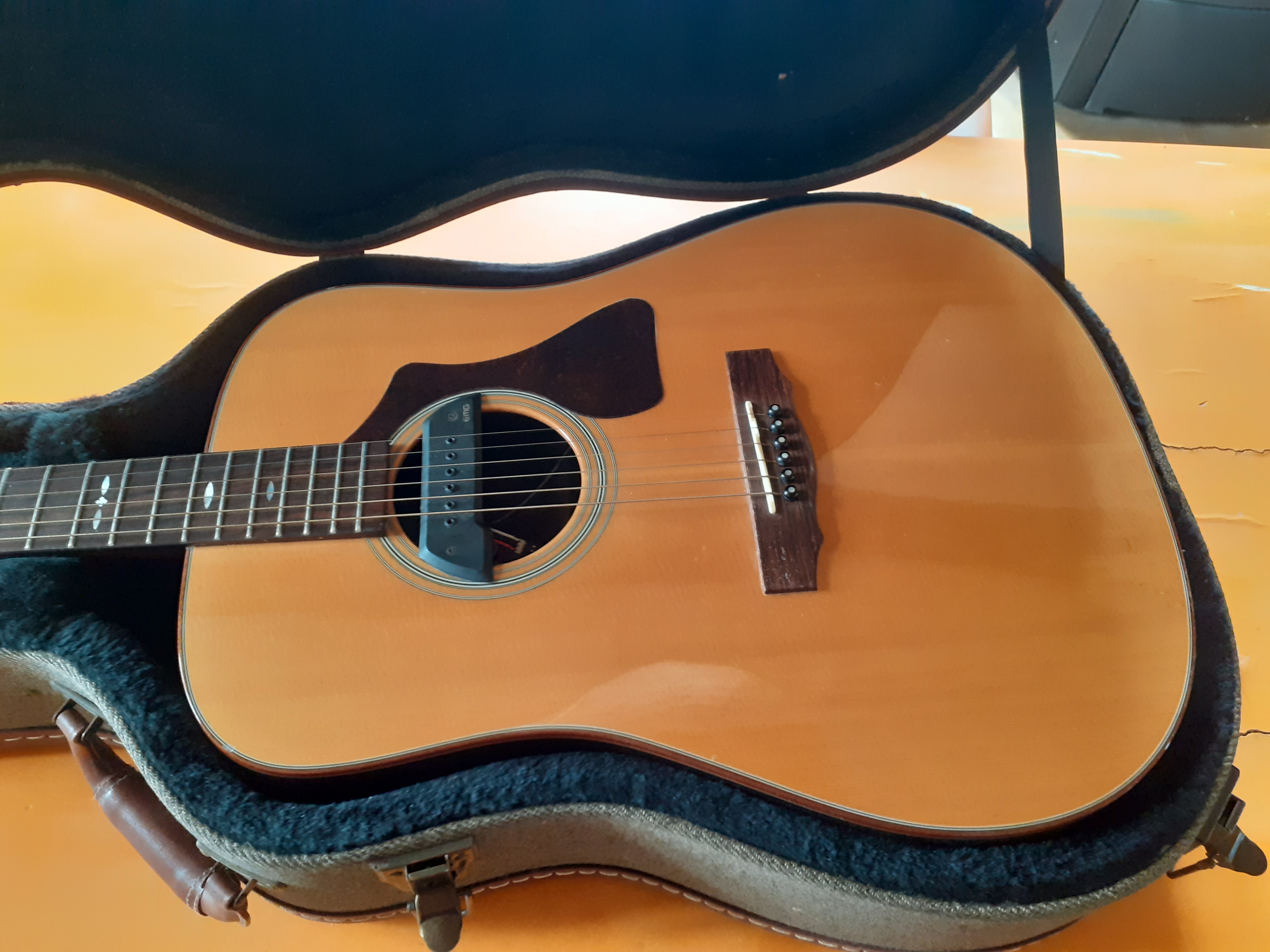 La guitare a été éraflée sous l'avant-bras droit (pas de choc) et revernie par mon luthier toulousain. Reflet légèrement visible selon l'angle d'éclairage.
