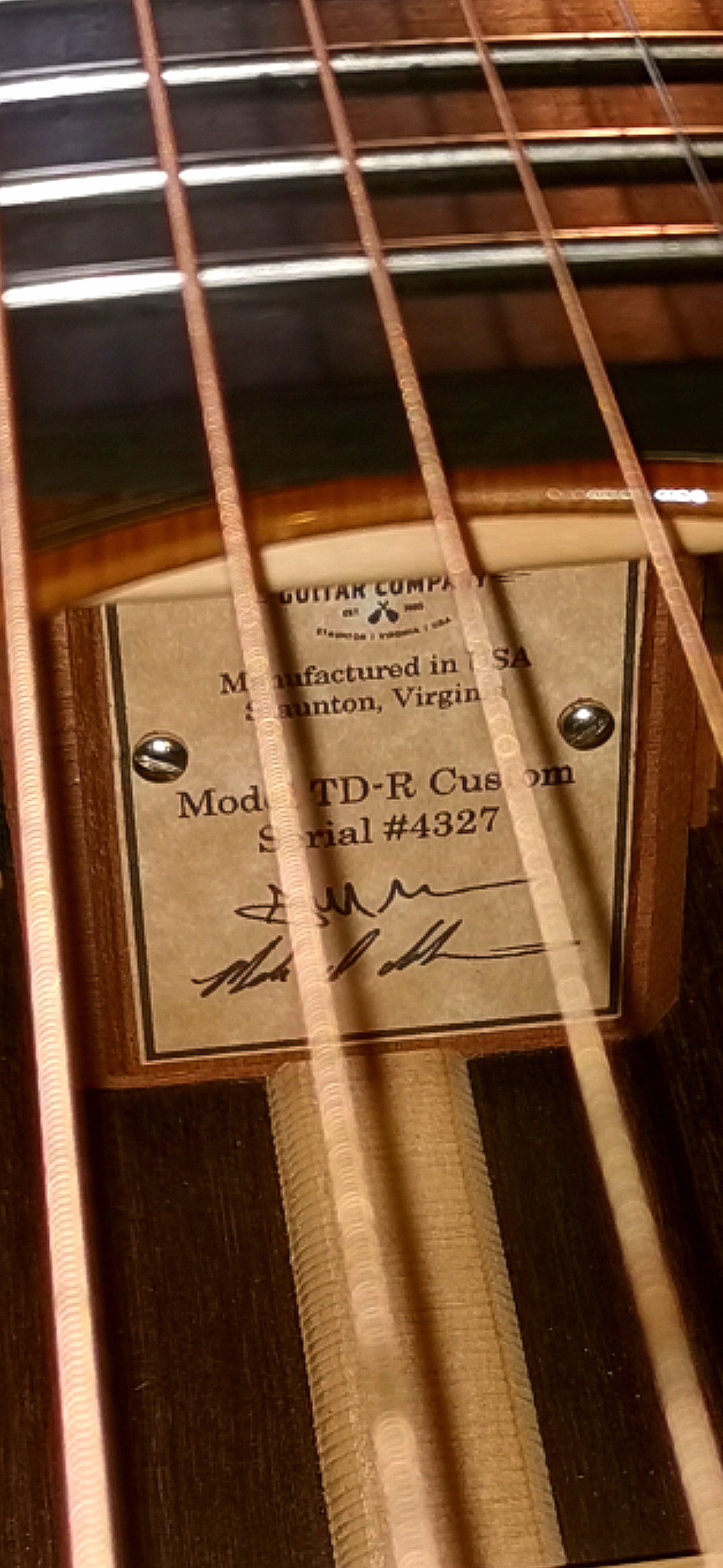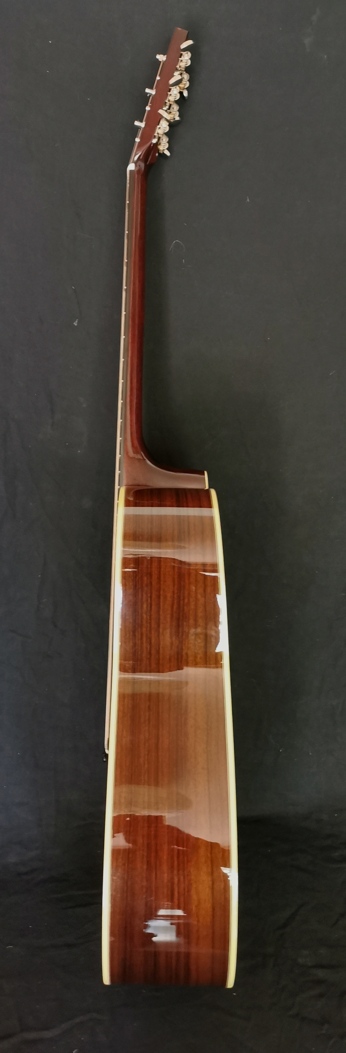 Fabriquée à Staunton, en Virginie, USA, en 2014, numero de serie 4327, cette Huss & Dalton TDR n'a absoluement rien a envier aux plus prestigieuses dreadnought de Martin & Co, elle incarne à merveille le design traditionnel Dreadnought. D'une facture et d'une finition exceptionnelles, la TDR vendue ici, en version Custom, est dotée d'une table en épicéa de Sitka traité thermiquement, associée à du palissandre indien pour le fond et les éclisses. Le corps et le manche sont en acajou tropical, tandis que la touche (radius 14 " ) et le chevalet sont en ébène. La table est ornée d'un filet en chevrons à l'intérieur du filet ivoire. Les repères de touche sont des carrés fendus en nacre. L'accastillage est minimaliste : mécaniques Waverly delux à engrenages ouverts nickelées, sillet de tête et de chevalet en os pour un rendu sonnore encore plus intense, gain de sutain, de projection, et de richesses harmoniques !