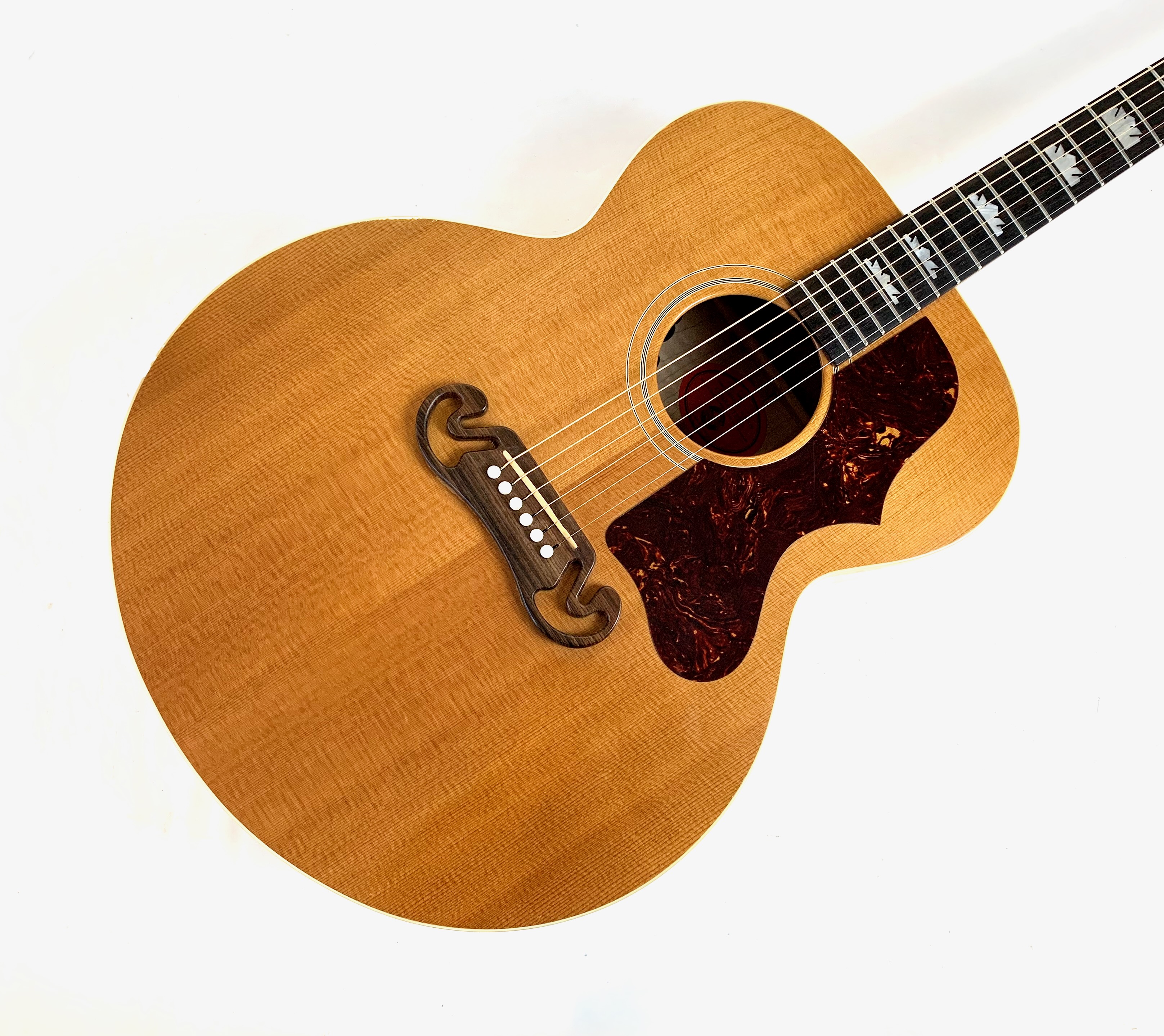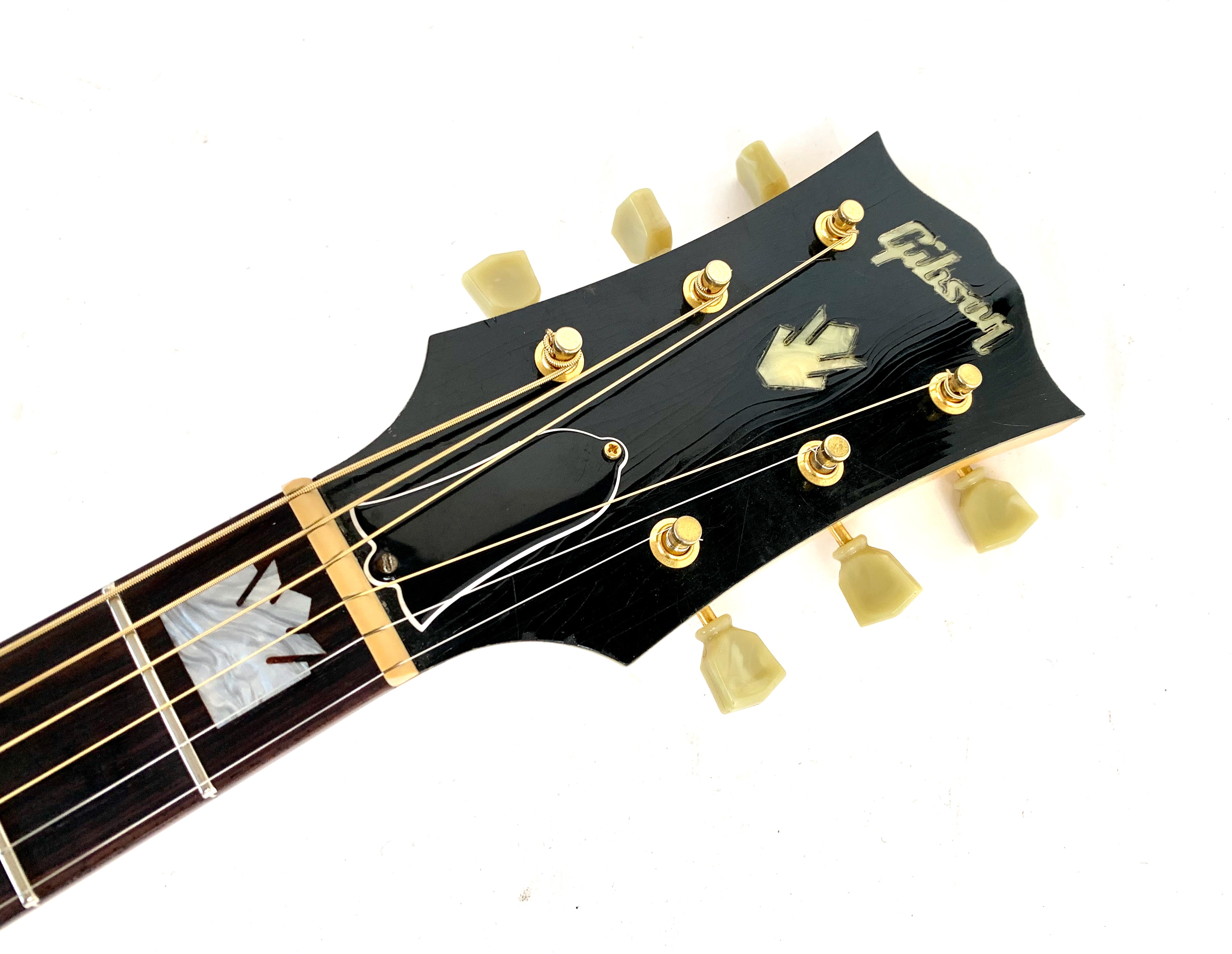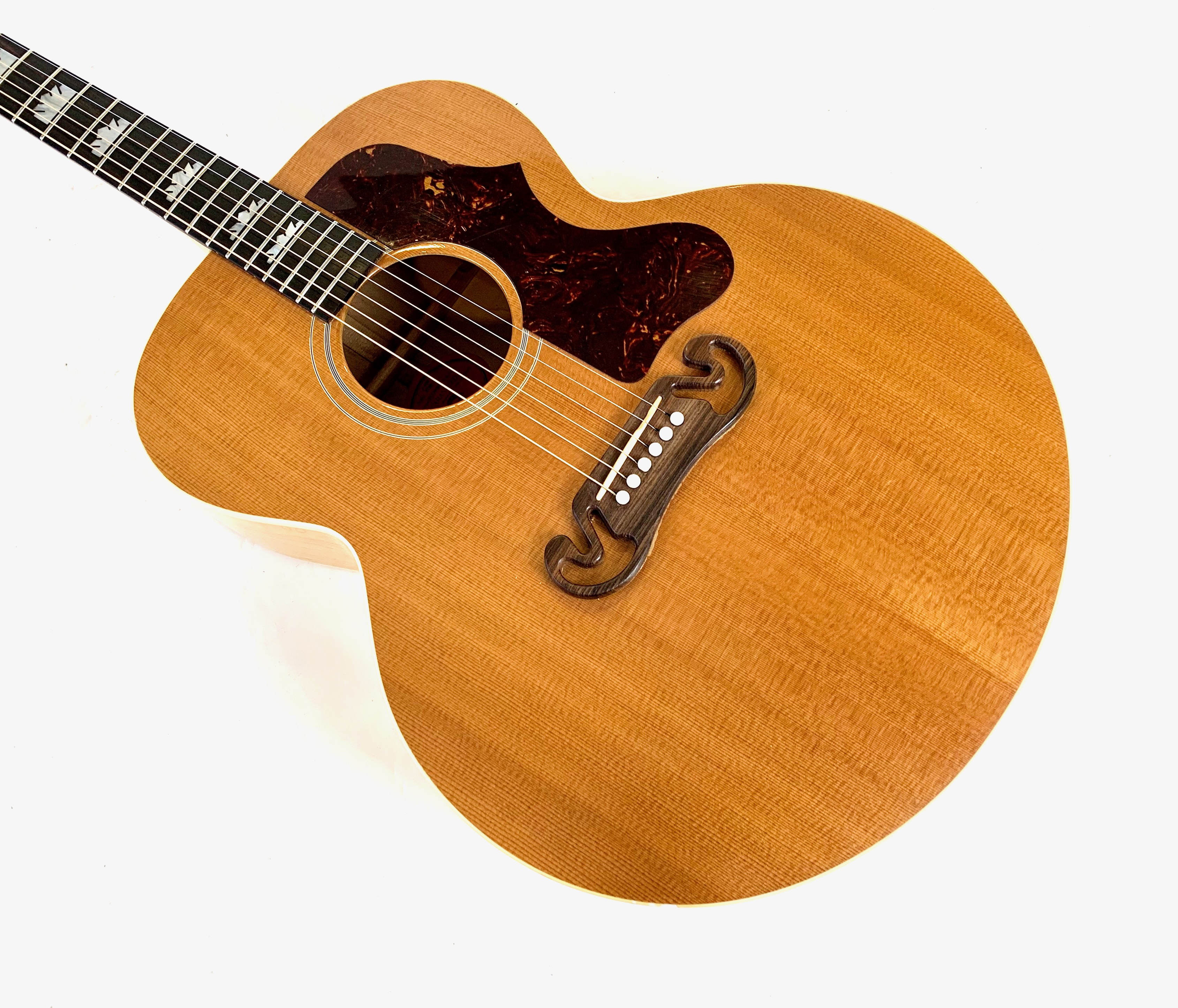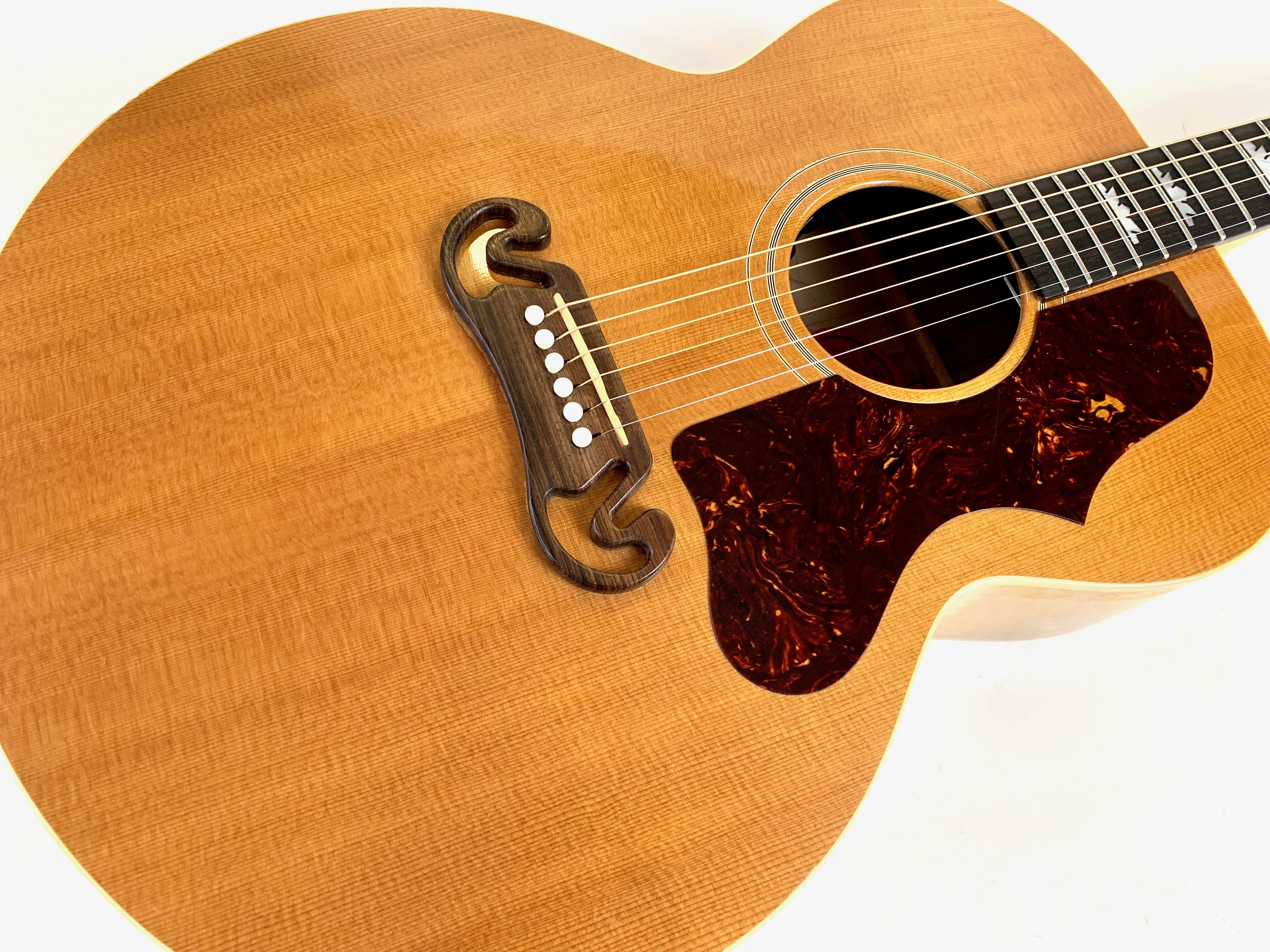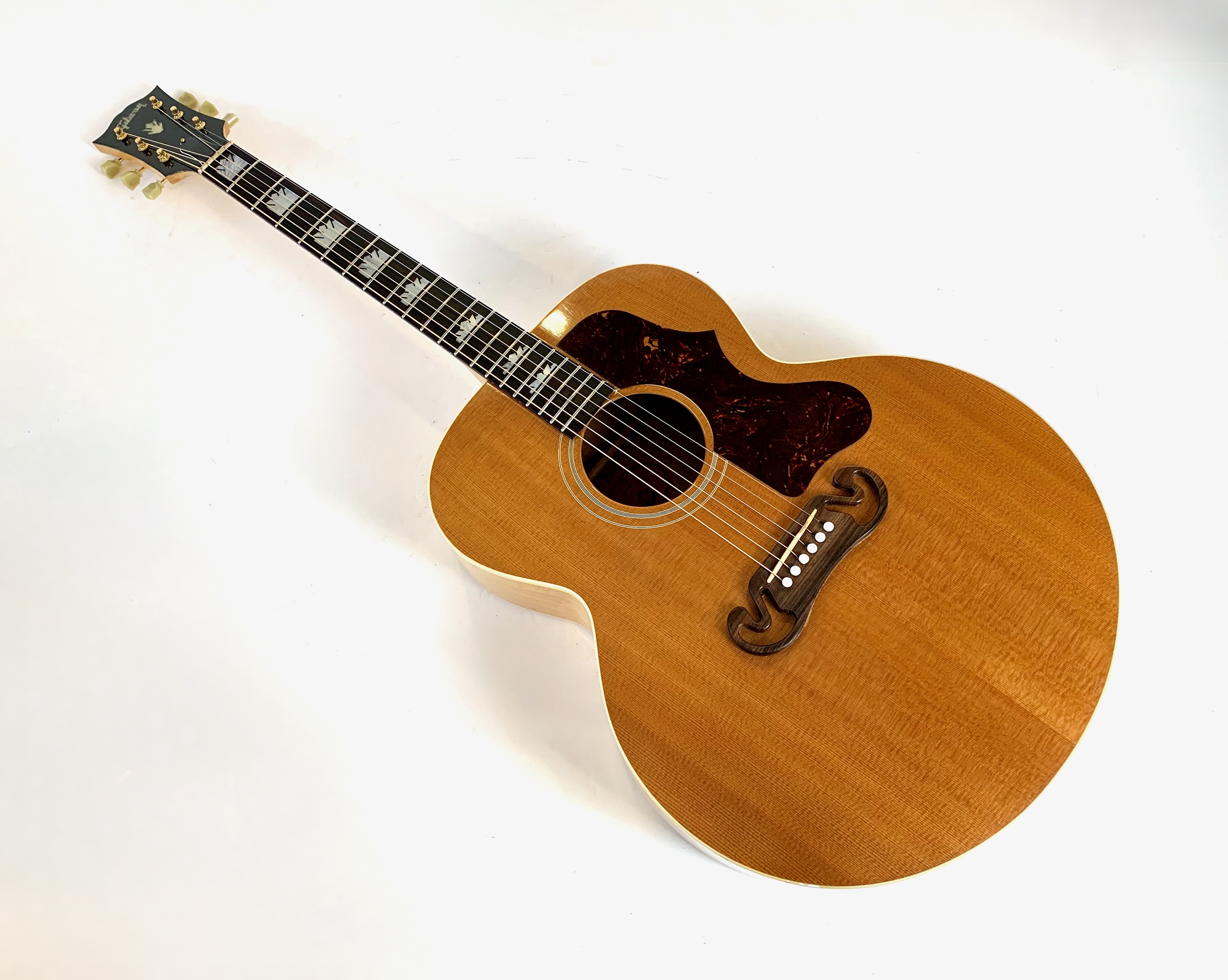 Cette magnifique J100 est la soeur de la reine des Jumbo : la SJ-200. Le manche, le dos et les éclisses en érable fortement ondé offrent un visuel somptueux. La table est faite d'épicéa et la touche de palissandre. On retrouve les éléments iconiques du modèle : le célèbre chevalet moustache ou encore les inlays finement décorés. Côté amplification, elle est équipée d’un micro Fishman, pour un son naturel et précis sur scène. Facile à jouer, elle sort d'un refrettage par le luthier Jean-Baptiste Prodhomme, elle se distingue par son équilibre sonore remarquable. En très bon état, livrée avec ses papiers dans son étui d’origine.Location, achat, vente, reprise, dépôt-vente.