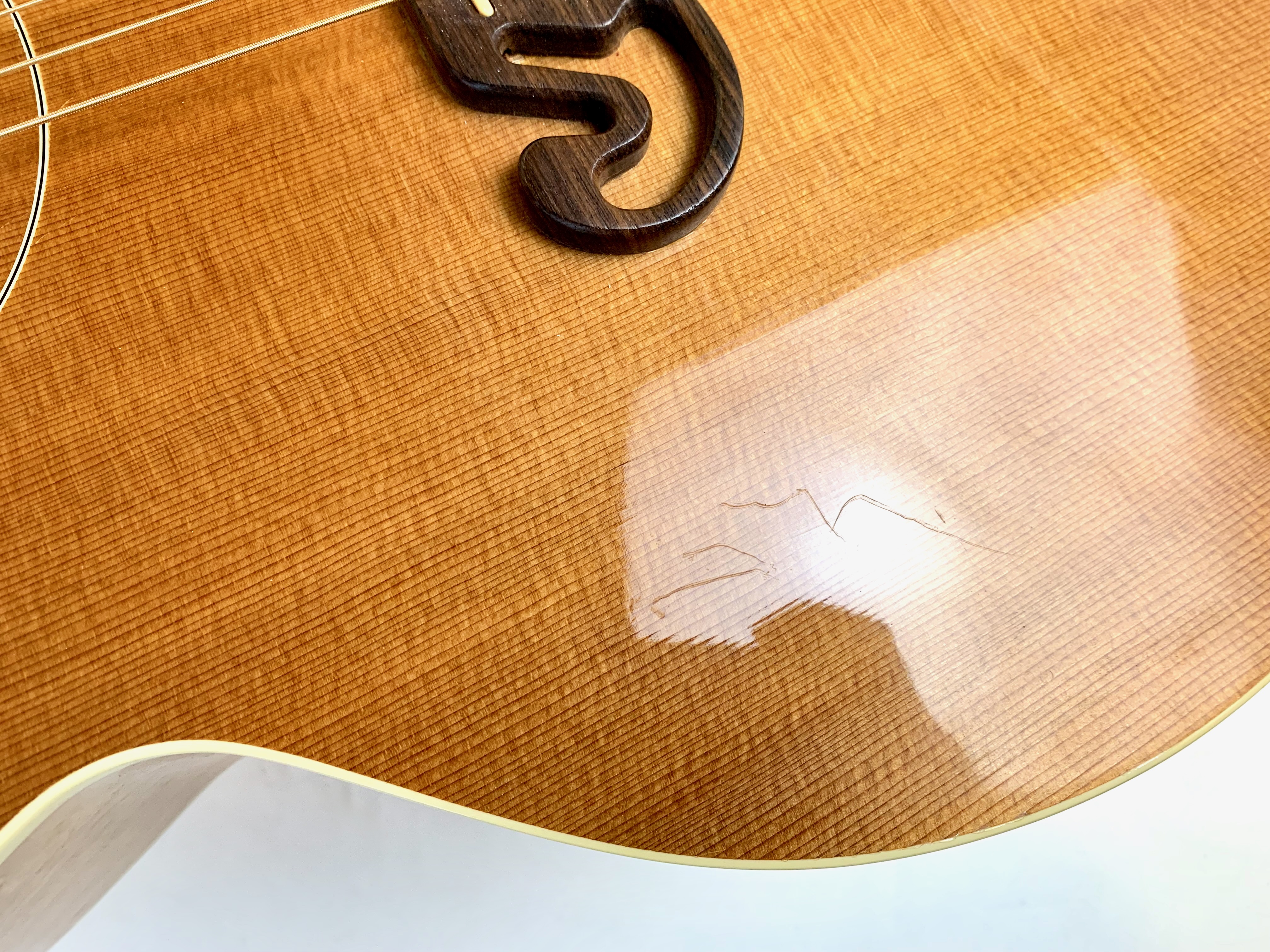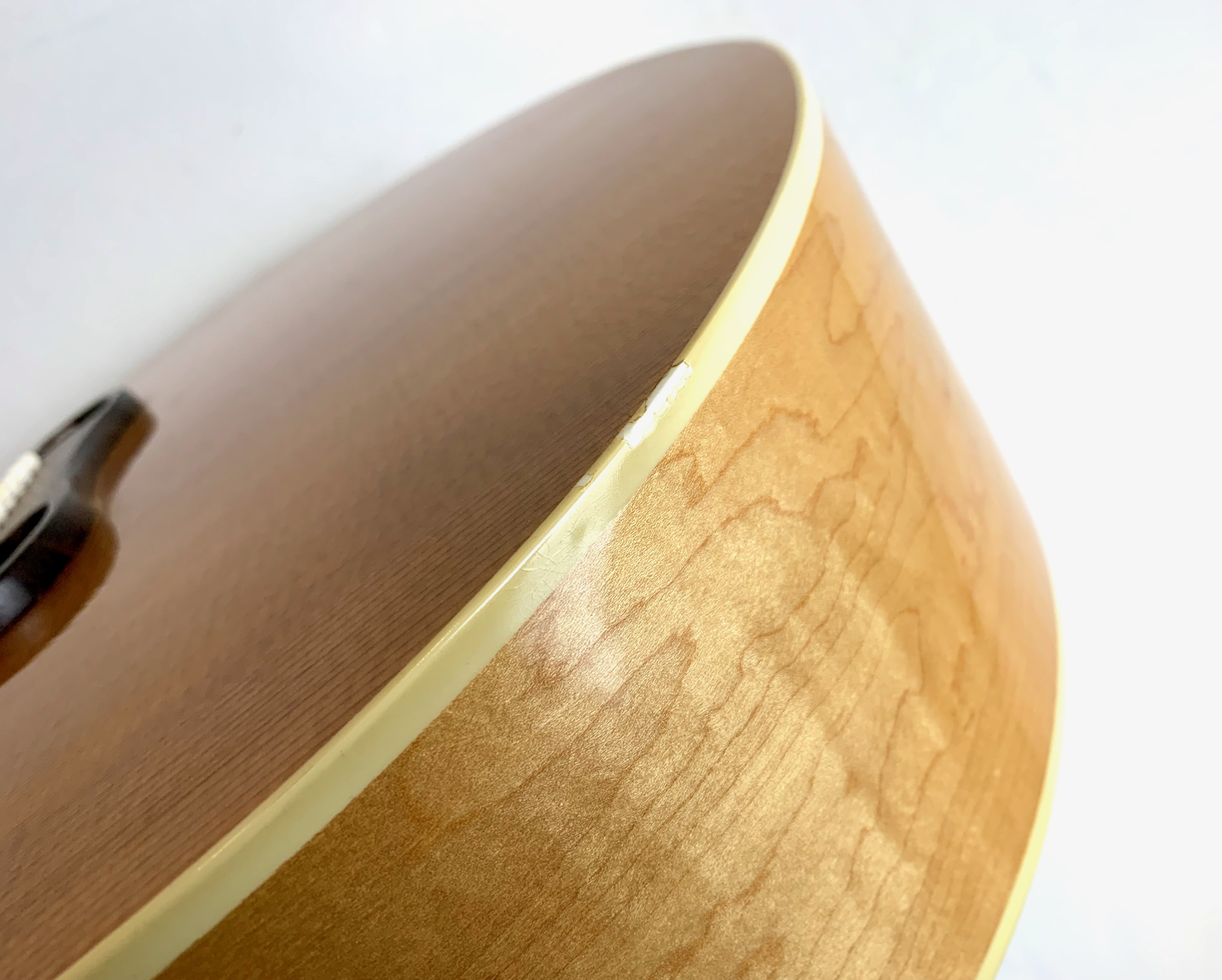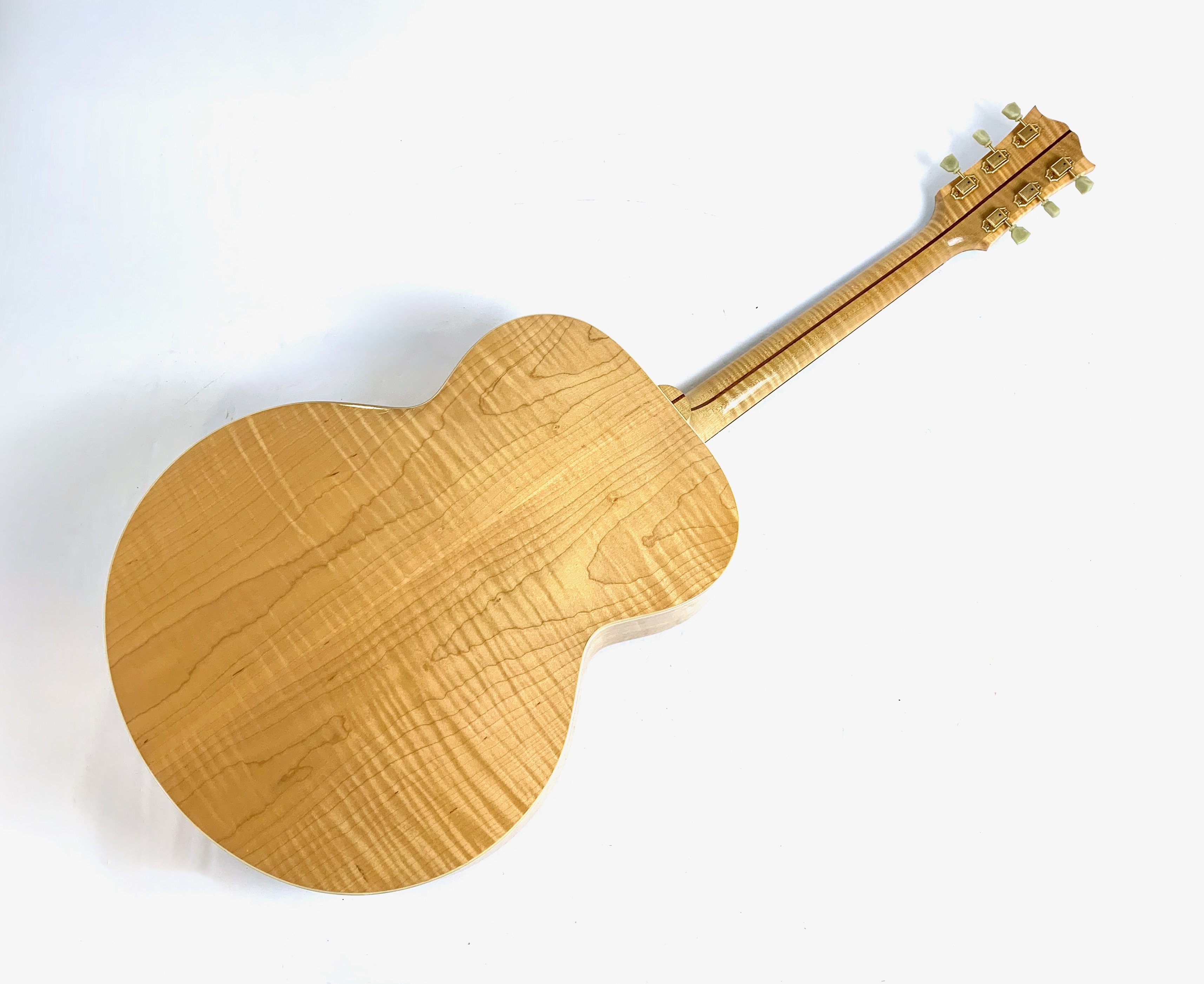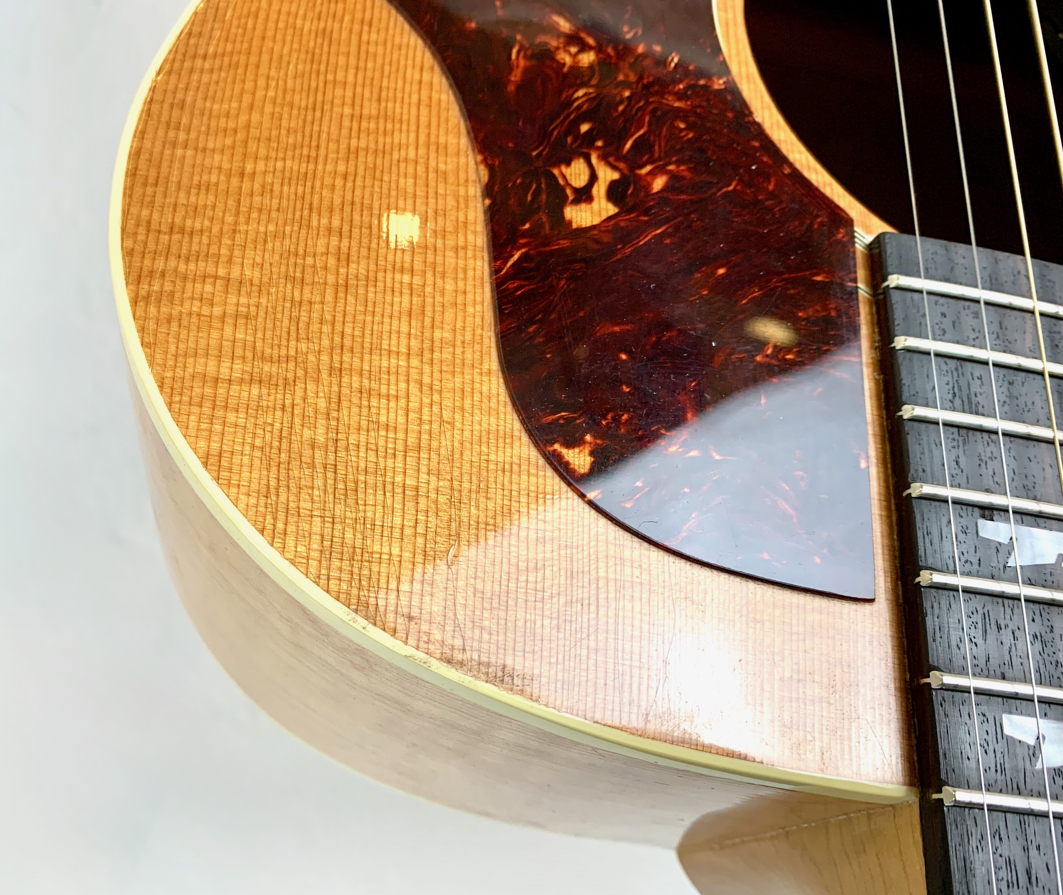 Cette magnifique J100 est la soeur de la reine des Jumbo : la SJ-200. Le manche, le dos et les éclisses en érable fortement ondé offrent un visuel somptueux. La table est faite d'épicéa et la touche de palissandre. On retrouve les éléments iconiques du modèle : le célèbre chevalet moustache ou encore les inlays finement décorés. Côté amplification, elle est équipée d’un micro Fishman, pour un son naturel et précis sur scène. Facile à jouer, elle sort d'un refrettage par le luthier Jean-Baptiste Prodhomme, elle se distingue par son équilibre sonore remarquable. En très bon état, livrée avec ses papiers dans son étui d’origine.Location, achat, vente, reprise, dépôt-vente.