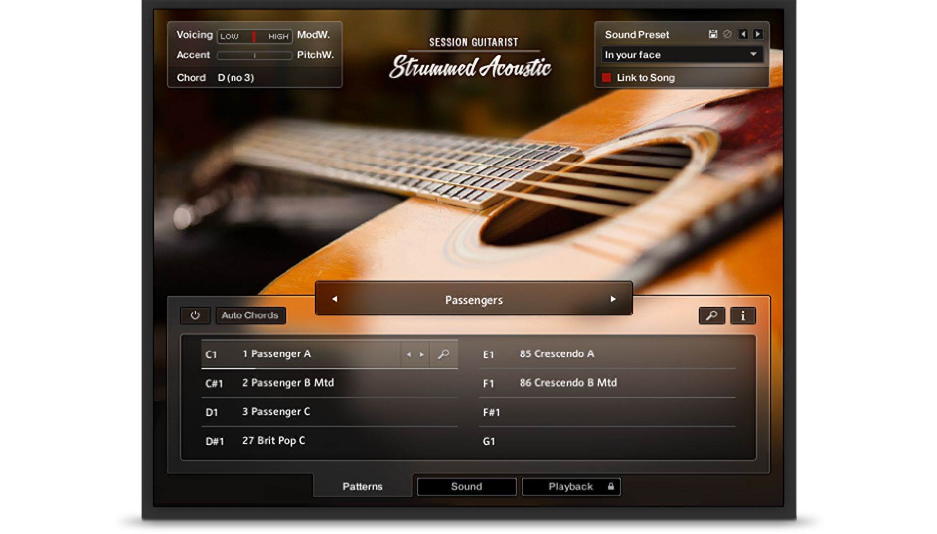 La collection de 8.5GB vous permet de réaliser des compositions à base d’accords à la guitare folk pour tous les styles, y compris le jazz le plus complexe. La bibliothèque de patterns de strums vous permet d’ailleurs de faire une recherche en vous basant sur la position des accents.