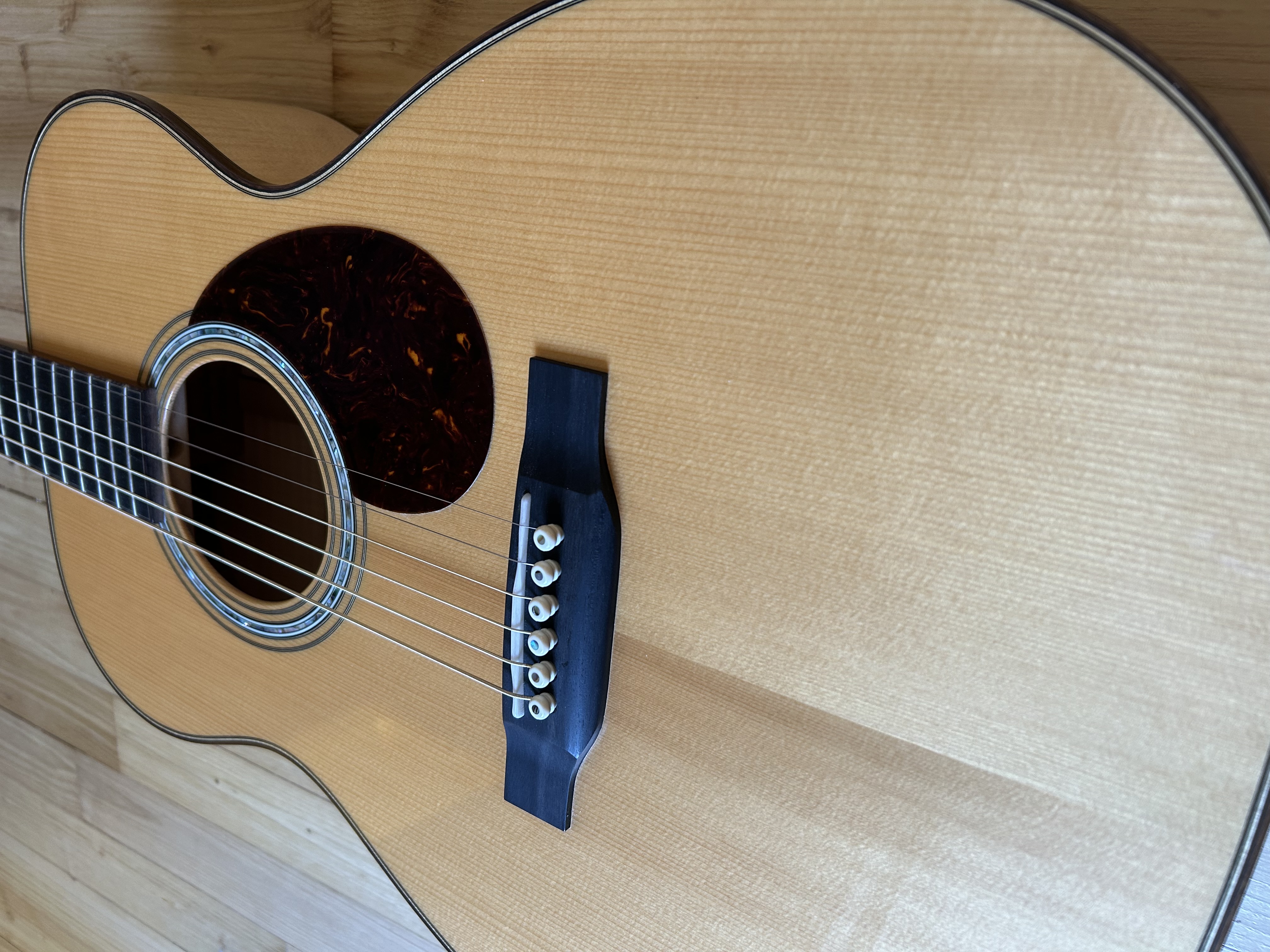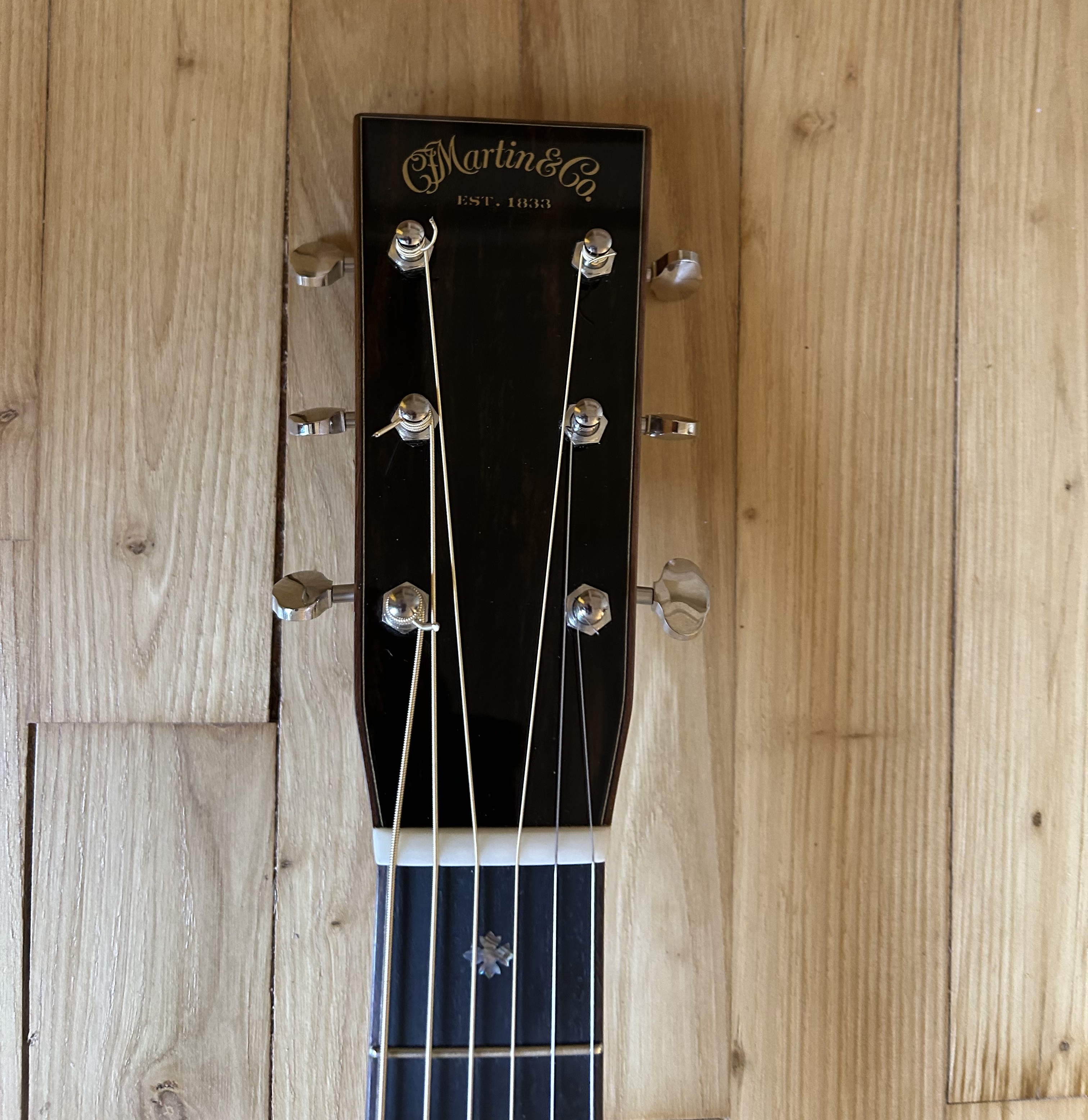 - Bindings en plum katalox autour de la tête, du manche, de la table et du dos (type séries 45), inlays de la touche type 00-42.