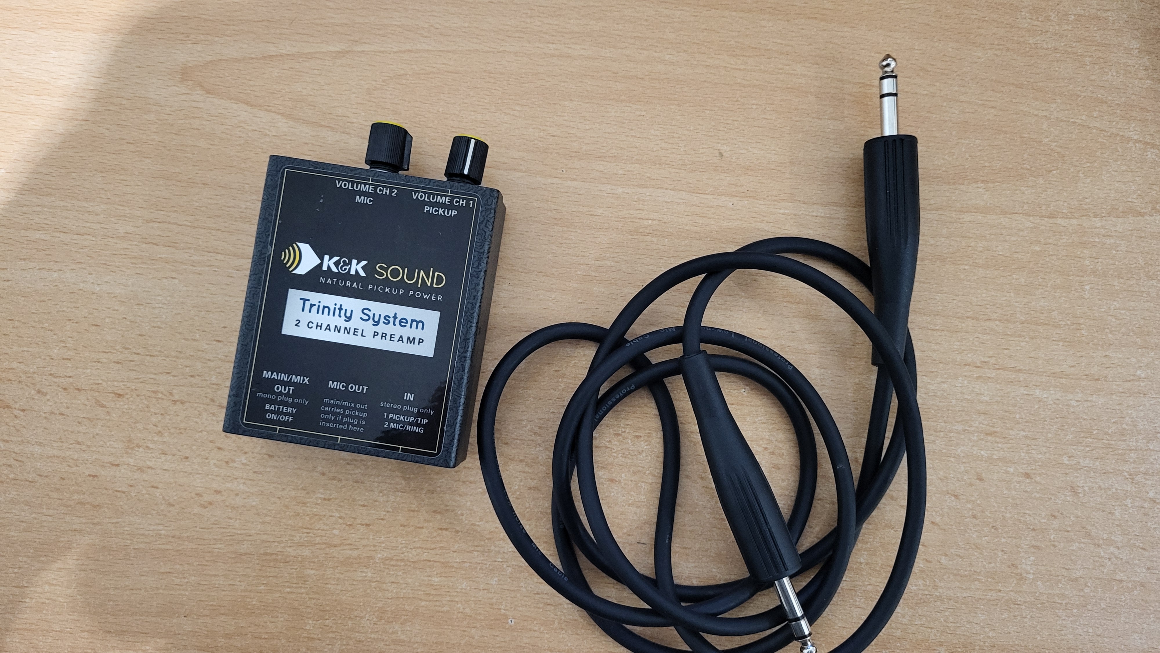 • Système k&k trinity pro mini système installé avec préampli externe qui ne défigure pas l'éclisse de la guitare . Le préampli comprend un eq 3 bandes.