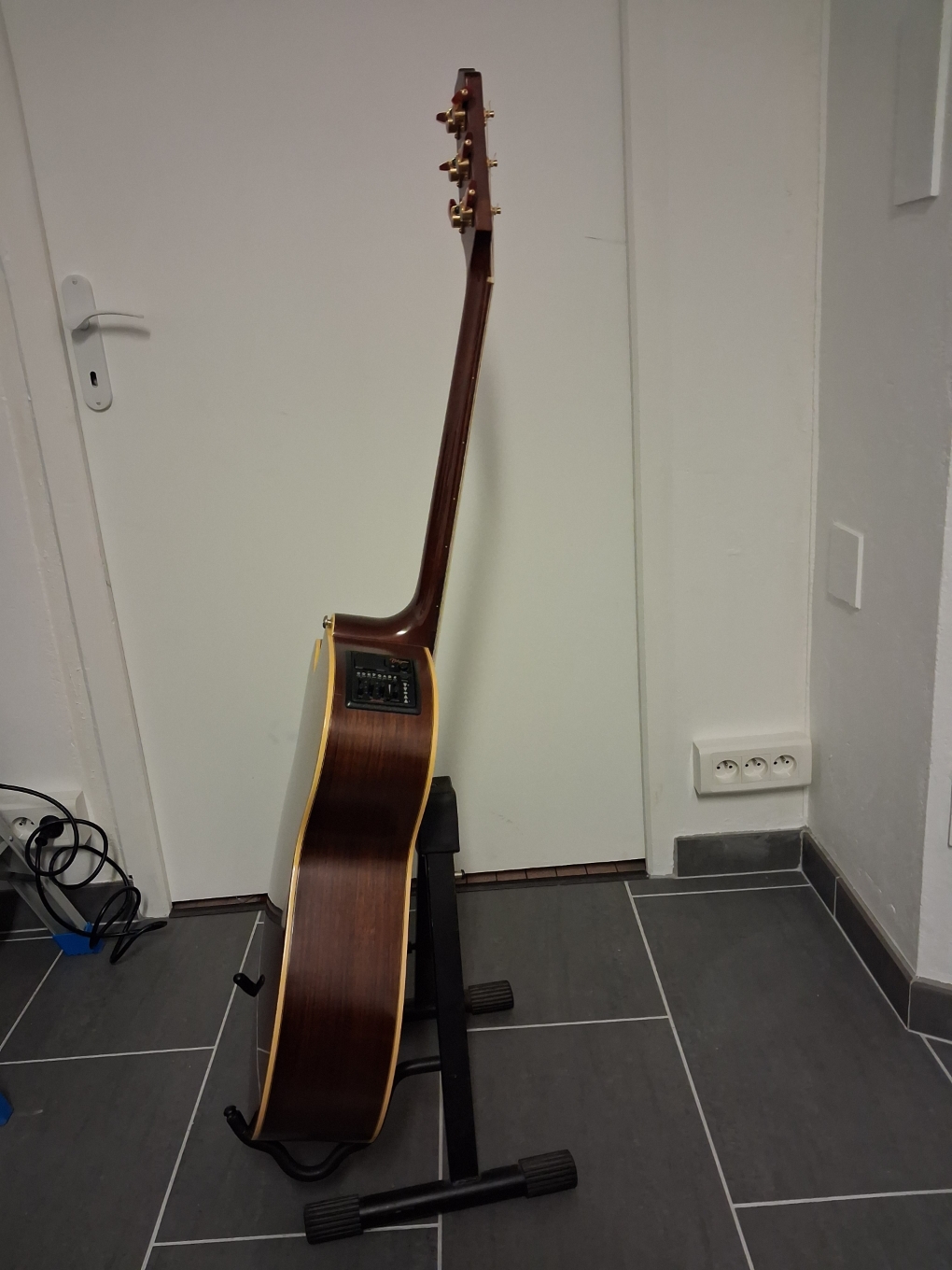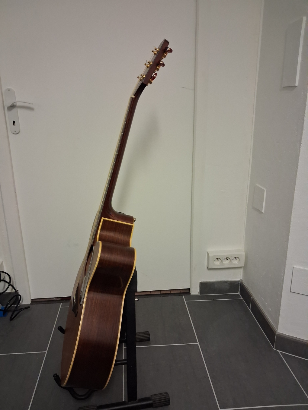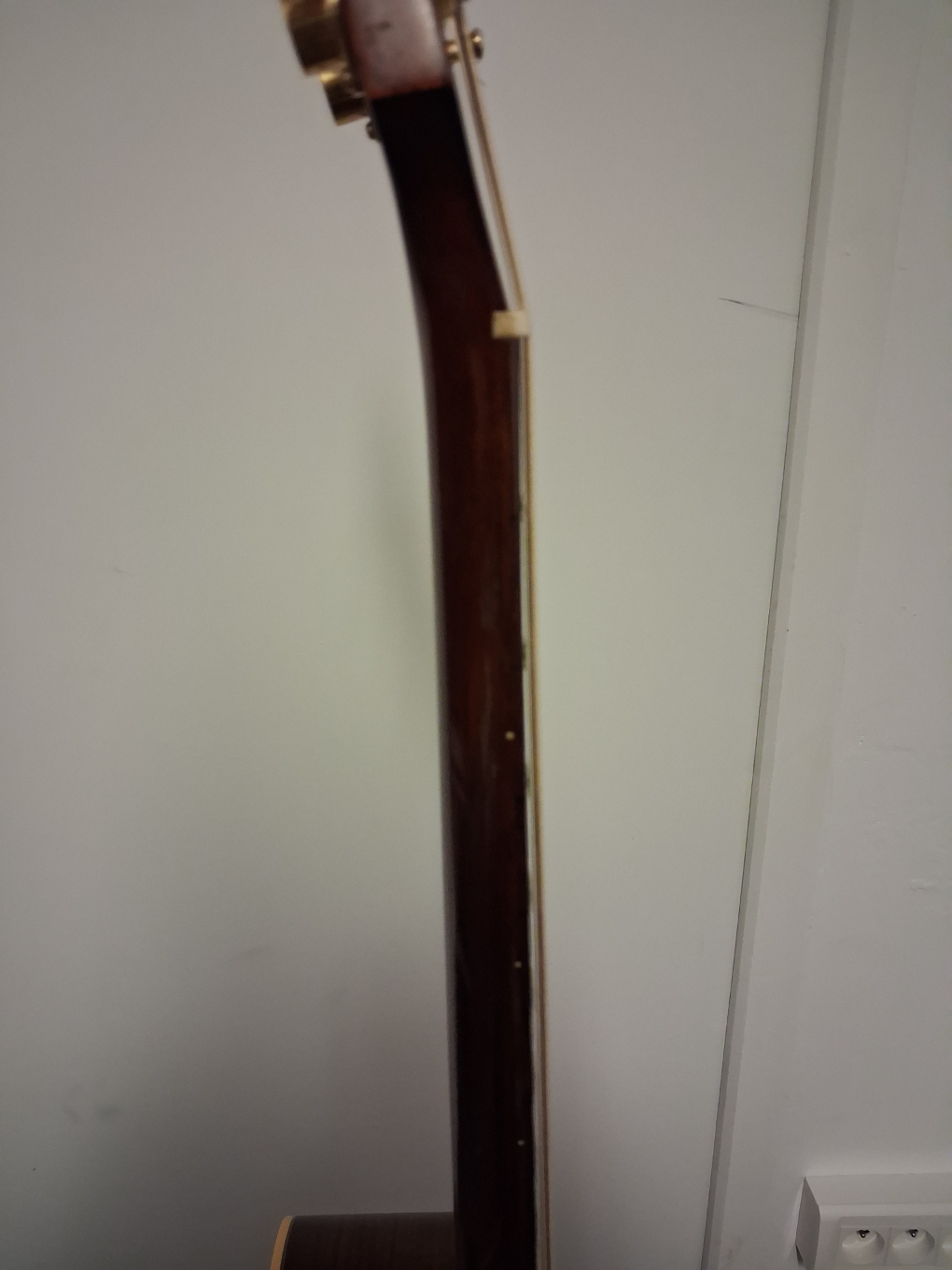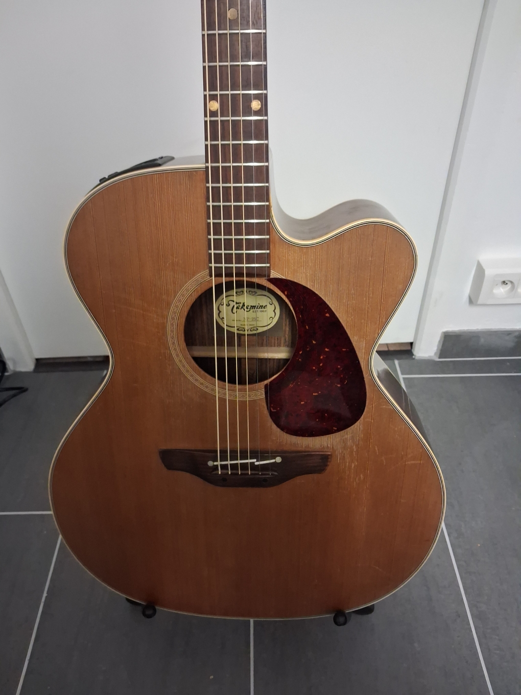 La guitare est en bon état. Quelques griffures de médiator au niveau de la table aucune fissure. Elle a été réglée cet été par un luthier.