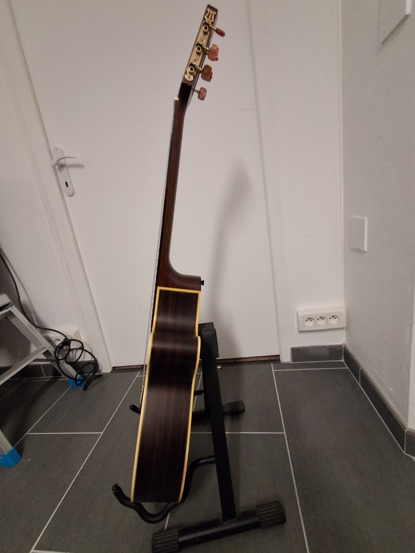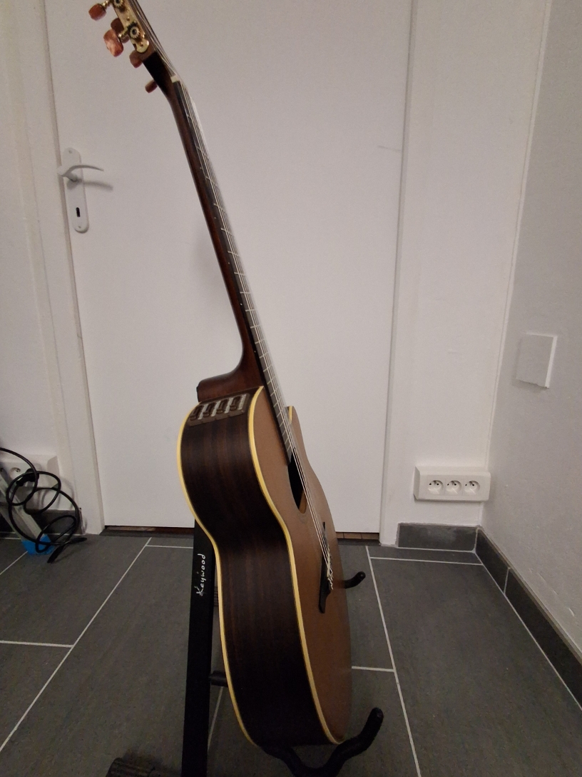 La guitare est en bon état. Quelques griffures de médiator au niveau de la table aucune fissure. Elle a été réglée cet été par un luthier.