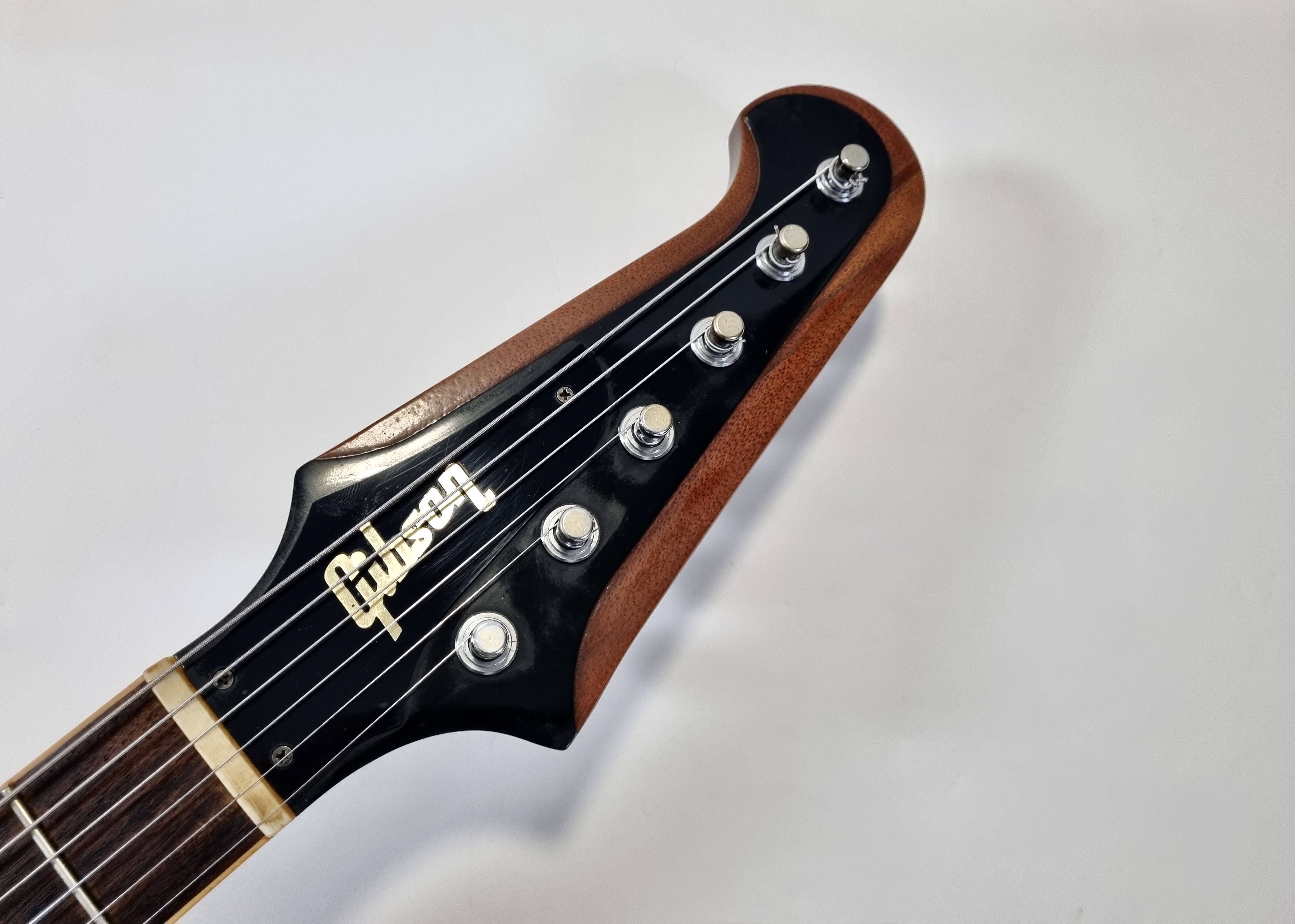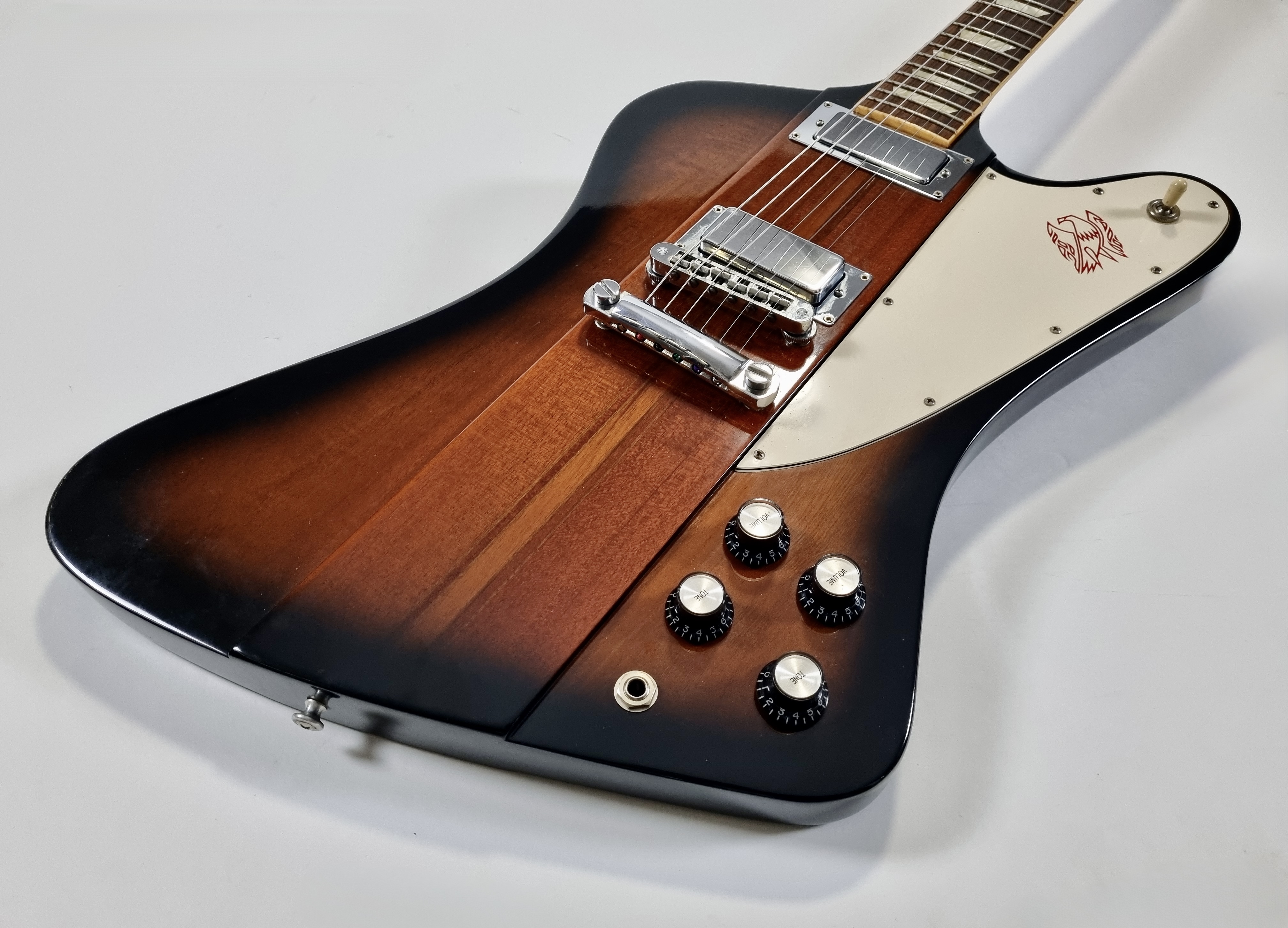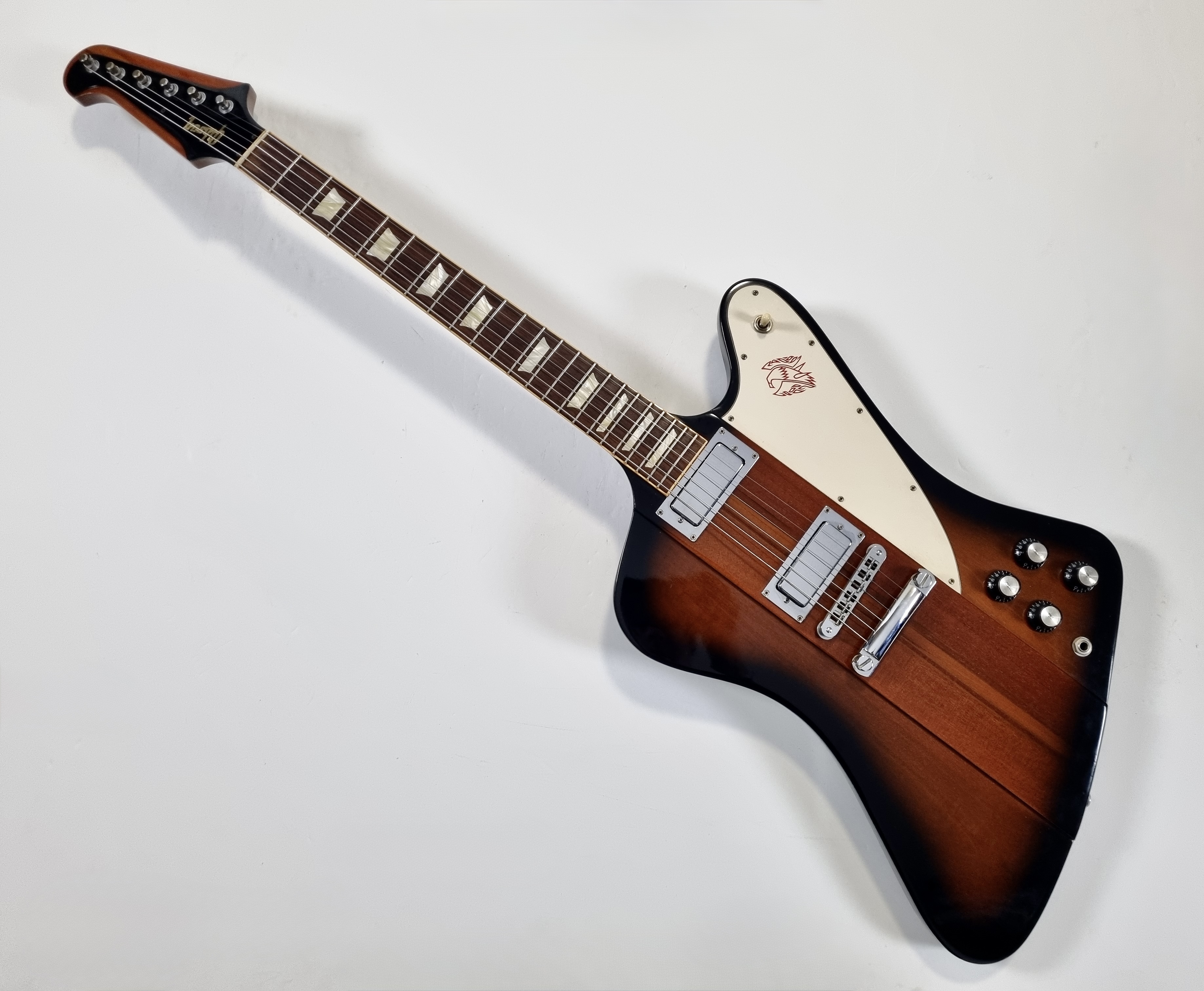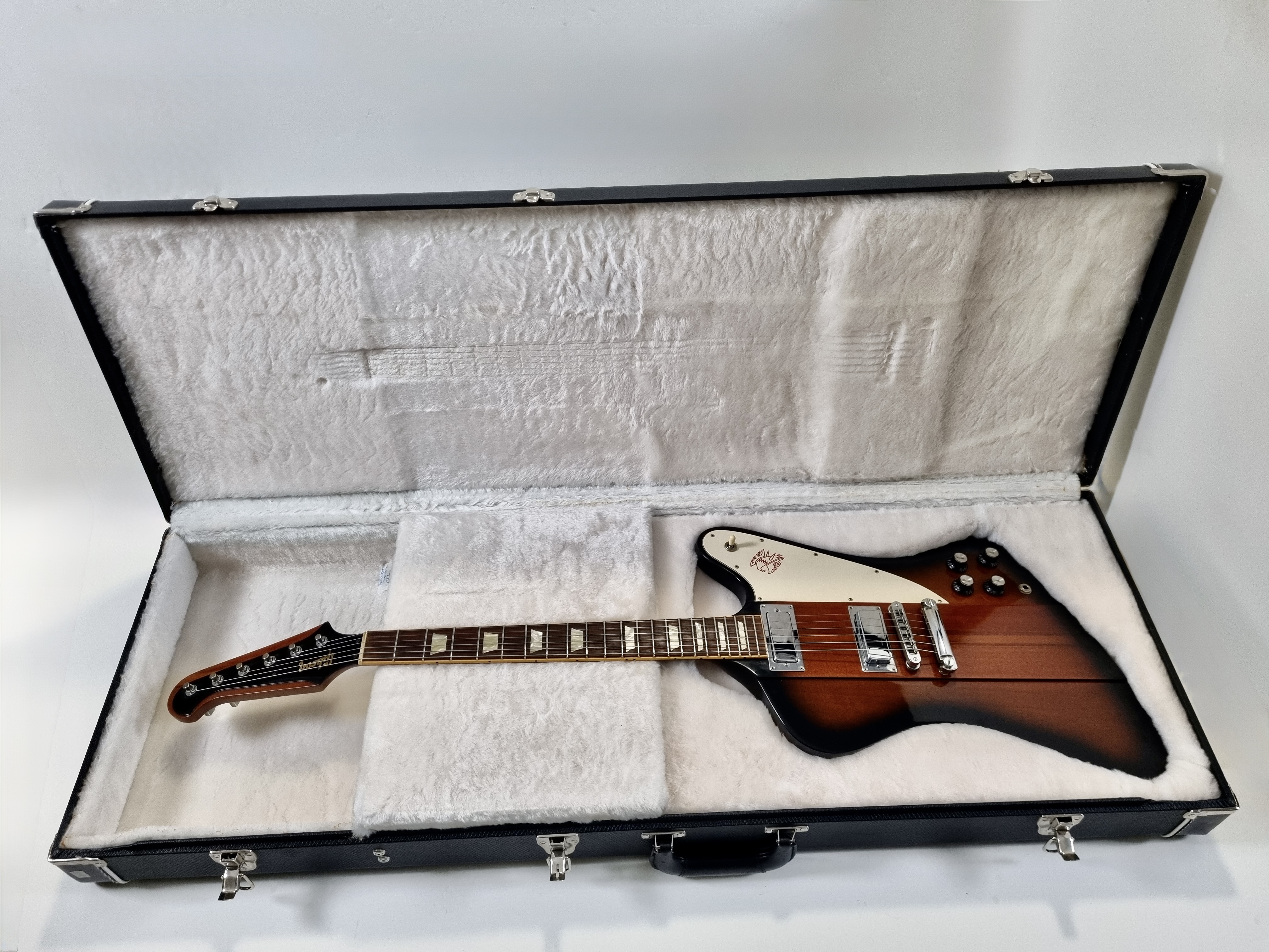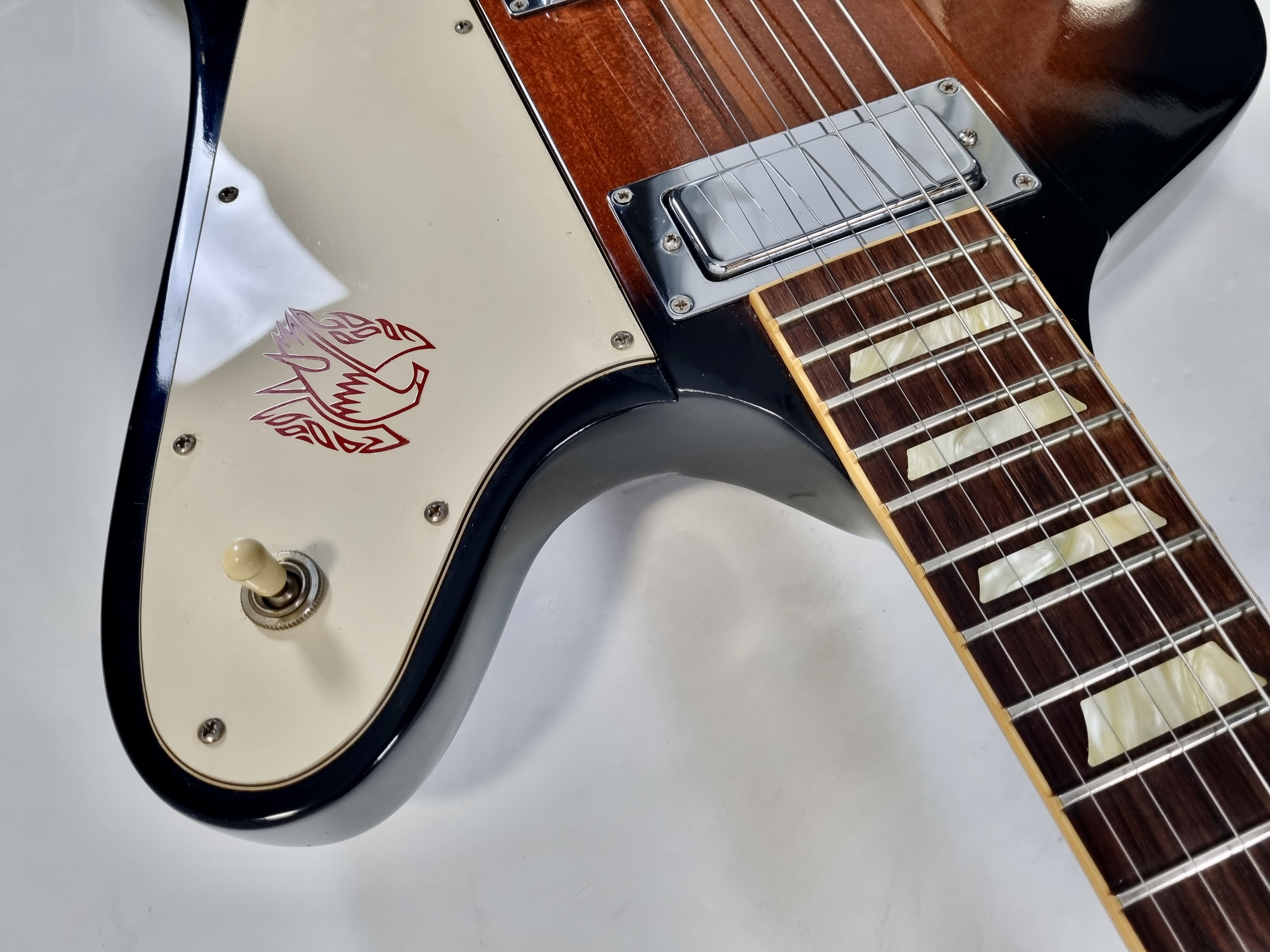« L’oiseau de feu » est arrivé sur le marché en 1963, avec son look tapageur et son manche traversant, elle bouscule le paysage guitaristique. Au début de sa carrière, la Firebird a un corps dit « reverse » mais à partir de 1965, celui-ci devient « non reverse ». Les repères trapèzes sur la touche en palissandre, les mécaniques de type banjo, une paire de micros mini-humbucker, le tout sur une construction avec des ailes en acajou, cette Firebird en jette ! En trés bon état, vendue dans son étui d'origine.Location, achat, vente, reprise, dépôt-vente.