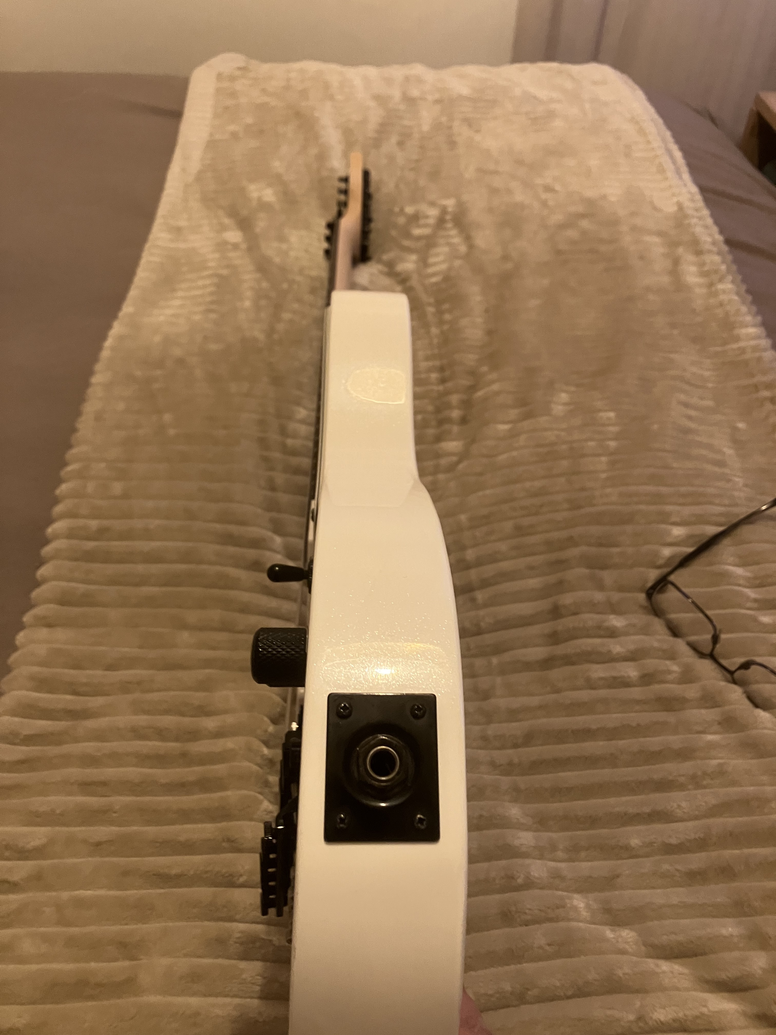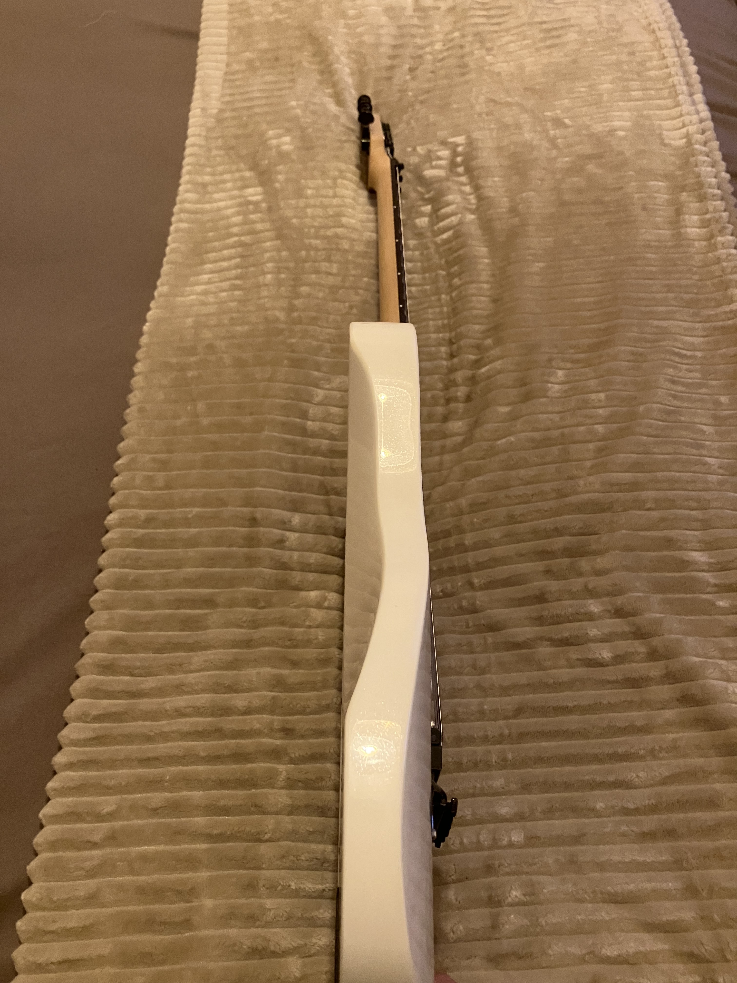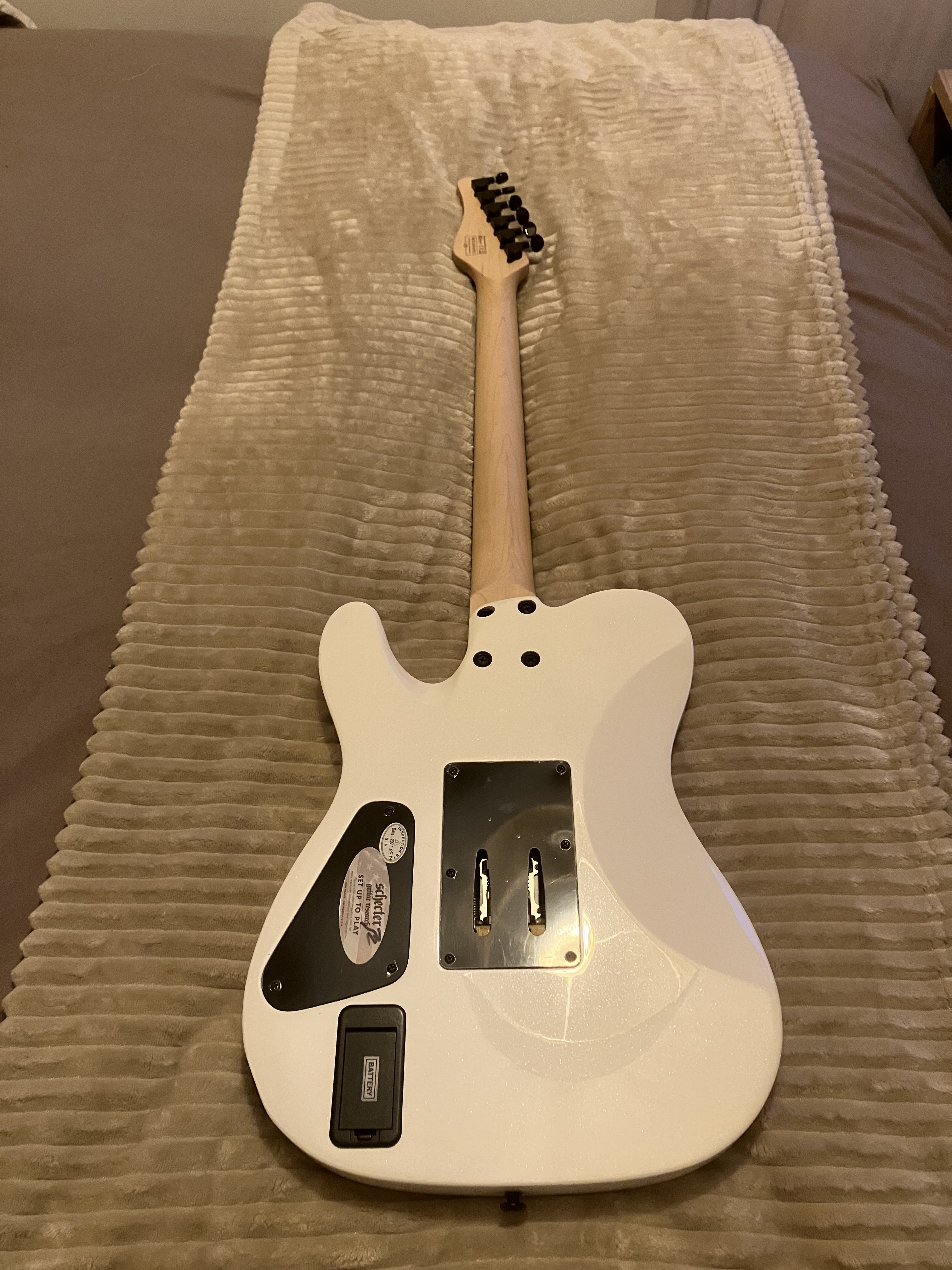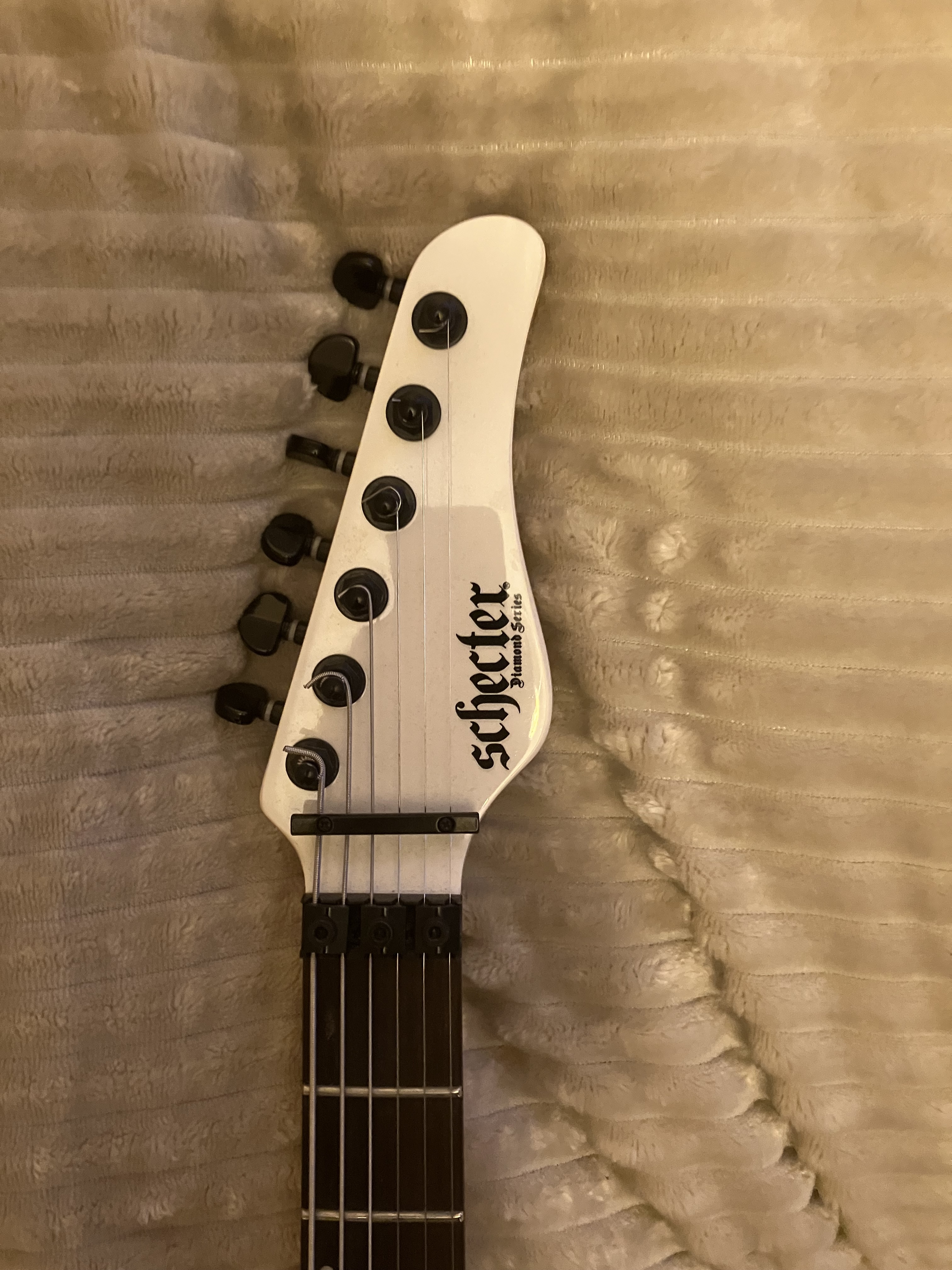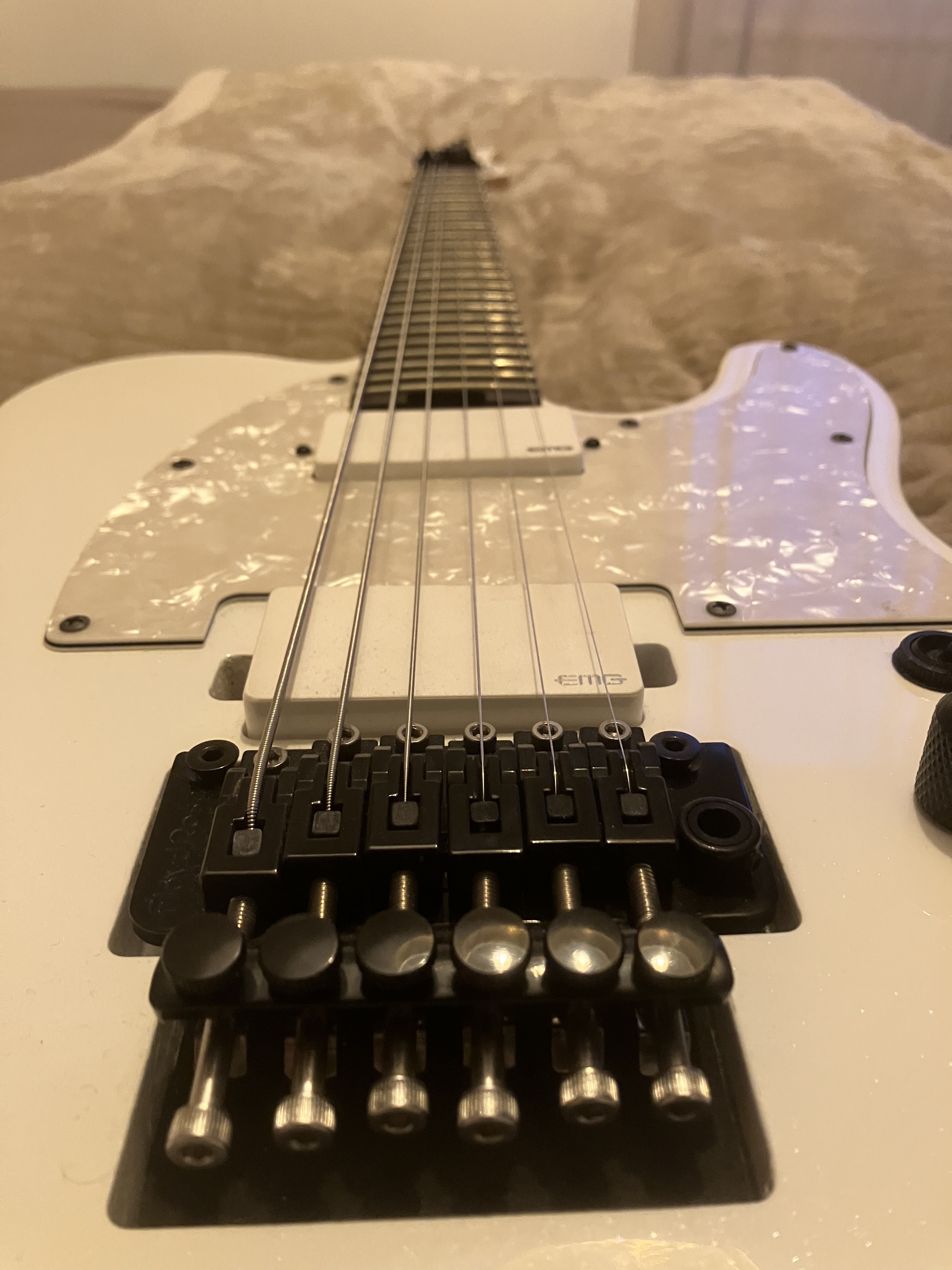 Guitare Schecter Sun Valley Super Shredder PT FR Metalllic White équipe de deux micros EMG actif, très rare dans cette configuration.Le Floyd est bloqué mais peux se débloquer facilement.