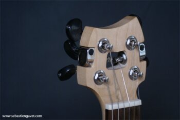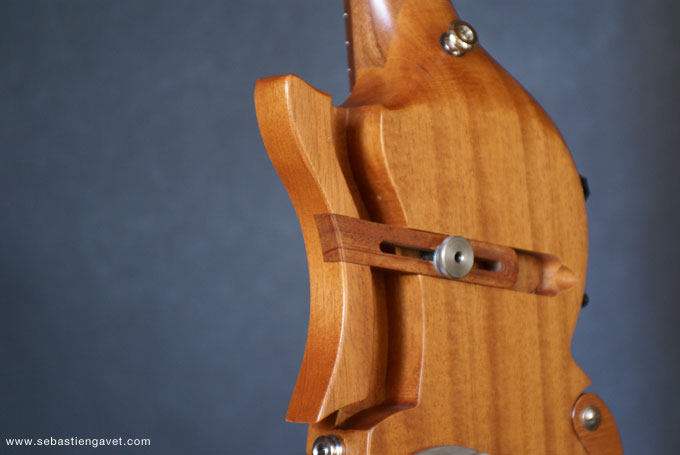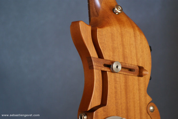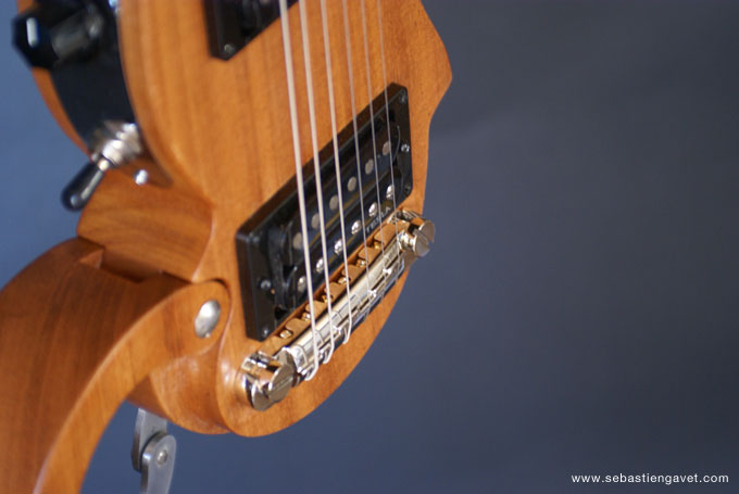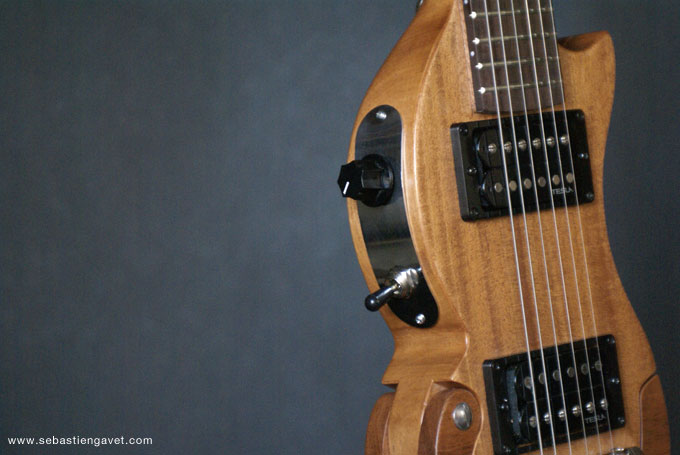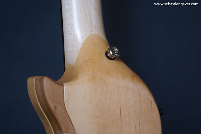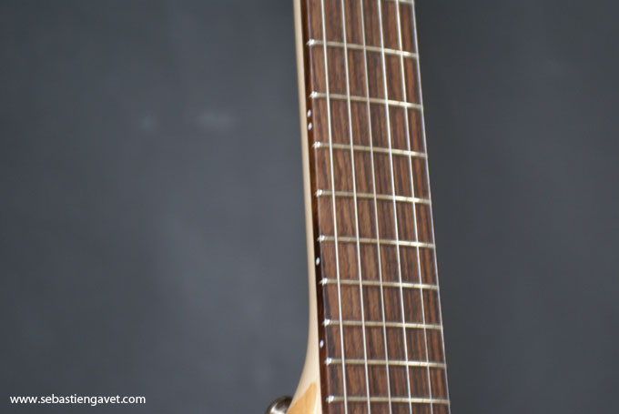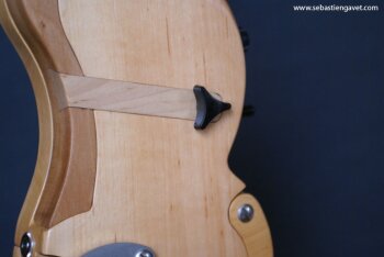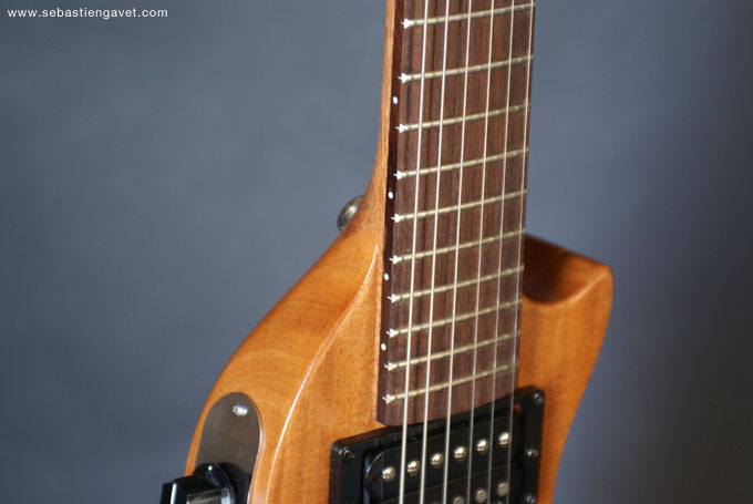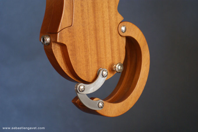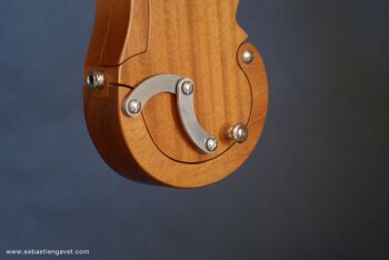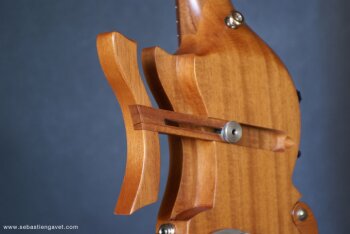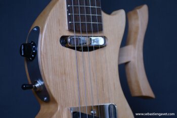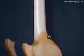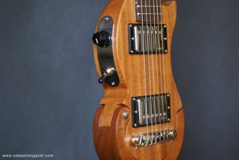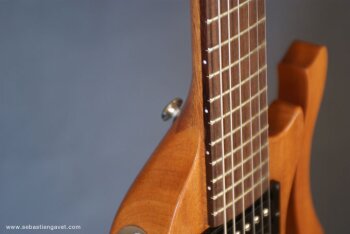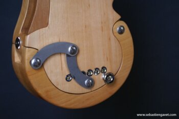 D’autre part, Sébastien Gavet a travaillé avec Judge Fredd sur une guitare de type Explorer appelée XS, dont le corps en sipo intègre une pièce coulissante en inox qui permet de poser son bras. Le manche est en sipo, la touche en palissandre et le diapason de 628mm. La guitare est équipée de mécaniques bloquantes Hipshot, d’un chevalet Hipshot GrandBaby, d’un micro unique SP Custom JudgeBucker en position chevalet (avec ou sans capot) accompagné d’un contrôle de volume et d’un autre de tonalité avec push/pull. Vous pourrez choisir entre deux finitions noire ou rouge (huilée/cirée) et des tirants de cordes de 10–46 ou 9–46. Cette guitare est proposée au tarif de 1480€.