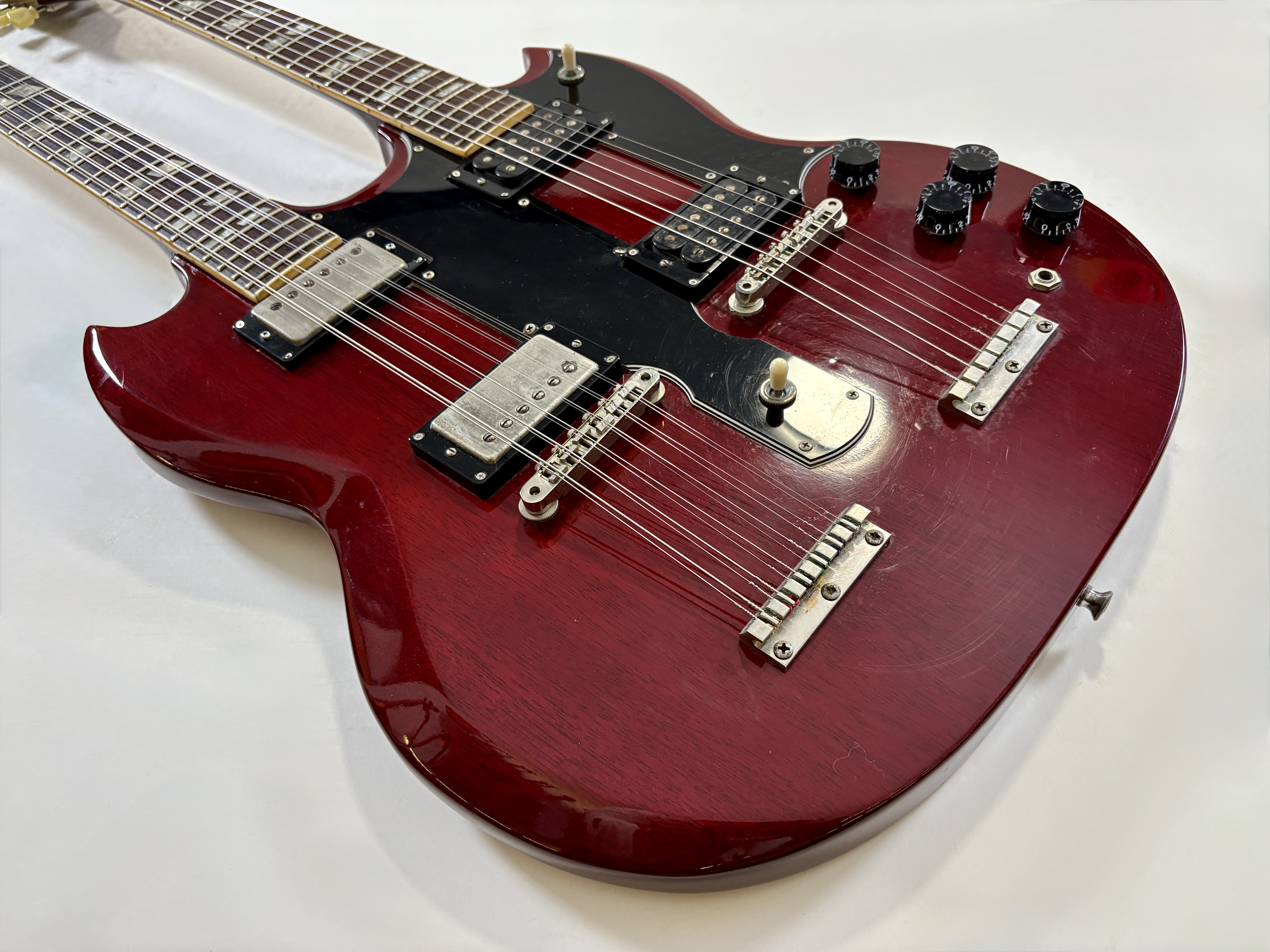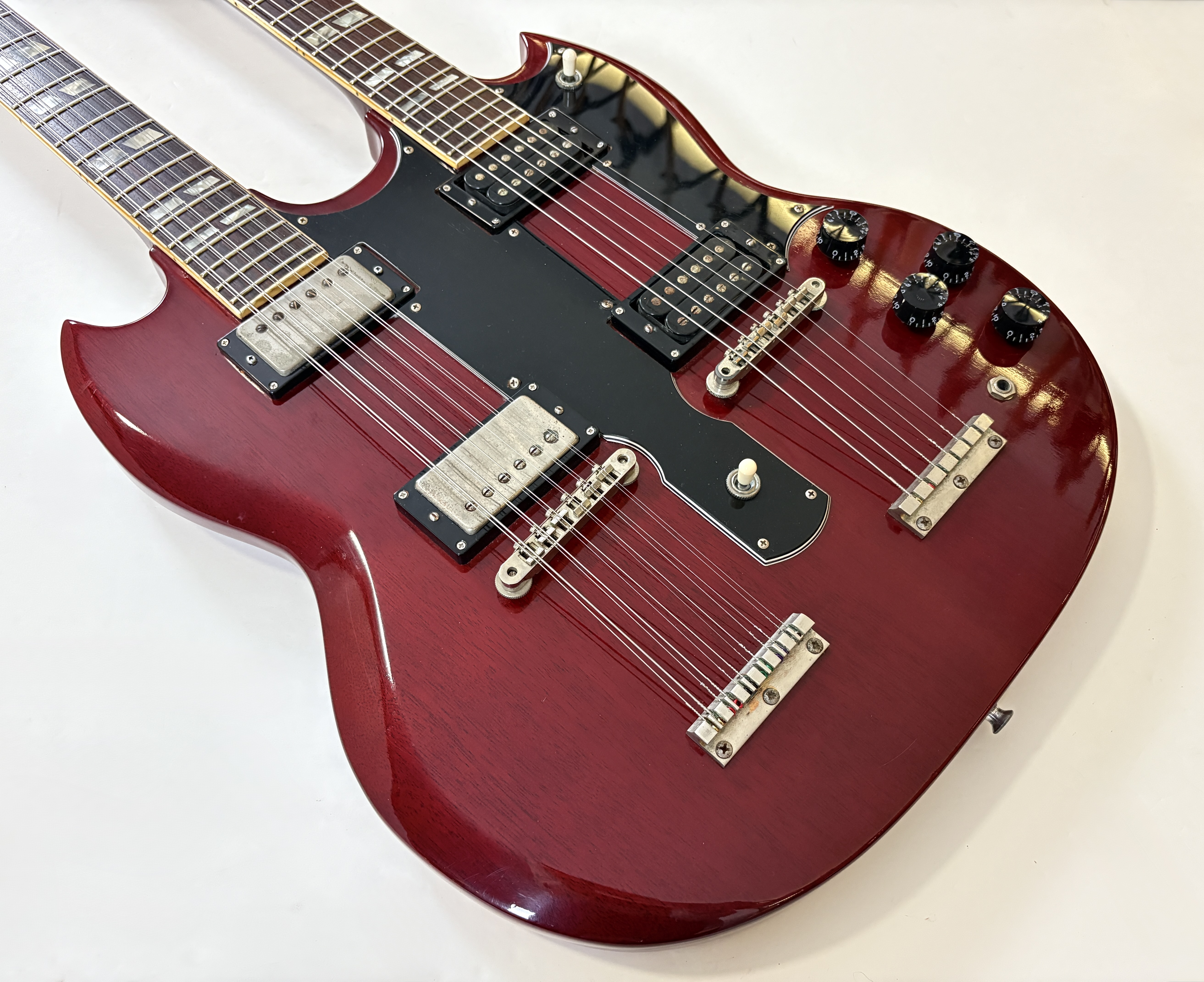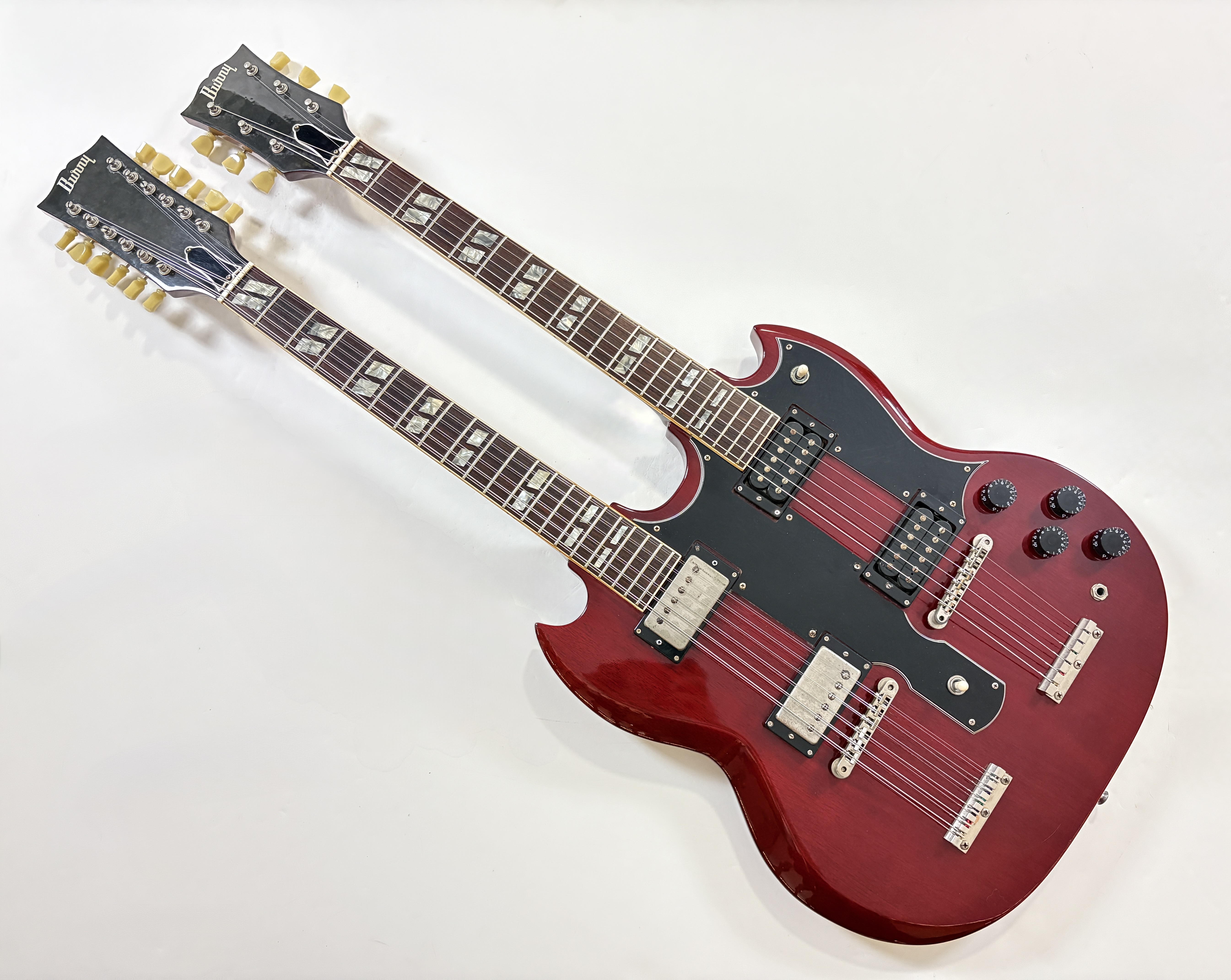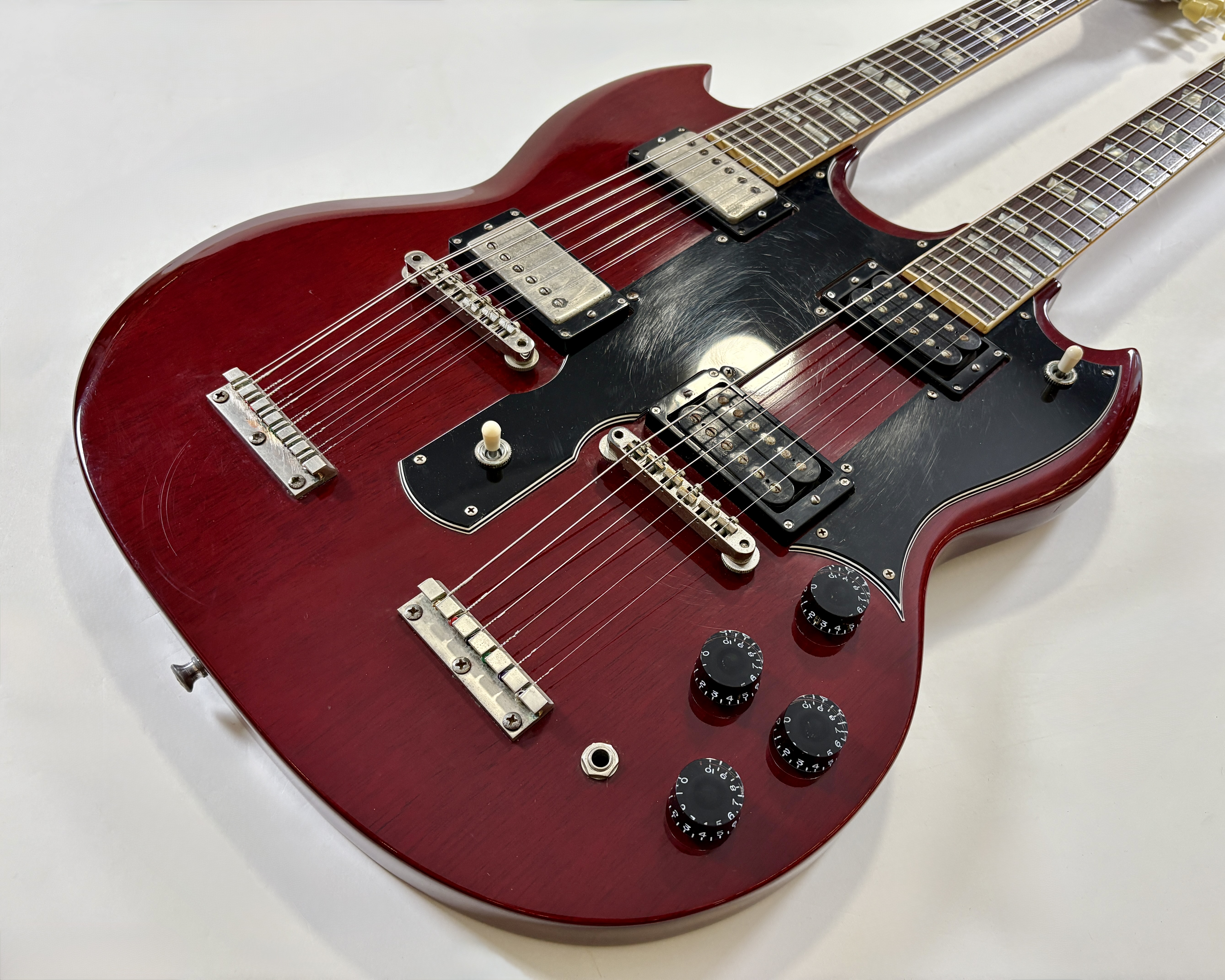 La double manche est la guitare de scène par excellence (avouez que ça en jette !), la Gibson EDS-1275 aura eu des ambassadeurs de renom : Jimmy Page, Don Felder, Slash ou encore… Alex Lifeson. Voici une version made in Japan faite par Burny qui, aux côtés de Greco, Ibanez ou encore Tokai proposait des copies abordables des instruments américains. Les manches et le corps sont en acajou, les touches en palissandre. En très bon état.Location, achat, vente, reprise, dépôt-vente.