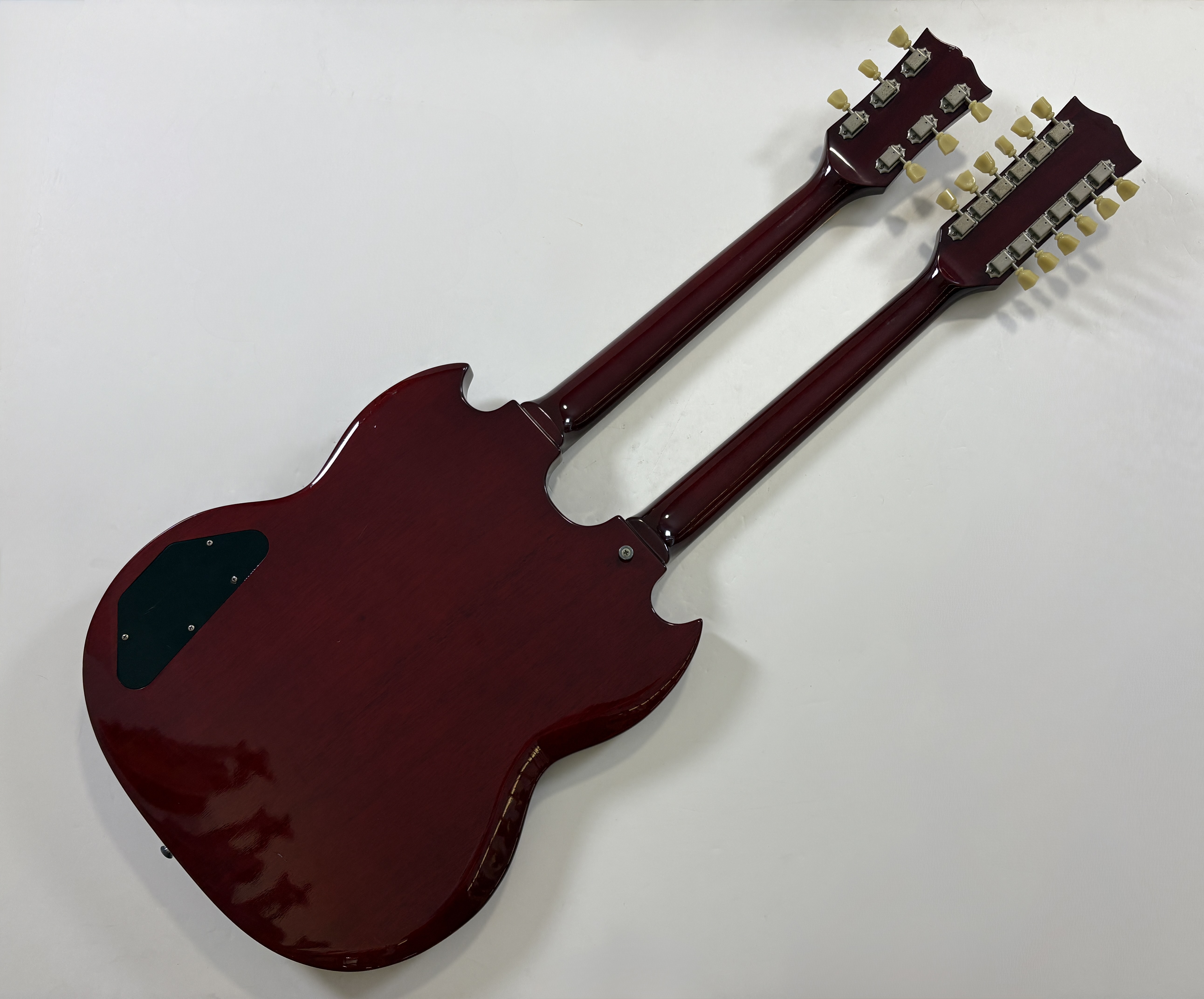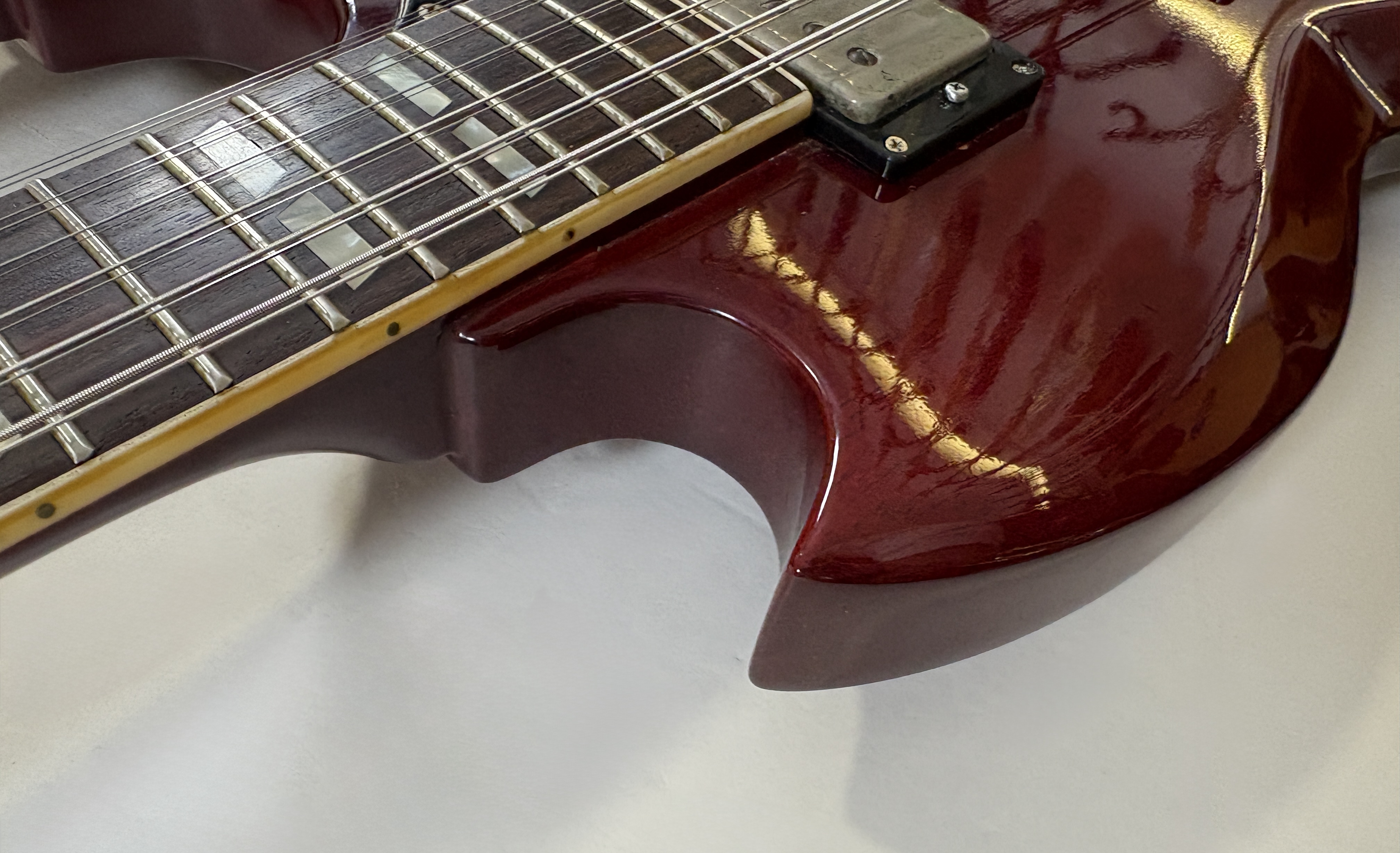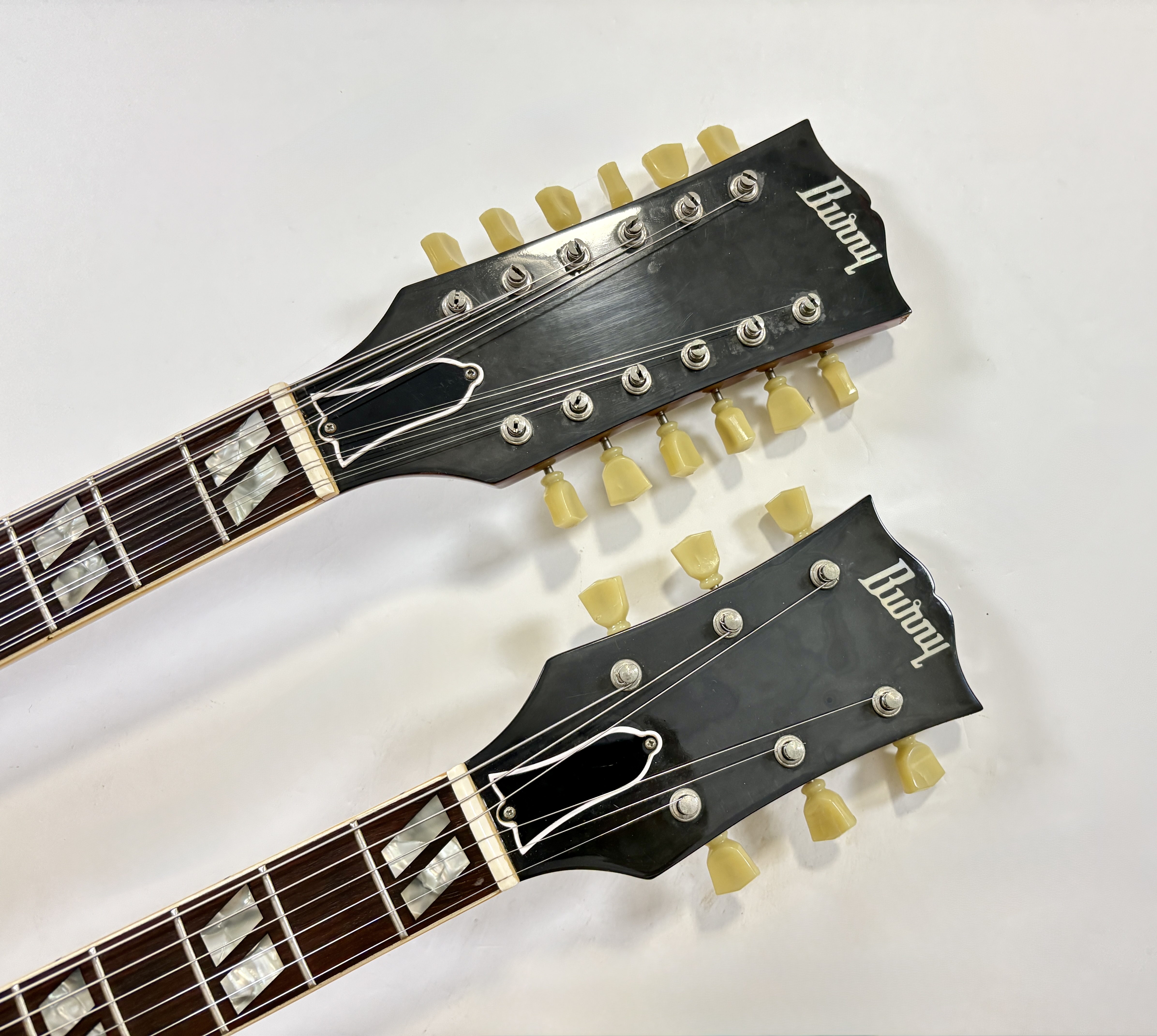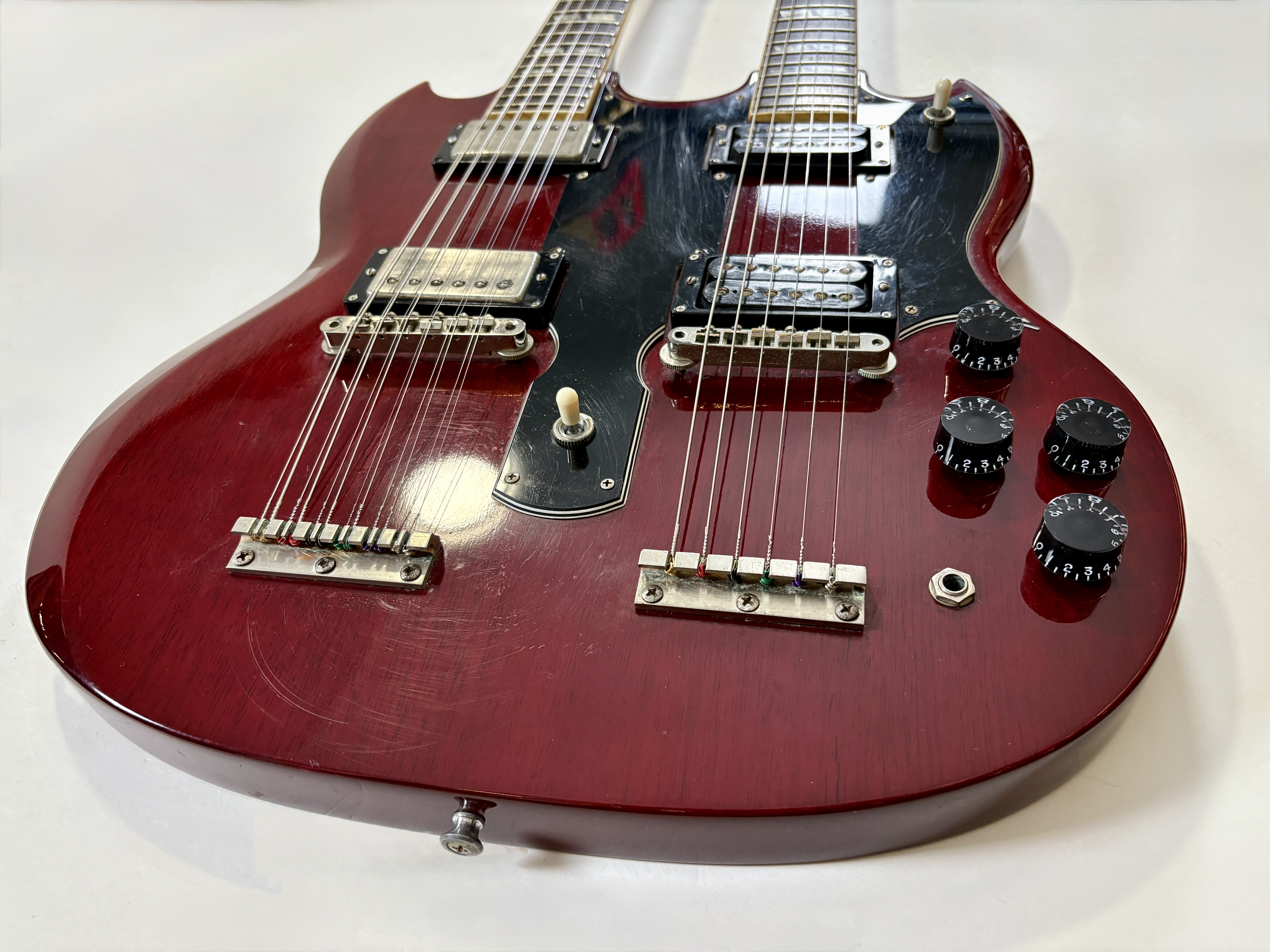 La double manche est la guitare de scène par excellence (avouez que ça en jette !), la Gibson EDS-1275 aura eu des ambassadeurs de renom : Jimmy Page, Don Felder, Slash ou encore… Alex Lifeson. Voici une version made in Japan faite par Burny qui, aux côtés de Greco, Ibanez ou encore Tokai proposait des copies abordables des instruments américains. Les manches et le corps sont en acajou, les touches en palissandre. En très bon état.Location, achat, vente, reprise, dépôt-vente.