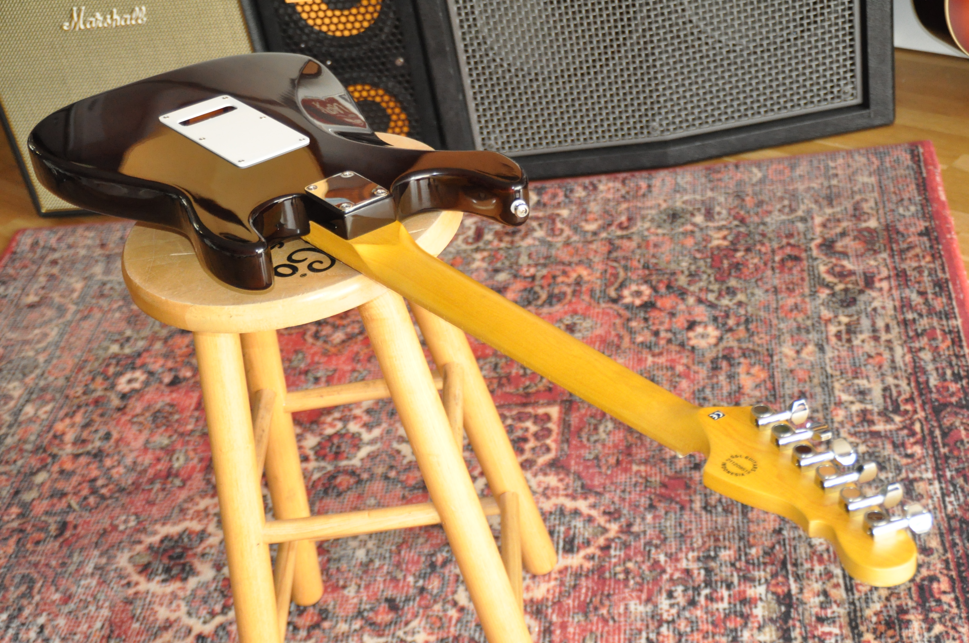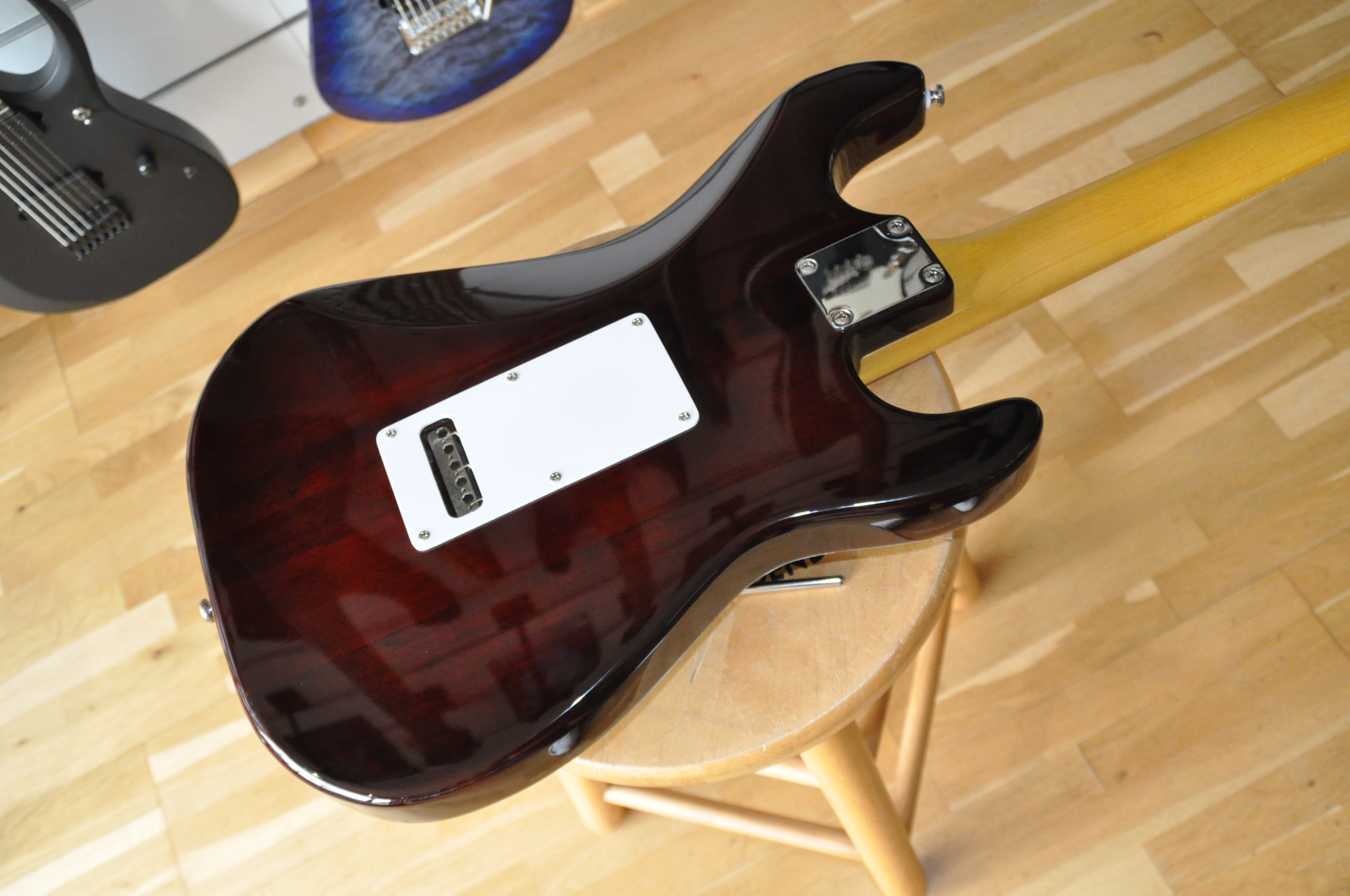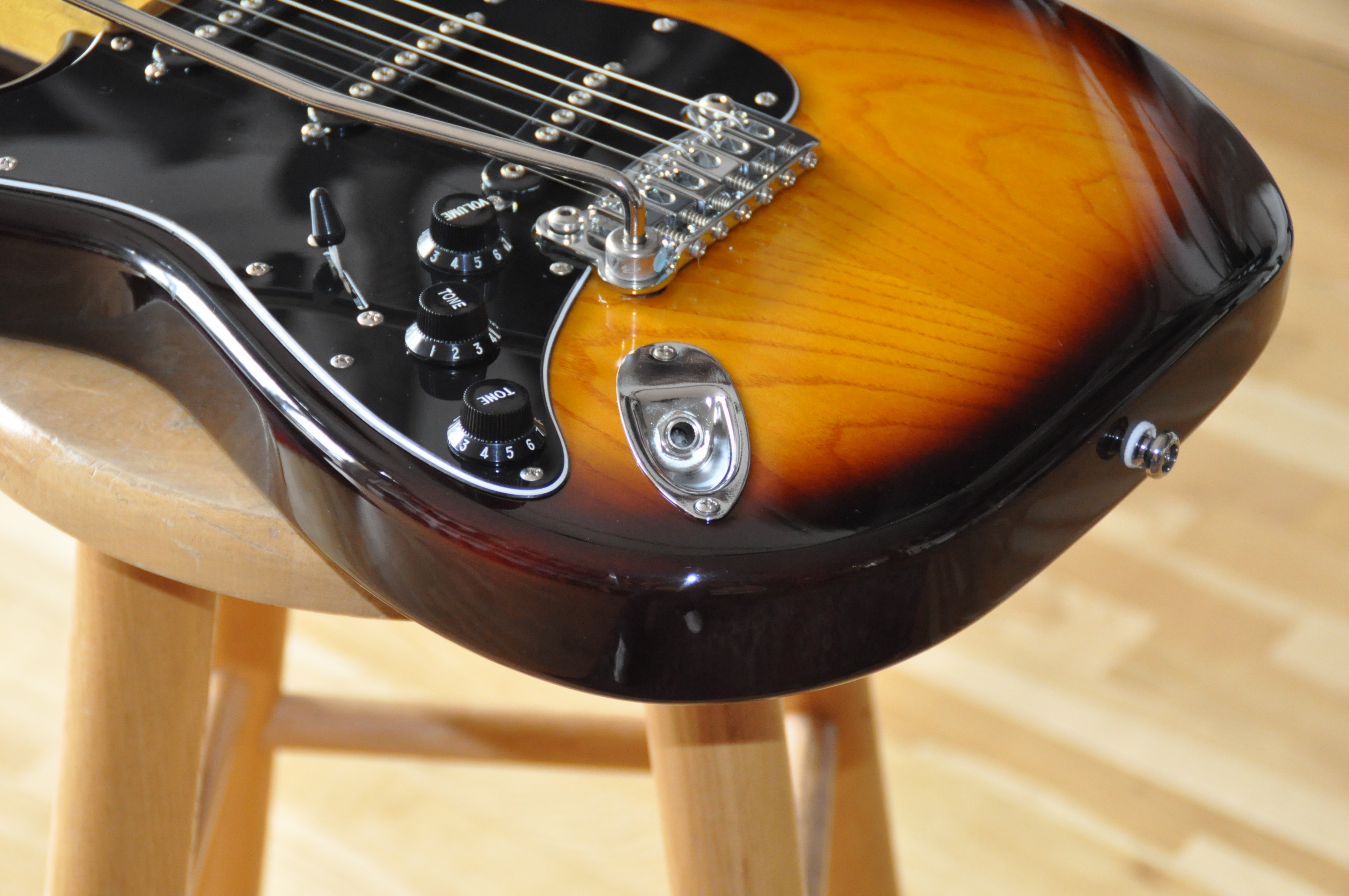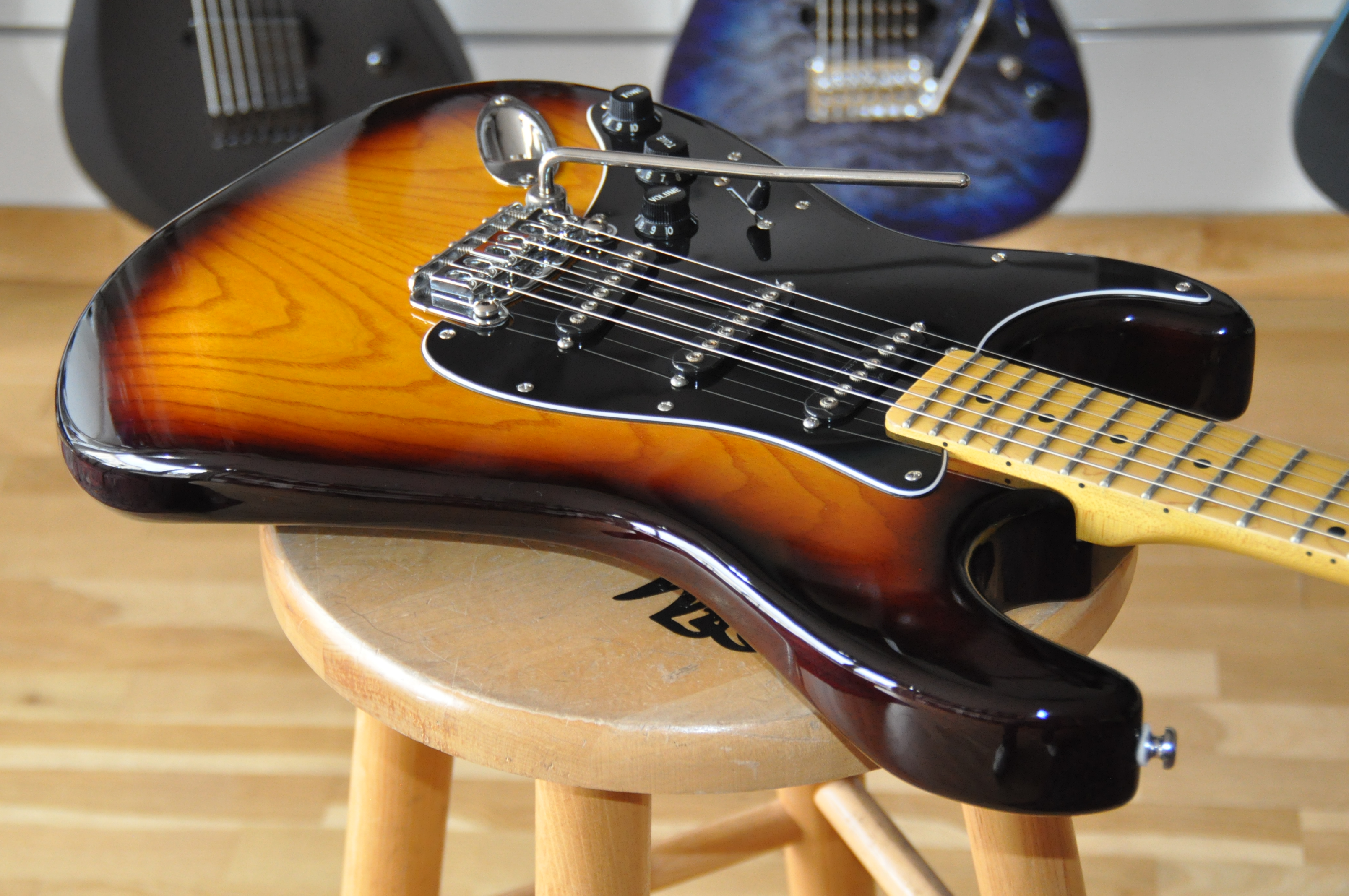 Les véritables améliorations se révèlent surtout dans l’électronique et l’accastillage. Les micros MFD (Magnetic Field Design), conçus par Leo lui-même, remplacent les simples bobinages classiques : ils délivrent plus de puissance, une plage dynamique plus large et un équilibre tonal supérieur, avec des basses plus pleines et des aigus détaillés mais jamais agressifs. Le système PTB, absent des Stratocasters, permet de régler séparément graves et aigus, offrant une palette sonore bien plus étendue. À cela s’ajoute le switch “expander”, qui rend possibles des combinaisons de micros inédites sur une Strat standard, comme manche + chevalet ou les trois micros simultanément, donnant accès à des sonorités proches de la Telecaster ou plus épaisses et complexes.