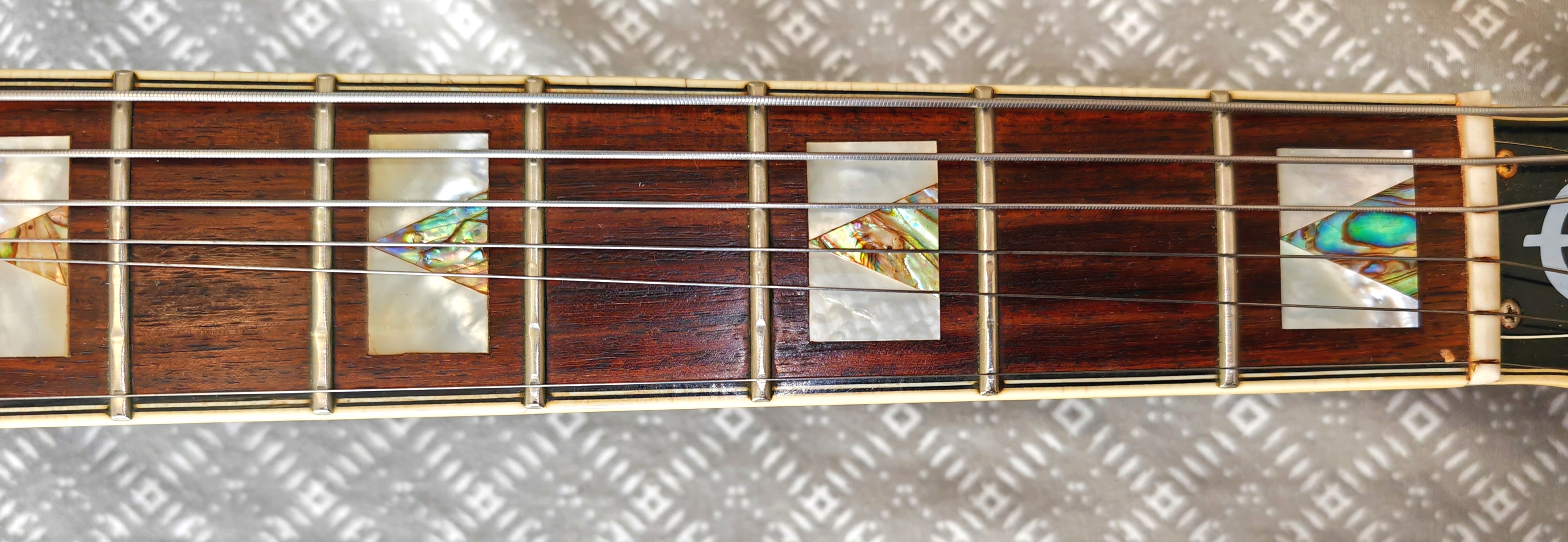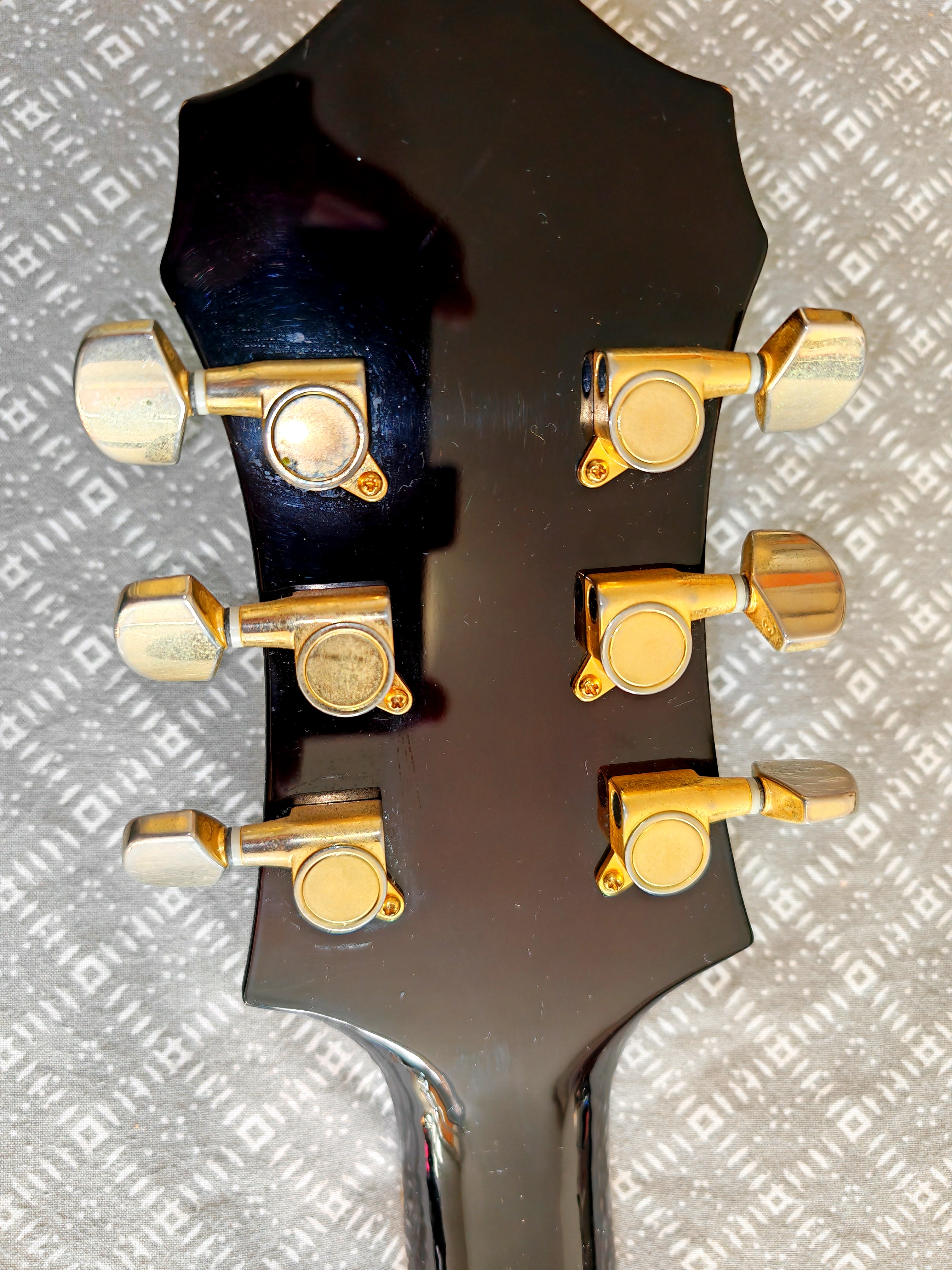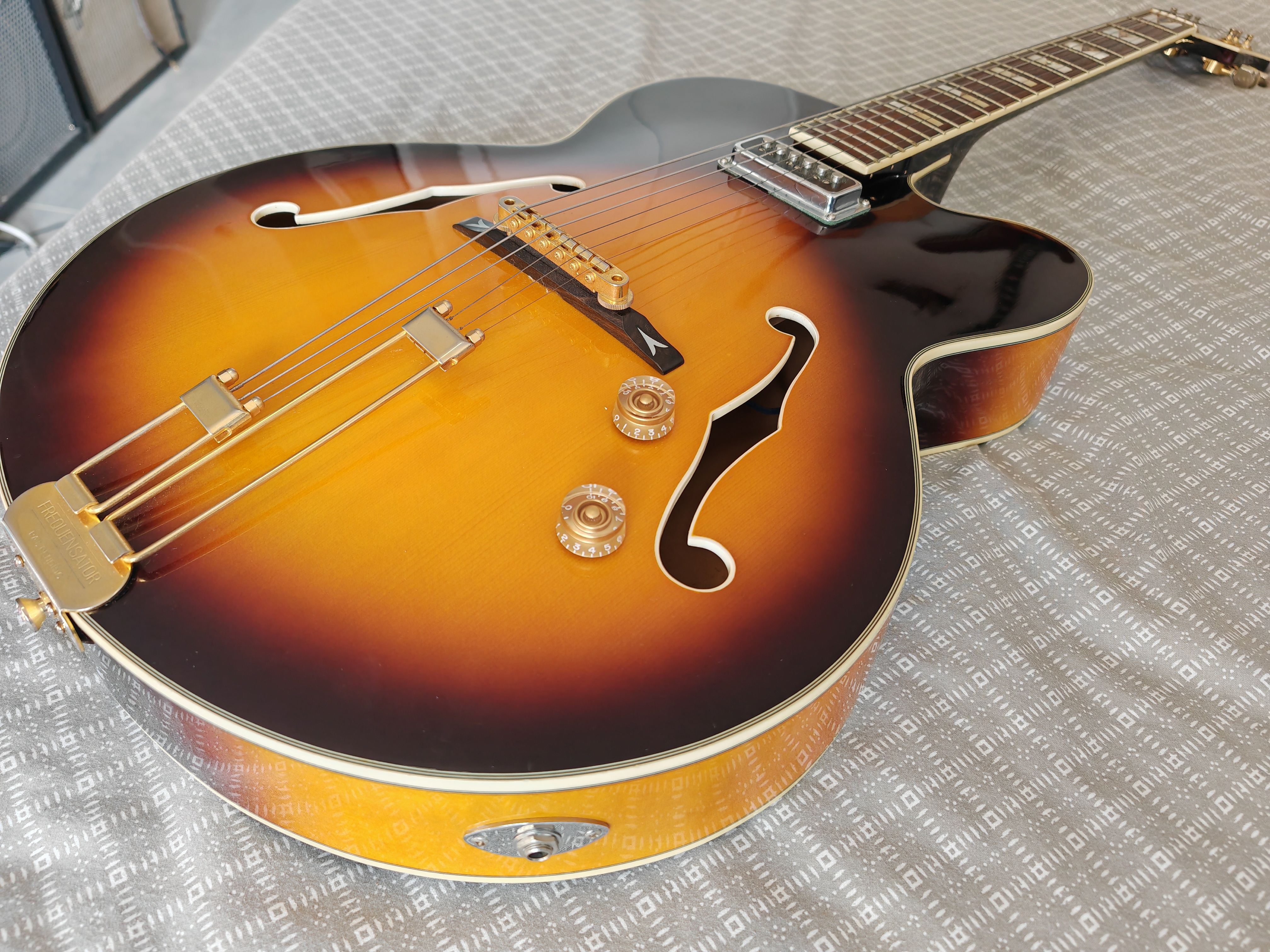 Belle archtop fabriquée dans l usine Peerless coreenne .Équipée d un dearmond dynasonic habituel des gretsch en remplacement du micro flottant original .une belle combinaison aussi originale que surprenante au niveau son.