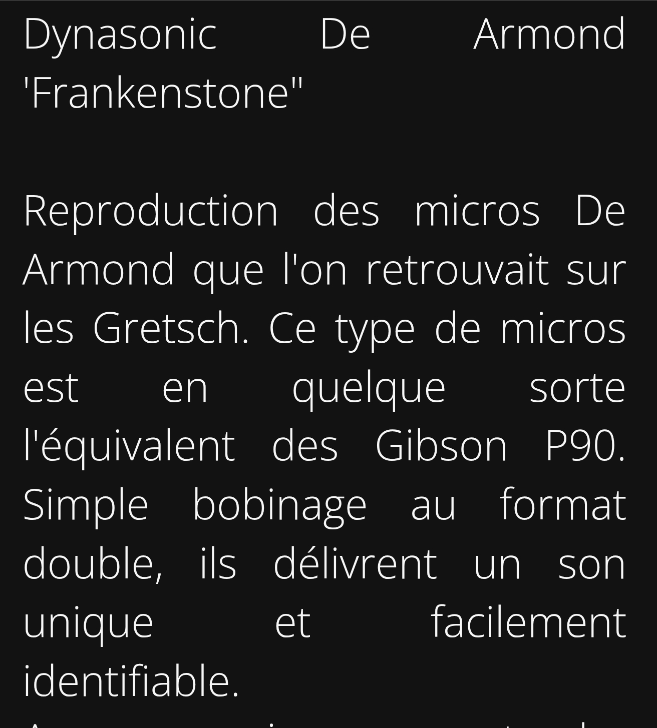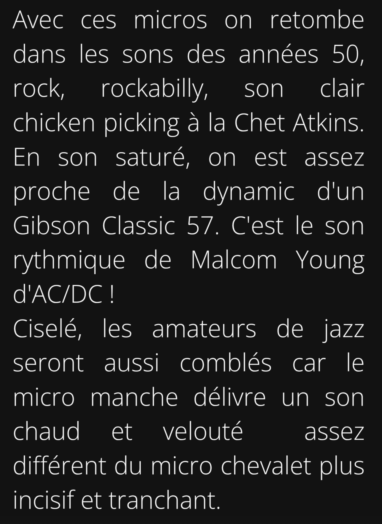 Son très riche et velouté ,voire aussi percutant ideal pour Le jazz blues des années 60 ,le rockabilly aussi .