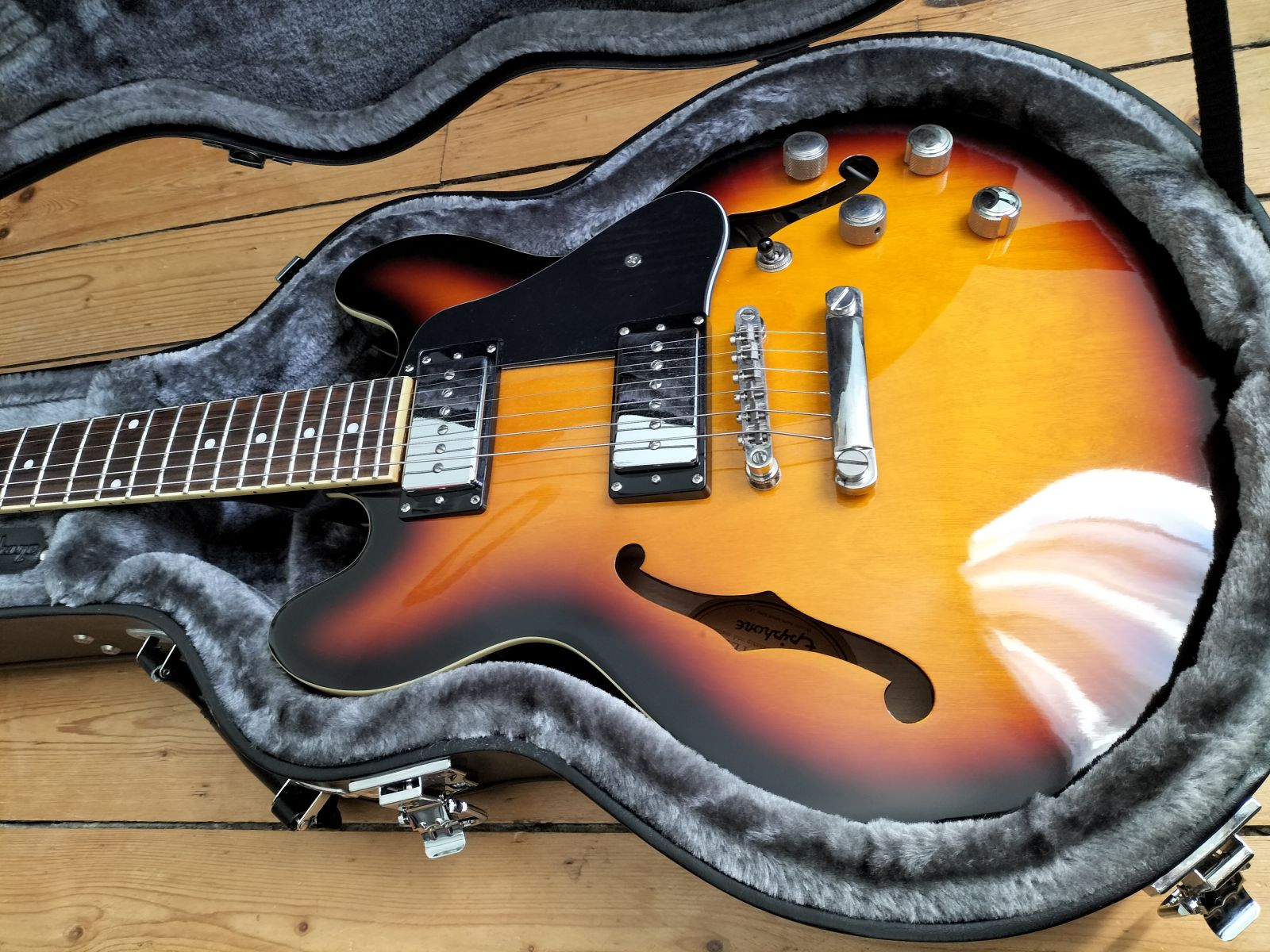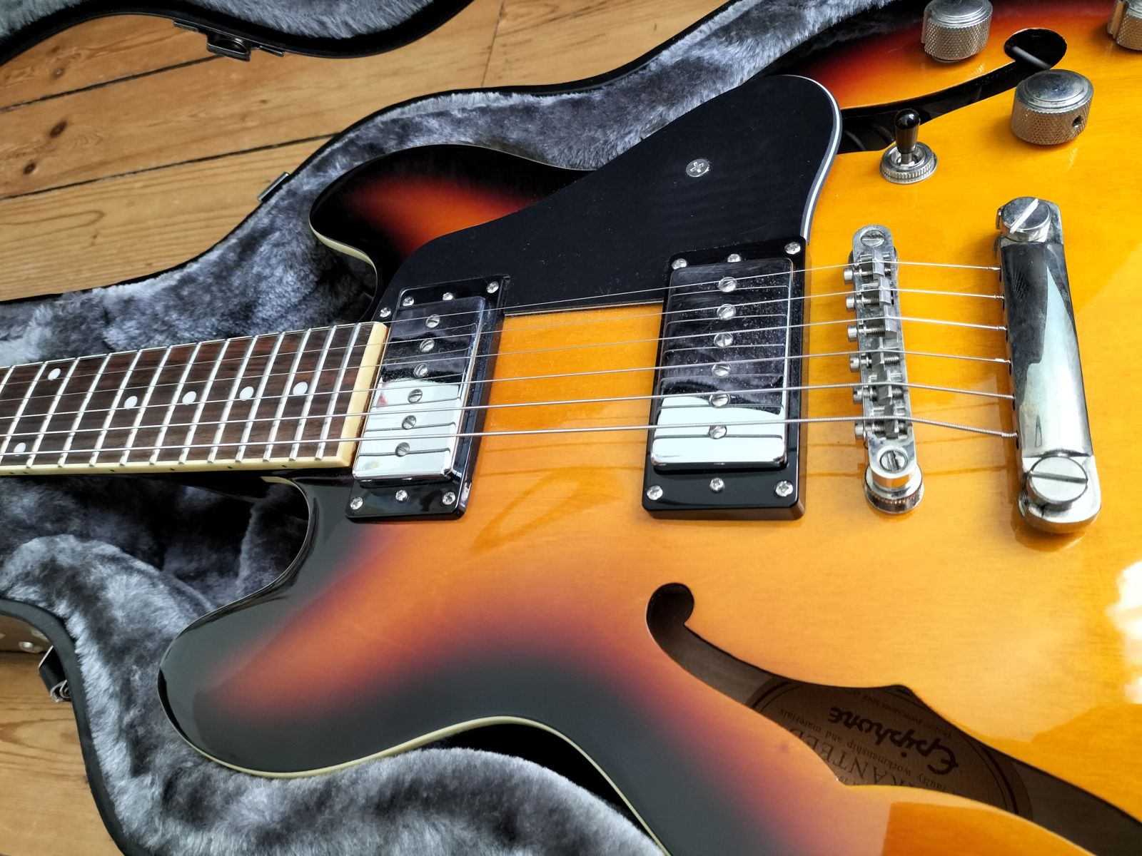 Epiphone ES-339 Pro Vintage unburst de 2012, modifiée avec des micros P-90Cette guitare est très confortable, très légère (corps creux et plus fin qu'une ES-339) avec un vrai look ravageur. Les micros P-90 lui donnent un son unique, un très bon son clair qui peut être velouté avec un petit crunch ou carrément hargneux avec une petite disto.