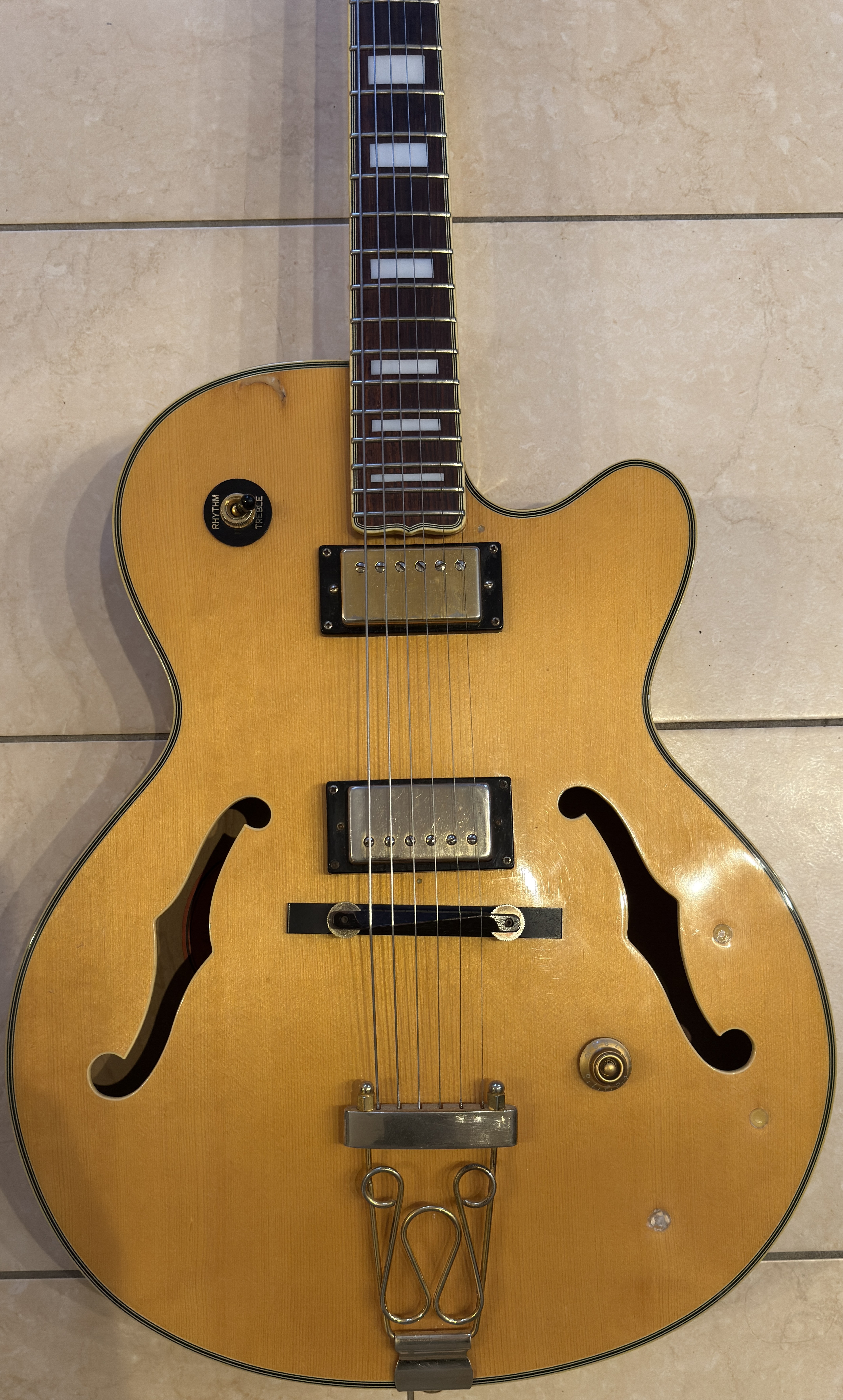 Epiphone Joe Pass Emperor II, achetée en 2002, fabrication coréenne. Archtop full hollow réputée pour le jazz (mais pas seulement), très agréable à jouer et au son chaleureux.Vidéo disponible ici :