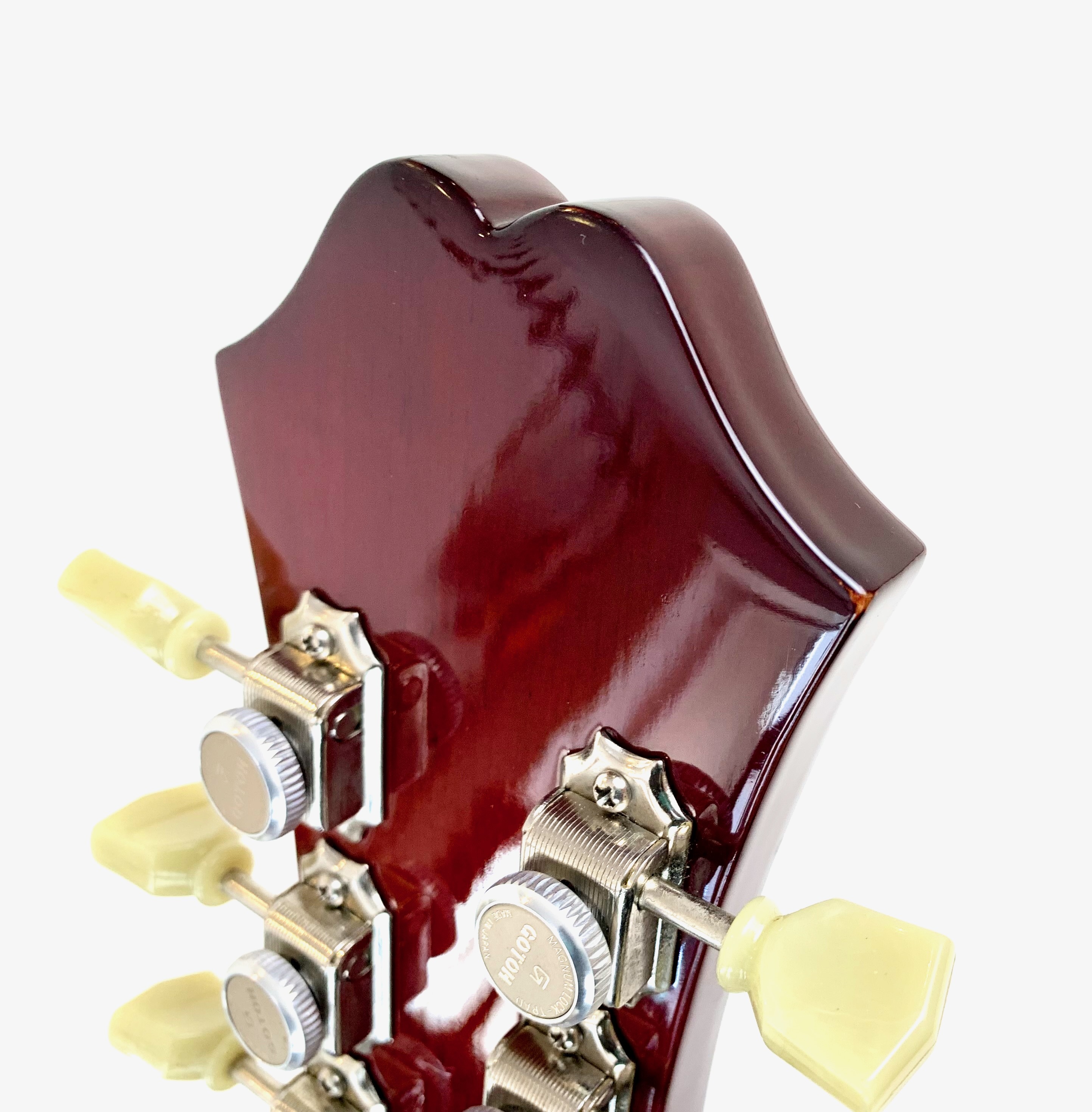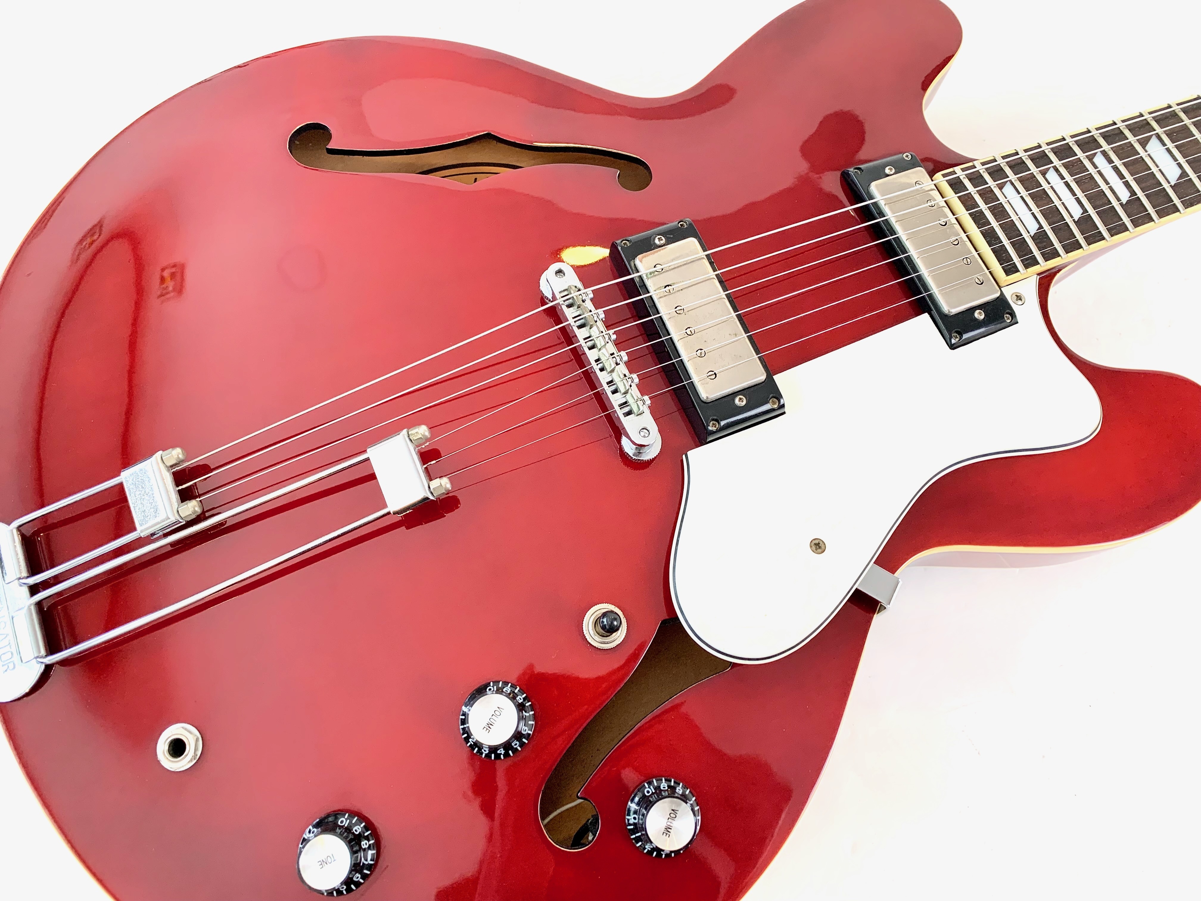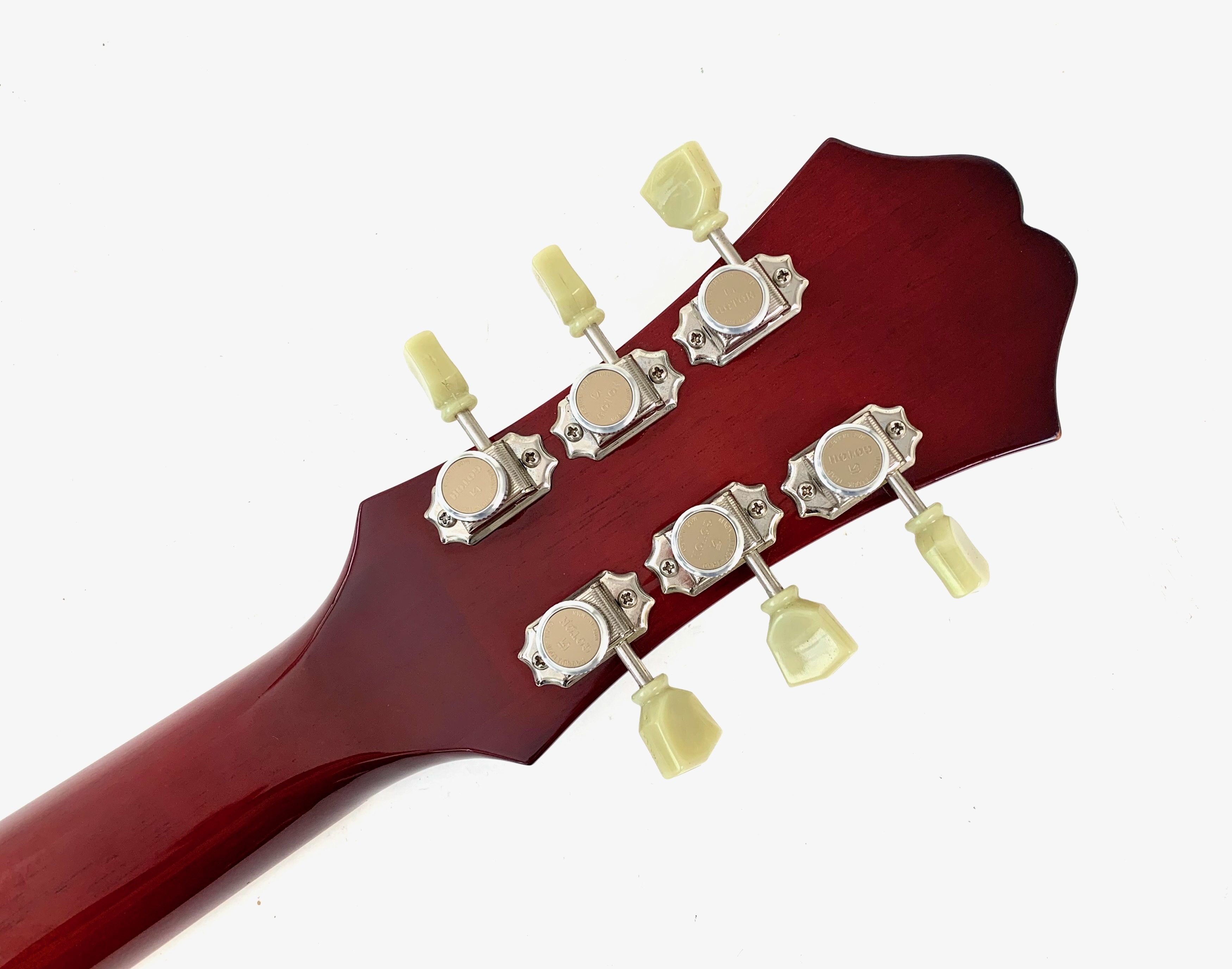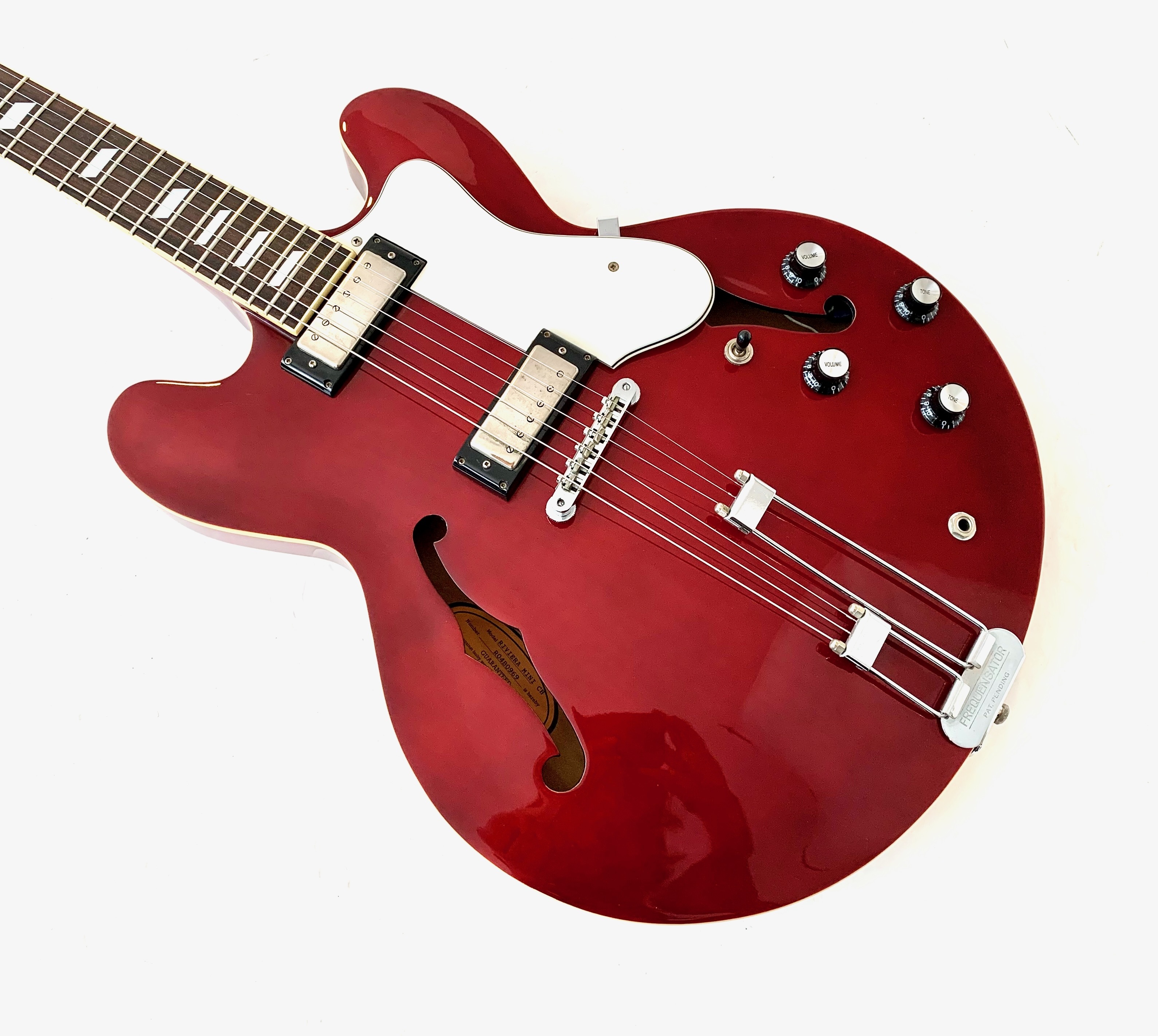 Avec son chevalet Frequensator et ses mini-humbuckers, ici remplacé par d'excellents HepCat, cette Coréenne reprend les caractéristiques du modèles USA des années 60. Au chapitre des améliorations on notera également le remplacement complet de toute l'électronique ainsi que des mécaniques à blocage. La construction est similaire à une Gibson ES-335 : corps laminé en érable, manche en acajou et touche en palissandre, le tout ici seulement pour 3,54kg. Fabriquée à l'usine Peerless en 2004, celle-ci est en très bon état, vendue dans son étui d'origine.Location, achat, vente, reprise, dépôt-vente.