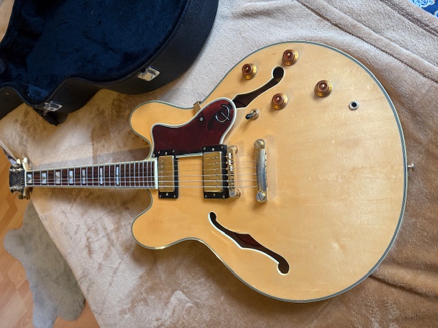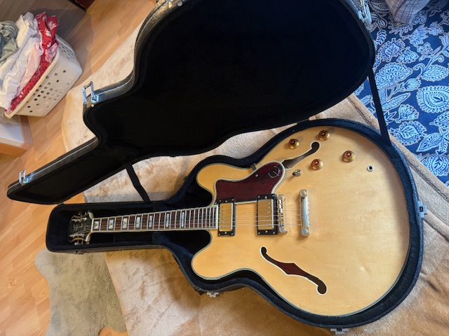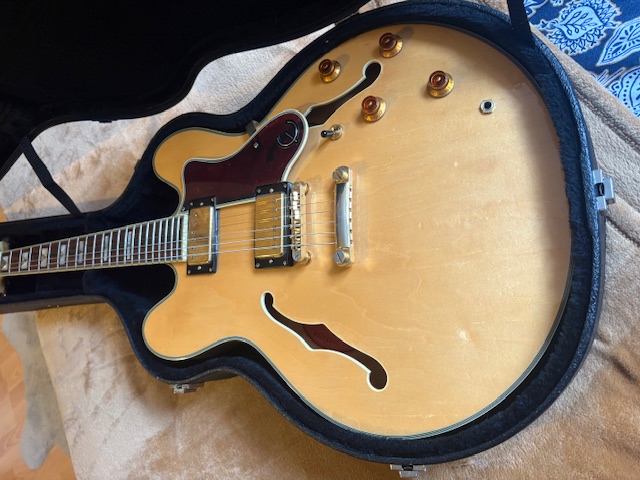 Je revends l'une de mes deux Sheraton ( ES 335 version Epiphone ) avec son case Epiphone d'origine.En super état, frettes en très bon état, bien réglée, électronique upgradée et fonctionnement nickel + micros Gibson classic 57 (+ dorés) -- voir photos.