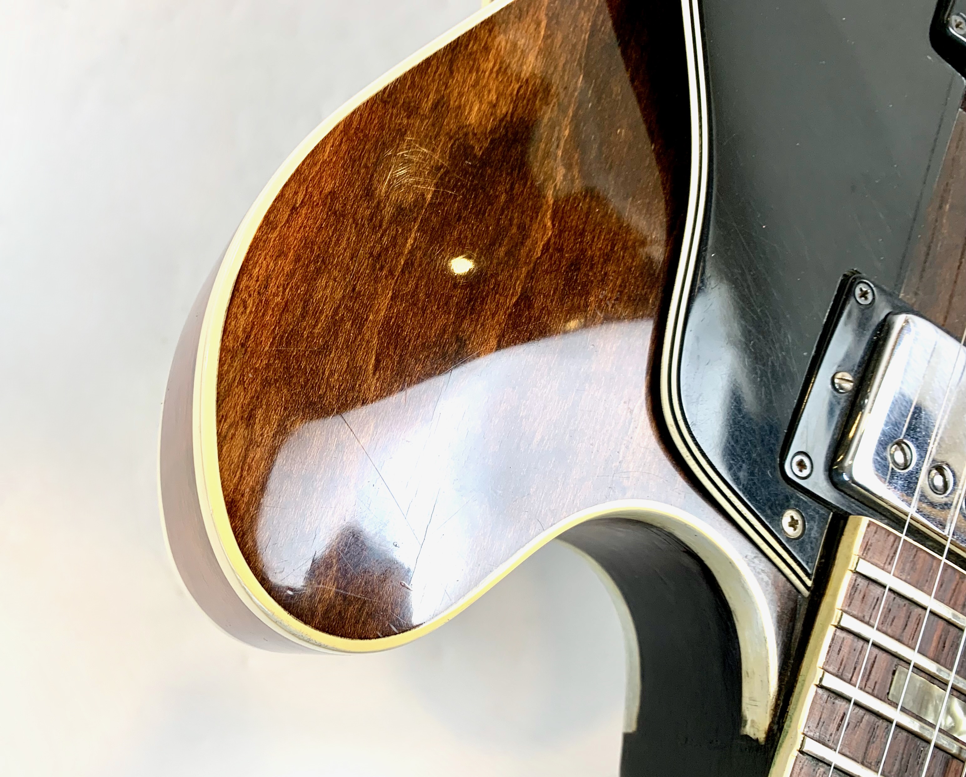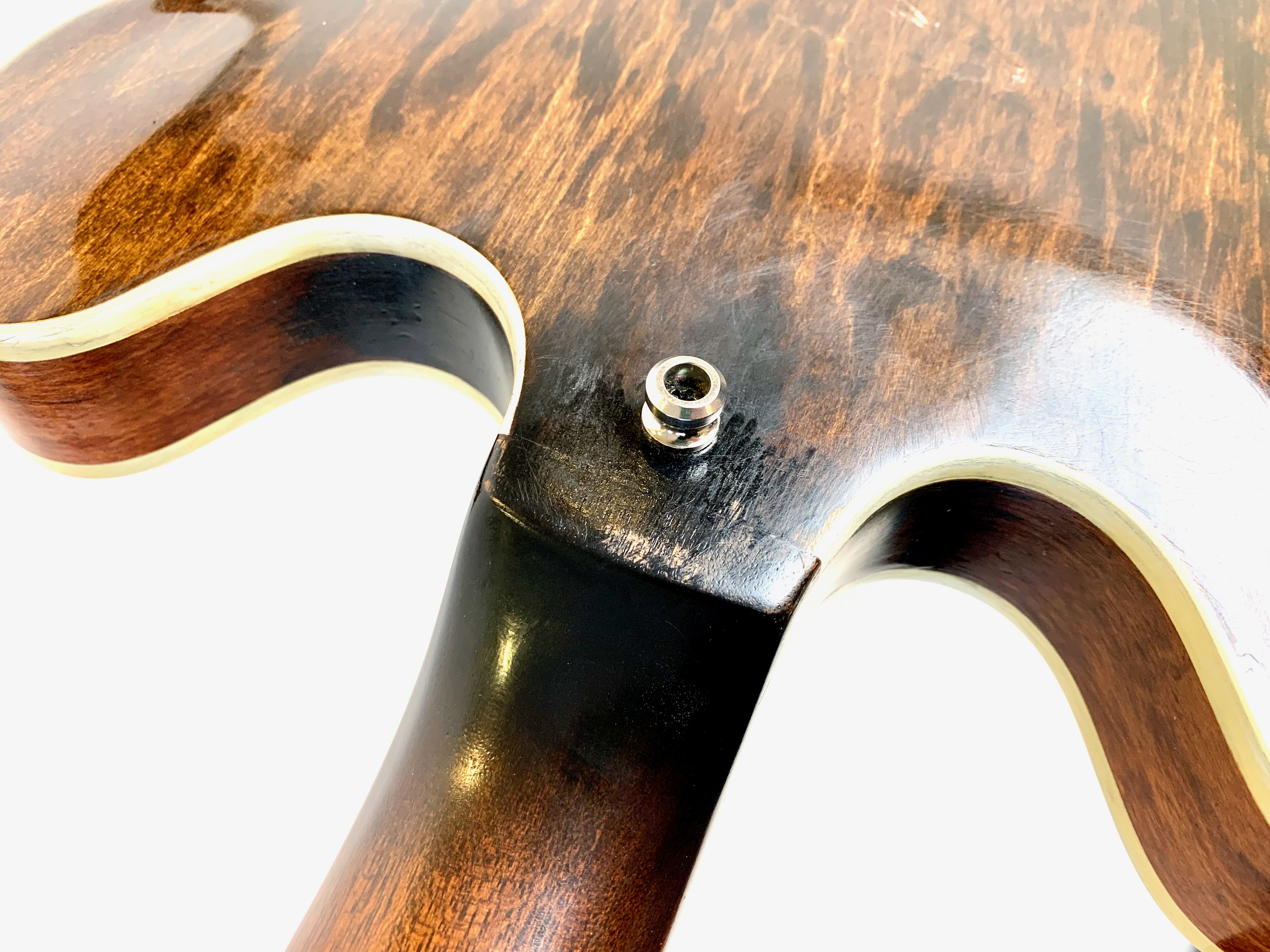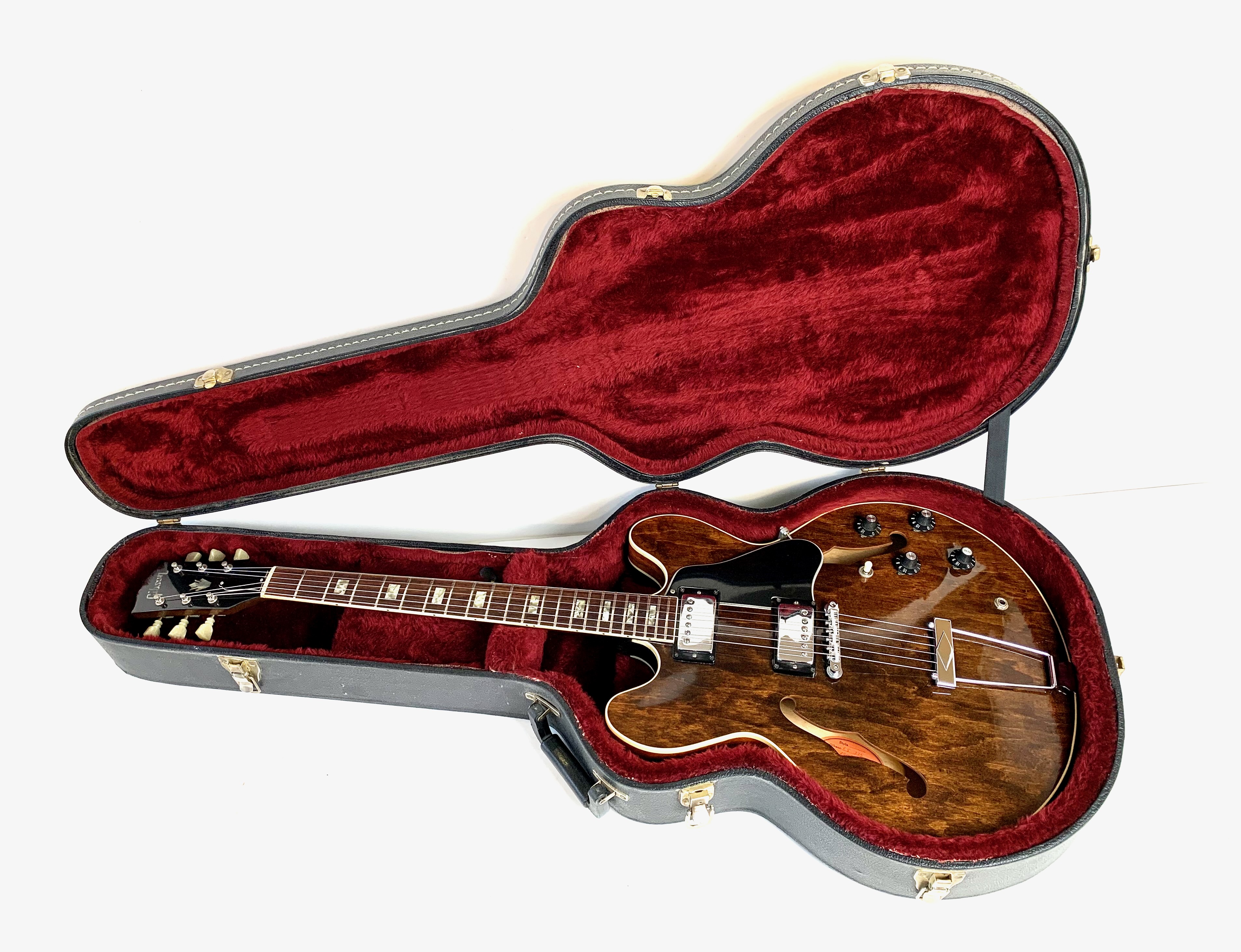 Peut-être la plus belle réussite esthétique de chez Gibson… Sortie en 1958, sa poutre centrale et ses micros humbuckers étaient censés annihiler les problèmes de larsen des grosses hollowbody de la marque de Kalamazoo. On trouve encore sur cet exemplaire de 1973 un manche en acajou et les micros sont les fameux T-Top dans le prolongement des PAF. On notera le remplacement du chevalet, des mécaniques ainsi qu'un réenclavement du manche. Vendue en étui générique.Location, achat, vente, reprise, dépôt-vente.