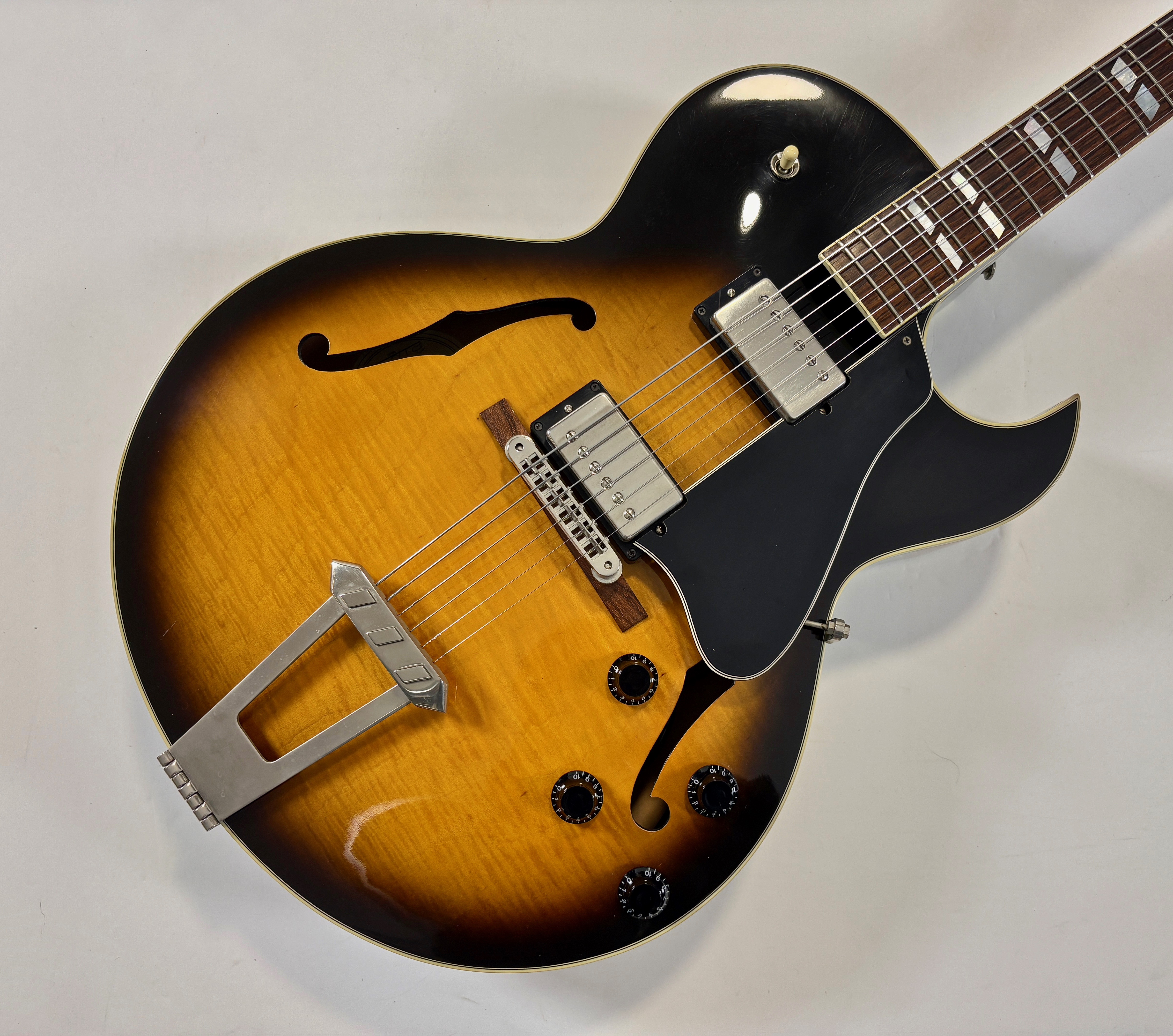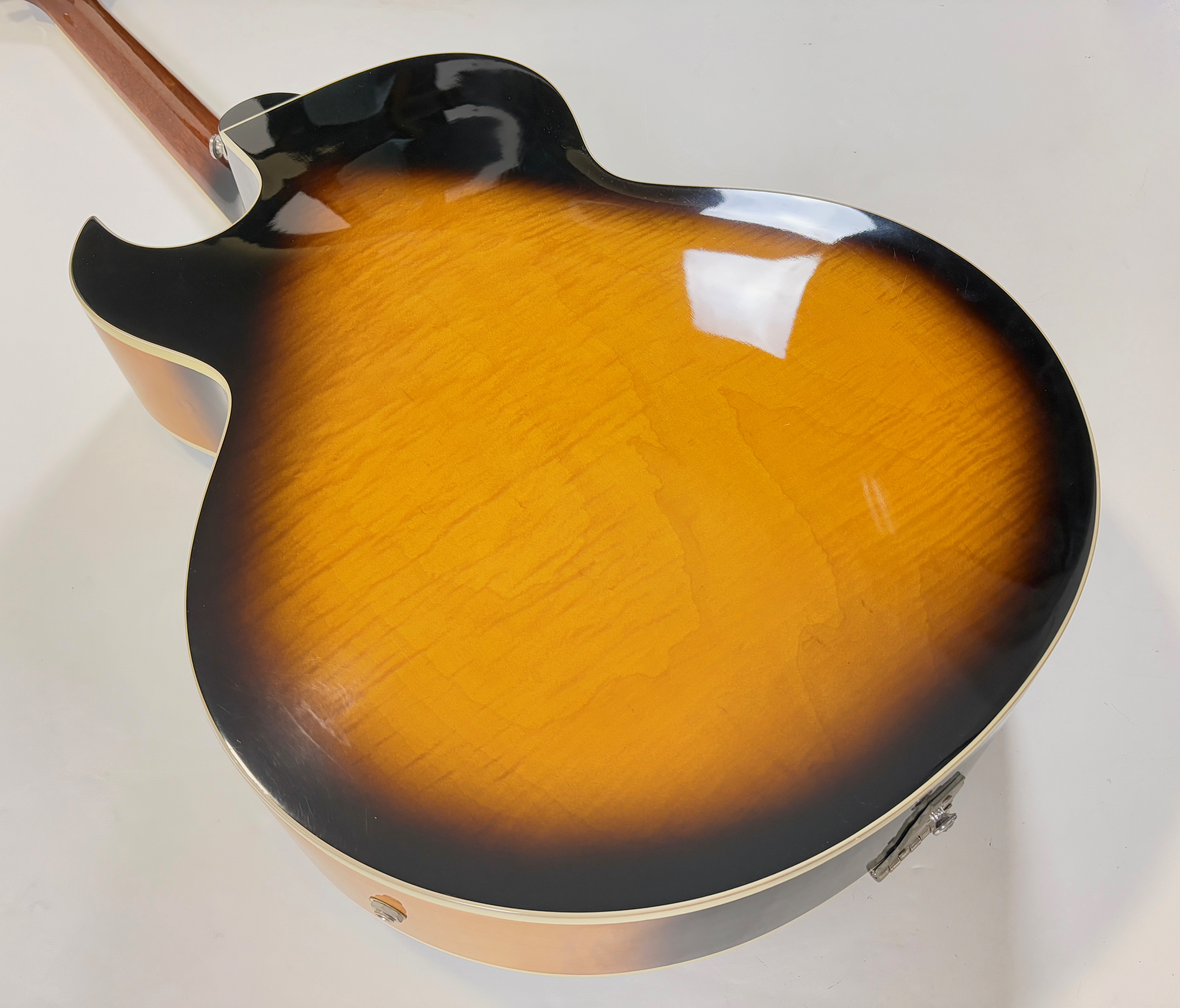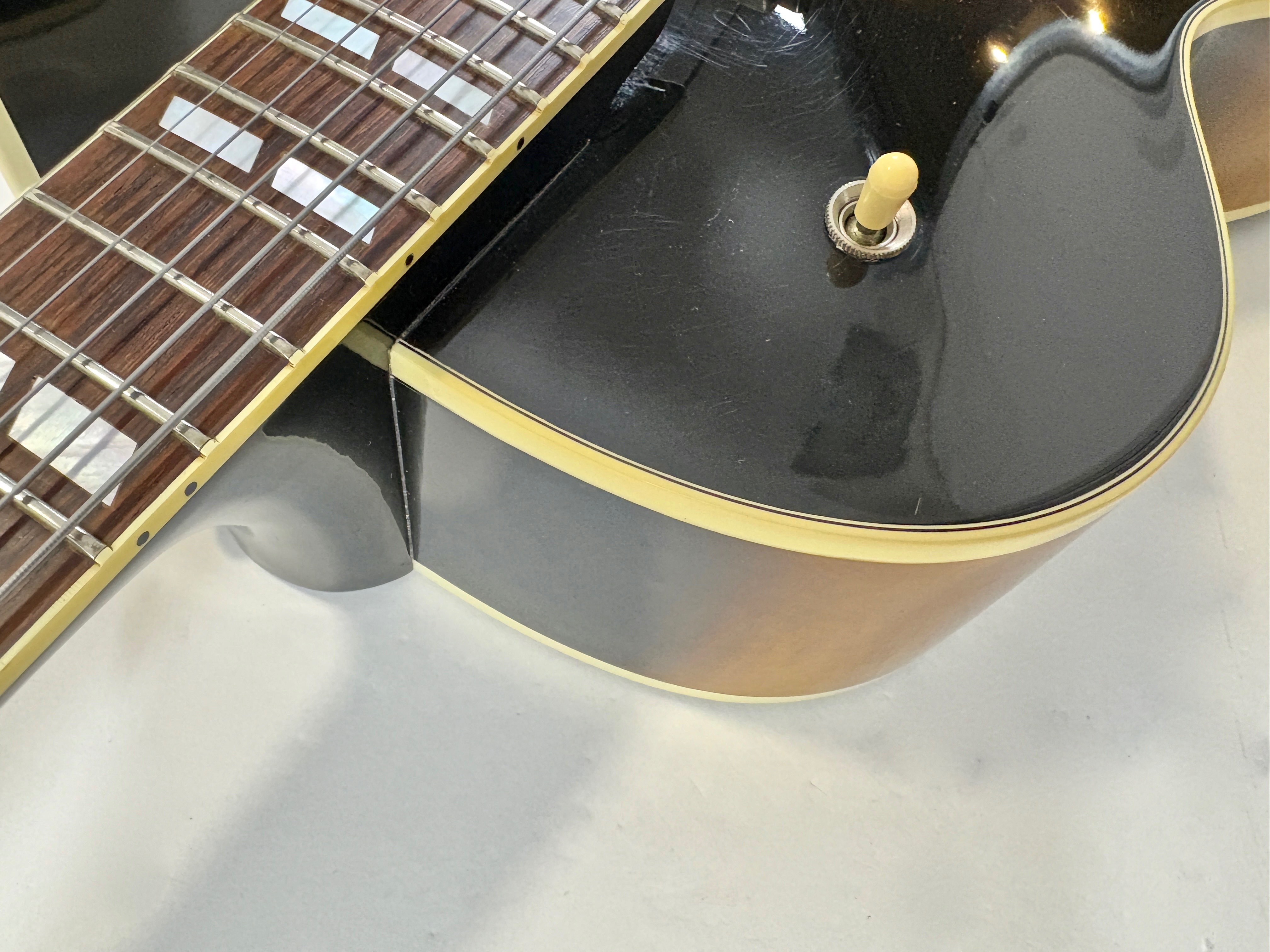 La 175 : LA guitare jazz par excellence. Sa construction est classique : caisse de 16 pouces en érable laminé (ici joliment ondé), un manche en acajou et une touche en palissandre au radius de 12 pouces. Les micros sont des Classic 57, la descendance des PAF ! Celle-ci célèbre le centenaire de la marque en 1994 et date donc d'une période appréciée des amateurs de la marque : les années 90. Vendue dans son étui marron à moumoute rose typique de la décennie.Dépôt-vente, achat, vente, reprise, location.