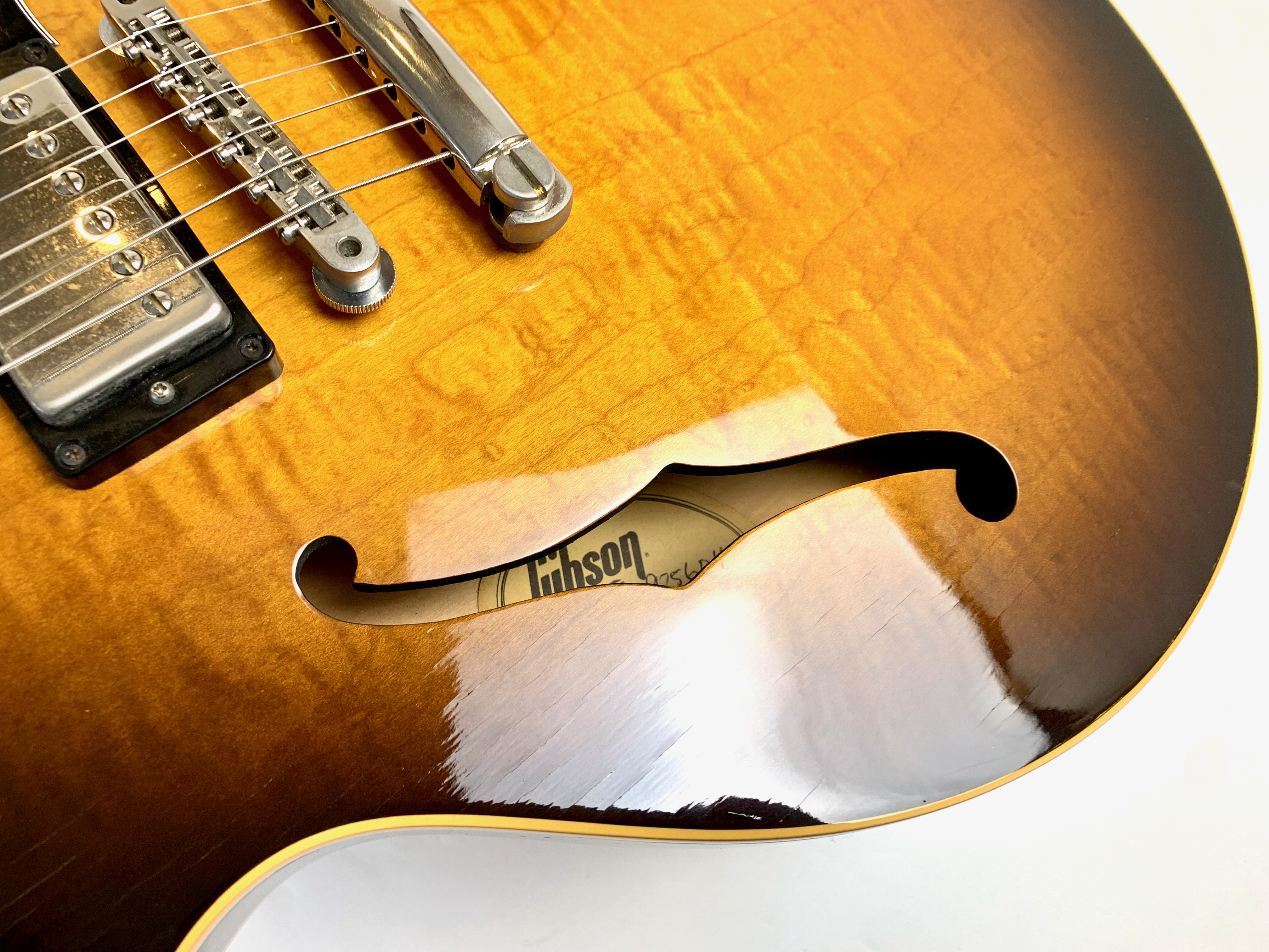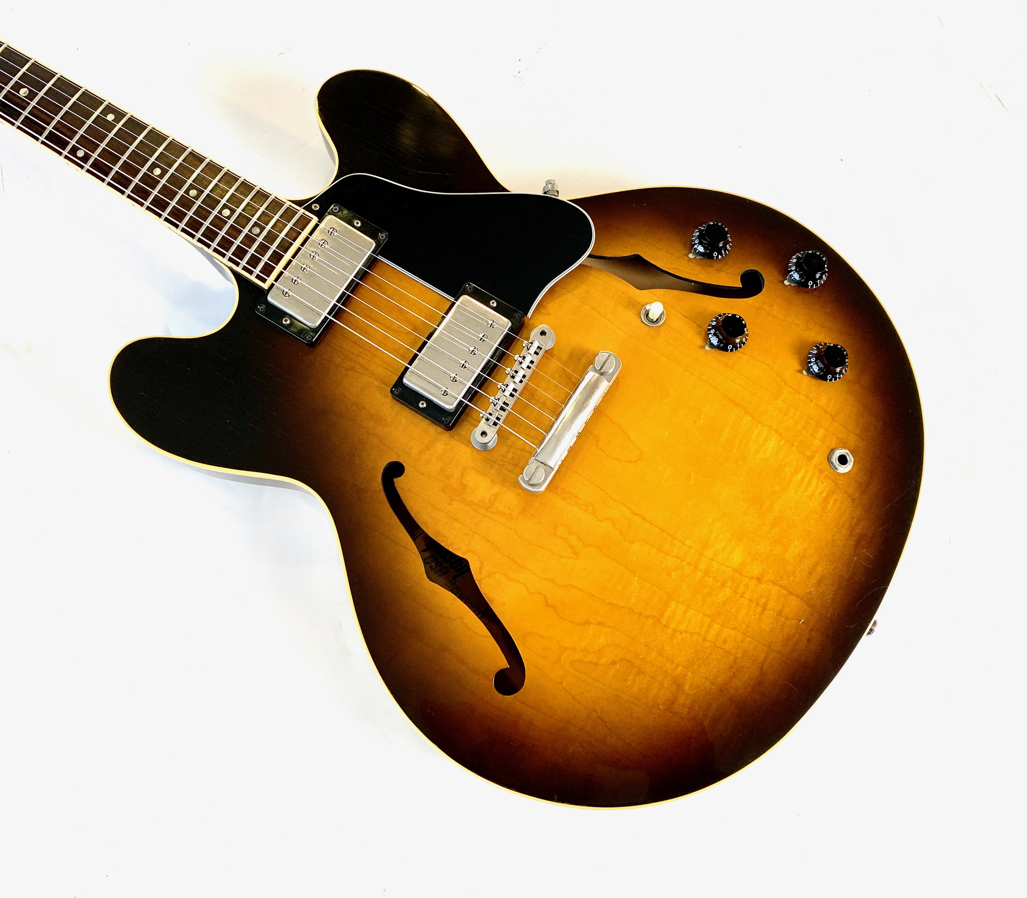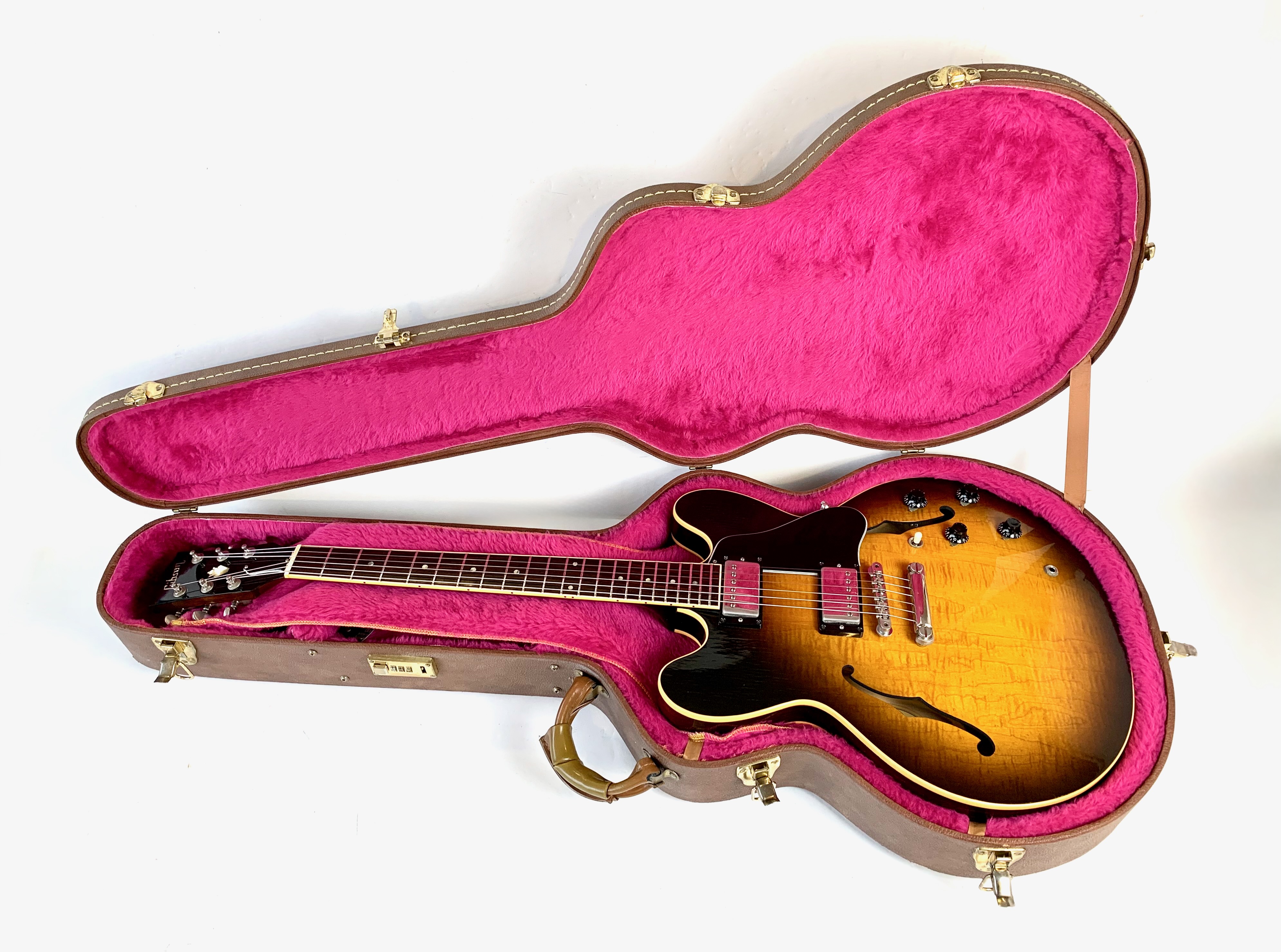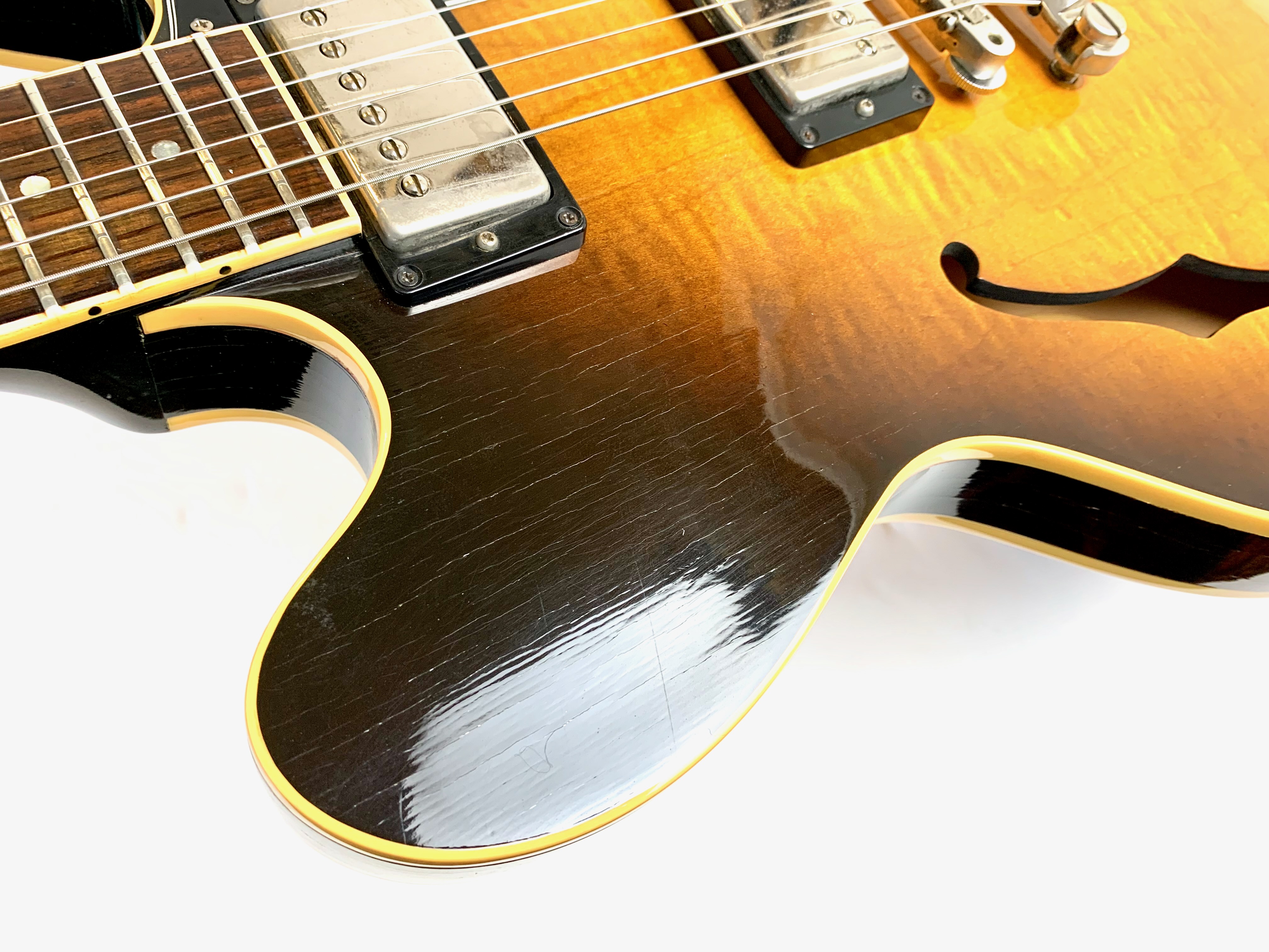 Peut-être la plus belle réussite esthétique de chez Gibson… Voici un modèle Dot tout ce qu’il y de plus classique : manche en acajou avec touche palissandre au radius de 12 pouces, caisse en érable laminé, légèrement ondé ici, du plus bel effet, le tout amplifié par une paire d'excellents micros Tim Shaw, première réédition des PAF ! Issue de la fameuse décennie 90, réputée pour sa qualité de fabrication, celle-ci sonne au top ! En très bon état, vendue dans son étui d’origine marron intérieur rose typique de l'époque !Location, achat, vente, reprise, dépôt-vente.