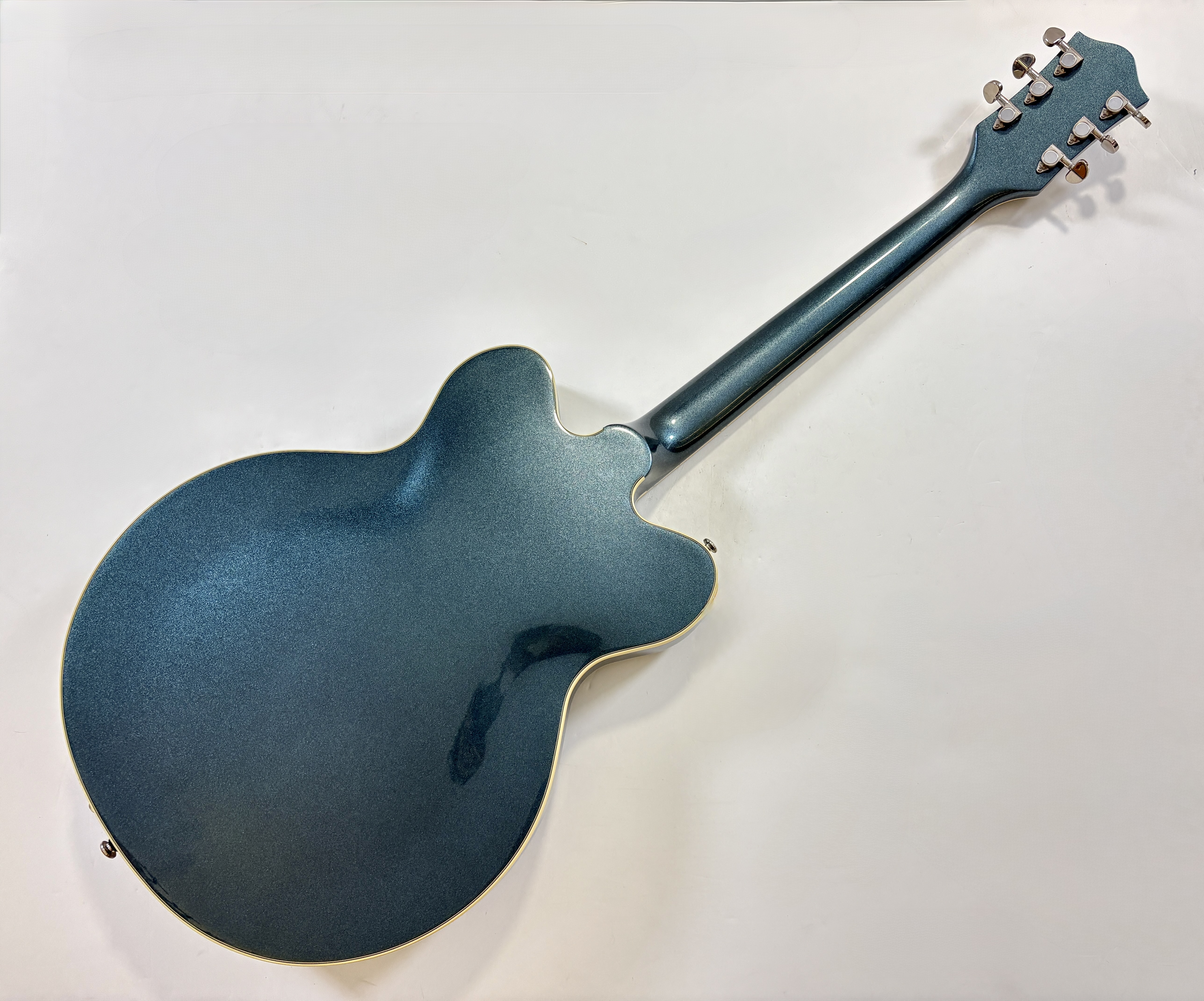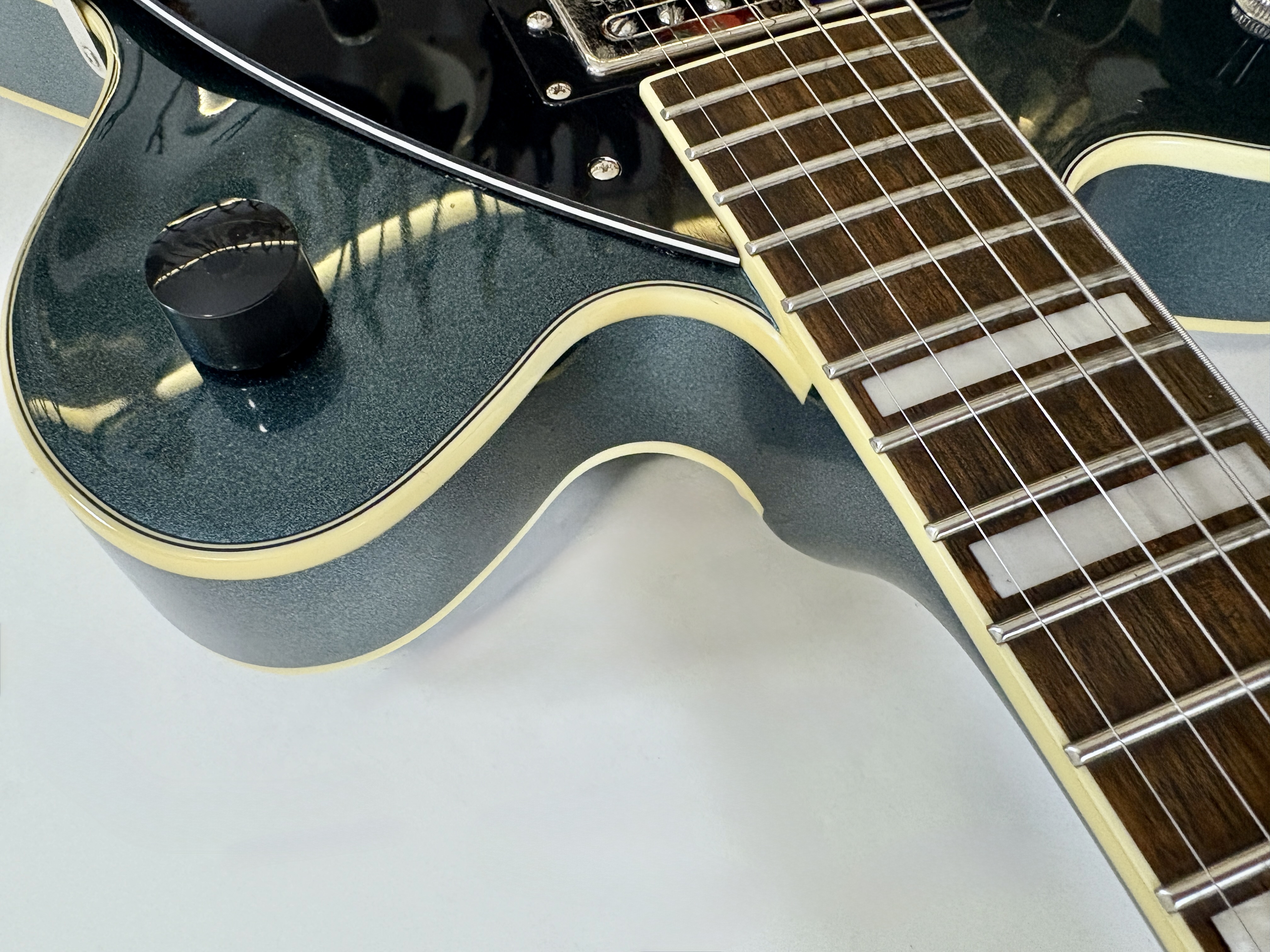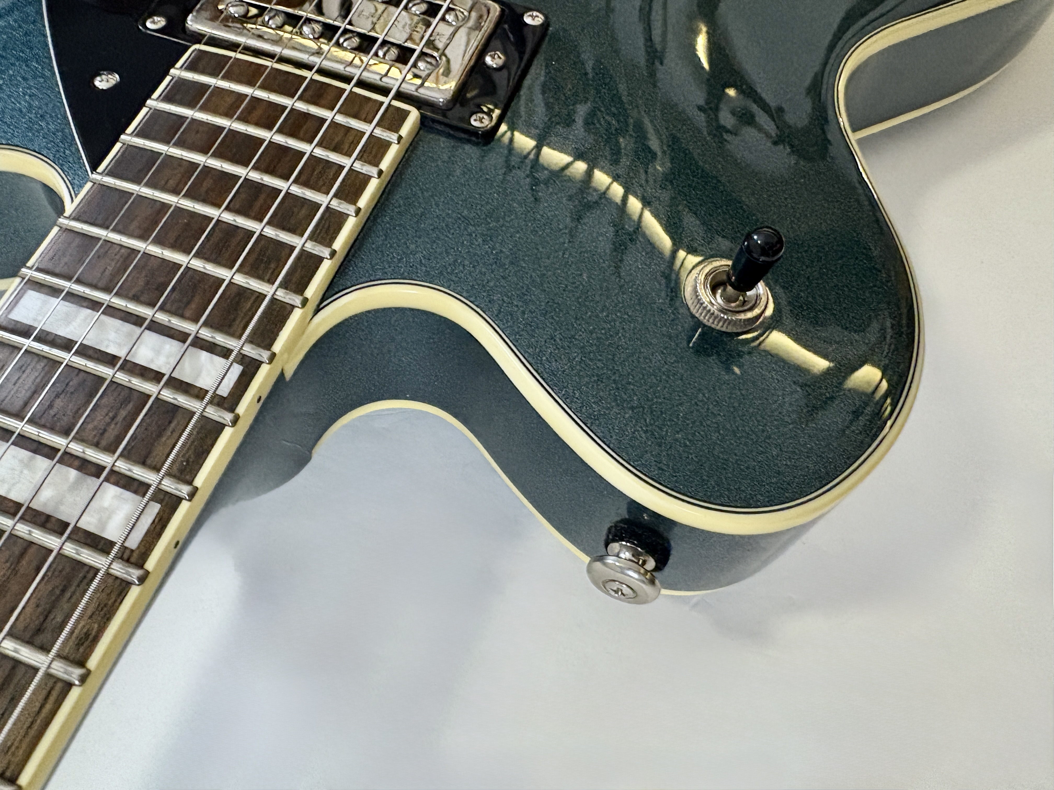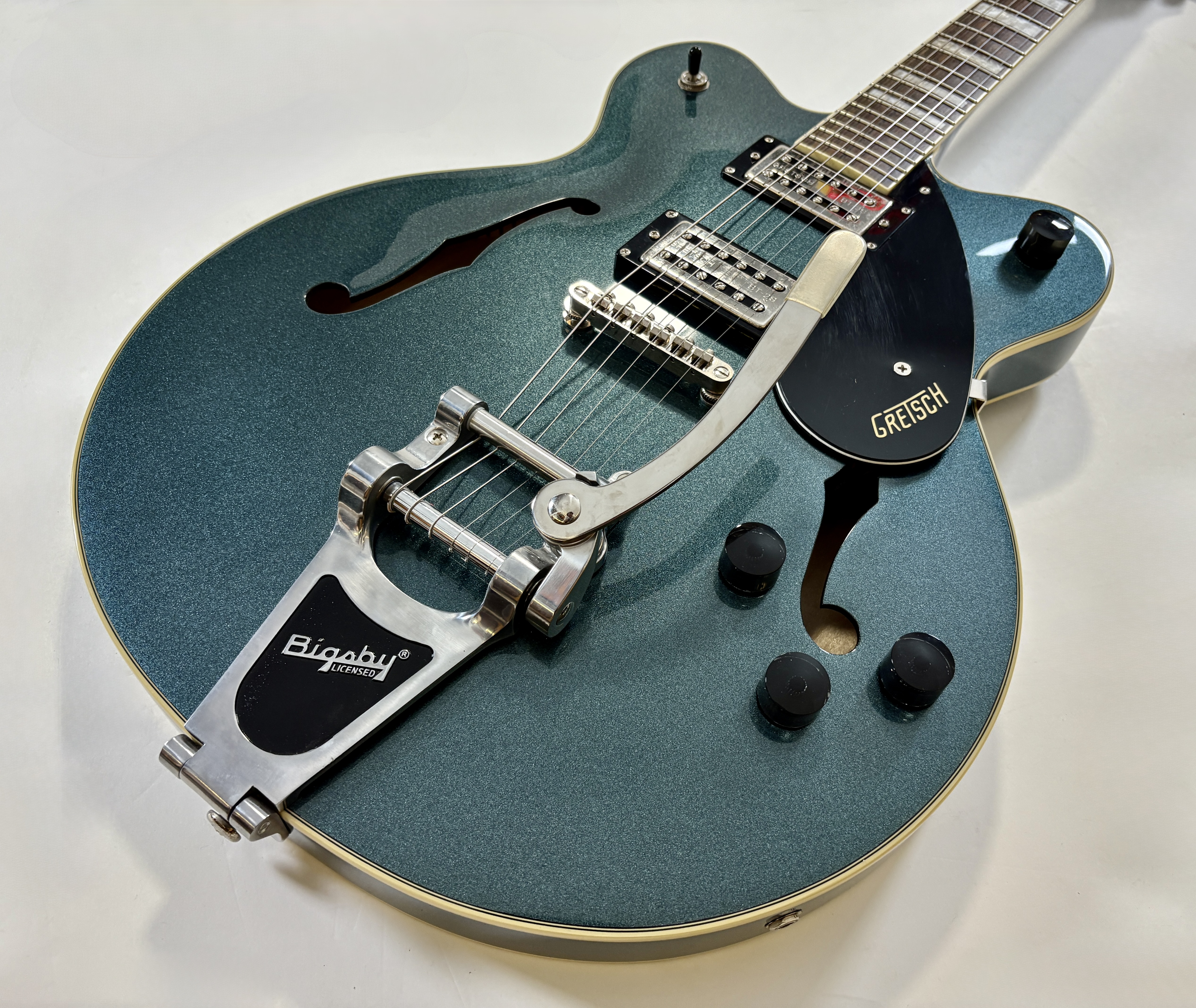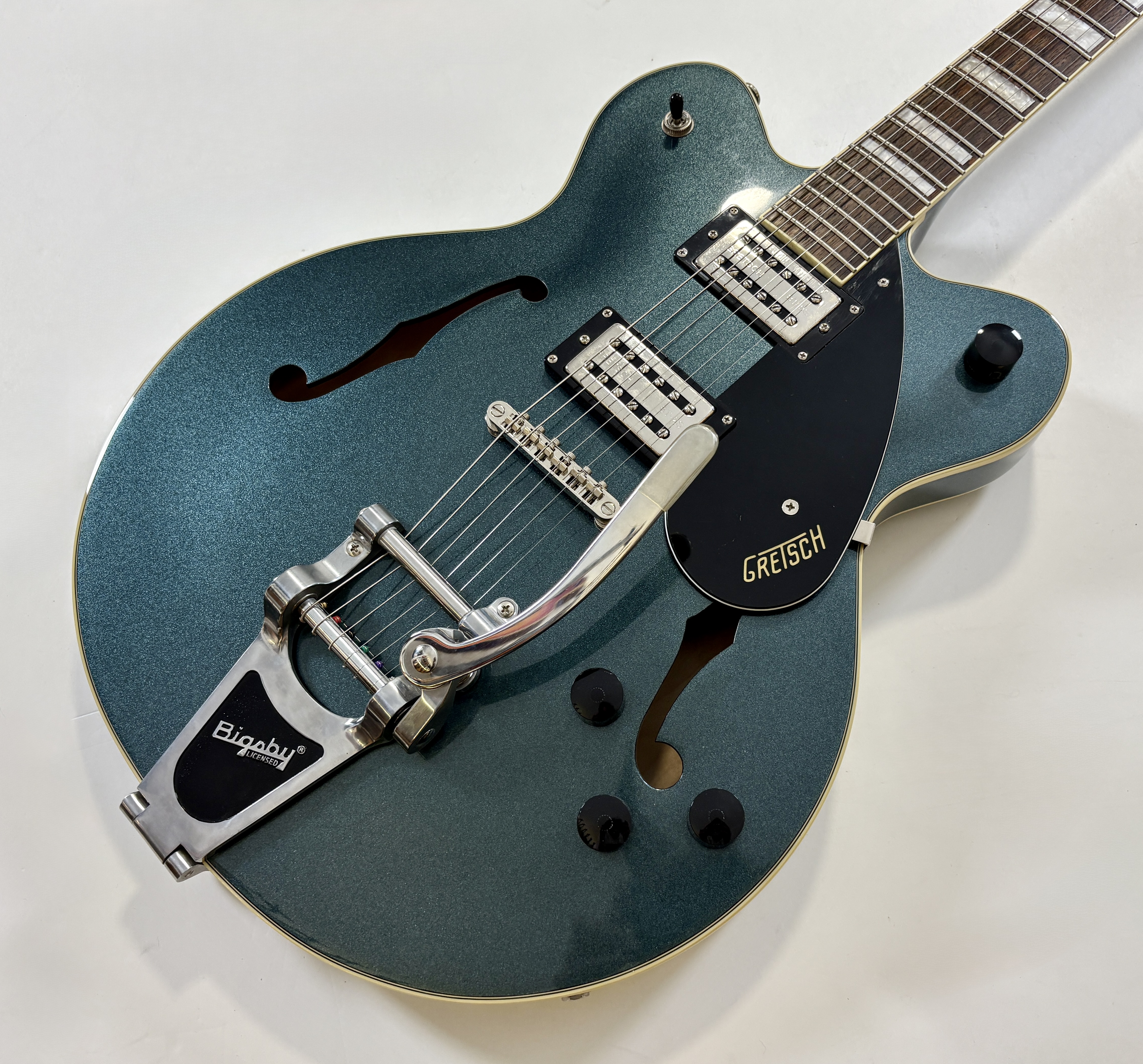 La G2622T est une semi-hollow double cut avec Bigsby, pensée comme une alternative accessible aux ES-335 mais avec une vraie personnalité Gretsch. Son corps en érable laminé avec bloc central limite le larsen, tandis que ses micros Broad’Tron offrent un son plus moderne et polyvalent que les Gretsch vintage, avec des aigus clairs et des médiums légèrement creusés. On notera par ailleurs la présence d'un vibrato par Bigsby.Location, achat, vente, reprise, dépôt-vente.