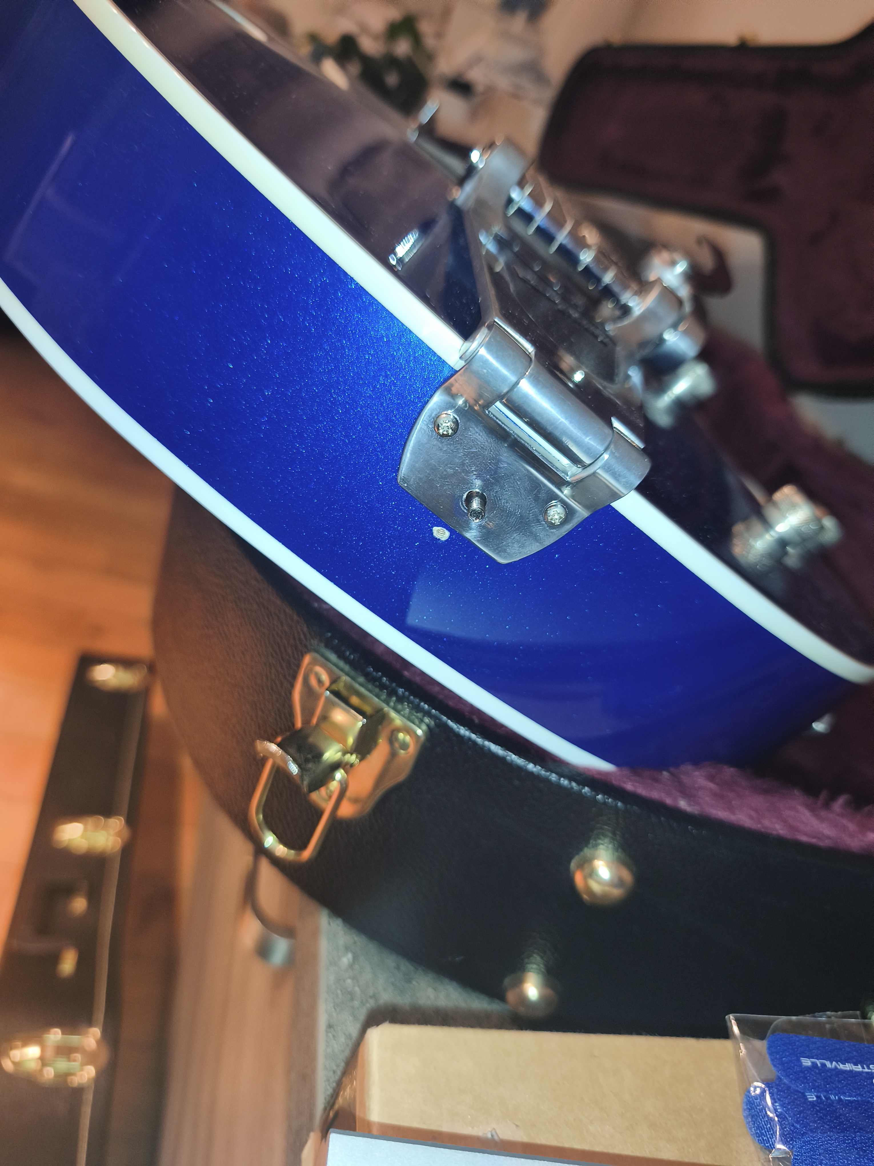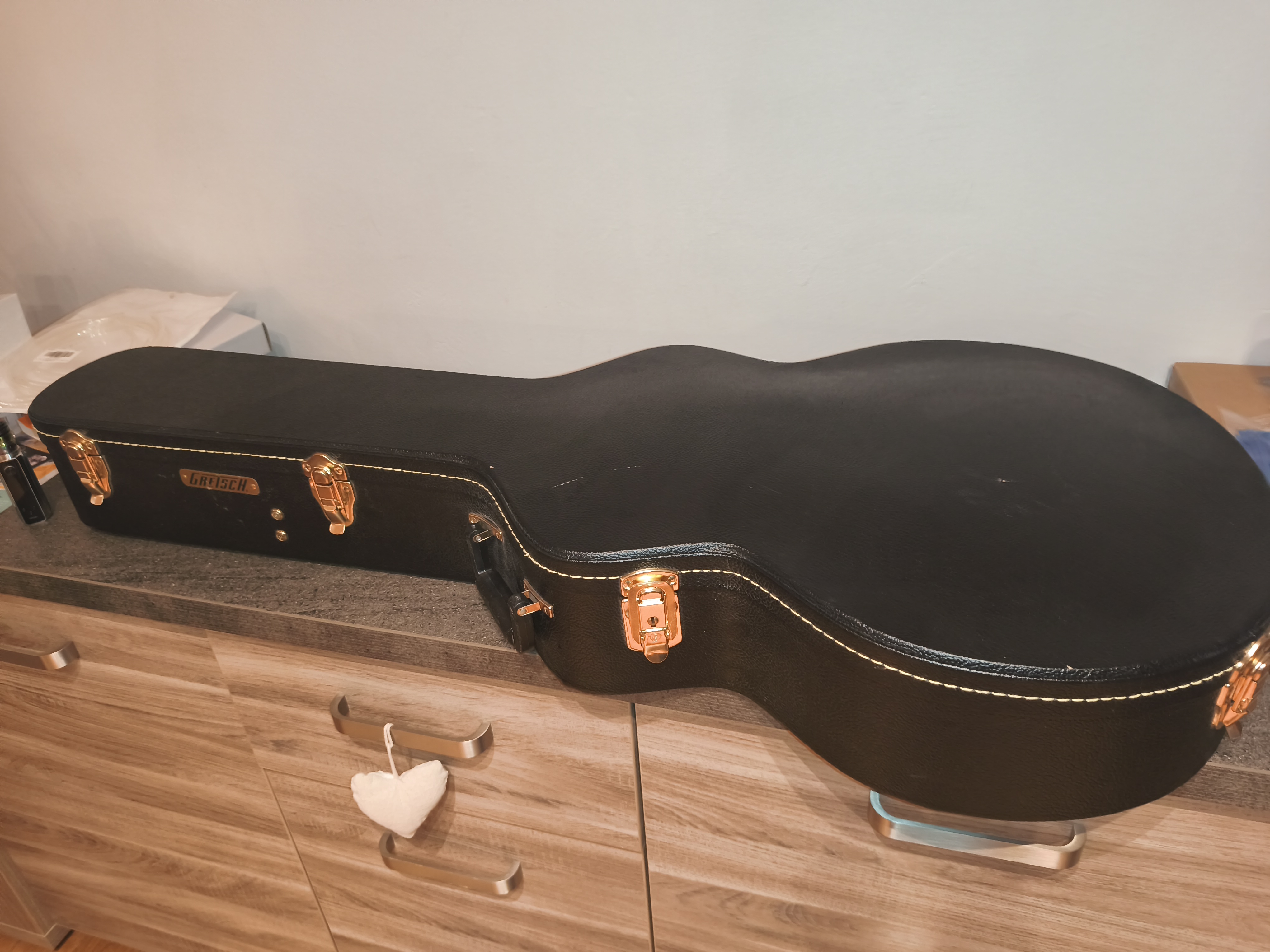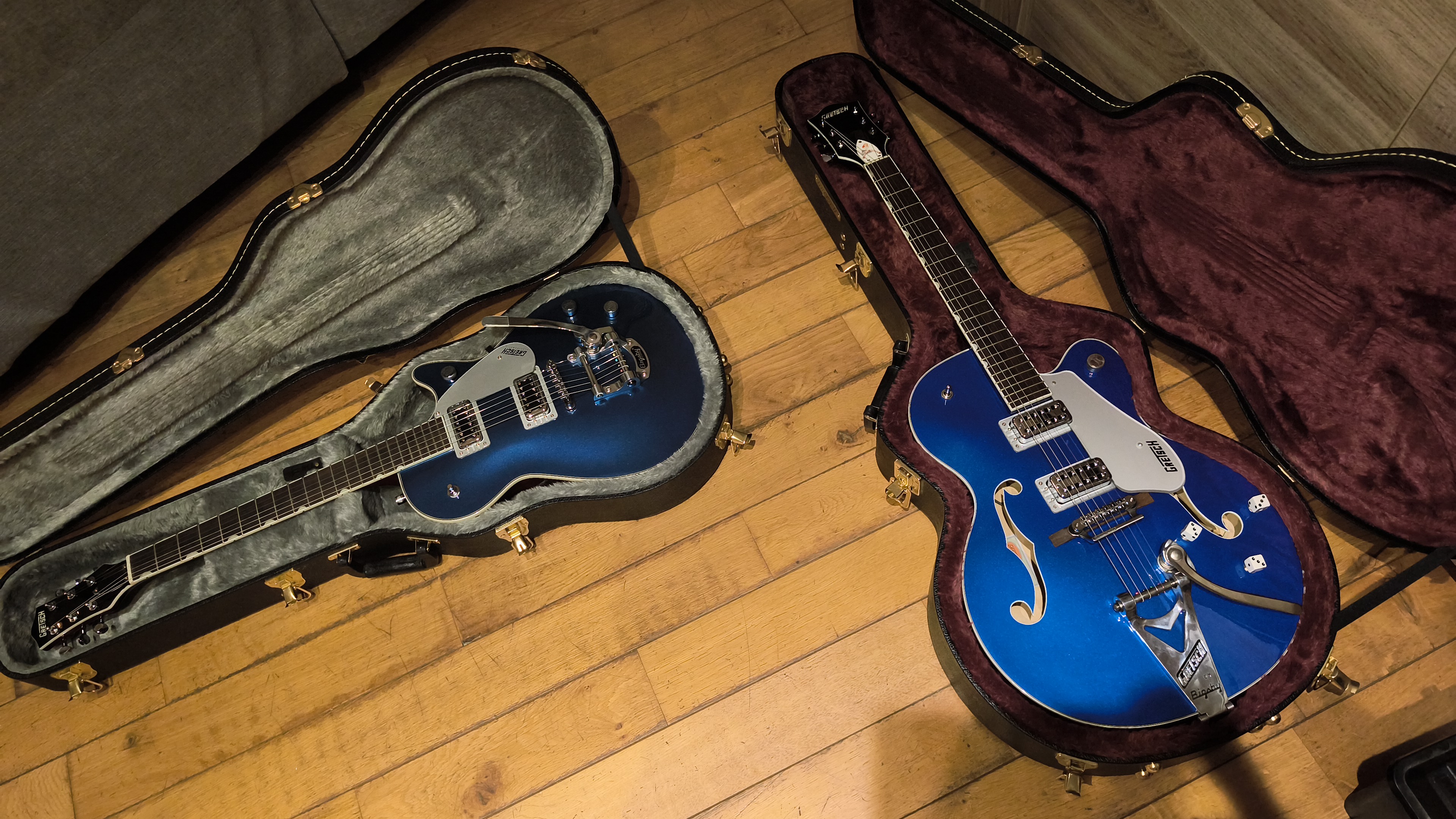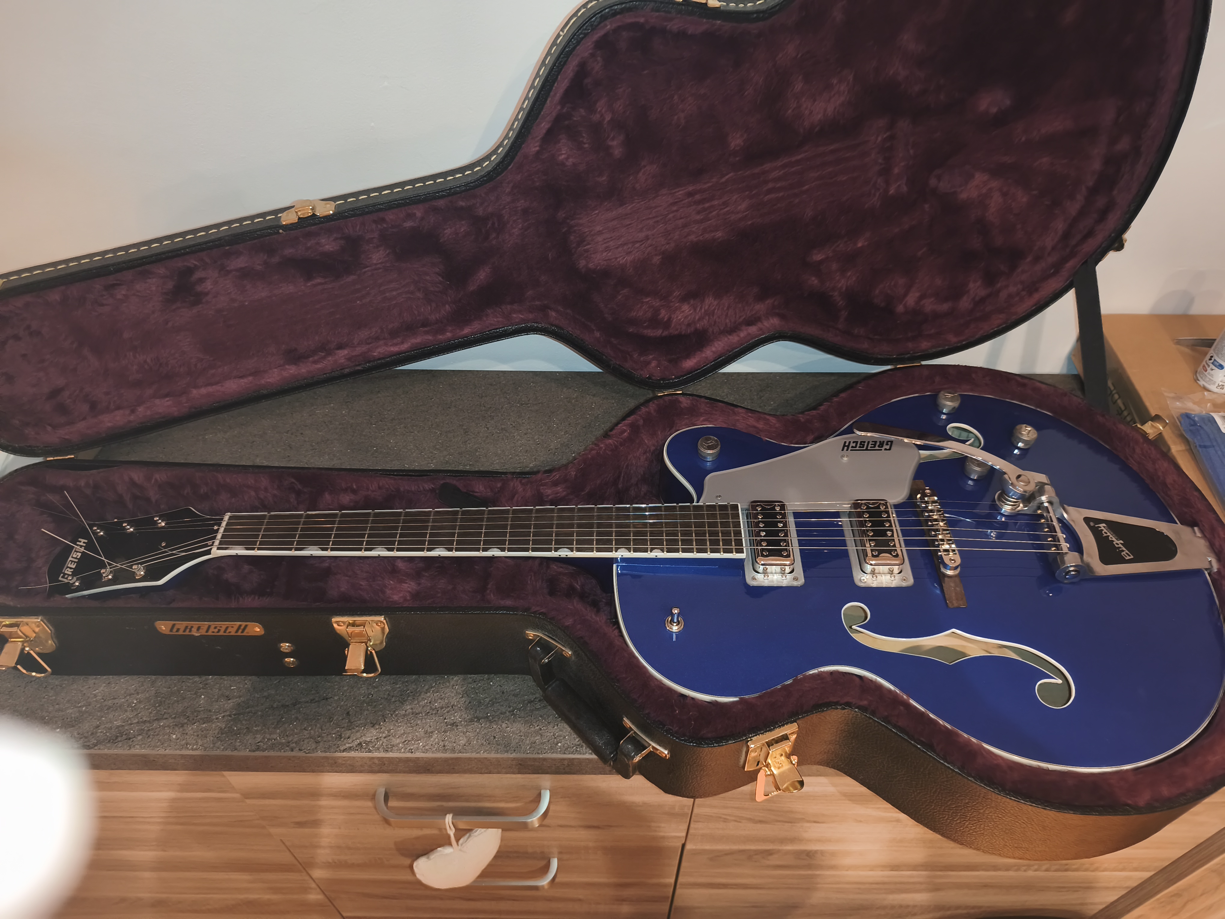 Je l’ai remontée comme à l’origine, toutes les upgrades sont à vendre séparément (sauf les mécaniques autobloquantes et les TV Jones que j’ai montés sur une autre Gretsch). Si ça vous intéresse, n’hésitez pas à me le dire -- je vous conseille le bridge à rouleaux et le vrai bigsby. Je m’occuperai du montage évidemment.