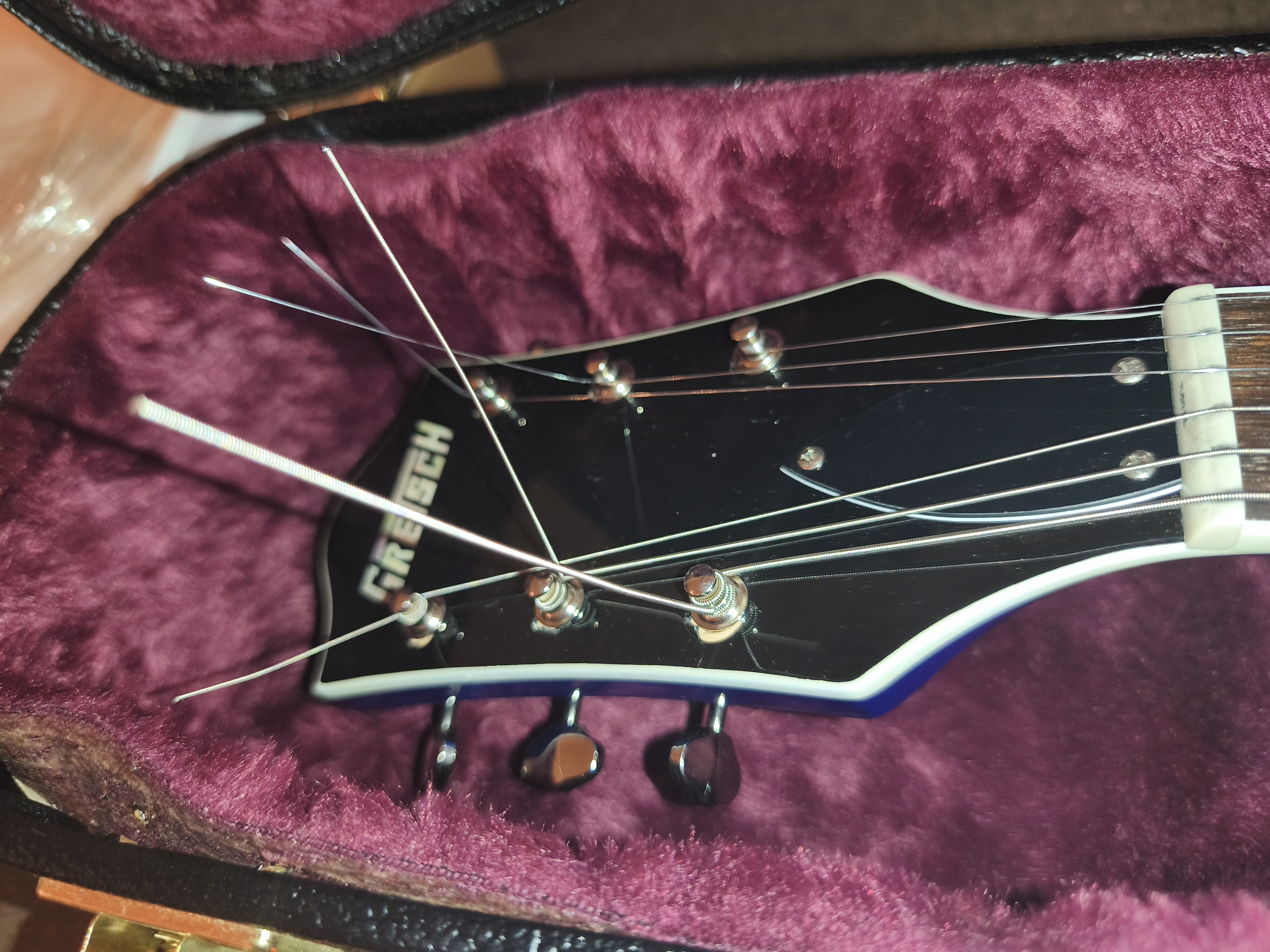 - Au niveau des trous des mécaniques, on voit qu’il y a un peu de peinture qui partie. Gretsch a collé les inserts pour les mécaniques donc au moment de les enlever, ça a laissé des marques. Mais ce sera caché si vous changez les mécaniques.