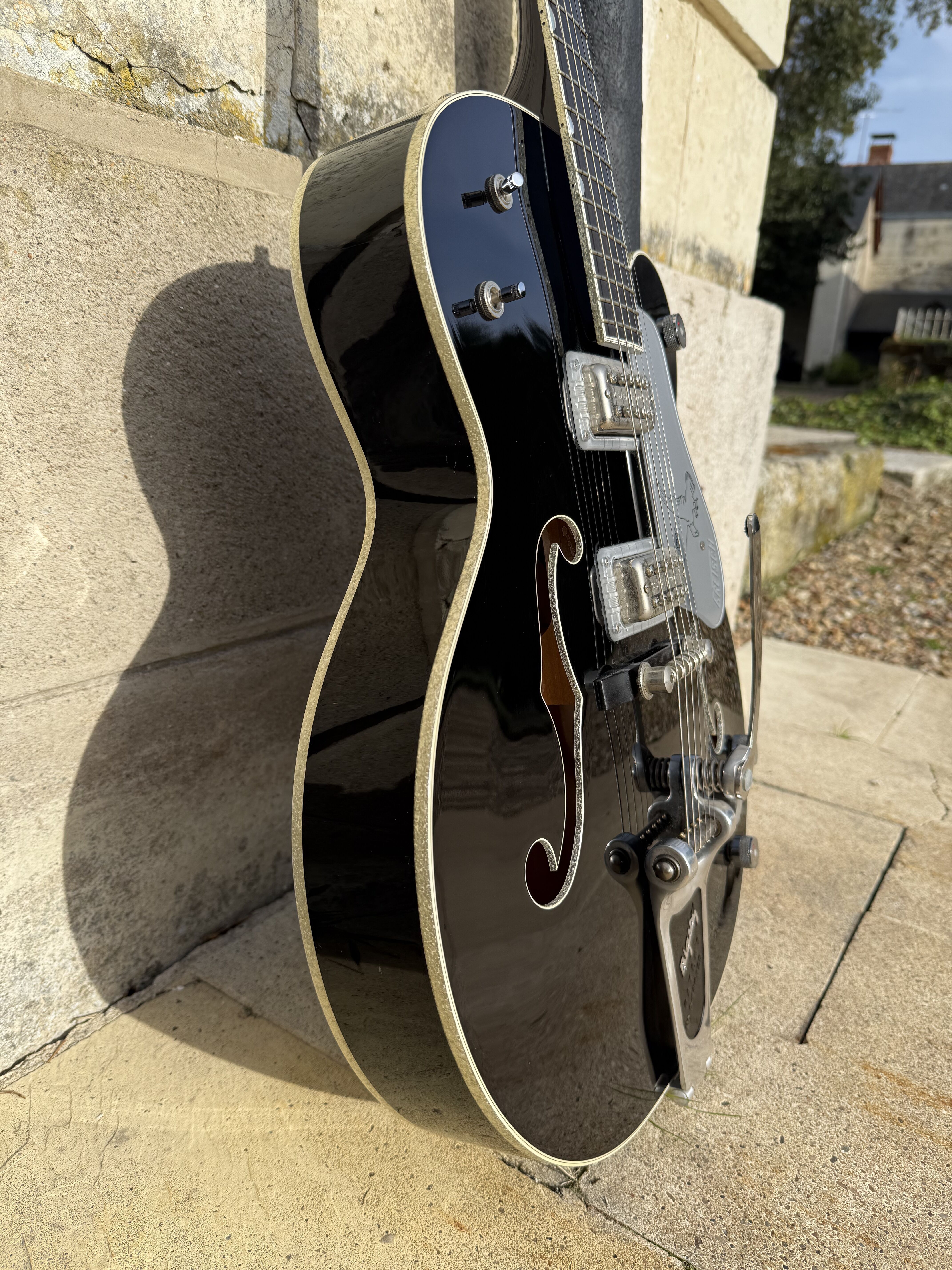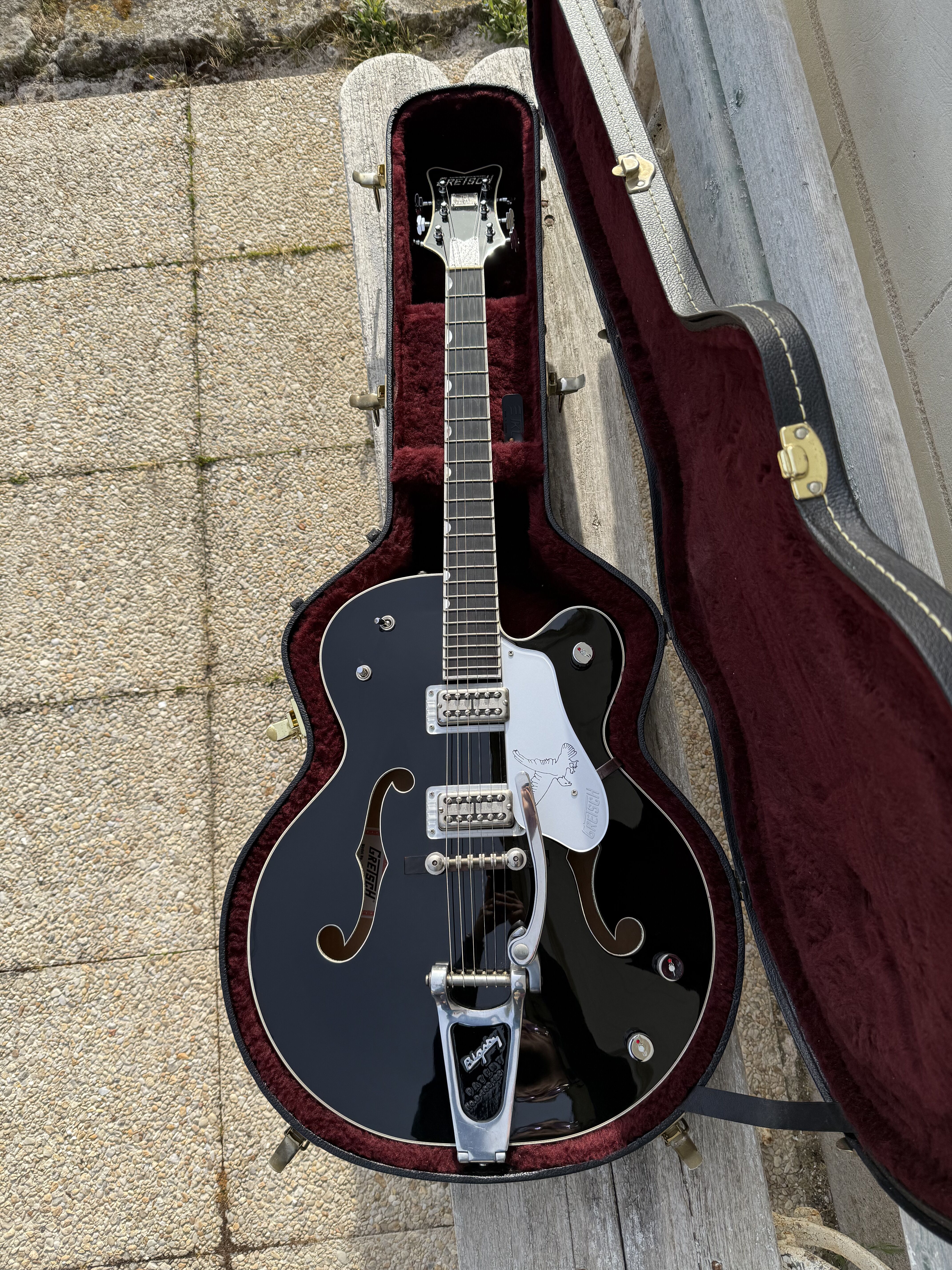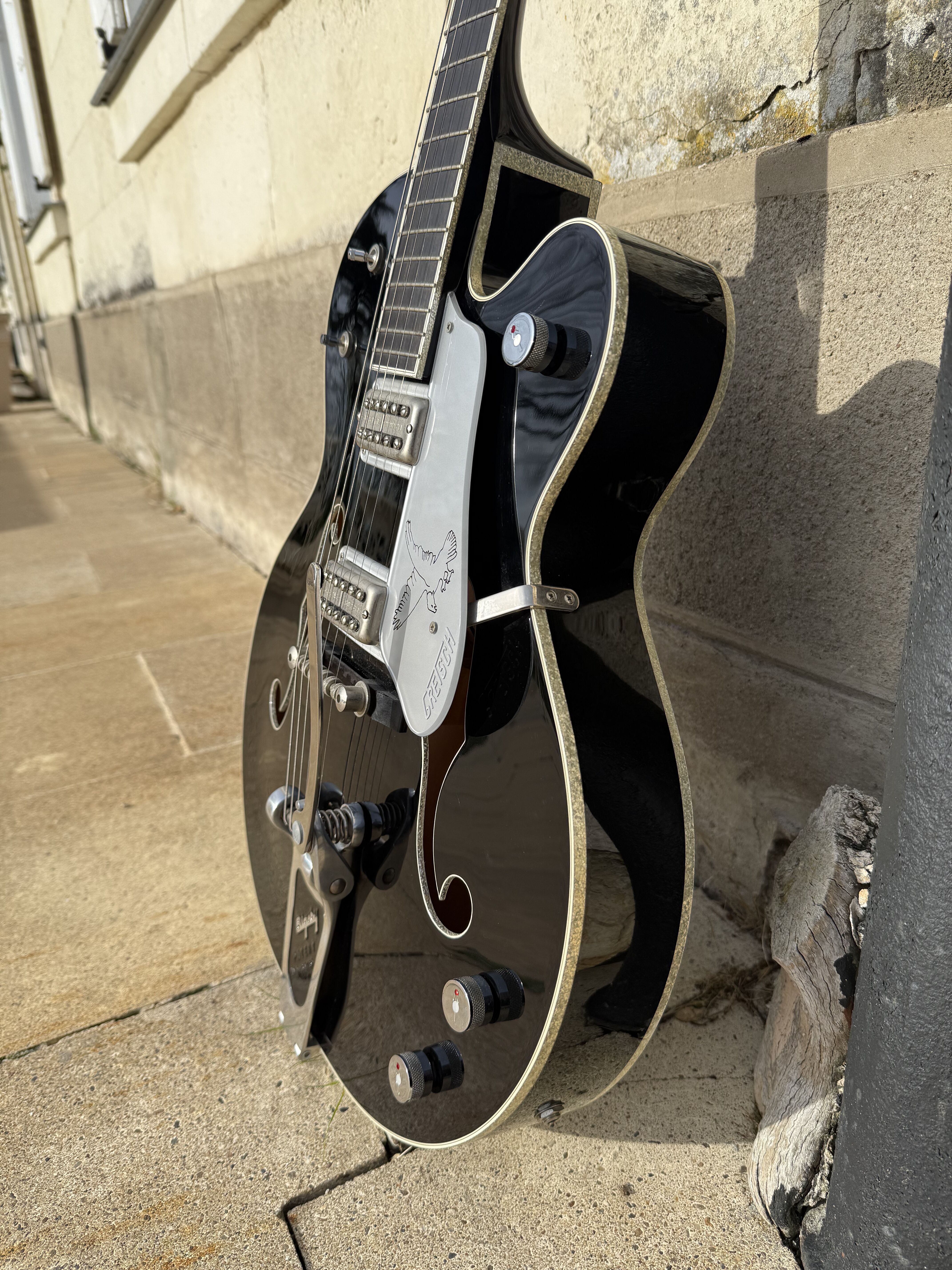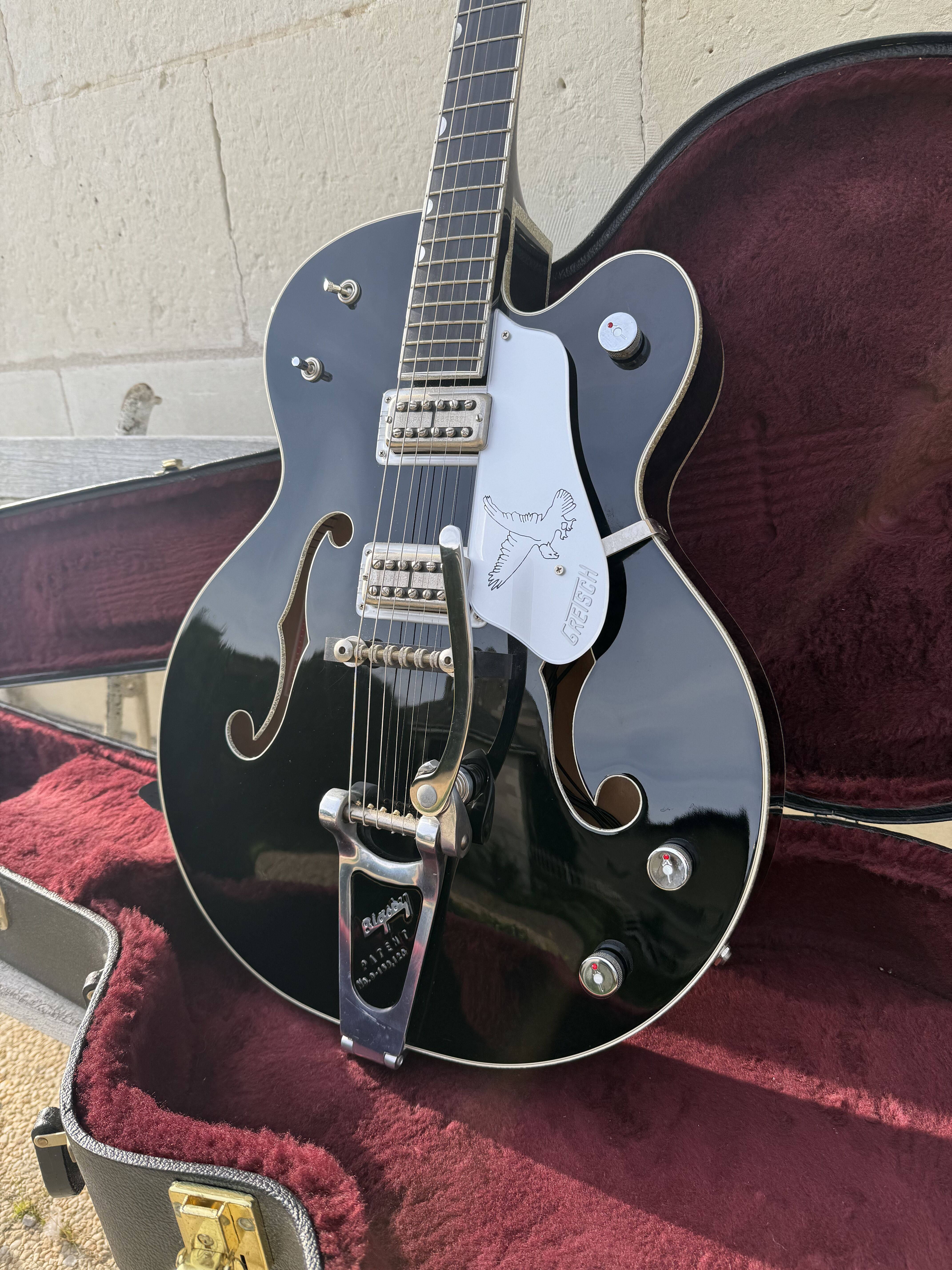 Je vends cette superbe Gretsch Silver Falcon (G6136), modèle phare de la "Professional Collection", fabriquée avec précision au Japon (Usine de Terada). Cet instrument combine parfaitement l'élégance du noir profond et l'éclat des finitions "Silver Sparkle". La guitare a été entretenue avec soin. Elle présente un très bon état de conservation. Pour une transparence totale, il est à noter la présence de quelques rayures superficielles d'usage sur le vernis. Ces marques sont mineures et partiraient très probablement lors d'un léger polissage (coup de polish) pour retrouver un aspect miroir. Fiche Technique: • Fabrication : Japon (Terada Factory) • Corps : Hollow Body, érable laminé • Touche : Ébène avec incrustations "Hump-block" • Accastillage : Chrome / Silver • Microphones : Deux micros High Sensitive Filter'Tron (son Gretsch authentique) • Vibrato : Bigsby B6G • Reliure (Binding) : Silver Sparkle intégral (corps, manche, tête) Accessoires • Vendue avec son étui rigide Gretsch d'origine (intérieur velours bordeaux) Modalités de vente • Prix : [2600] € • Localisation : Remise en main propre uniquement à Paris. • Pas d'envoi. • Essai : Un test de la guitare est possible dans le 17ème arrondissement de Paris. Mots clés : Gretsch White Falcon, Gibson ES 335 345 355 , Fender , Martin