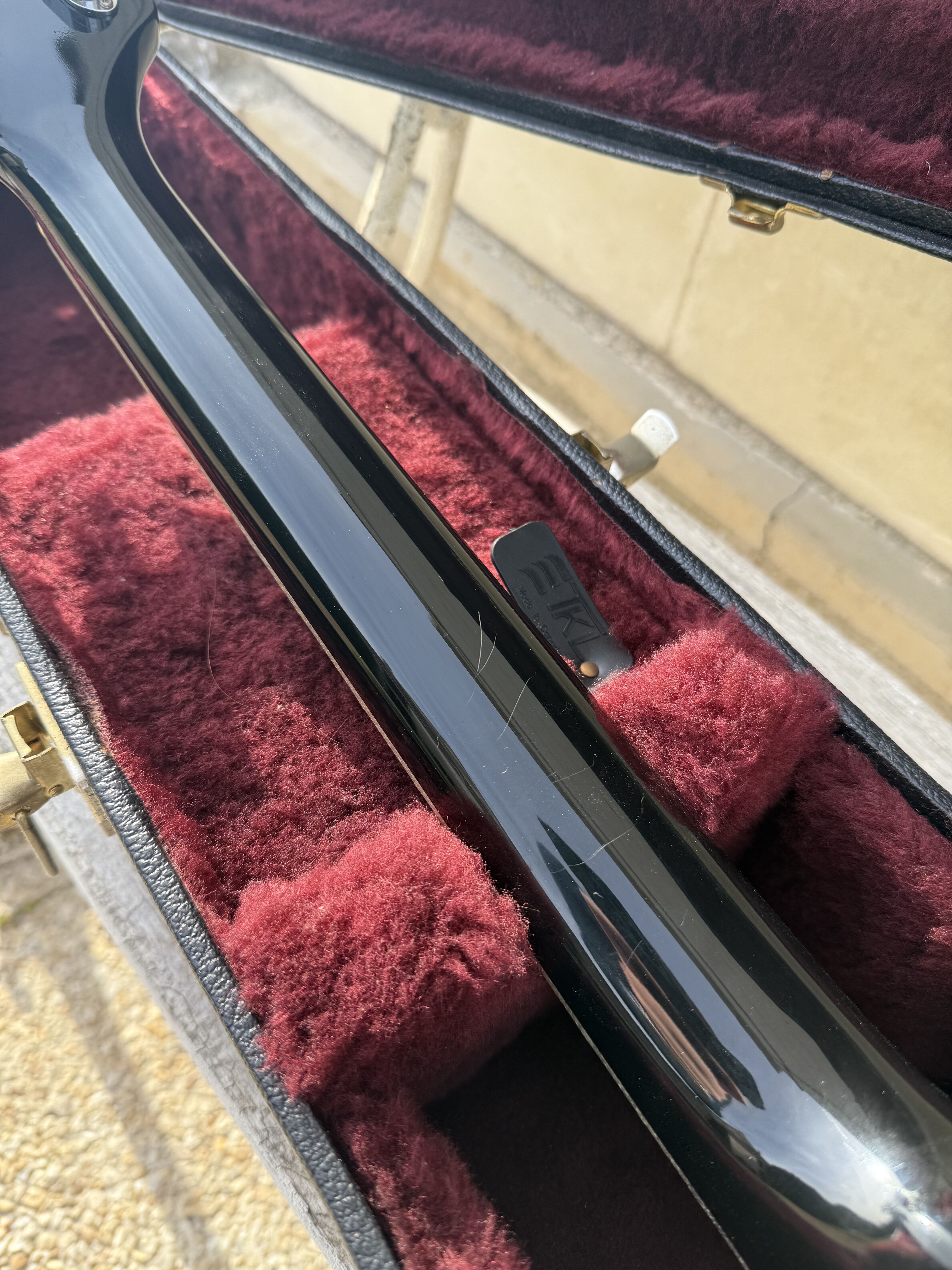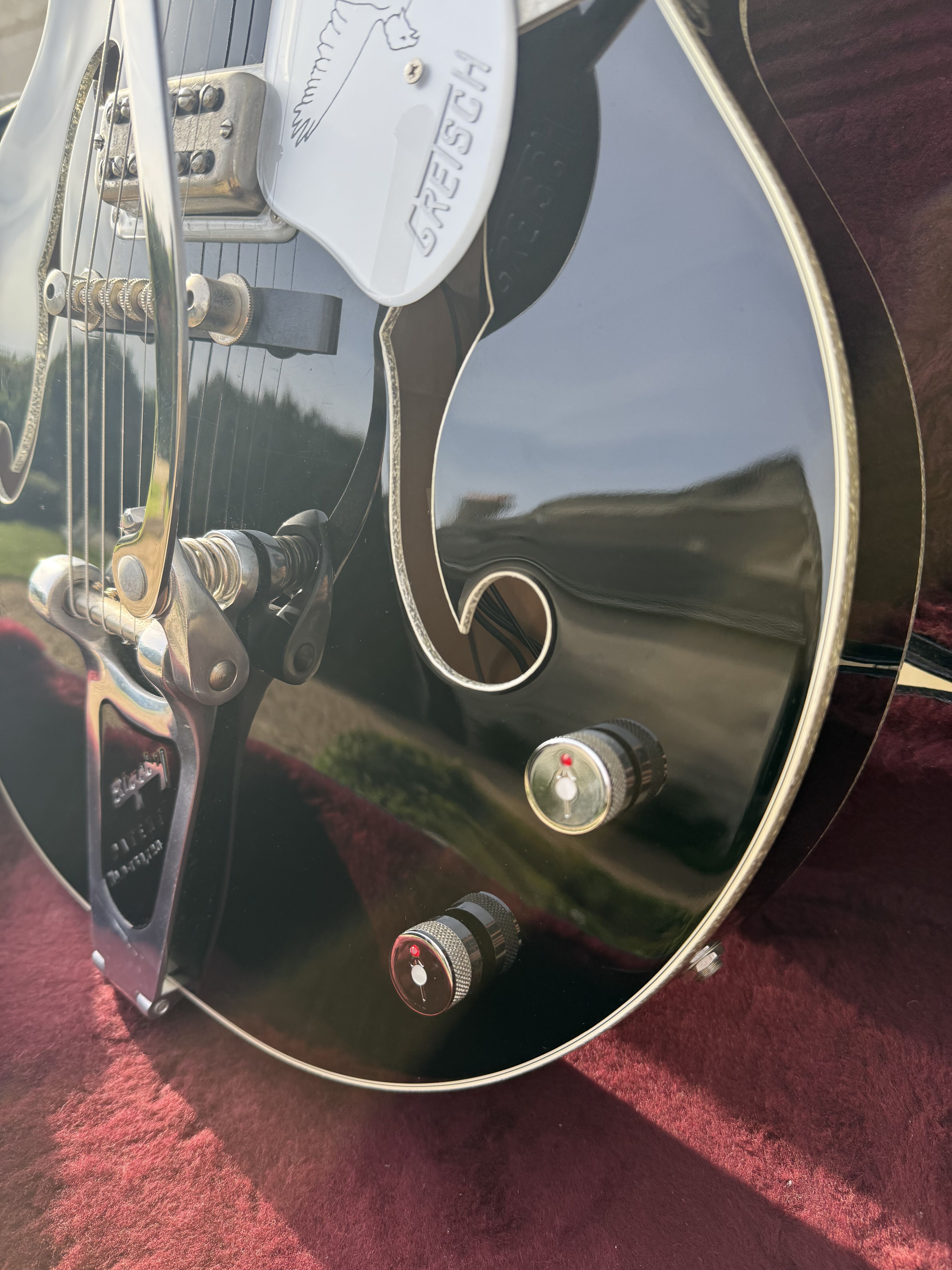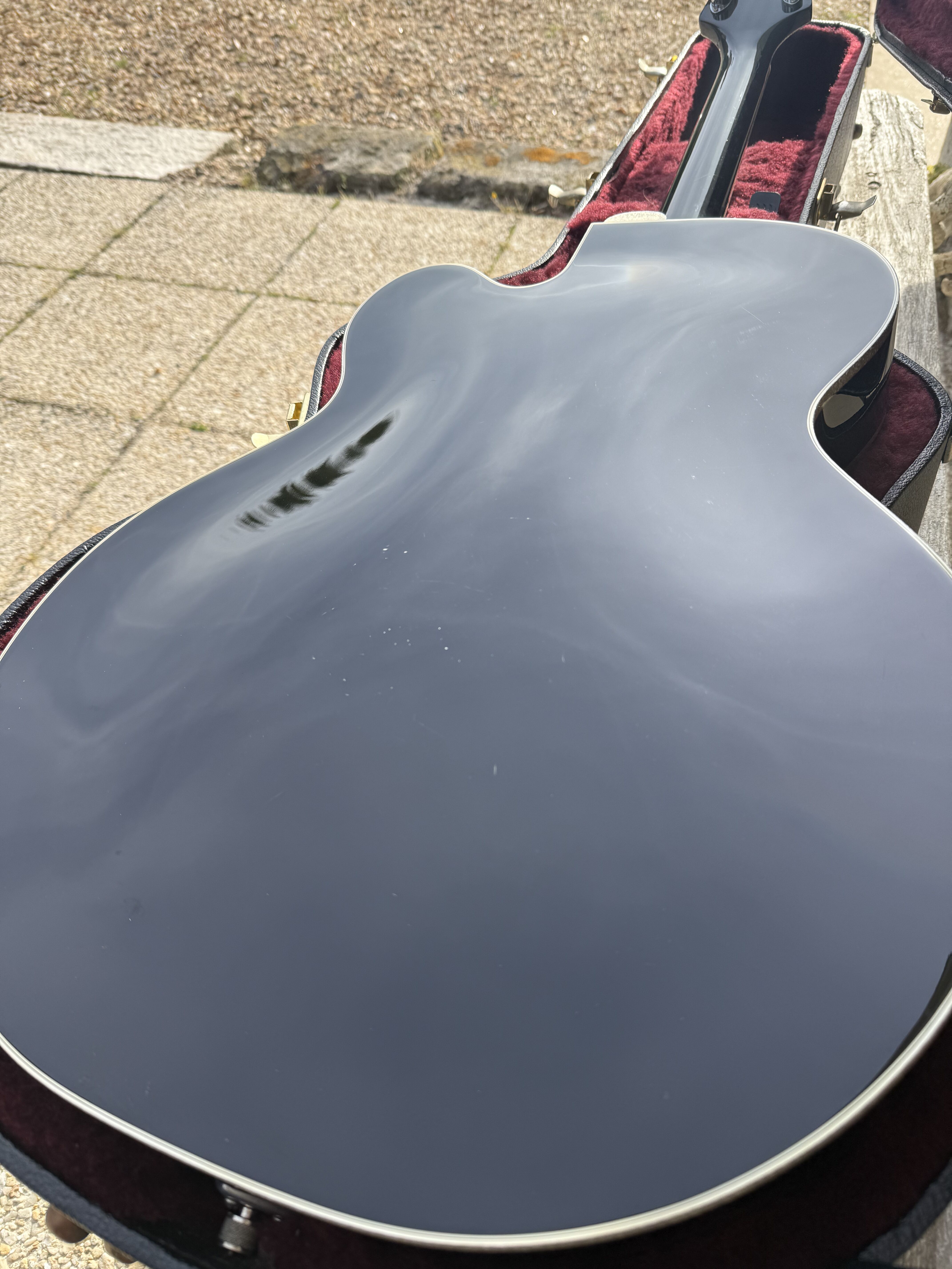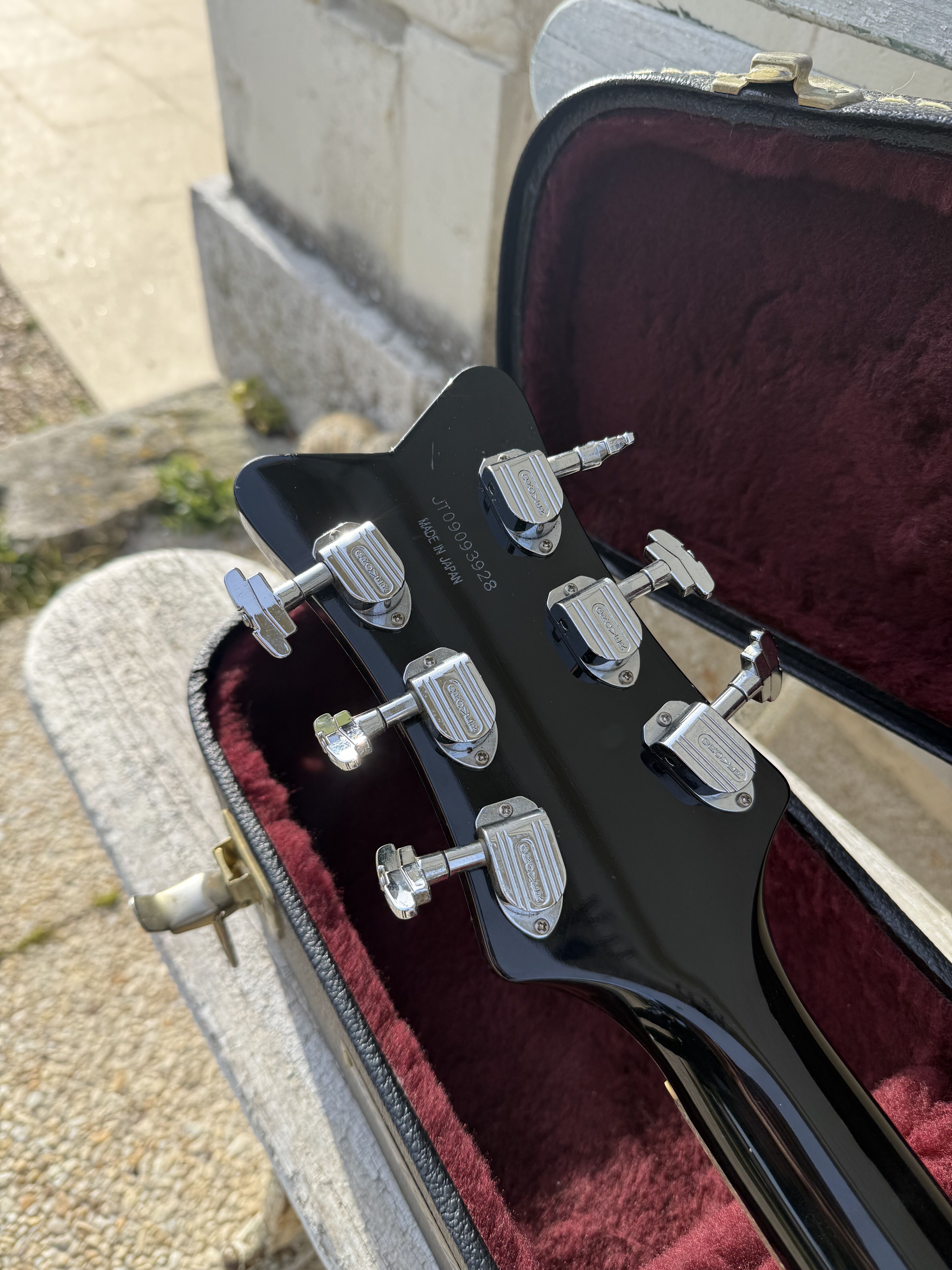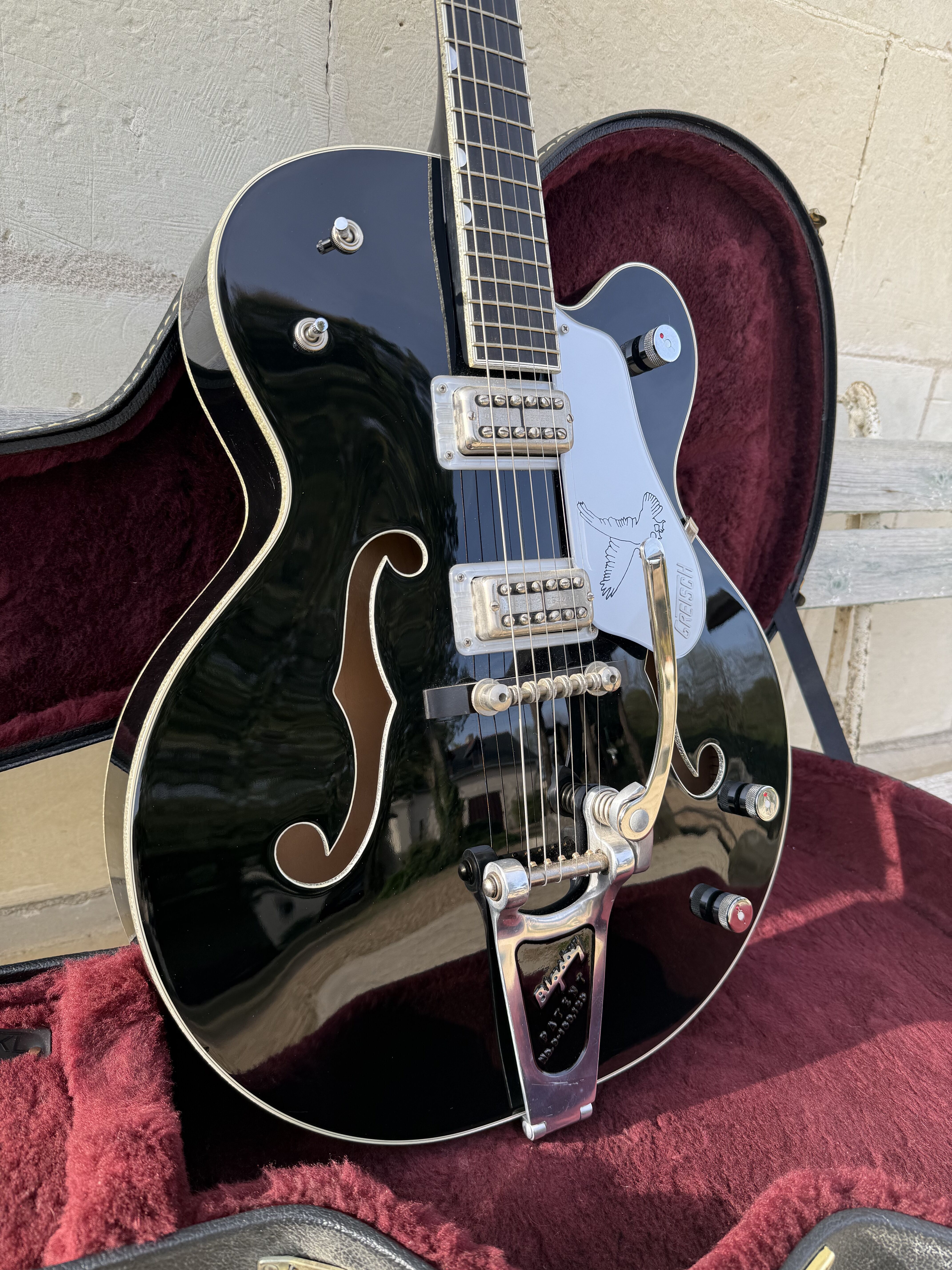 Je vends cette superbe Gretsch Silver Falcon (G6136), modèle phare de la "Professional Collection", fabriquée avec précision au Japon (Usine de Terada). Cet instrument combine parfaitement l'élégance du noir profond et l'éclat des finitions "Silver Sparkle". La guitare a été entretenue avec soin. Elle présente un très bon état de conservation. Pour une transparence totale, il est à noter la présence de quelques rayures superficielles d'usage sur le vernis. Ces marques sont mineures et partiraient très probablement lors d'un léger polissage (coup de polish) pour retrouver un aspect miroir. Fiche Technique: • Fabrication : Japon (Terada Factory) • Corps : Hollow Body, érable laminé • Touche : Ébène avec incrustations "Hump-block" • Accastillage : Chrome / Silver • Microphones : Deux micros High Sensitive Filter'Tron (son Gretsch authentique) • Vibrato : Bigsby B6G • Reliure (Binding) : Silver Sparkle intégral (corps, manche, tête) Accessoires • Vendue avec son étui rigide Gretsch d'origine (intérieur velours bordeaux) Modalités de vente • Prix : [2600] € • Localisation : Remise en main propre uniquement à Paris. • Pas d'envoi. • Essai : Un test de la guitare est possible dans le 17ème arrondissement de Paris. Mots clés : Gretsch White Falcon, Gibson ES 335 345 355 , Fender , Martin