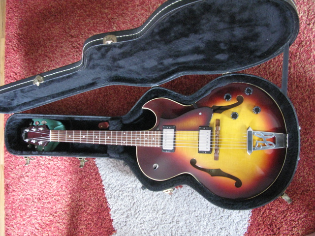 Le modèle H 575, au "5" près est une réplique de la ES 175, avec chevalet et plaque de protection en bois : très belle sonorité en accoustique et belle palette sonore amplifiée grâce aux 2 micros Humbuckers.