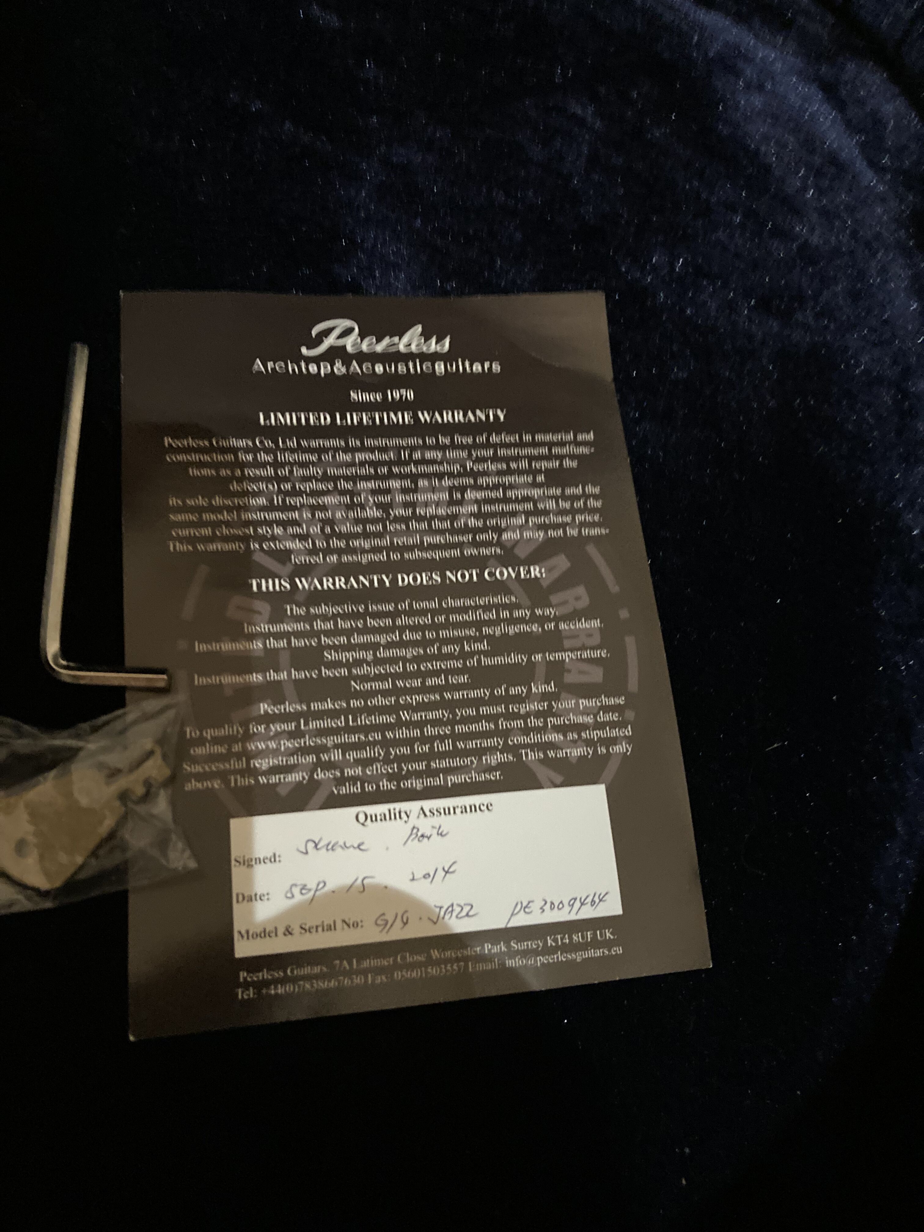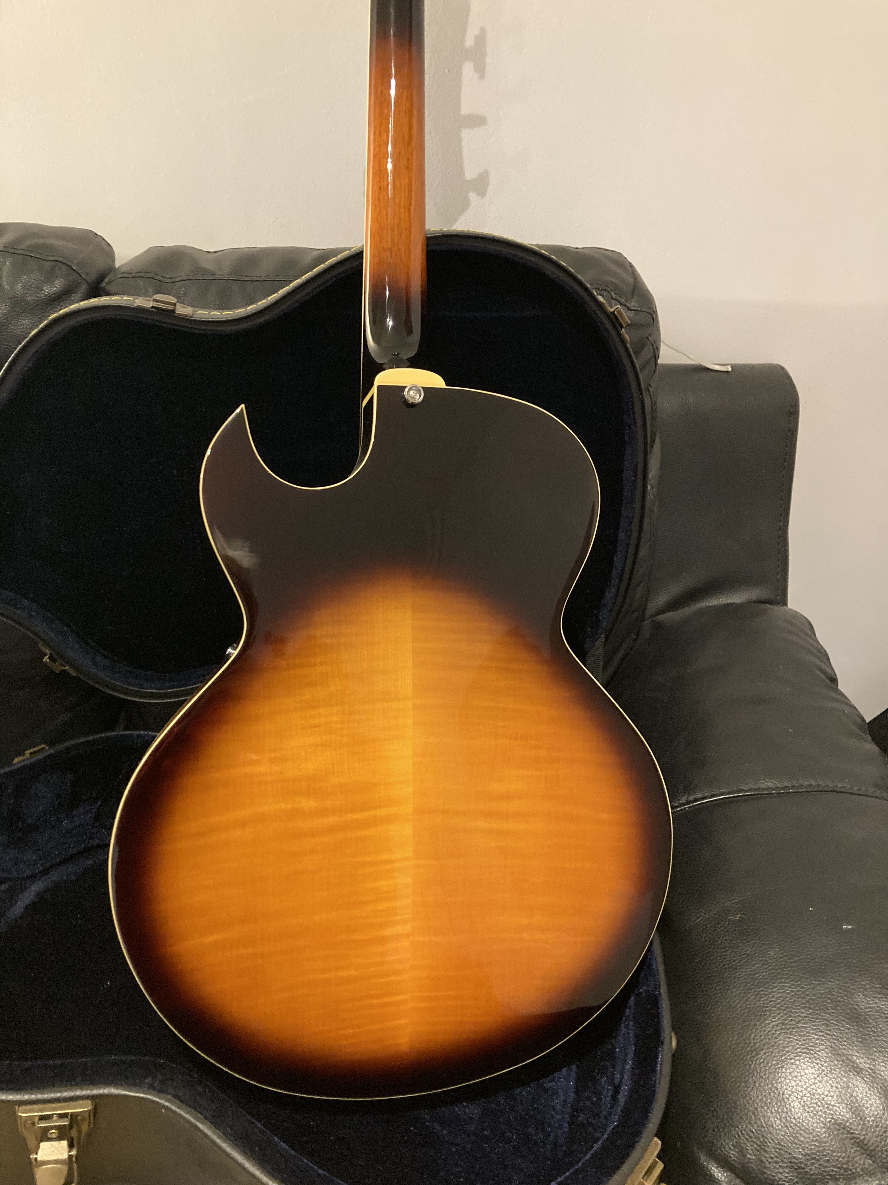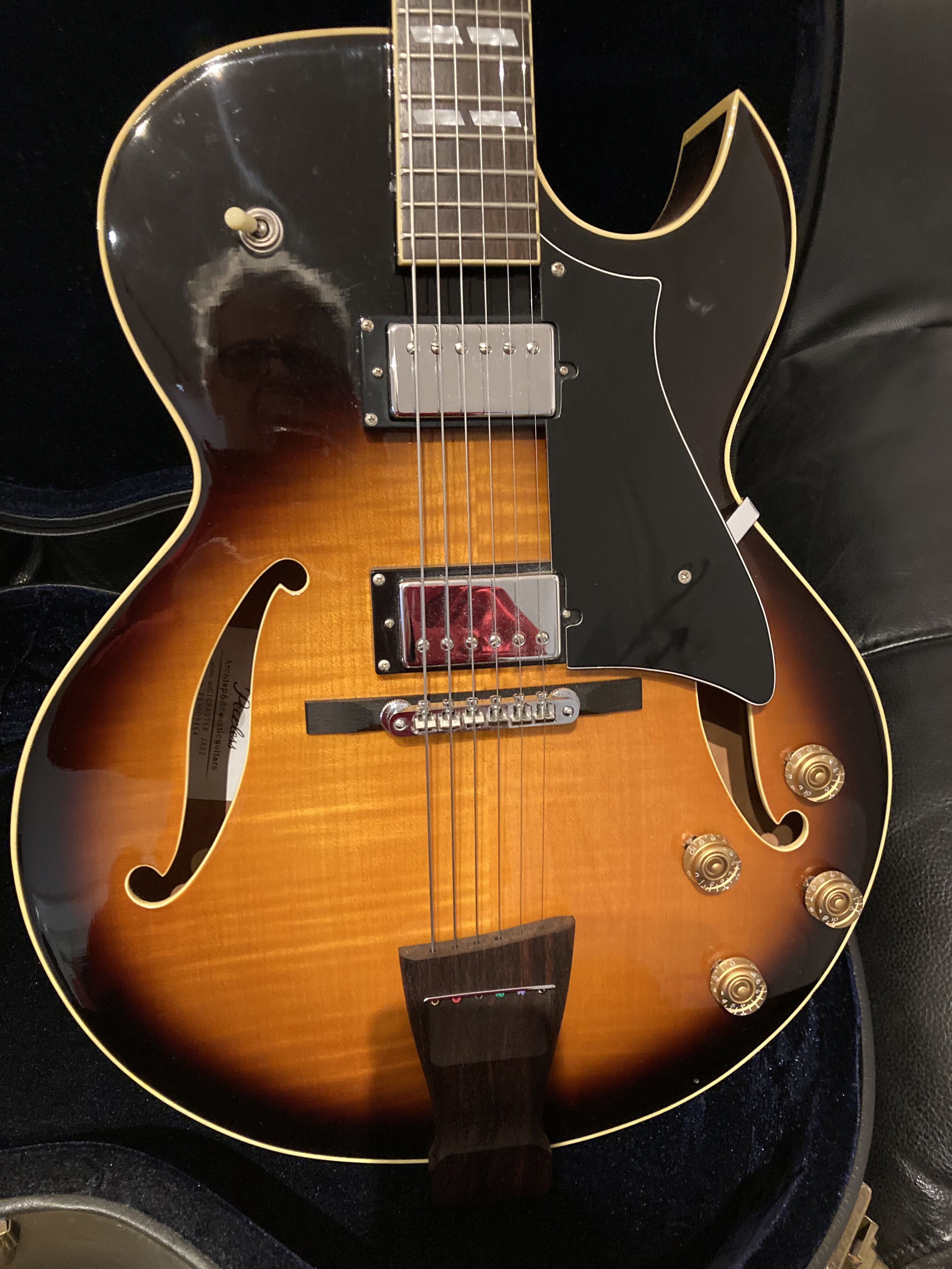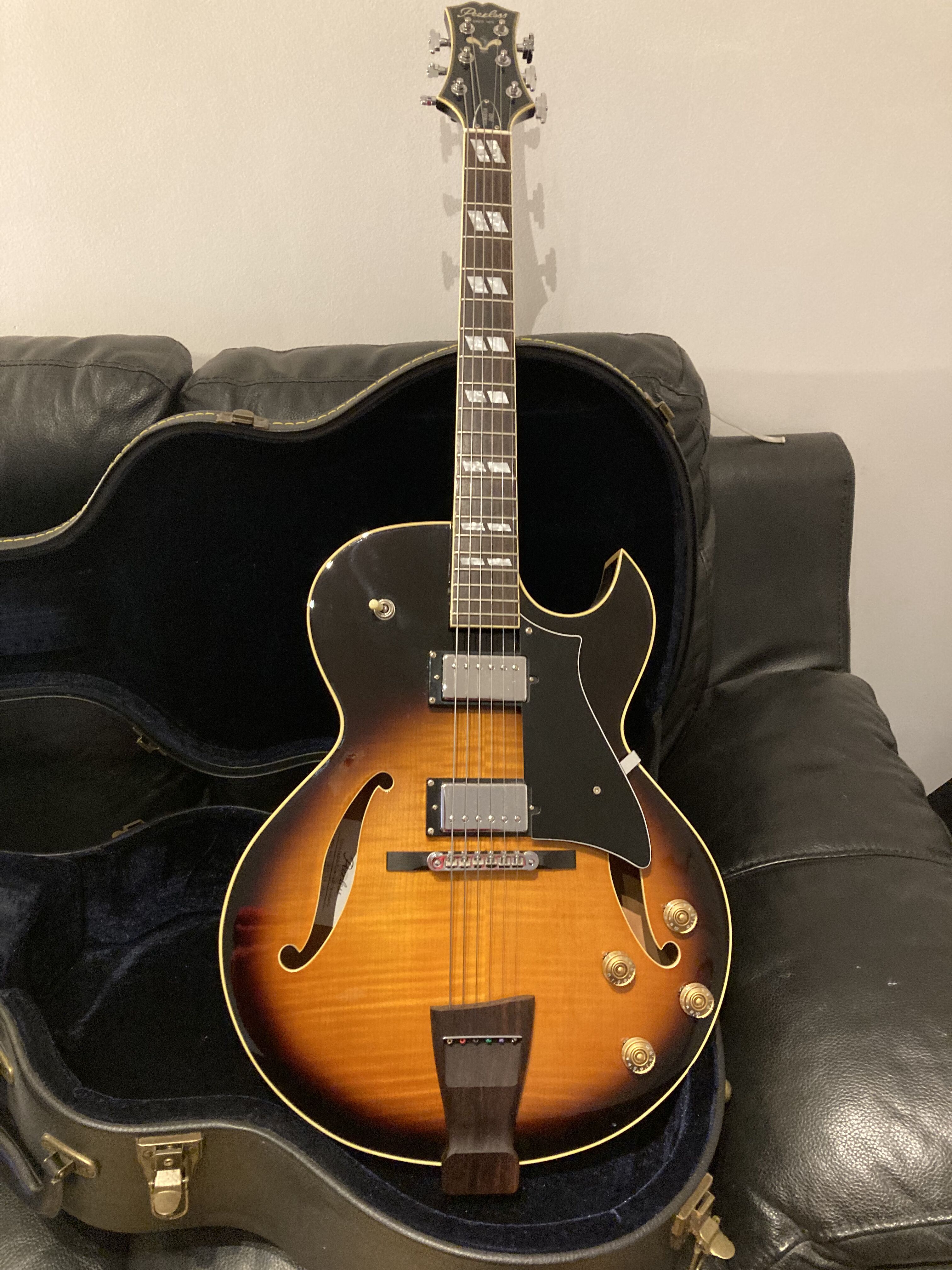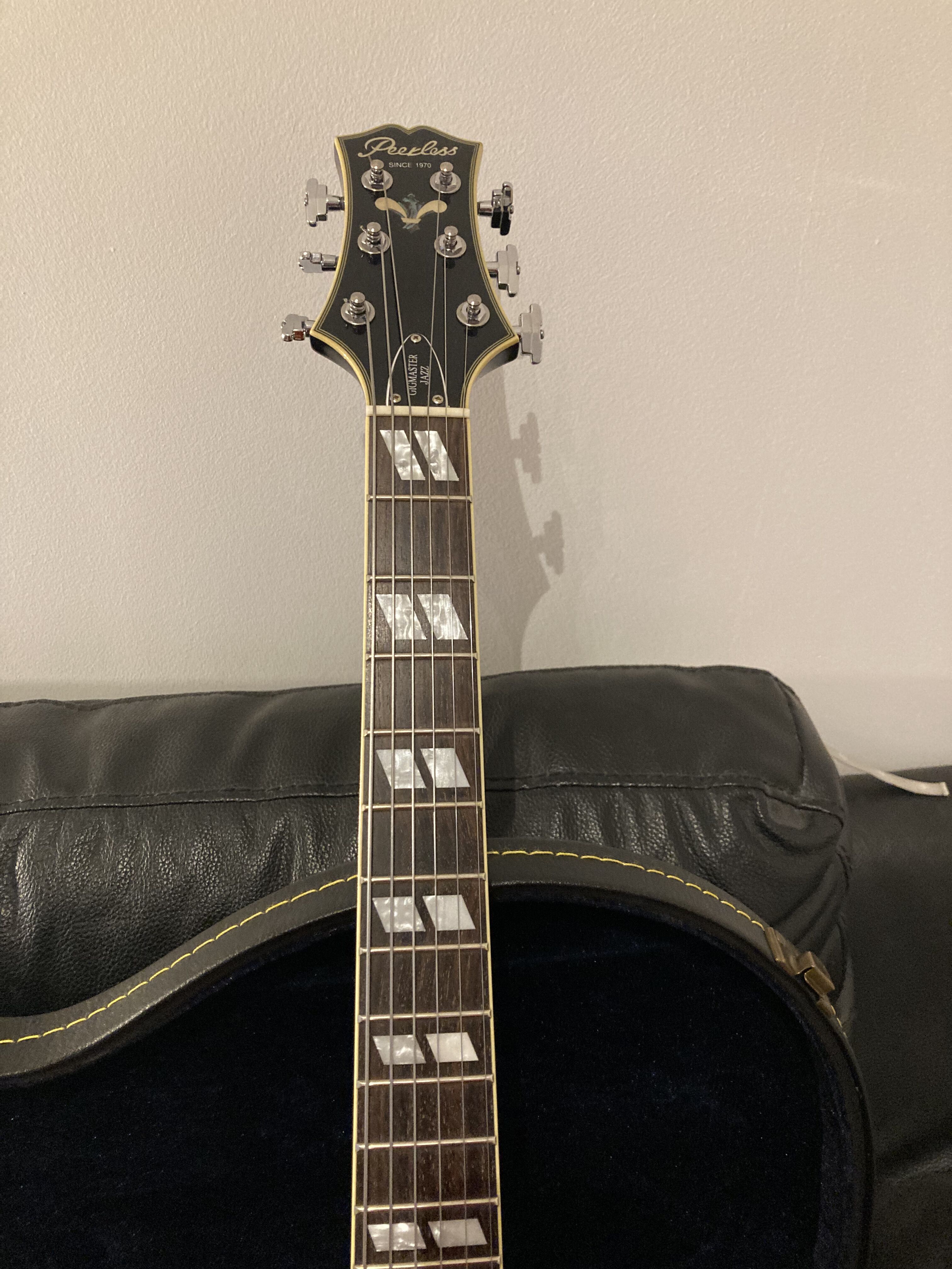 Très belle archtop Peerless Gigmaster de 2014 , avec certificat et étui original. Magnifiques sons chauds et excellent sustain . Selon le site la Peerless Gigmaster n'a vraiment pas à rougir devant la ES 175 de Gibson. Montée avec des D'Addario chrome ECG24 à filet plat. J'offre un nouveau jeu de cordes, les mêmes.Je la vends car soucis de santés et donc financiers . Regardez les commentaires élogieux à son propos sur le site, il y également tout le descriptif technique de la guitare.