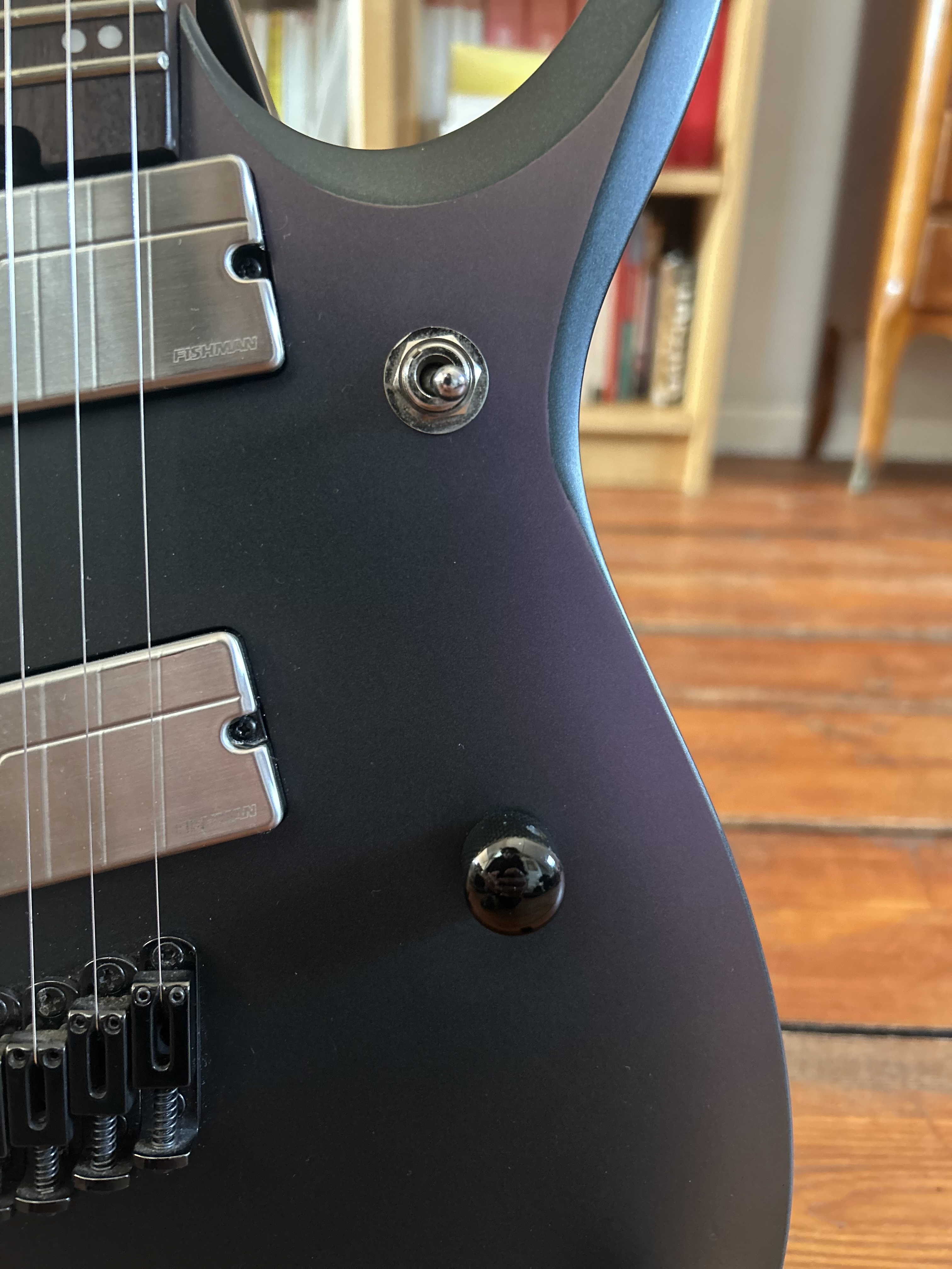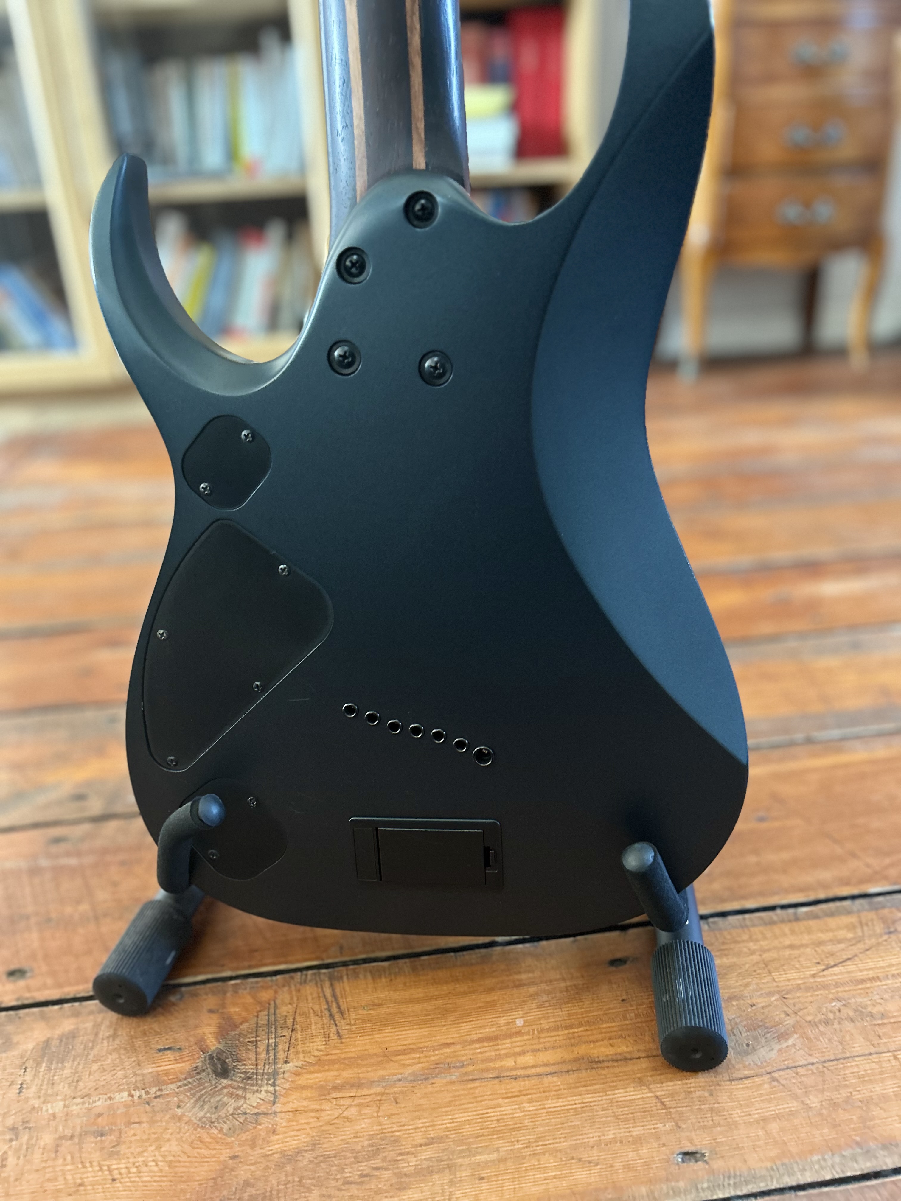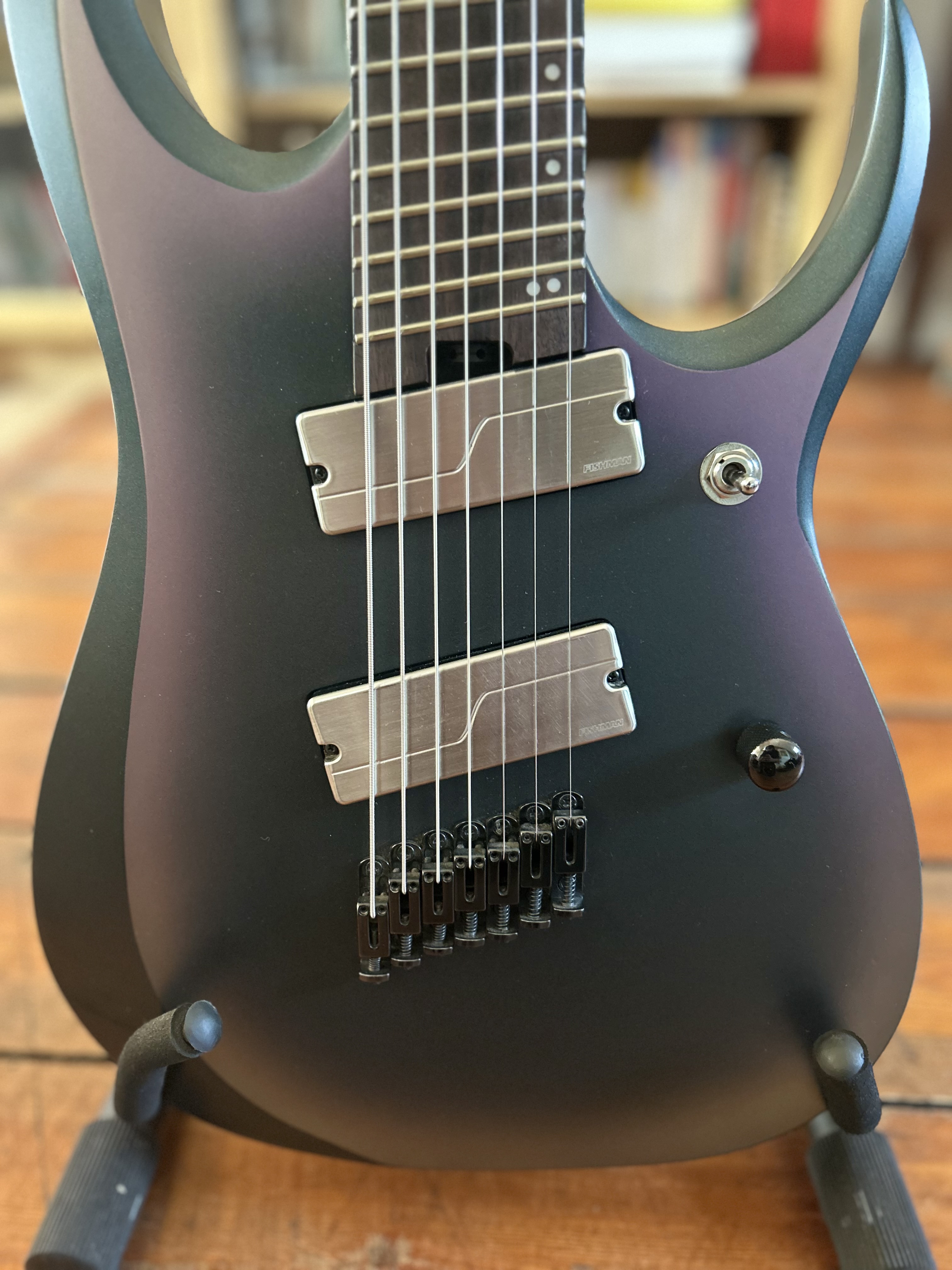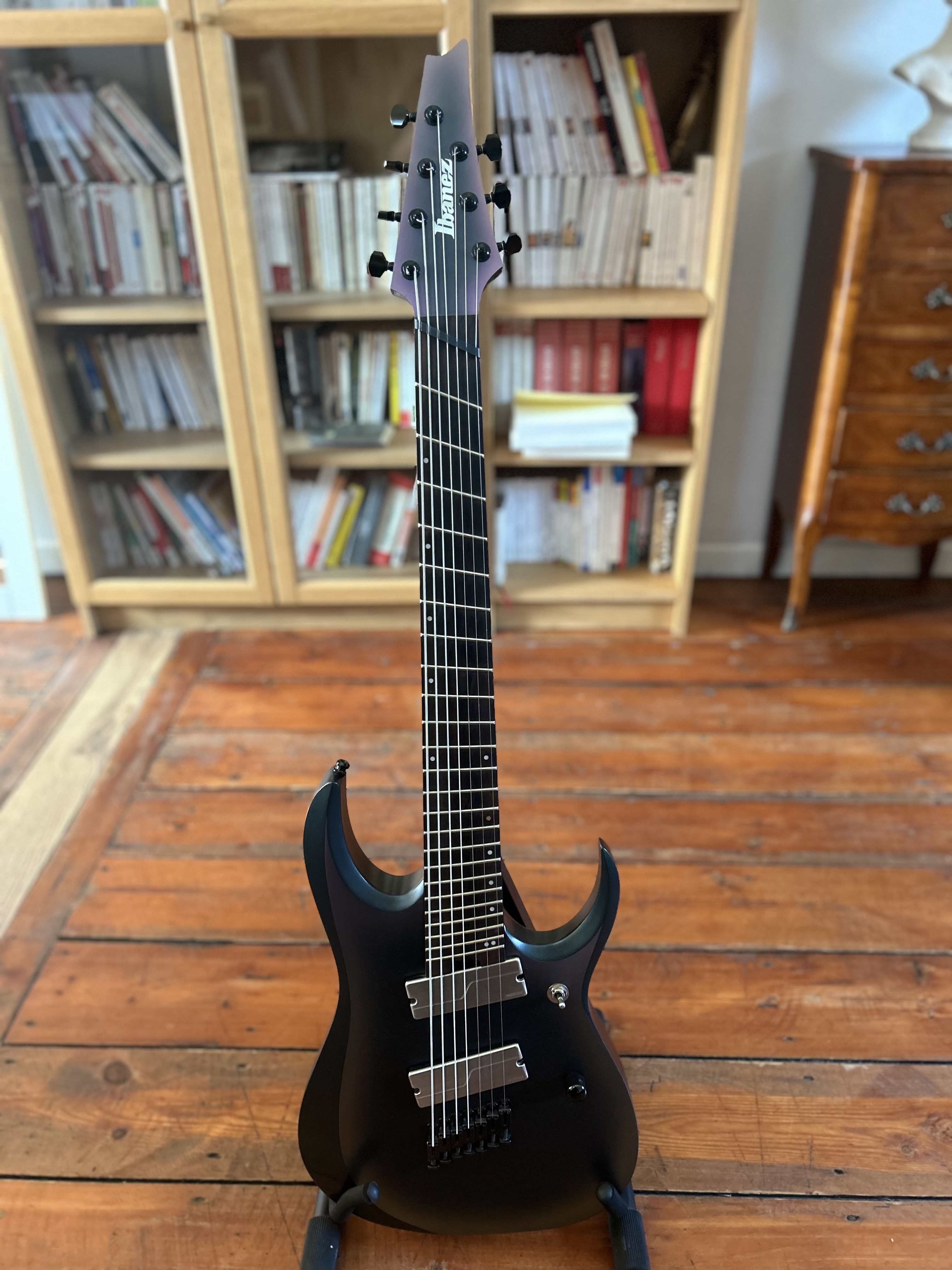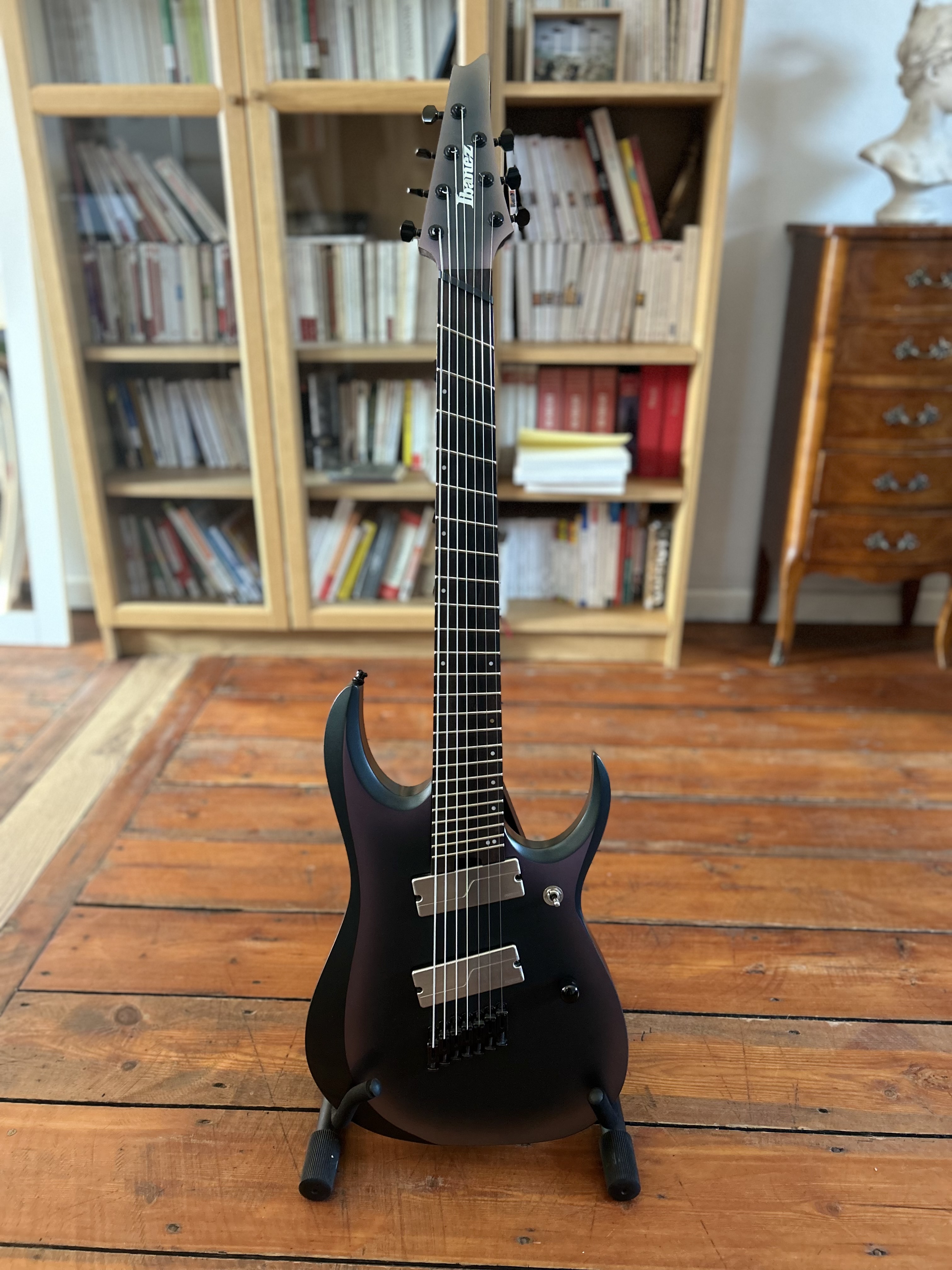 Je vends ma RGD7, 7 cordes, mécanique Gotoh et micros Fishman, pour cause de double emploi.Elle est en très bon état général hormis de très légères traces d’utilisation que l’on peut voir sur les photos.