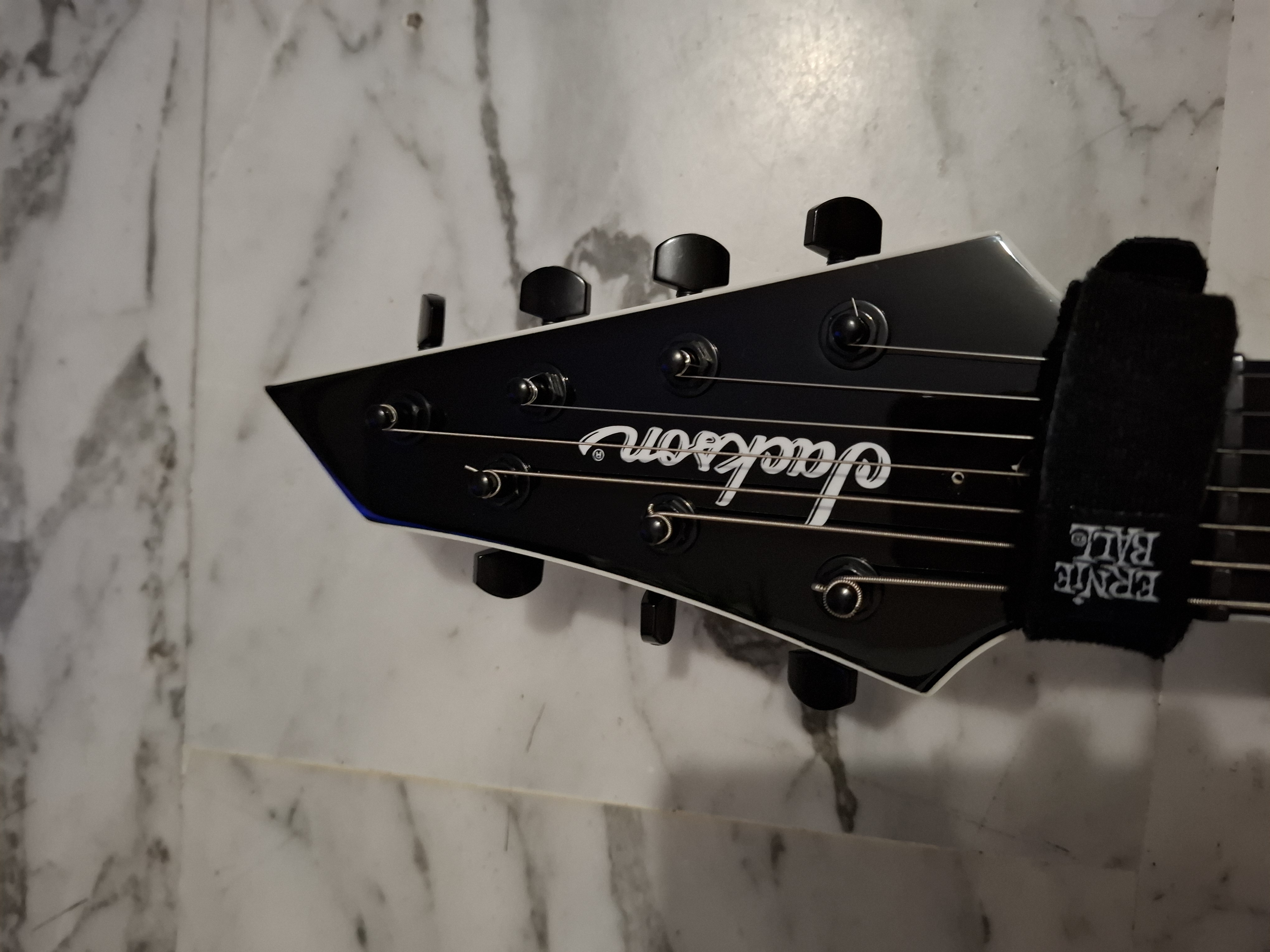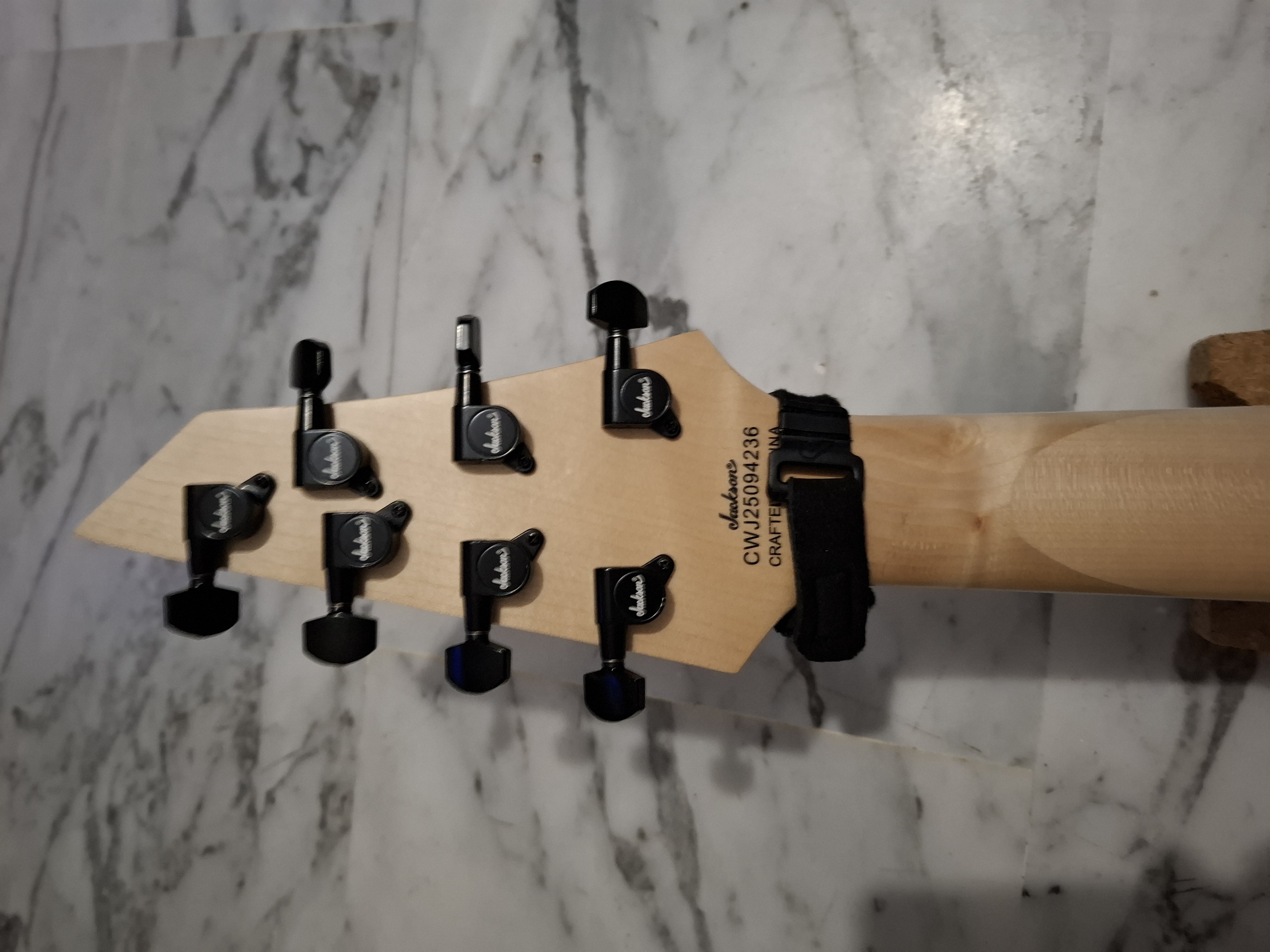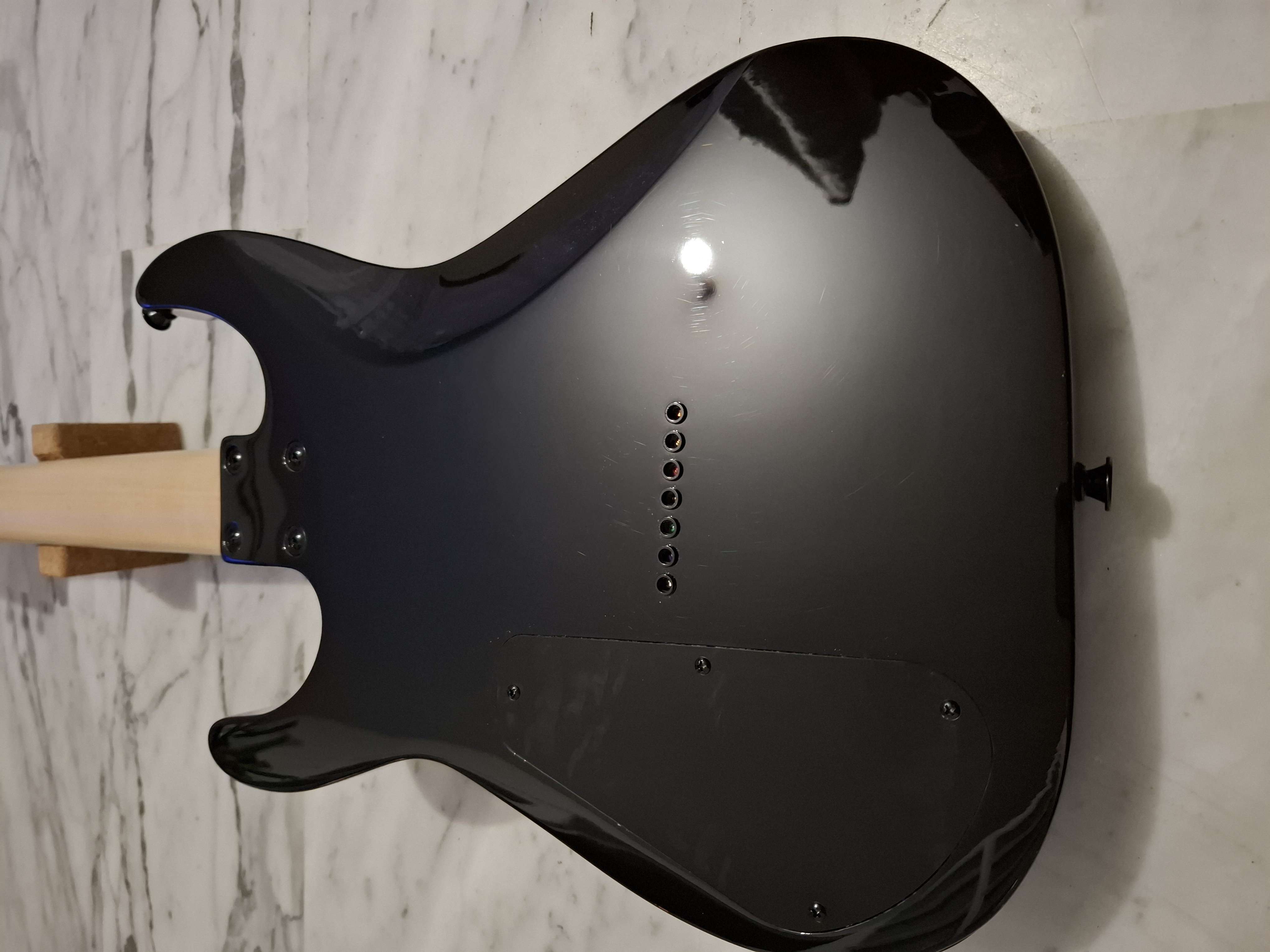 Je n'ai pas eu à reprendre le bord des frettes, ni courbe, ni planimetrie. Le frettage "jumbo" est parfaitement réalisé. J'ai juste eu à nourrir cette belle touche en amarante à l'huile de citron et polir les frettes qui en avaient grandement besoin. Ce manche est très confortable, plutôt plat à la façon Ibanez. L'accès aux aigus est plutôt bon grâce au biseau "corps/manche". Binding bien fait. Seul bémol, le sillet en plastique vraiment bas de gamme mais plutôt bien usiné. Équipé d'un truss-rod double action, ce manche en 26,5" est renforcé comme en est l'habitude chez Jackson d'un renfort graphite qui le rend très stable. Frettage et manche parfaits, j'ai donc pu régler l'action des cordes très basse sans vraiment galèrer.