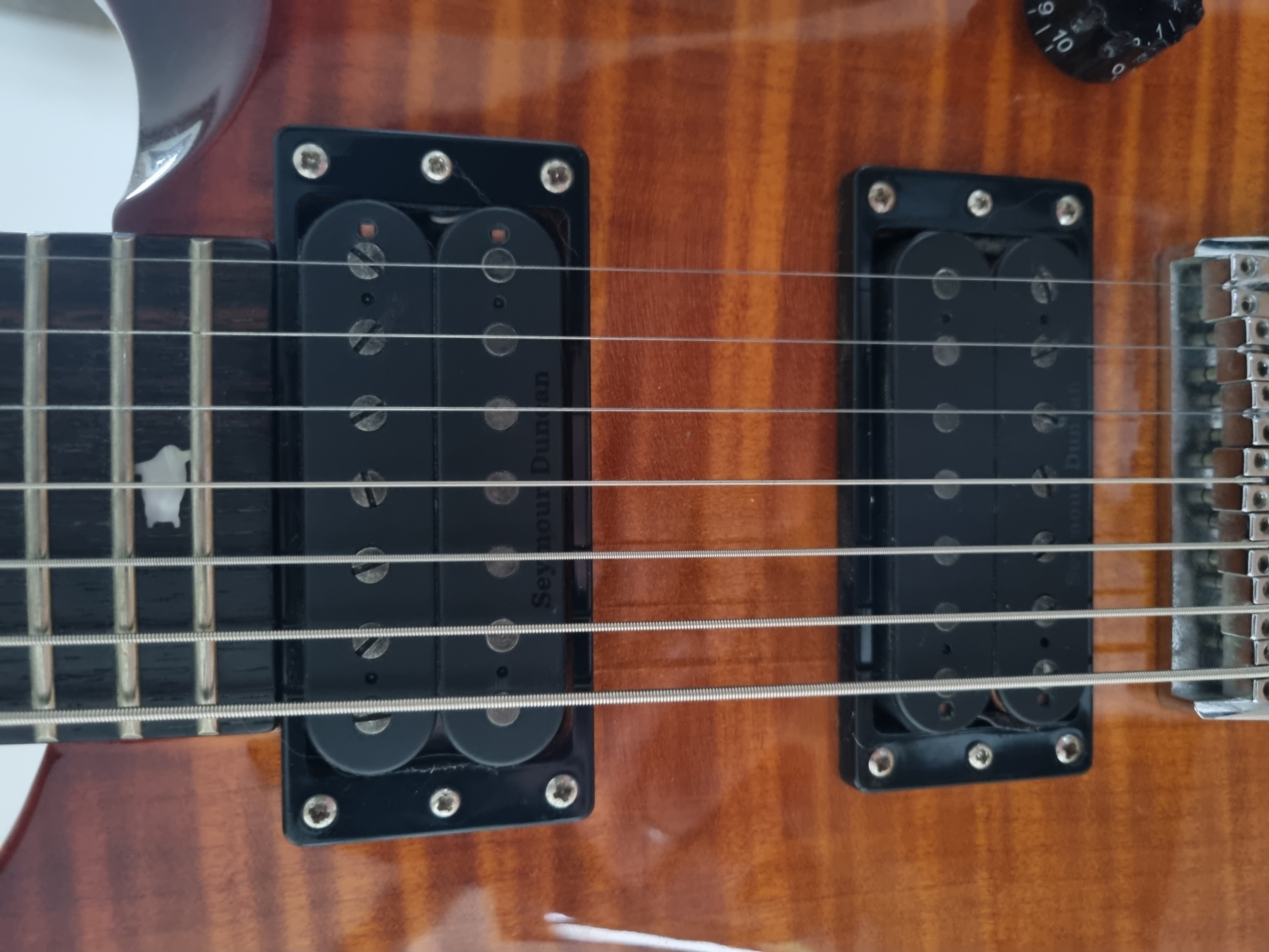 Les micros d’origines ont été changés pour un kit Seymour Duncan Nazgûl & Sentient pour des rythmiques tranchantes et enervées et de beaux graves précis qui feront raisonner vos palm mute comme les cris des Orcs du Mordor !