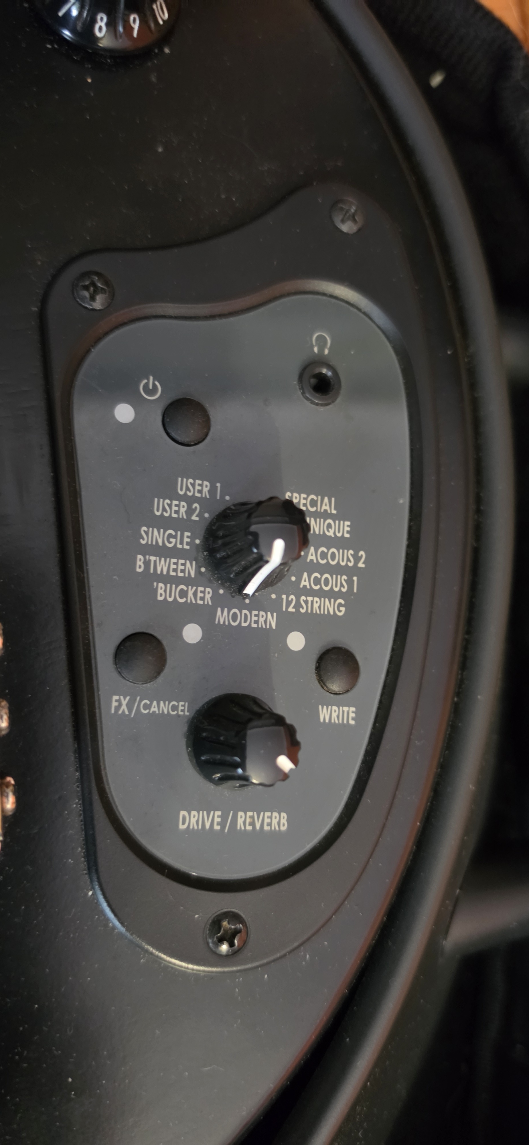 Contrôles embarqués : Un module de contrôle permet de gérer le volume, la tonalité, la sélection des modèles, ainsi qu'un bouton de Drive/Reverb pour ajouter des effets directement depuis la guitare.