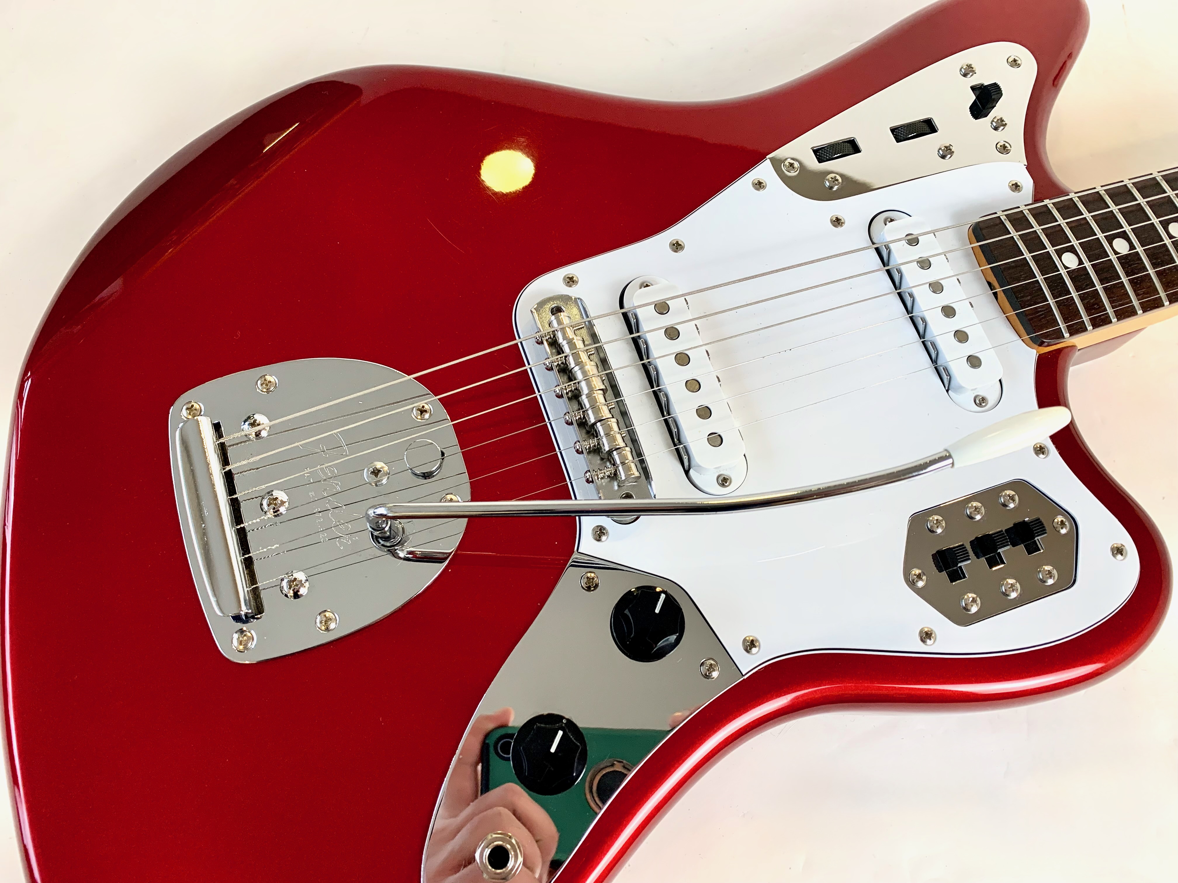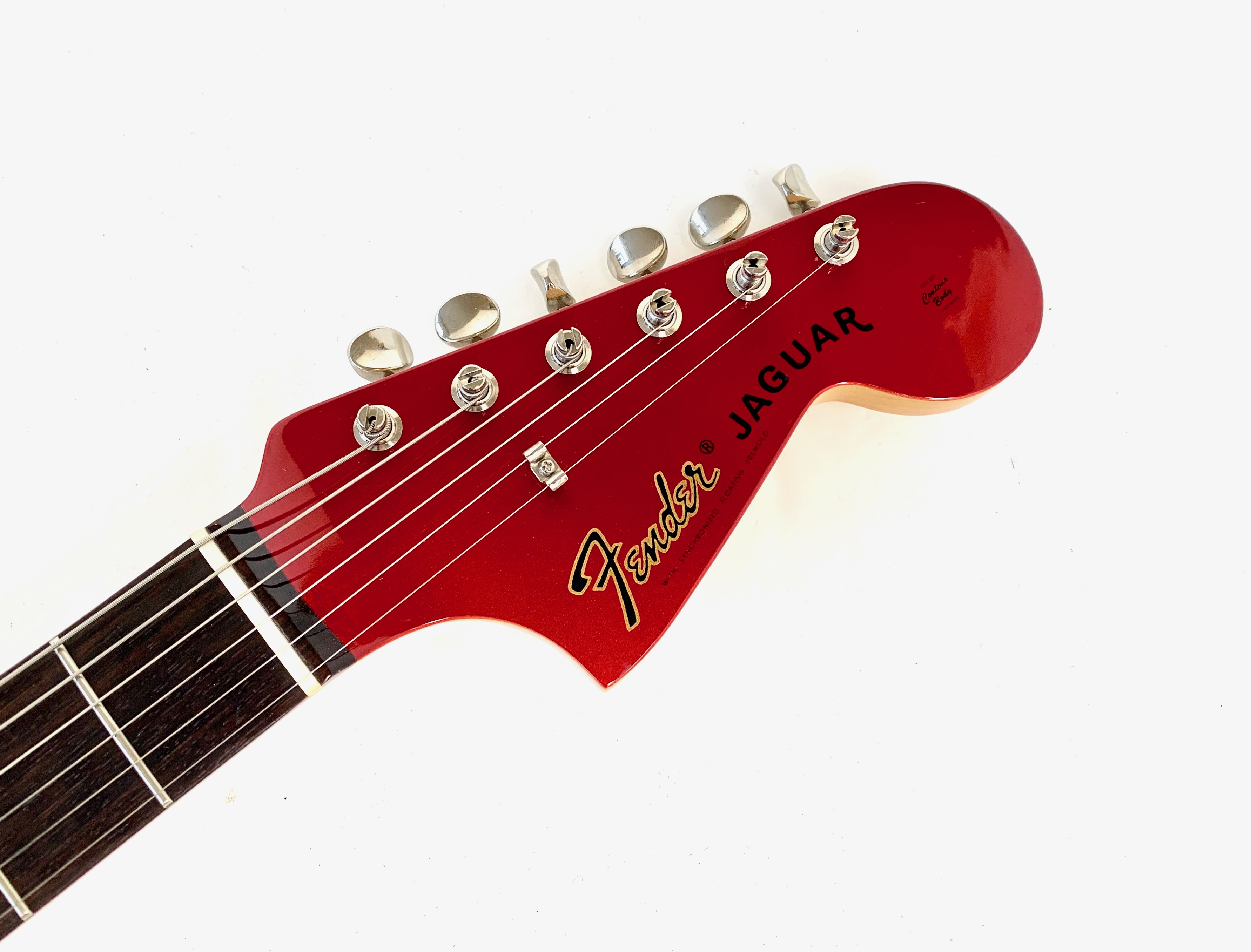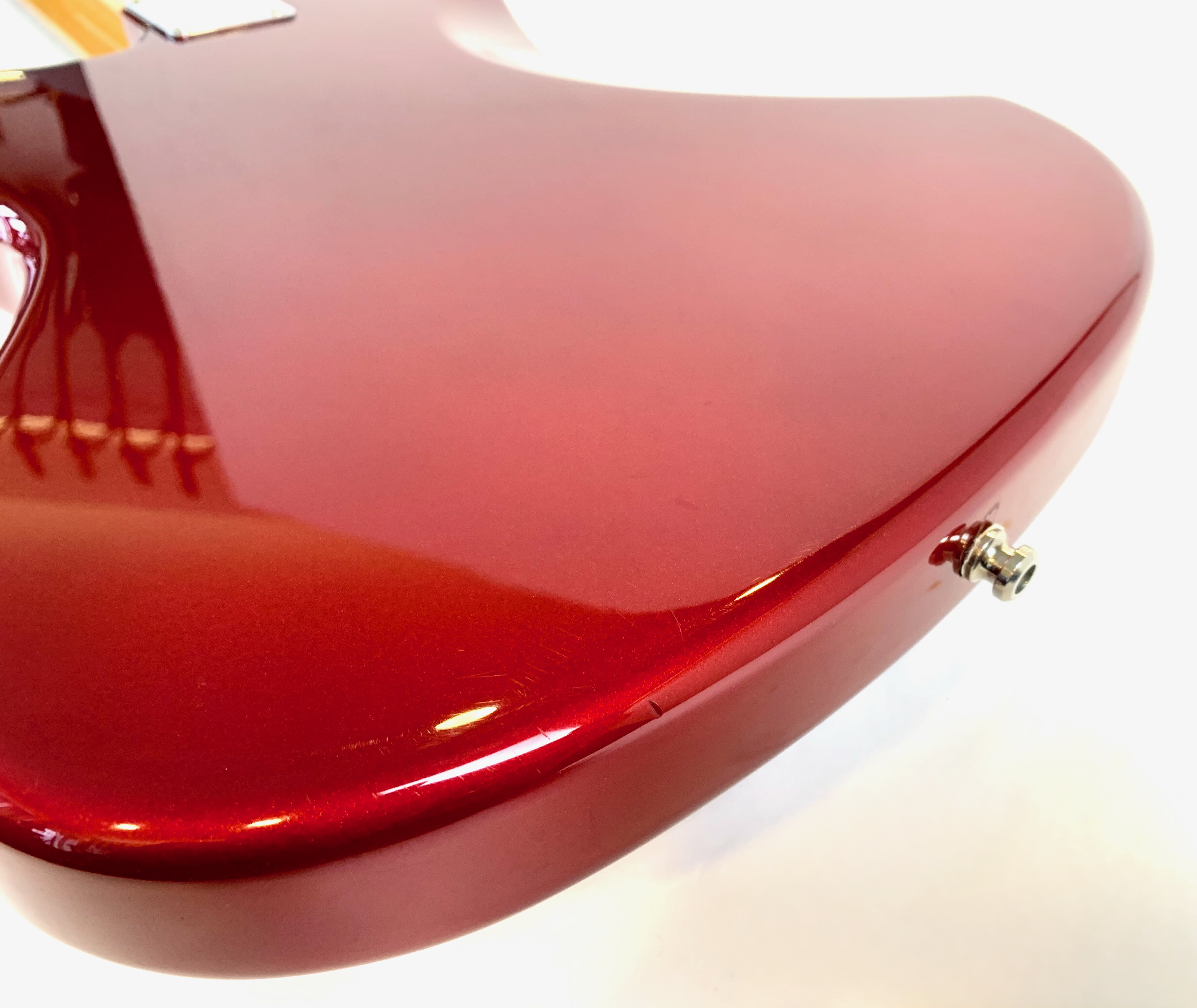 Sortie en 1962 la Jaguar devait dominer la gamme californienne aux côtés de la Jazzmaster; pas de chance la Stratocaster et la Telecaster resteront toujours plus connues ! Cette belle crafted in Japan, de 2004-2005 est d’une belle couleur Candy Apple Red avec la tête assortie dite Matching Headstock. Le chevalet a été remplacé par un modèle de Mustang pour plus de stabilité. Comme d’habitude on retrouve la qualité de lutherie et l’assemblage sans faille typiquement nippons.Location, achat, vente, reprise, dépôt-vente.