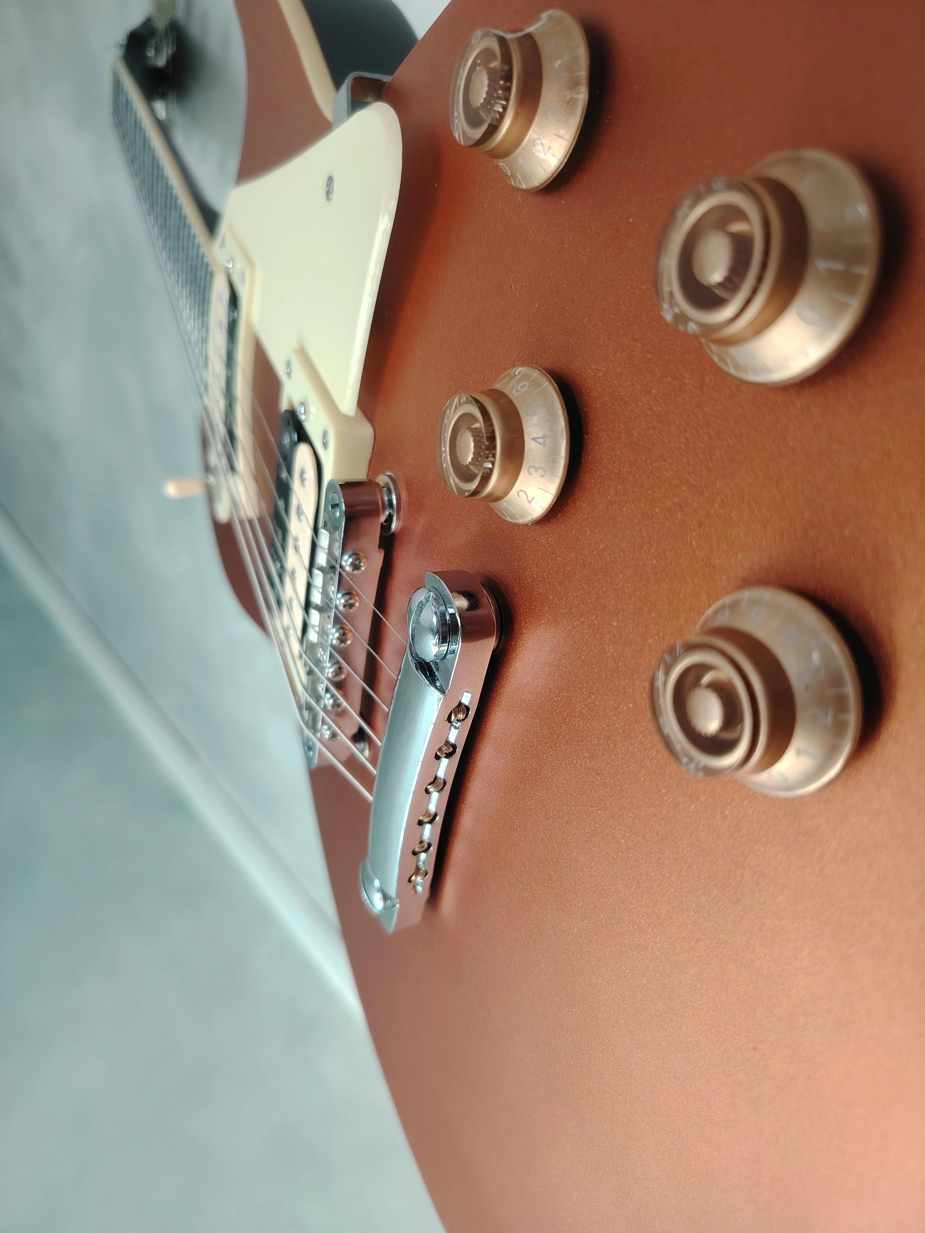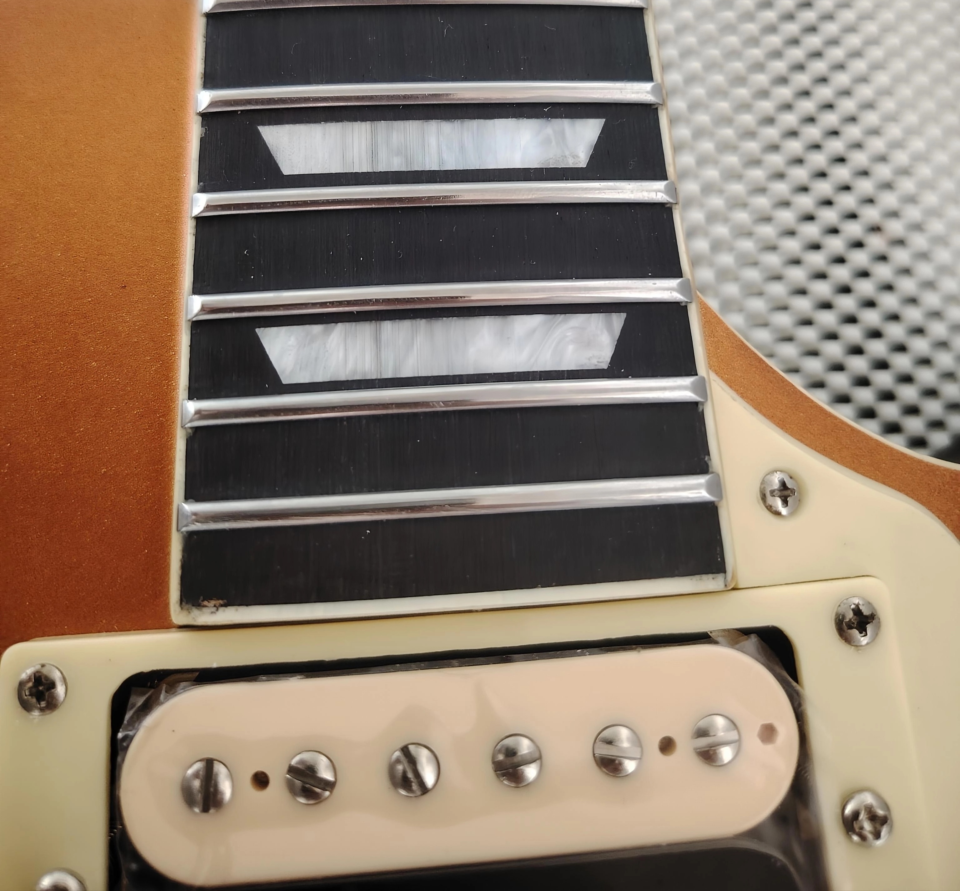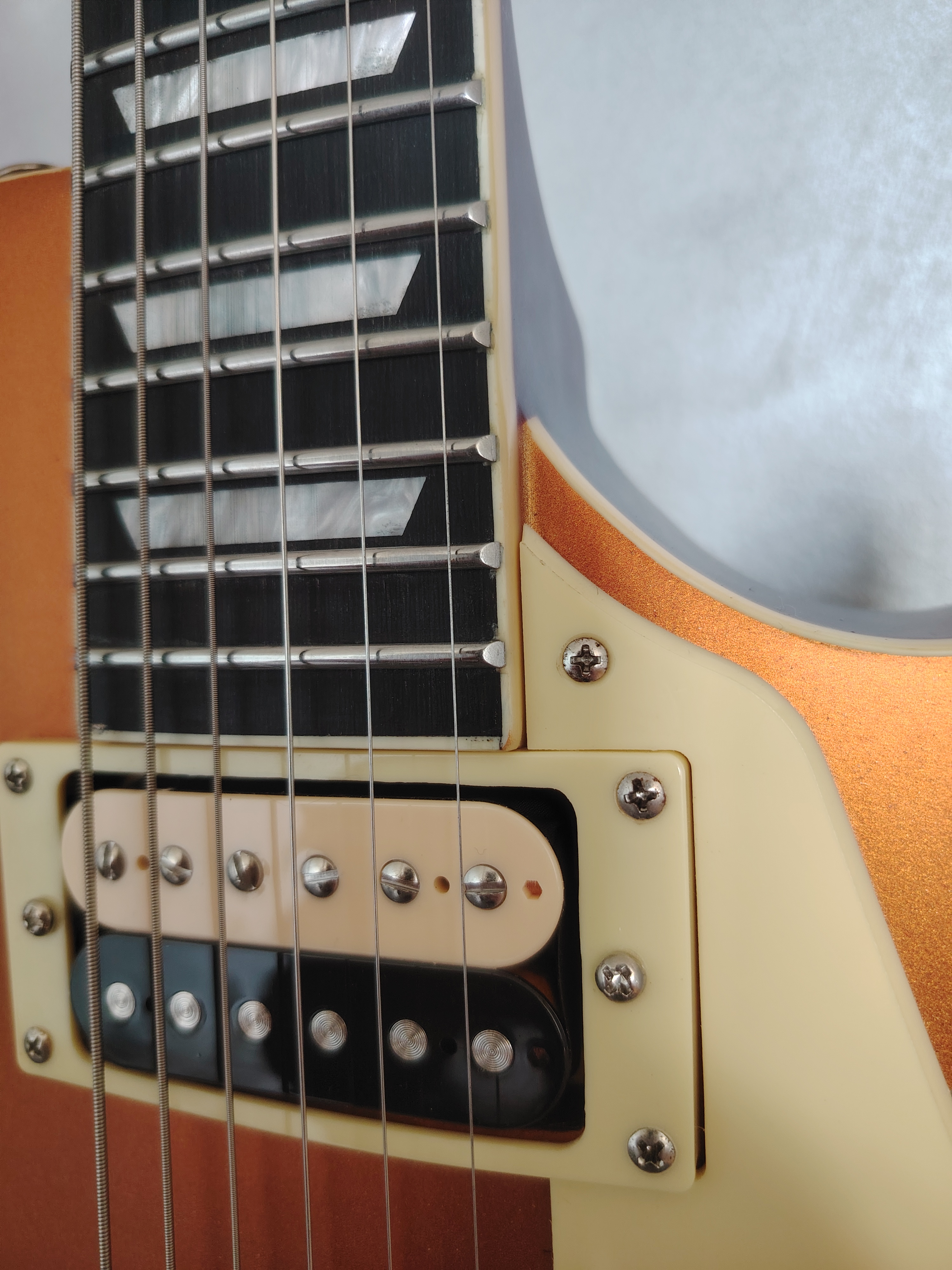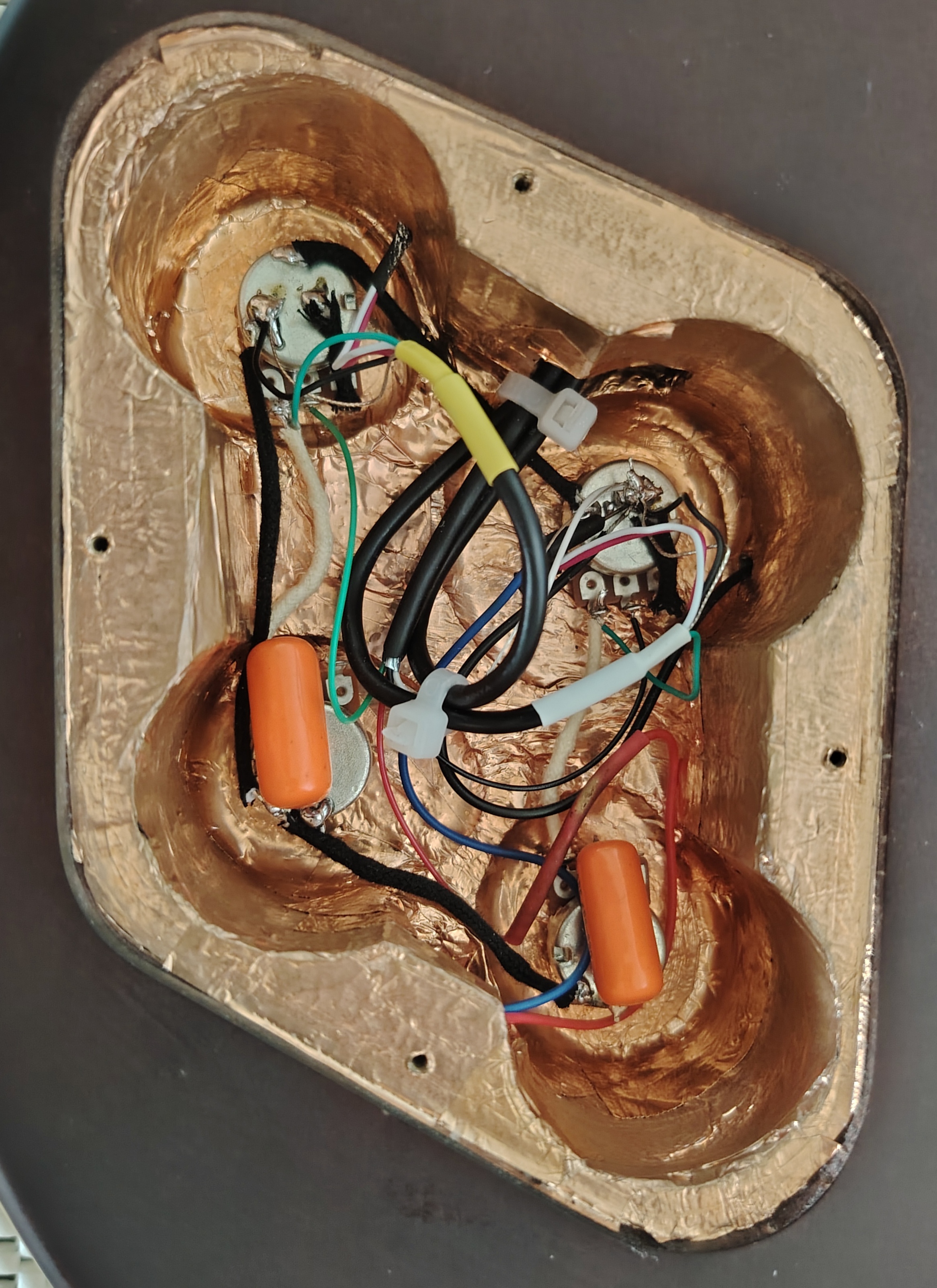 – Électronique refaite à neuf : cavités blindées, 4 potards 500k linéaires progressifs, condensateurs Sprague Orange Drop 22µF, sélecteur neuf, micros neufs (no name).