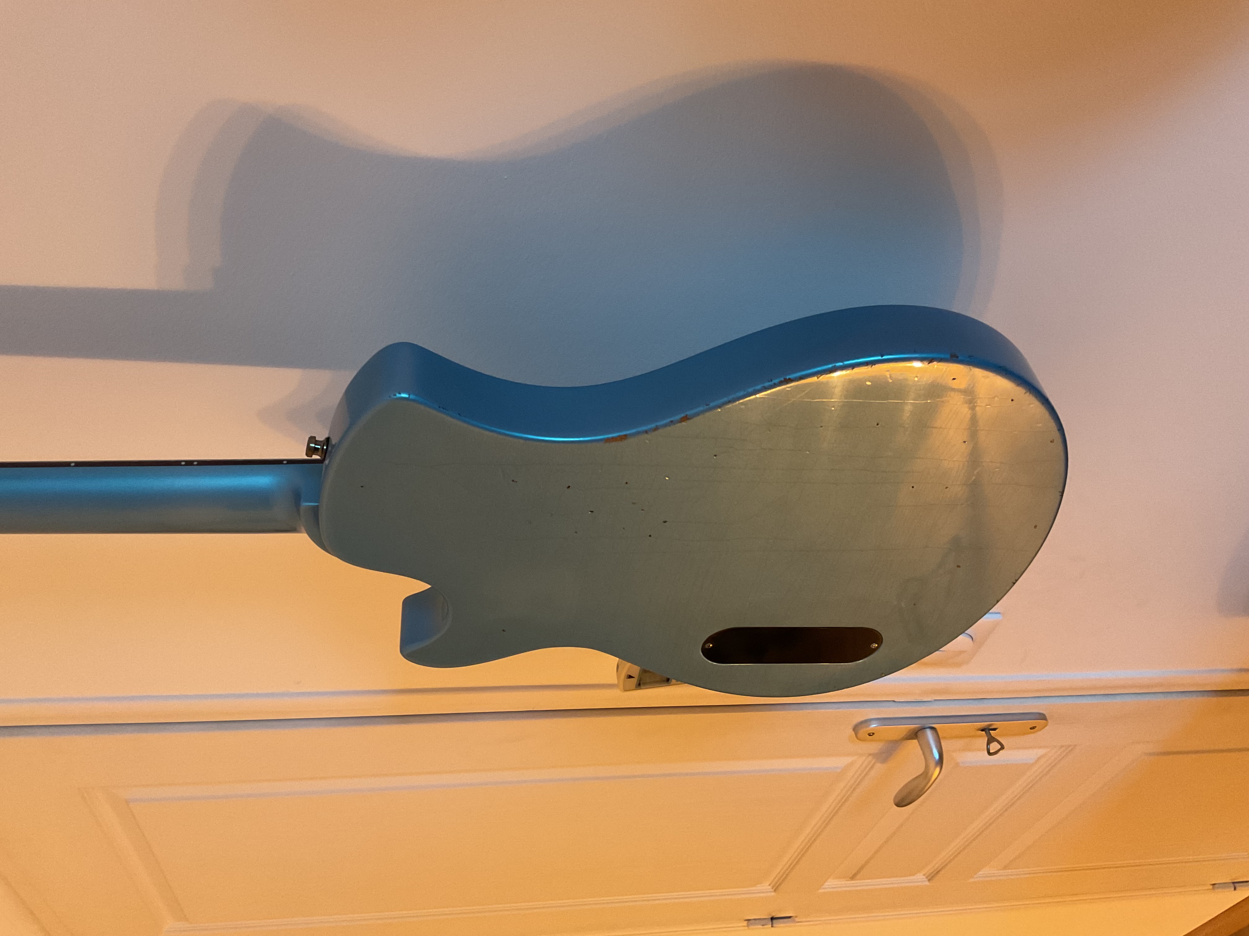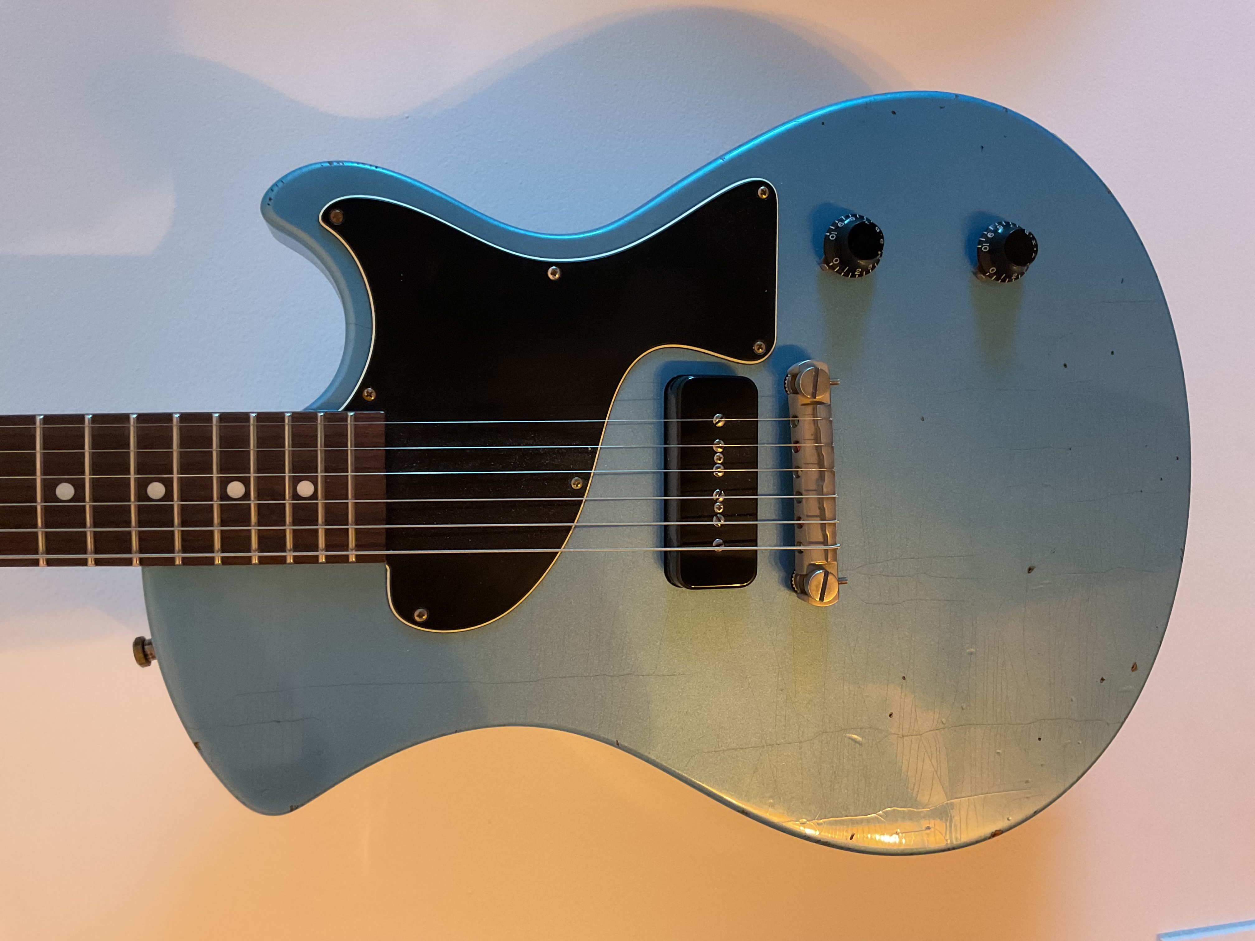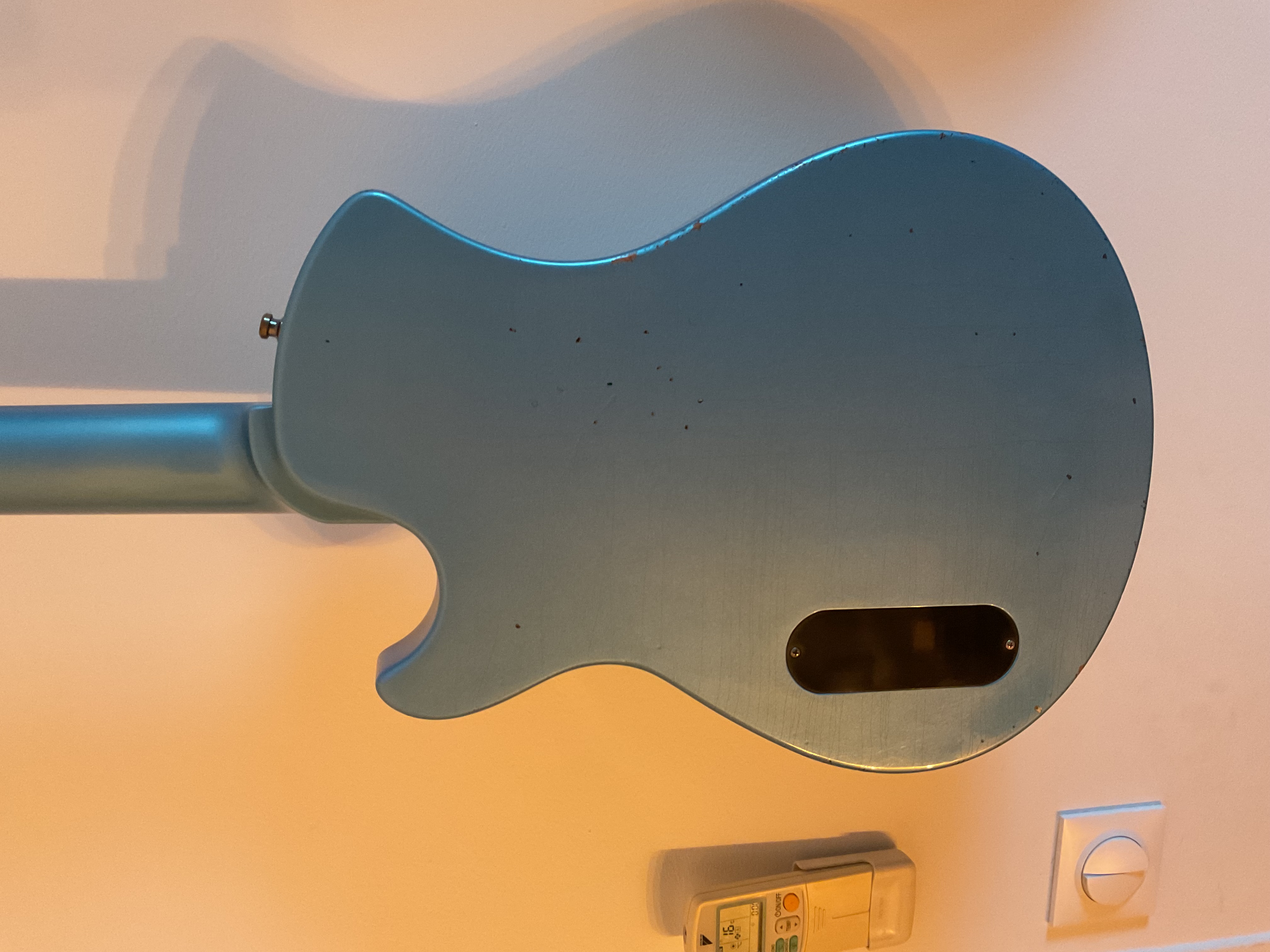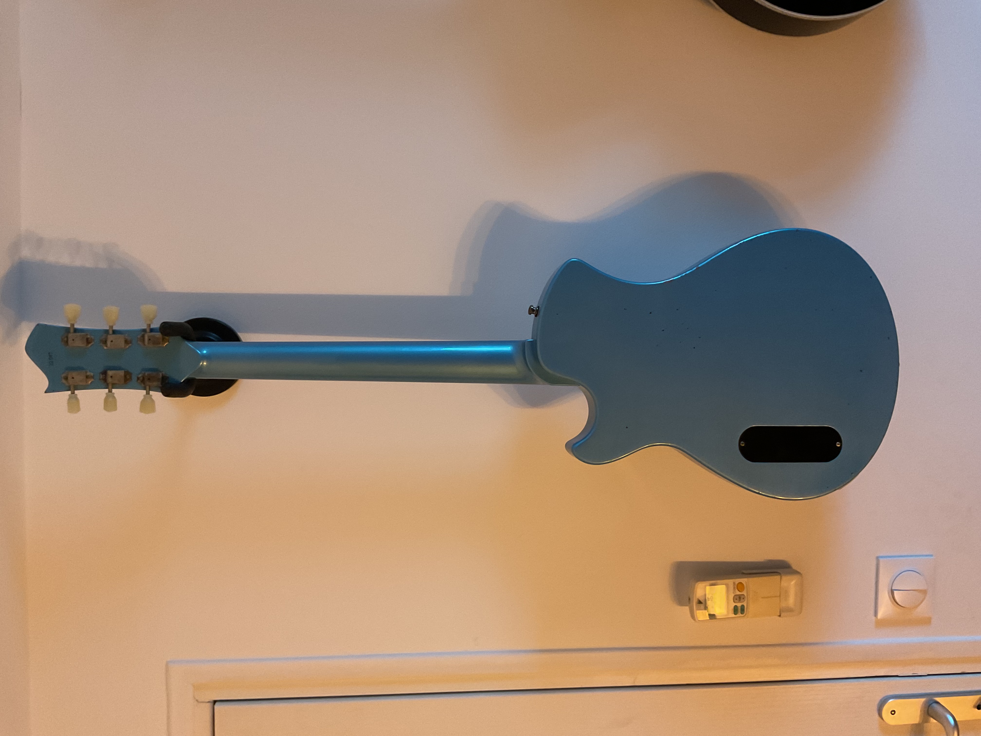 Je vends ma Springer Spartan Junior relic Pelham Blue (couleur pas facile à faire ressortir sur les photos). Comme neuve, la guitare est très légère (2,7/2,8kg) grosse résonance à vide.Micro P90 Sunbear splittable avec un niveau de sortie medium (avec le split on a presque le son d’une telecaster). On peut se rapprocher du son d’un micro manche en jouant avec les potards.