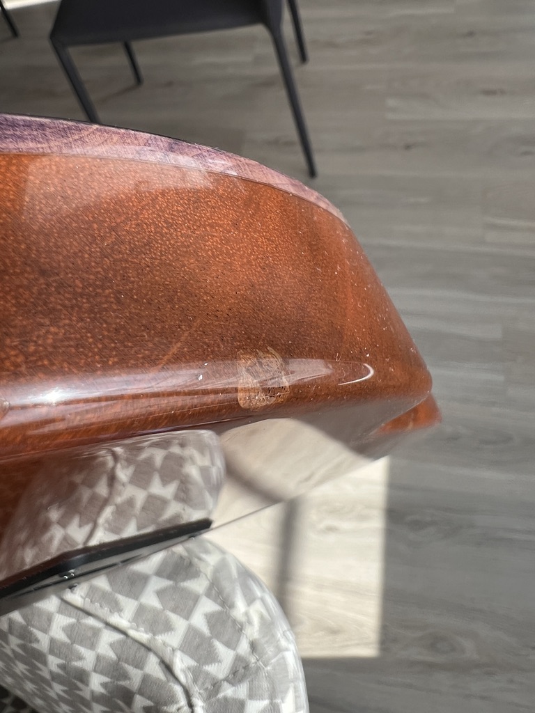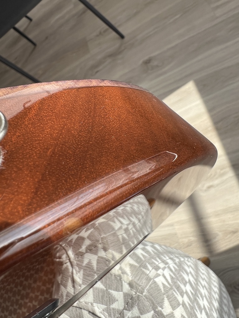 Il y a deux petits pocs sur la tranche face arrière mais le vernis reste lisse au touché (un a été réparé, l'autre n'est qu'une petite décoloration). Voir photos.